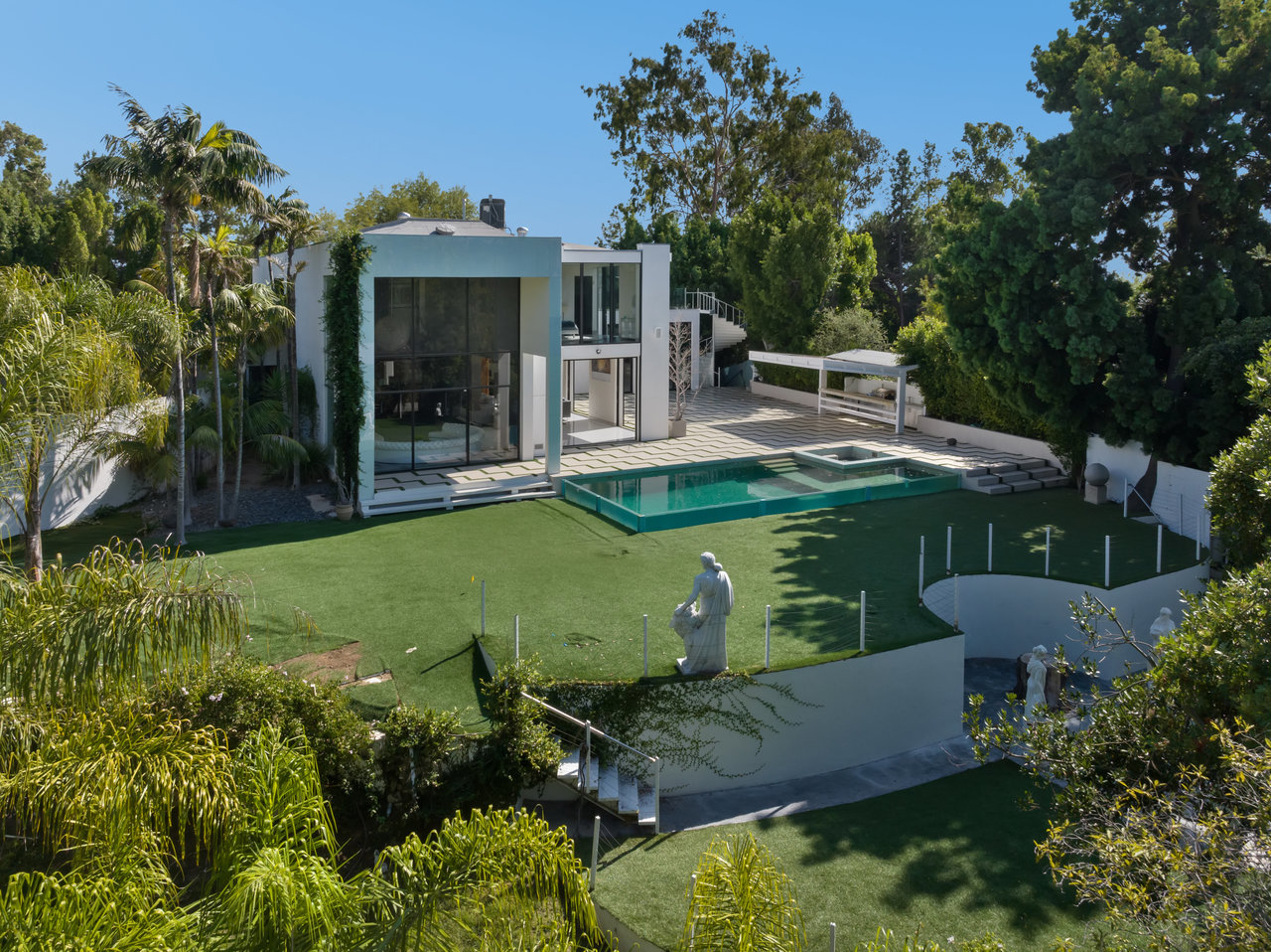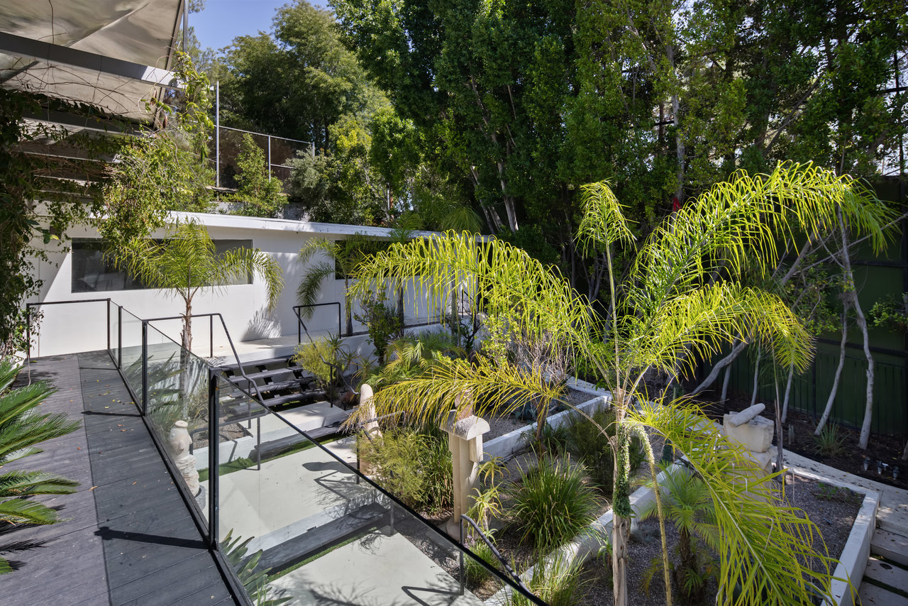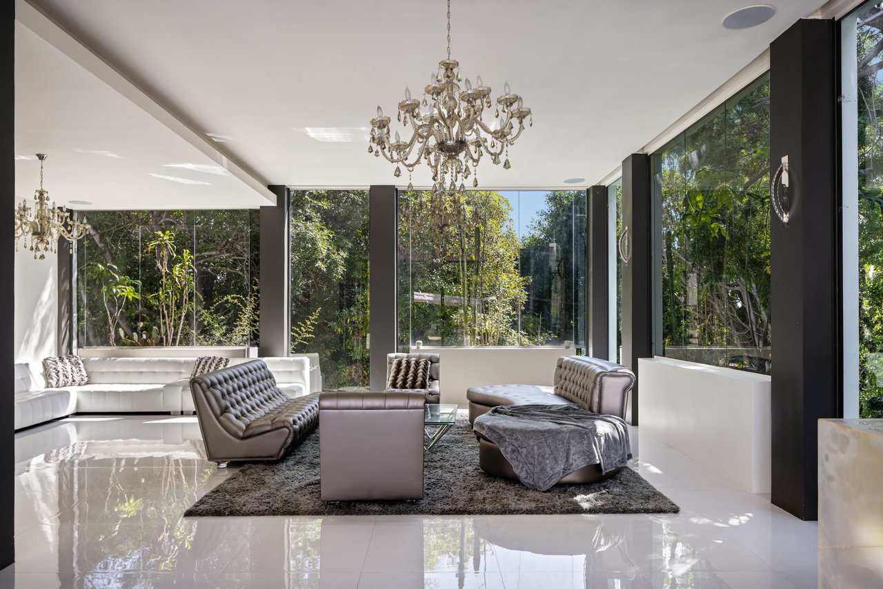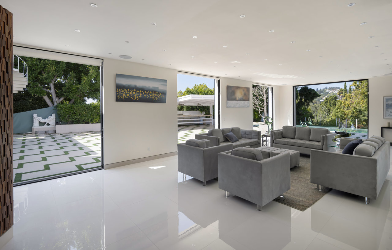 Nestled on an exclusive street in Beverly Hills, this magnificent estate commands attention as you approach it via a winding, private and gated drive. Mere moments from the bustling heart of Sunset Blvd., it combines the convenience of Beverly Hills with the serene seclusion of a gated compound. Crafted by the renowned architect, William S. Beckett, this contemporary masterpiece has been graced by cultural icons and industry titans throughout its storied history. Following an extensive restoration in 2012, the property now stands as a haven for entertainers. The interior boasts grandeur with its soaring ceilings, floor-to-ceiling glass windows, and exquisite walls adorned with wood, stone, and pristine white porcelain tile. A Crestron smart home system, complete with built-in speakers throughout, enhances the living experience. The expansive gourmet chef's kitchen, accompanied by a separate prep kitchen, game room, wine cellar, and state-of-the-art home theater, ensures that every desire is catered to. The primary suite indulges with two colossal walk-in closets, a private deck featuring a jacuzzi, and sweeping vistas of Beverly Hills. The outdoor oasis encompasses a generous tiled patio, a tranquil Zen garden, a poolside pavilion, a built-in bar and grill, and a stunning glass-walled pool and spa, all set on just under an acre of perfectly flat land. Replete with opulent finishes, this trophy estate represents the pinnacle of luxury real estate.