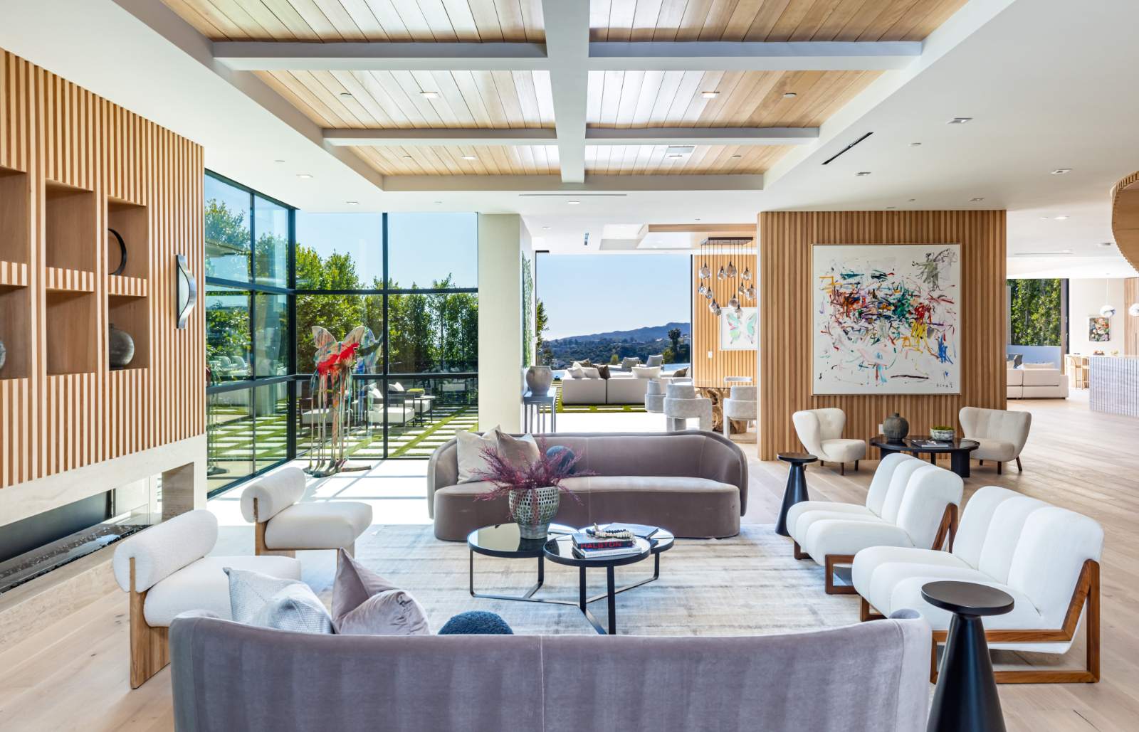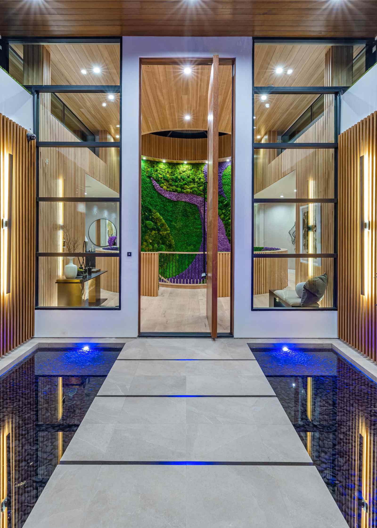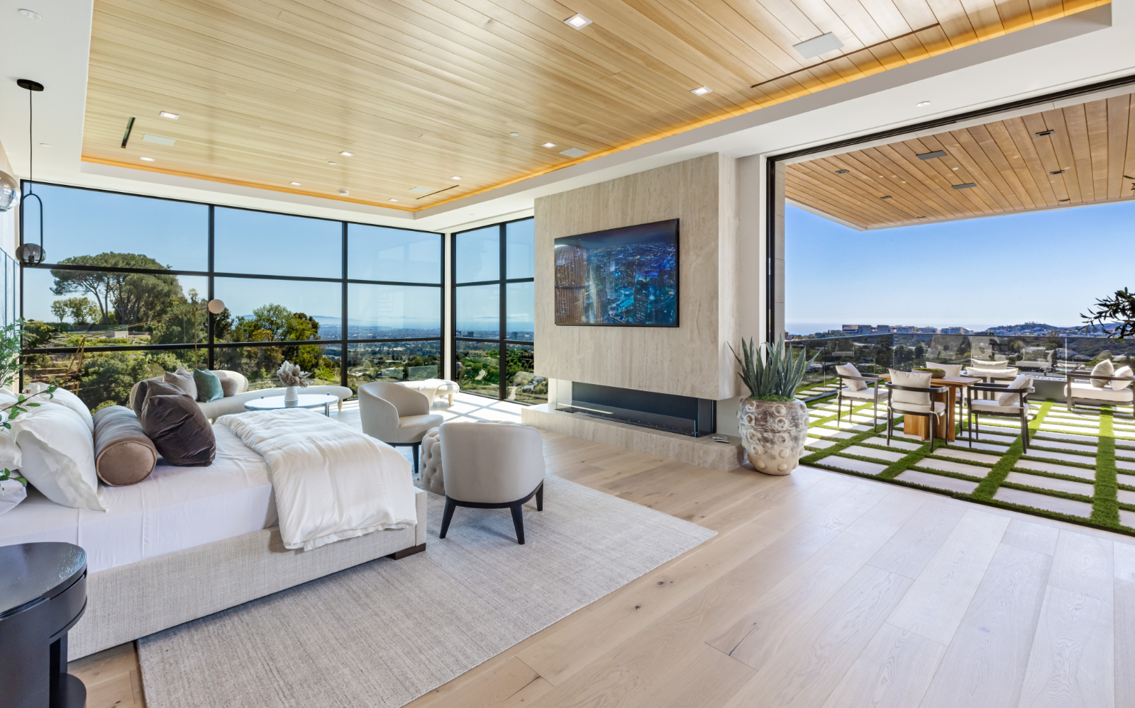Presenting the resplendent and unmissable Bel Air Escape, a newly completed 2023 masterpiece imagined and constructed by award-winning designer/developer Ramtin Ray Nosrati. With flawless execution and superior design, this immaculate residence of stylish appeal provides a fantastic refuge in one of the most prestigious and coveted locales with spectacular ocean views from every room. Enter through sleek oversize privacy gates and descend a long, estate-like driveway to discover a clean and warm contemporary frame unified in harmony with lush landscaping and rich, organic gardens. Upon arrival, guests are greeted by soothing water features and a reflecting pool alongside a vertical living plant wall. Inside, the home's foyer is a celebration of life and nature, as a cylindrical awe-inspiring living moss wall is illuminated by natural light via a16-foot circular skylight overhead. Down the spiral staircase, open living spaces are positioned with quintessential indoor/outdoor lifestyle in mind. Walls of glass frame spellbinding vistas, and the finest materials converge to form an environment of optimal comfort and luxury. An elegant dining room flows effortlessly into the massive great room with picturesque stone fireplace and oversize wine room with tasting area that is as functional as it is beautiful. A showpiece of the public entertaining spaces, an immaculate travertine-clad bar rivals even the poshest speakeasy. Nearby, the family room is centered by an additional fireplace with fine wood detail, flanked by giant pops of blue sky, ocean, cityscape, and Getty. The custom culinary center is a gourmand's dream, with state-of-the-art appliances, adjacent chef's prep area with restaurant-grade walk-in refrigerator, striking finishes, oversize island, and artistic geometric cutouts for displaying art pieces and chic decor. The show-stopping gym will impress the most devout fitness enthusiast, and the home cinema affords ample room for visitors to stretch, recline, and relax while screening films. Impressive woodwork is repeated in the primary suite with its fireplace and wraparound deck with fire pit and sweeping views. The decadent spa-inspired bath has an oversize rainwater shower dressed in dazzling book matched stone slabs, a zen soaking tub, and sizable dual-sink vanity. A jaw-dropping double walk-in dream closet and dressing room showcases the highest in fashion and finery.Other amenities in this expansive open floorplan include high ceilings throughout, resort-style tropical landscaping, parking for six cars, smart-home system, and automated security. Outside, experience supreme entertainment atop multiple lounging patios and viewing decks. Enjoy a rooftop lounge complete with bar, large tv, built-in barbecue, and putting green. There is also an outdoor dining room, outdoor kitchen with bar plus huge flat-screen tv for your outdoor entertainment, grassy play areas, spa, and a massive 80-foot zero-edge infinity-edge pool looking out to incredible city and ocean vistas that truly must be seen to be believed. Apart from all of this, flat usable land is available and perfect for adding a sports court, pickleball court or tennis court. This remarkable property promises enduring amusement and endless leisure, secluded from the city yet located just moments to Beverly Hills, the famed Sunset Strip, and the very best of the Westside. Welcome to the extraordinary.