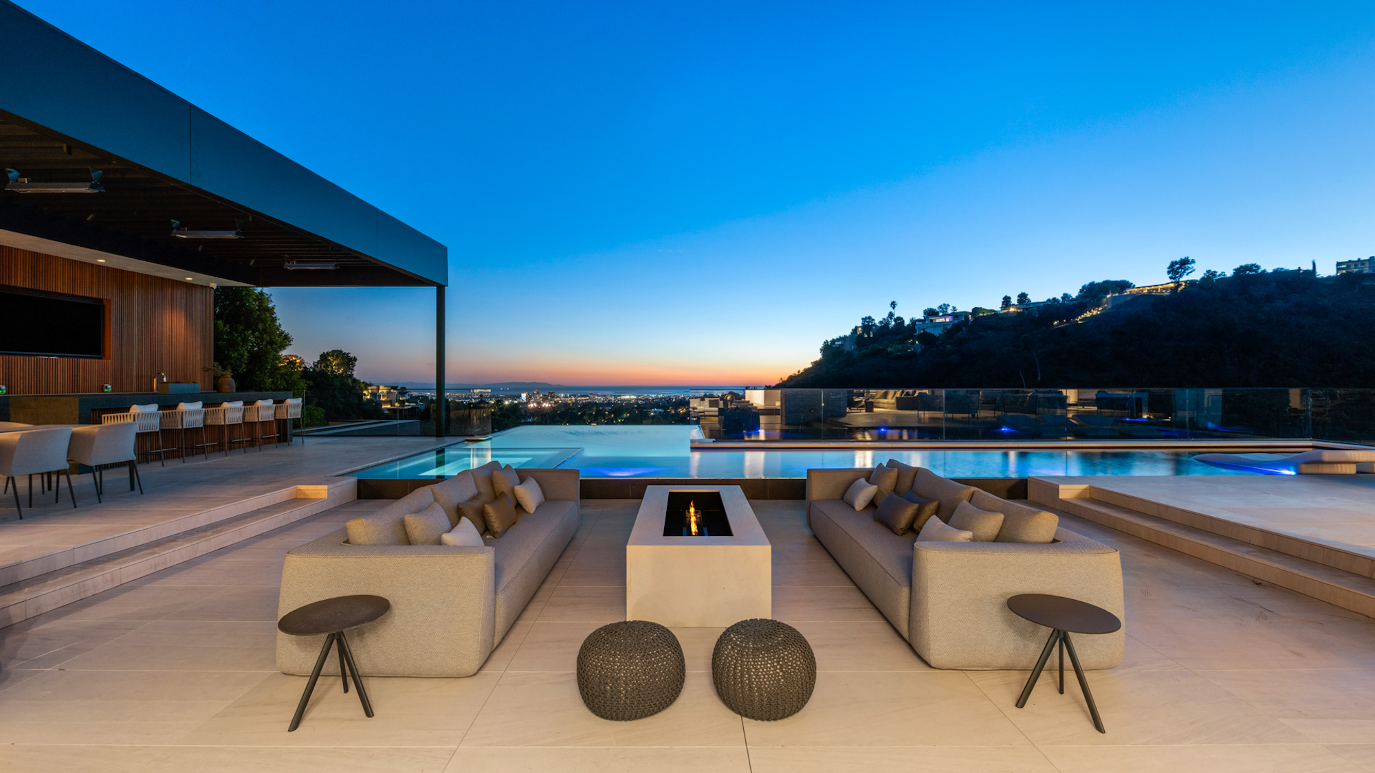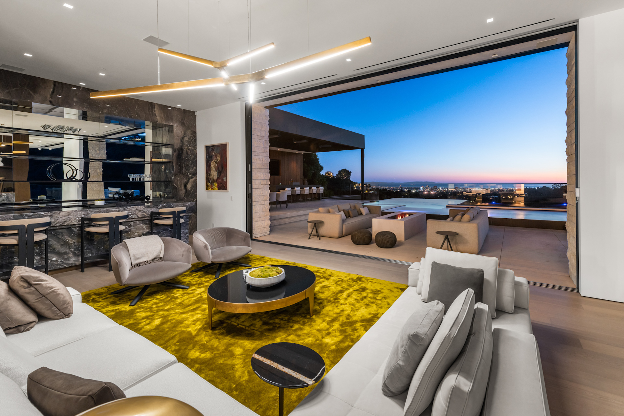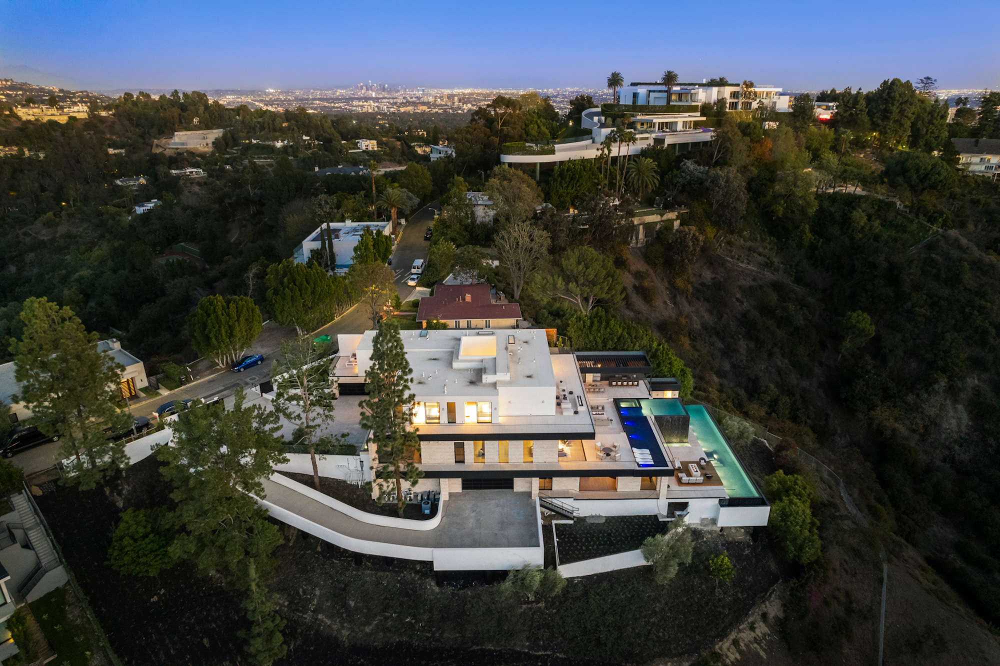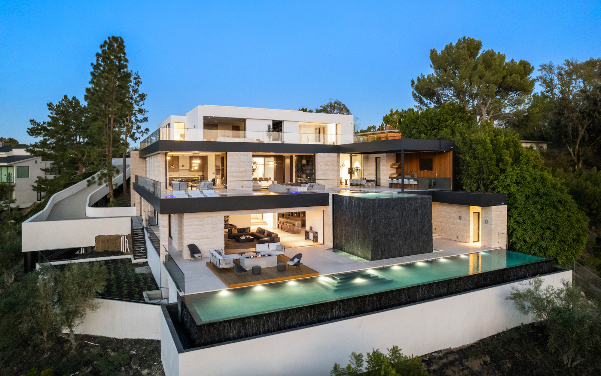 string(1095) "Situated on an ultra-private, tree-lined hillside in Bel Air, this spectacular, new estate is an entertainers paradise that captures magnificent, far-reaching city and ocean views. Envisioned by Bowery Design Group with interior design by Faye Resnick, the estate boasts 1.3 acres, 7 bedrooms, 14 bathrooms, 2 pools on different levels, amazing water features throughout such as a large indoor atrium and water wall and endless amenities for indoor-outdoor entertaining. Enjoy dual chefs kitchens, a pantry, and living/dining areas open through glass walls to lounging terraces, outdoor kitchen, custom bar, infinity-edged pool, and Jacuzzi. On the lower level, find a lounge, bar, 12-seat theater, wine room, and an indoor-outdoor gym with a steam room and sauna that leads to a 2nd, 73' pool that extends over the hillside. 7 bedroom suites include staff quarters and a stunning primary suite with 2 closets. Features include an office, oak floors, and 2 garages with parking for 5. Capturing sunrise to sunset views, enjoy the utmost privacy, minutes from the city's best shopping and dining."