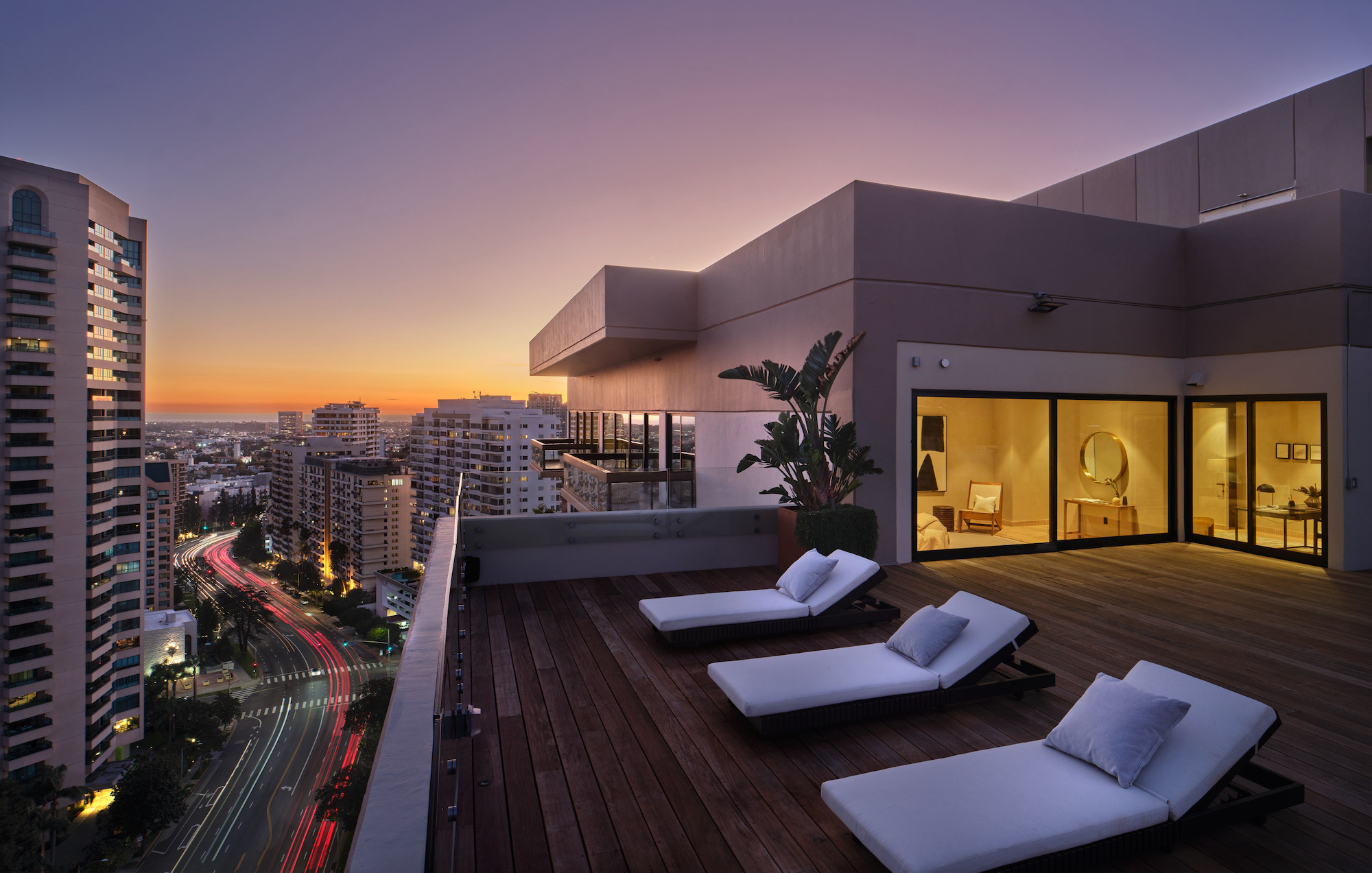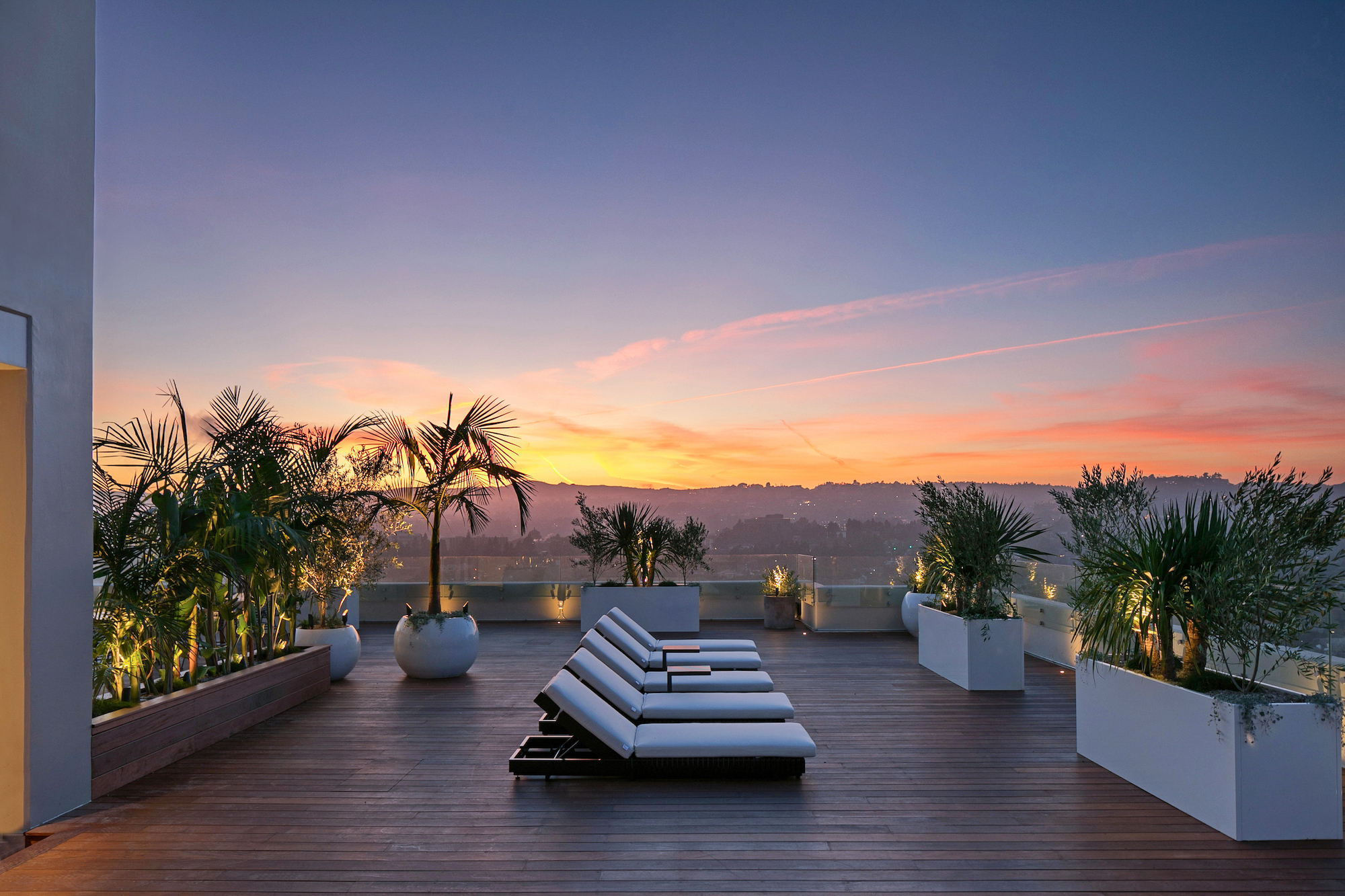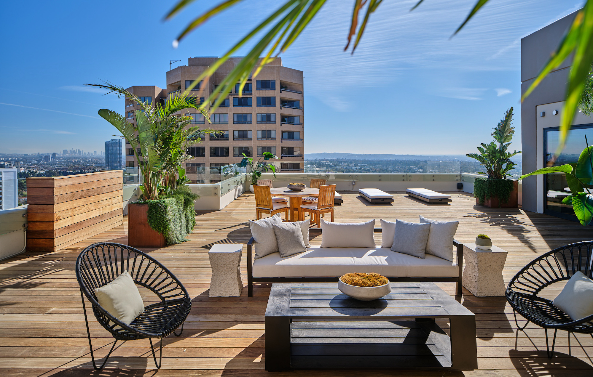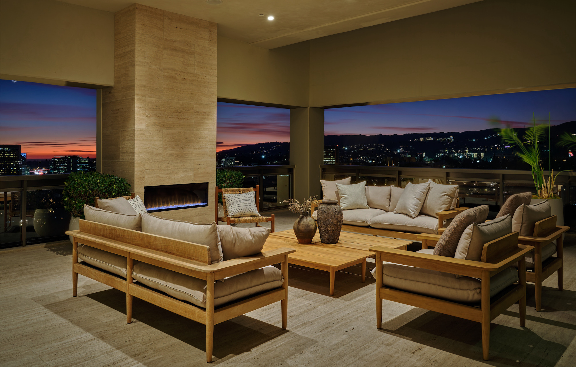 Welcome to the magnificent Penthouse that redefines luxury living. Spanning over 12,000 square feet of both indoor and outdoor space, this residence commands the entire top floor of the iconic Wilshire Grand and boasts one of Los Angeles' most expansive rooftop terraces, a lavish 5,540-square-foot outdoor haven. Boasting five bedrooms and six bathrooms, this residence offers an unrivaled level of privacy, only accessible through a discreet triple elevator entry and safeguarded by 24/7 security. Set high above the city and surrounded by seamless glass, the Penthouse unveils breathtaking 360-degree panoramic views, showcasing iconic landmarks like the Hollywood Sign, the vibrant Downtown city skyline, and the serene Pacific Ocean. The interiors are bathed in soft, natural light, seamlessly blending tranquil bedroom retreats with expansive entertaining spaces. The craftsmanship is impeccable, evident in details such as hand-painted Lime-washed walls, Roman Travertine stone, Mass Beverly kitchen cabinets, Gaggenau appliances, a Sonance stereo system, Articolo lighting fixtures, a Control 4 smart home system, not one but two fireplaces, and wide plank 10-inch European white oak flooring throughout. The spa-like primary bathroom features a custom sculptural stone soaking tub and brushed bronze Hansgrohe AXOR Citterio fittings. The outdoor spaces are a true spectacle with a massive rooftop terrace deck adorned with brand new Brazilian Ipe decking, an outdoor fireplace, and an elegant clubhouse with a full bar and bathroom. Enjoy unparalleled amenities including round-the-clock concierge services, valet parking, access to a top-of-the-line fitness center, a sparkling pool, and a private event room. This remarkable property includes three coveted parking spots. This Penthouse is a once in a lifetime opportunity!