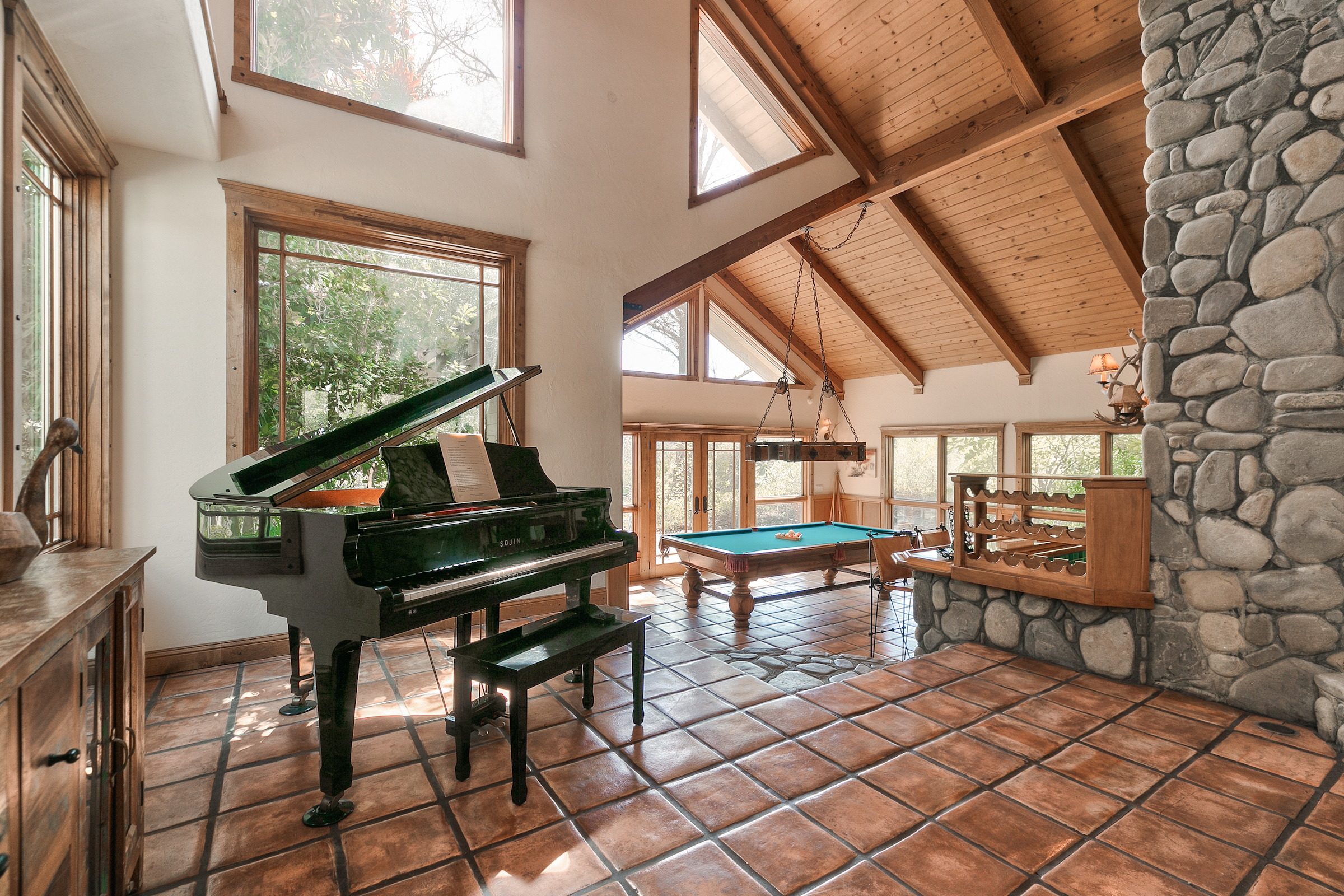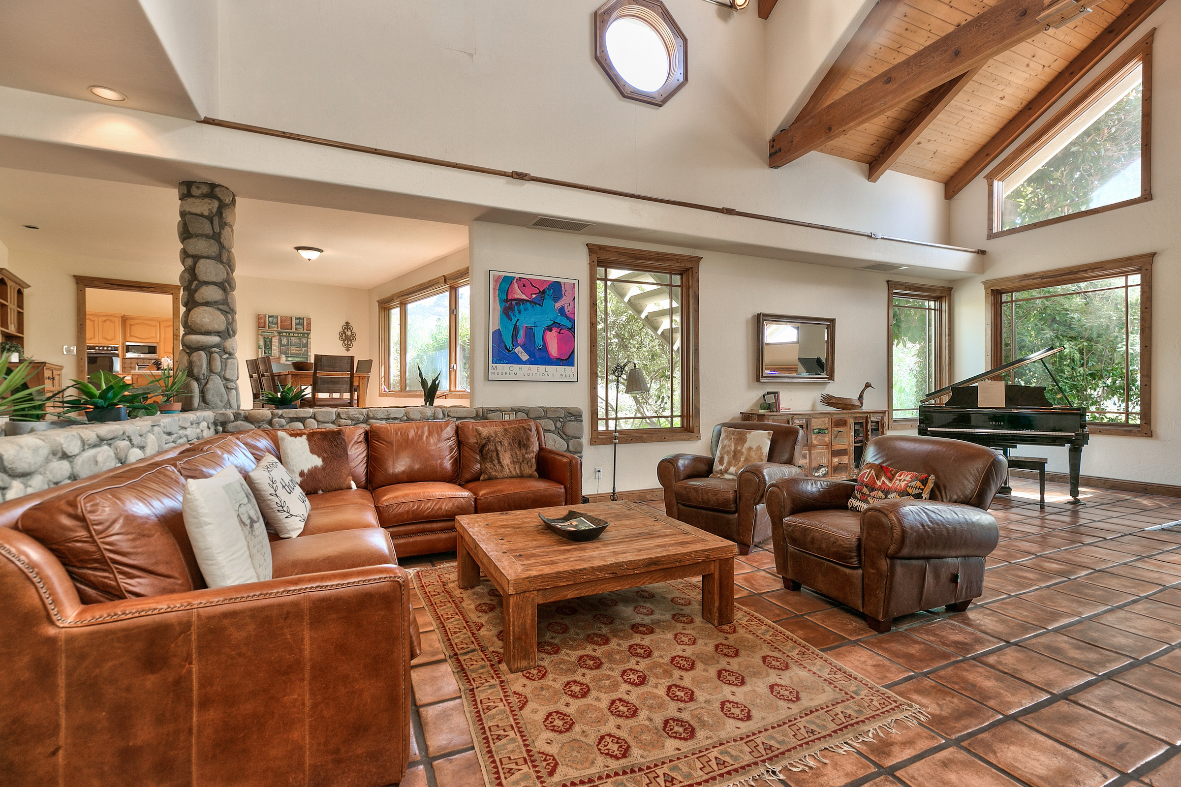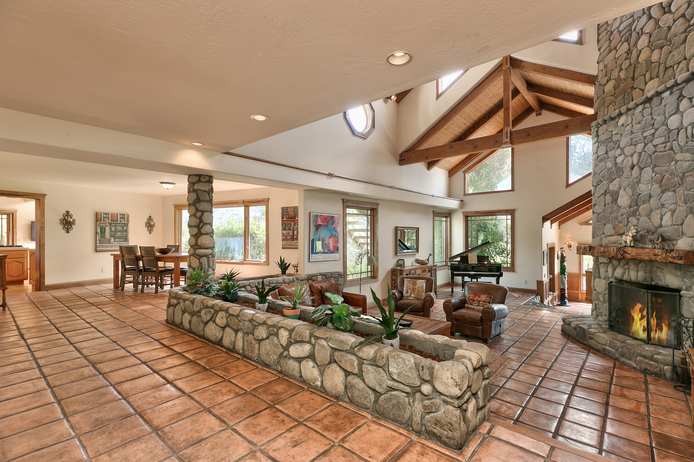 string(581) "Set in the highly desired Ojai Valley, this immaculate retreat, designed by the esteemed Whitman Design, sits on 13 acres of land. Drive up a private driveway, speckled with pepper trees and outdoor life to the spacious home which boasts 5,000 sf of living space with vaulted wood beam ceilings, rock feature accents and a magnificent fireplace. The home showcases 5 bedrooms, 5 bathrooms, formal and casual dining, media room, game room, a grand master suite, office and walk-in closets. Currently, the property has a world class horse facility, but endless possibilities abound."
