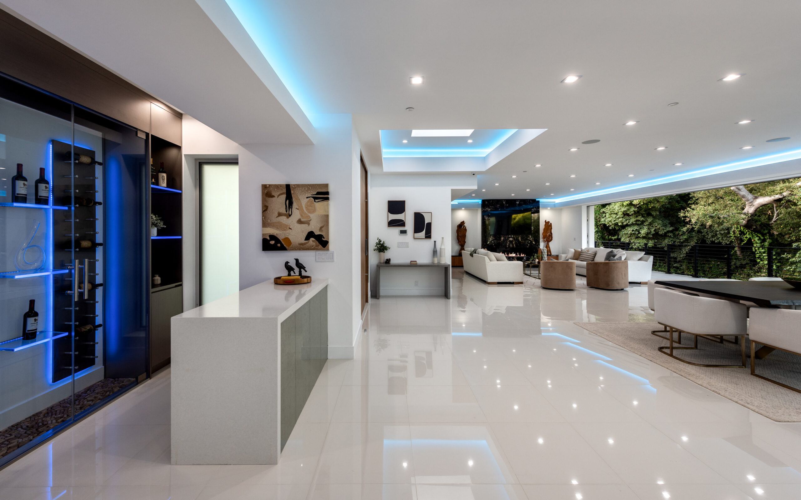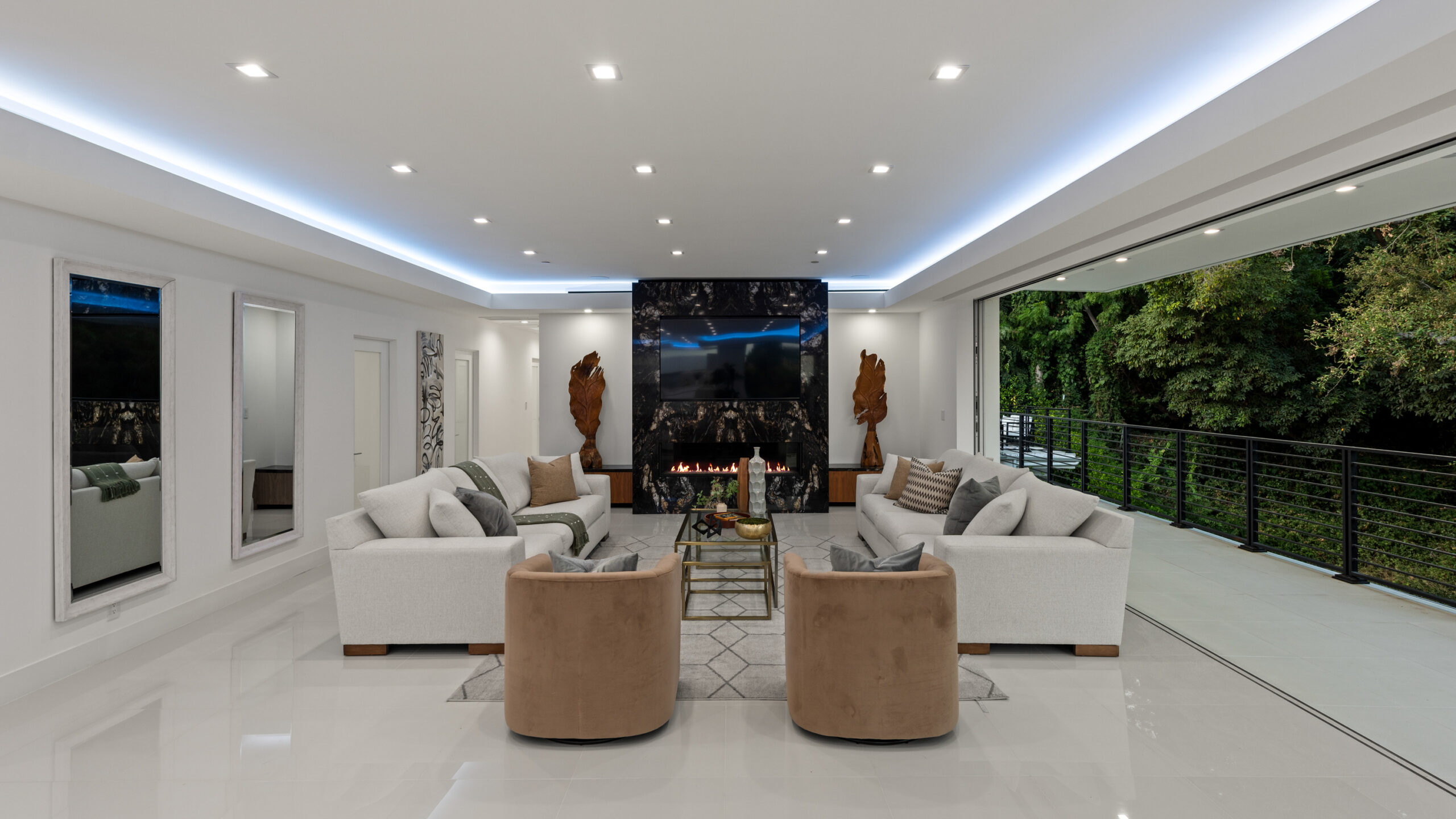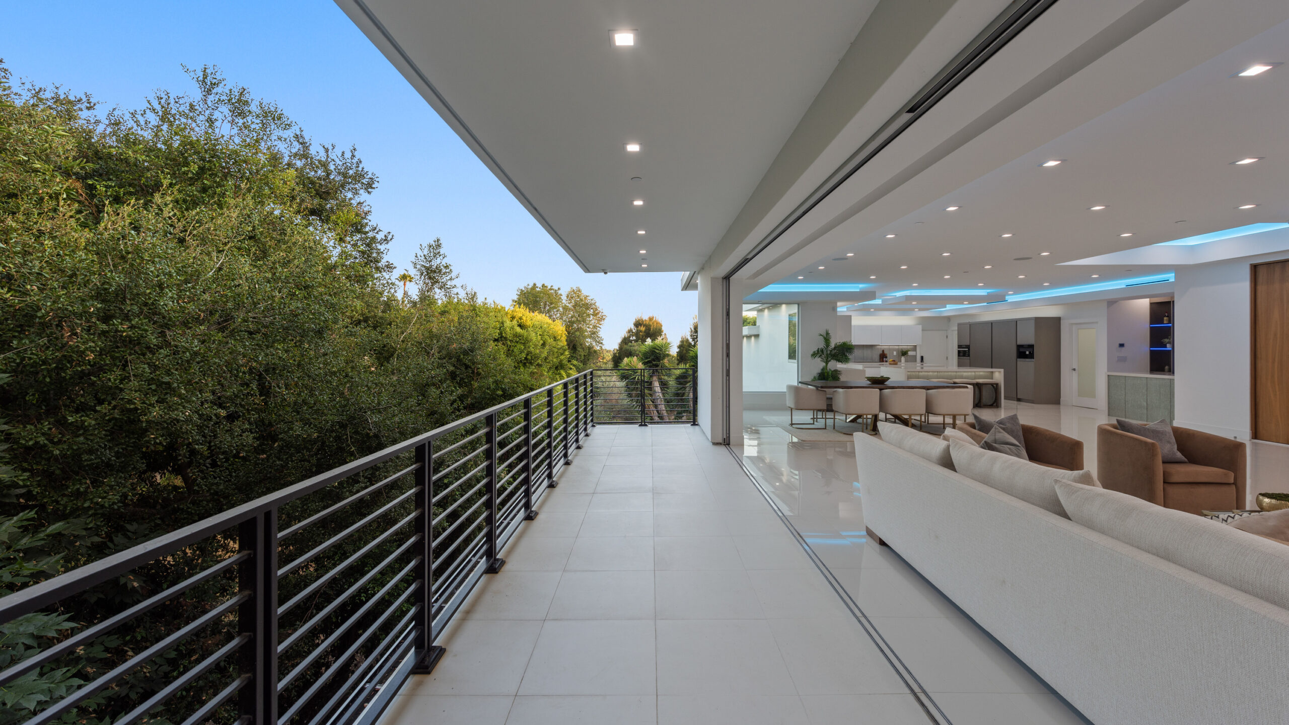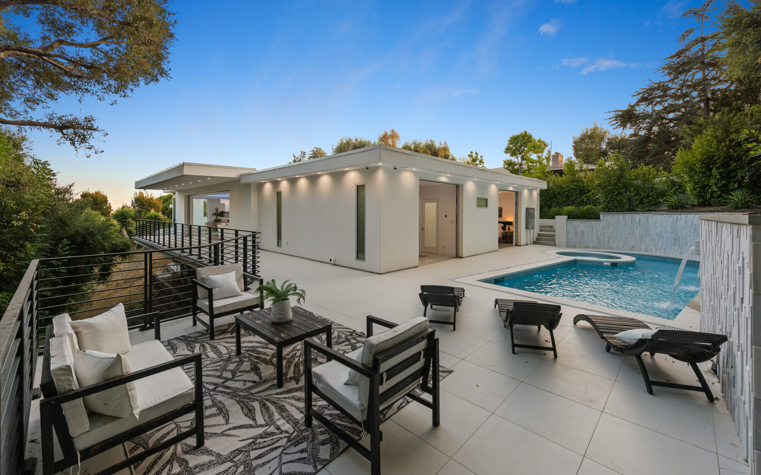 This newly rebuilt, gated smart home in Beverly Hills combines contemporary design with luxurious living. With its expansive frontage and standout curb appeal, the property features a backyard primed for a future outdoor oasis deck extension plans are already prepared and included in the sale. The home's interior showcases an open layout with disappearing floor-to-ceiling Fleetwood doors, unveiling stunning treetop views. A striking bookmatched slab fireplace anchors the living room, while the chef's kitchen includes dual islands, sleek cabinetry, and high-end Miele appliances like a steam oven, speed oven, multiple cooktops, and a Sub-Zero refrigerator/freezer. A custom wine cellar and dual-zone beverage cooler complete the adjacent bar area. The primary suite, opening directly to the pool, features a spacious walk-in closet and a spa-like en-suite bath. Generously sized secondary bedrooms all include smart bidet-equipped bathrooms, with an elegant powder room adding to the home's sophisticated appeal. This fully connected smart home includes surround sound, a top-tier security system, and offers outdoor amenities such as viewing decks, lounging spaces, a pool, spa, and a motor court. Located just moments from Rodeo Drive, renowned dining, and shopping, the home also provides easy access to top-rated Beverly Hills schools, offering a premier lifestyle in the city's heart.