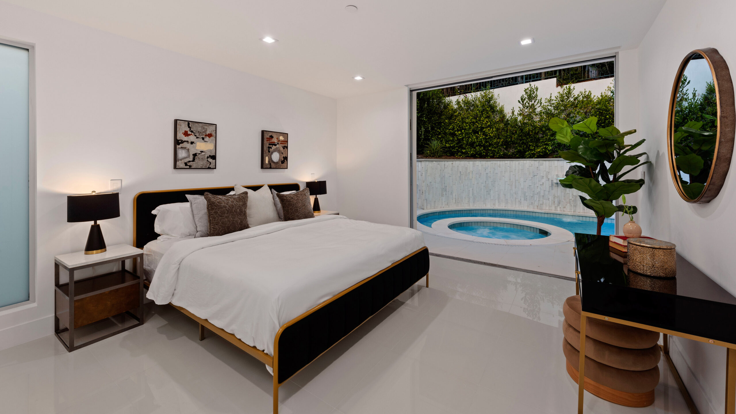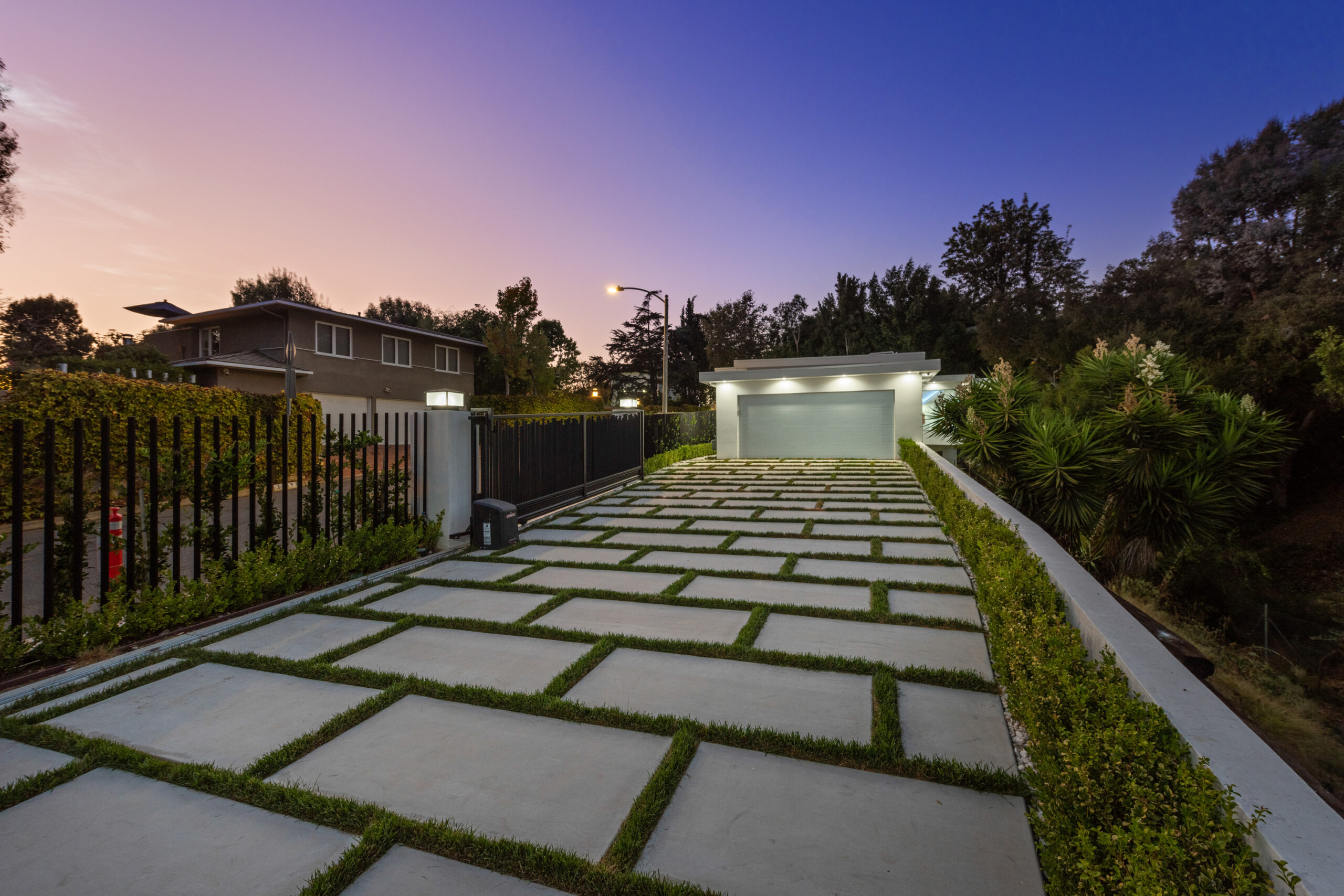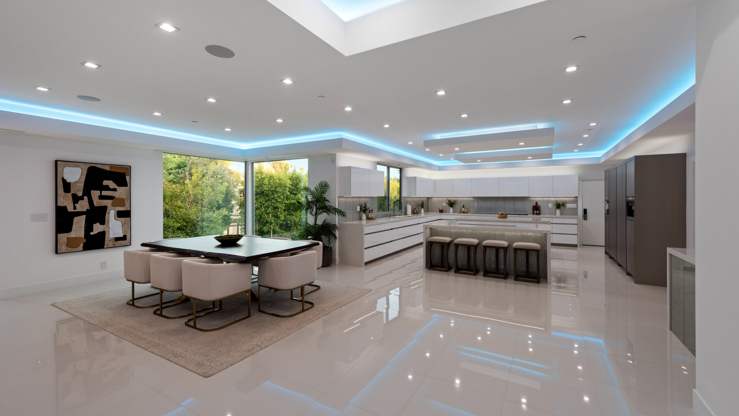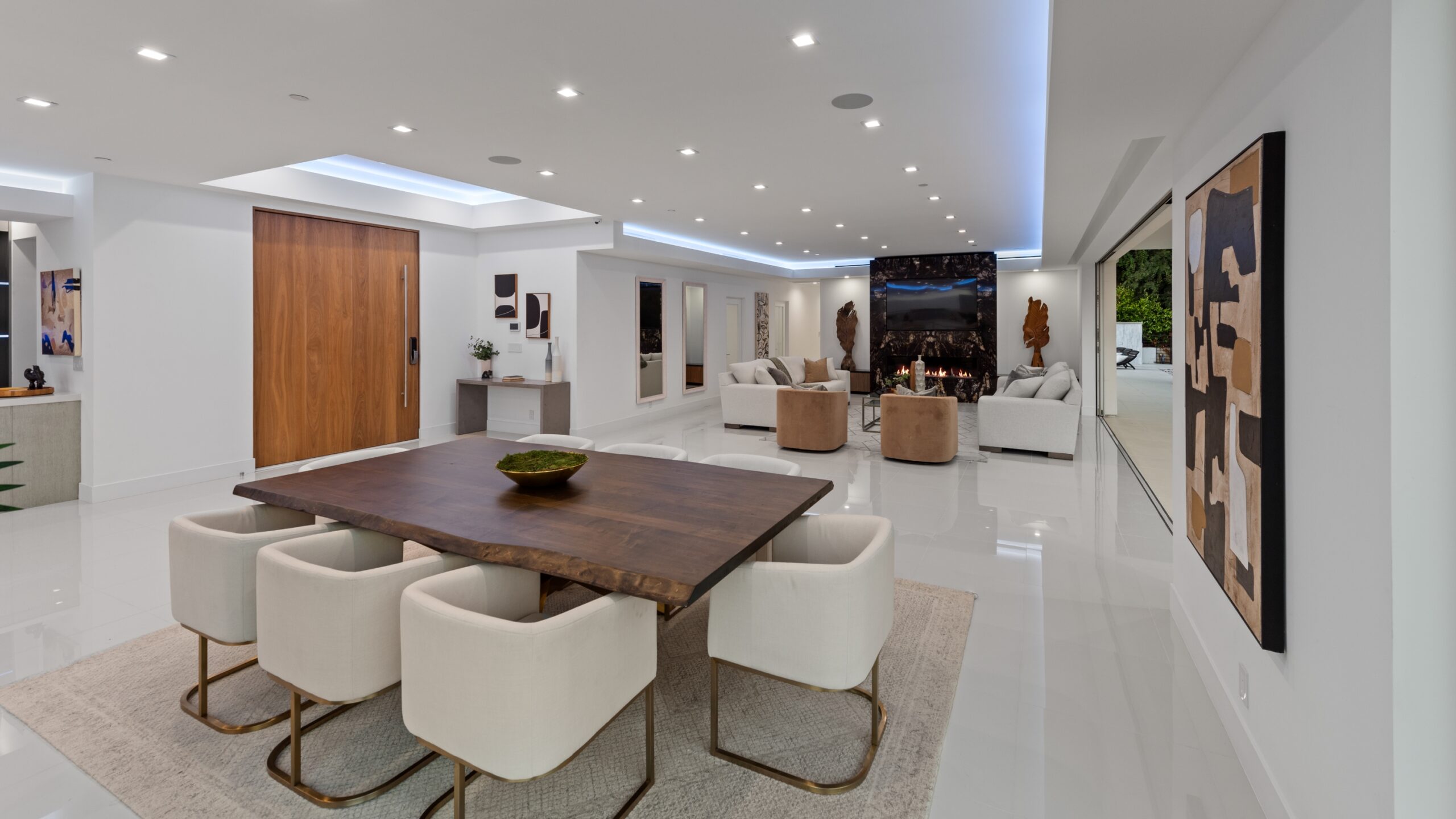 This newly rebuilt, gated smart home in Beverly Hills combines contemporary design with luxurious living. With its expansive frontage and standout curb appeal, the property features a backyard primed for a future outdoor oasis deck extension plans are already prepared and included in the sale. The home's interior showcases an open layout with disappearing floor-to-ceiling Fleetwood doors, unveiling stunning treetop views. A striking bookmatched slab fireplace anchors the living room, while the chef's kitchen includes dual islands, sleek cabinetry, and high-end Miele appliances like a steam oven, speed oven, multiple cooktops, and a Sub-Zero refrigerator/freezer. A custom wine cellar and dual-zone beverage cooler complete the adjacent bar area. The primary suite, opening directly to the pool, features a spacious walk-in closet and a spa-like en-suite bath. Generously sized secondary bedrooms all include smart bidet-equipped bathrooms, with an elegant powder room adding to the home's sophisticated appeal. This fully connected smart home includes surround sound, a top-tier security system, and offers outdoor amenities such as viewing decks, lounging spaces, a pool, spa, and a motor court. Located just moments from Rodeo Drive, renowned dining, and shopping, the home also provides easy access to top-rated Beverly Hills schools, offering a premier lifestyle in the city's heart.