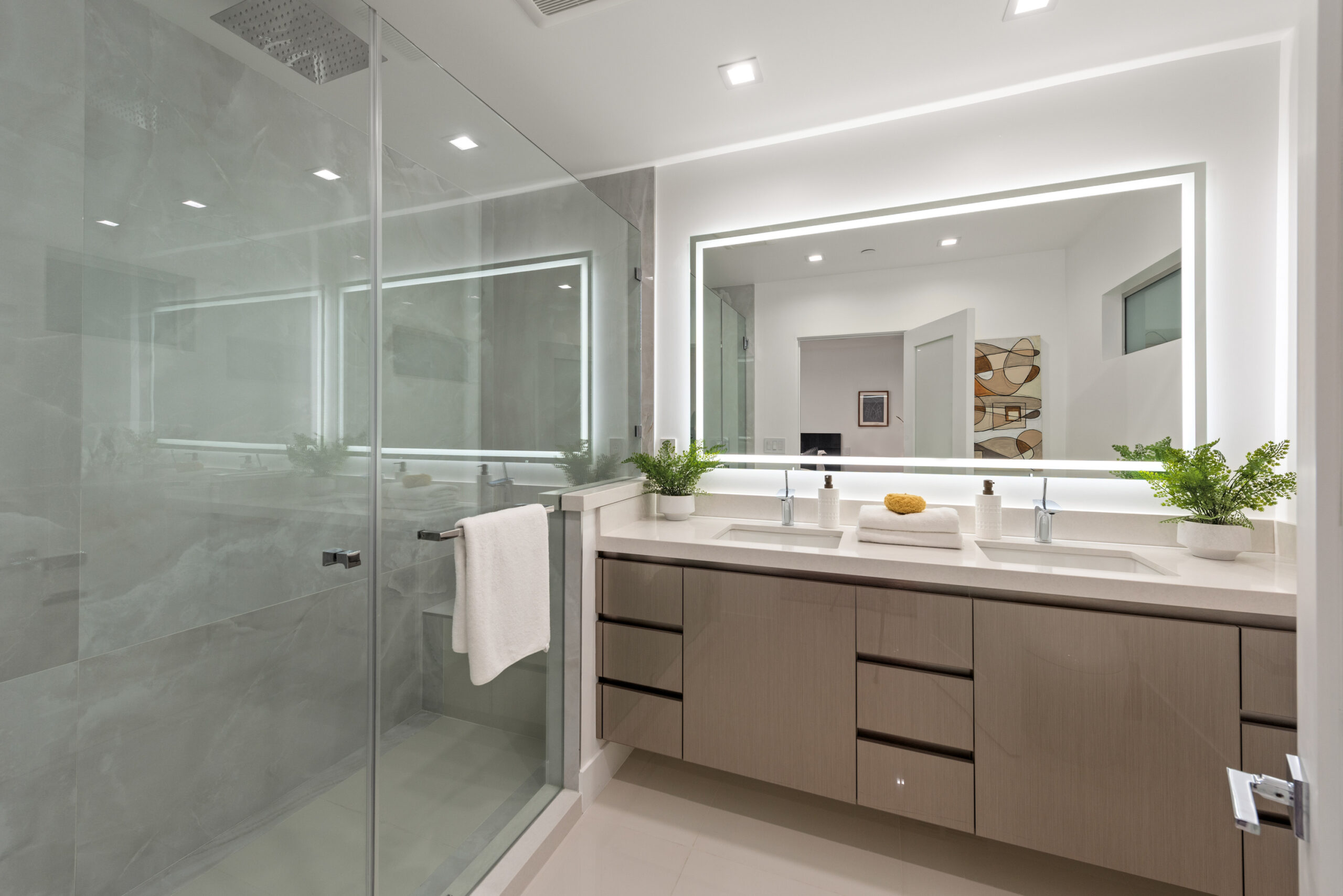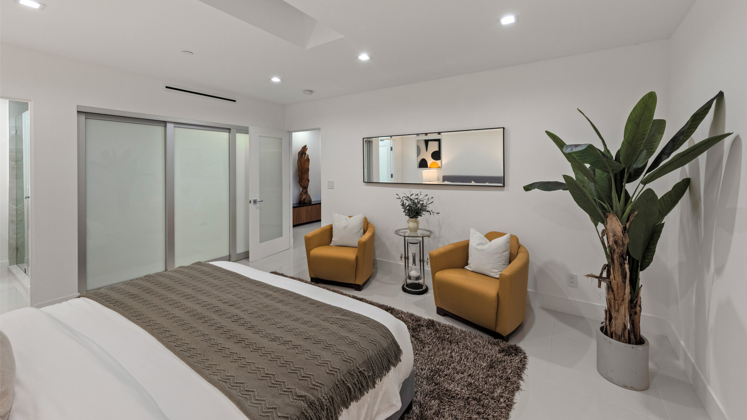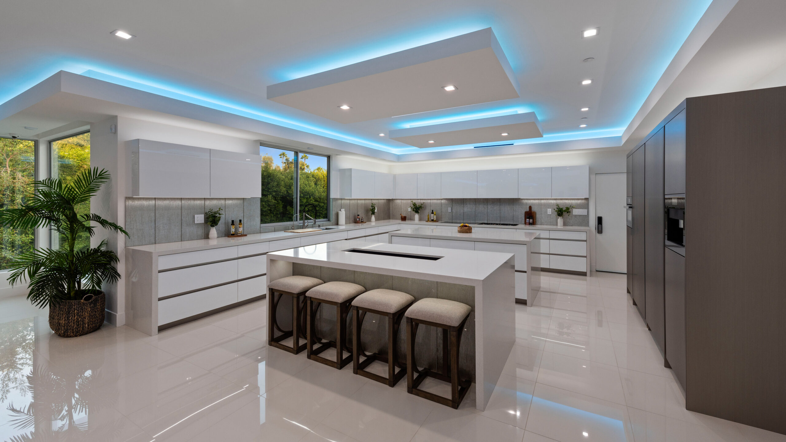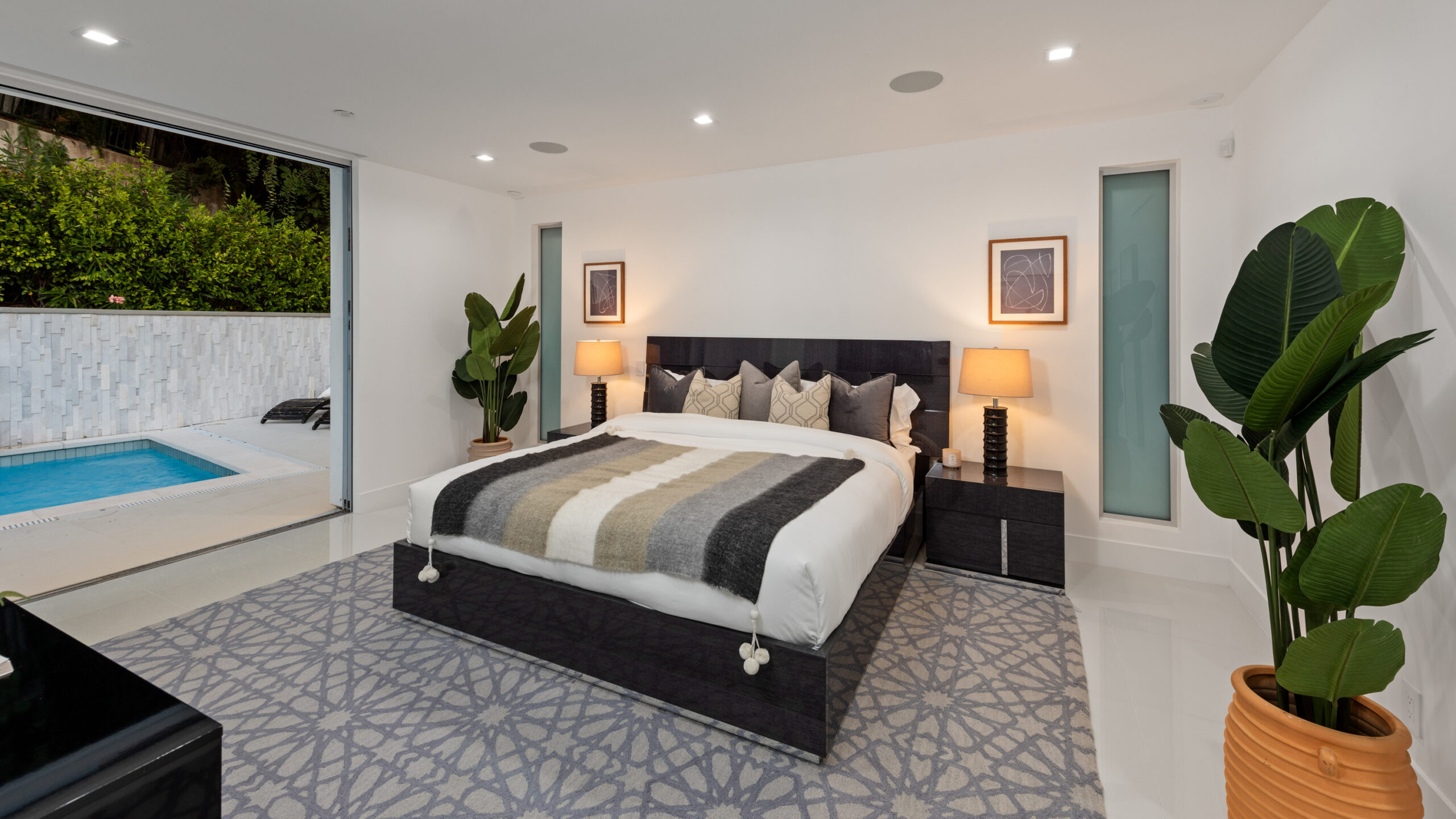 This newly rebuilt, gated smart home in Beverly Hills combines contemporary design with luxurious living. With its expansive frontage and standout curb appeal, the property features a backyard primed for a future outdoor oasis deck extension plans are already prepared and included in the sale. The home's interior showcases an open layout with disappearing floor-to-ceiling Fleetwood doors, unveiling stunning treetop views. A striking bookmatched slab fireplace anchors the living room, while the chef's kitchen includes dual islands, sleek cabinetry, and high-end Miele appliances like a steam oven, speed oven, multiple cooktops, and a Sub-Zero refrigerator/freezer. A custom wine cellar and dual-zone beverage cooler complete the adjacent bar area. The primary suite, opening directly to the pool, features a spacious walk-in closet and a spa-like en-suite bath. Generously sized secondary bedrooms all include smart bidet-equipped bathrooms, with an elegant powder room adding to the home's sophisticated appeal. This fully connected smart home includes surround sound, a top-tier security system, and offers outdoor amenities such as viewing decks, lounging spaces, a pool, spa, and a motor court. Located just moments from Rodeo Drive, renowned dining, and shopping, the home also provides easy access to top-rated Beverly Hills schools, offering a premier lifestyle in the city's heart.
