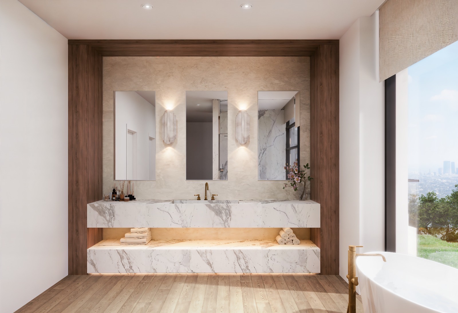 Perched at the end of a private cul-de-sac in Bel-Air, this newly reimagined Architectural estate spans approximately 10,000 square feet and showcases sweeping 270-degree views encompassing the Bel-Air Country Club, Pacific Ocean, Catalina Island, Century City, and Griffith Observatory. Behind its own secure gates, the residence offers a rare combination of modern luxury and total privacy. Dramatic ceilings and walls of glass flood the main level with natural light, revealing a grand great room, formal dining area with fireplace, state-of-the-art theater, and a sophisticated bar with a walk-in wine cellar. The gourmet chef's kitchen features dual islands with waterfall countertops, top-of-the-line appliances, and a separate prep kitchen. Fleetwood automated pocket doors blur the line between indoors and out, opening to expansive terraces with unobstructed panoramic vistas. Upstairs, the ultra-private primary suite serves as a true retreat with its own sitting room, wet bar, and dual bathrooms with sweeping views. Three additional en-suite bedrooms and a secondary family room complete the level. The meticulously landscaped grounds feature mature hedges for privacy, an infinity-edge cantilevered pool, spa, outdoor bar and BBQ, and a generous lawn, all oriented toward the captivating skyline and ocean views. A statement of design and scale, this Bel-Air estate epitomizes the ultimate entertainer's dream.