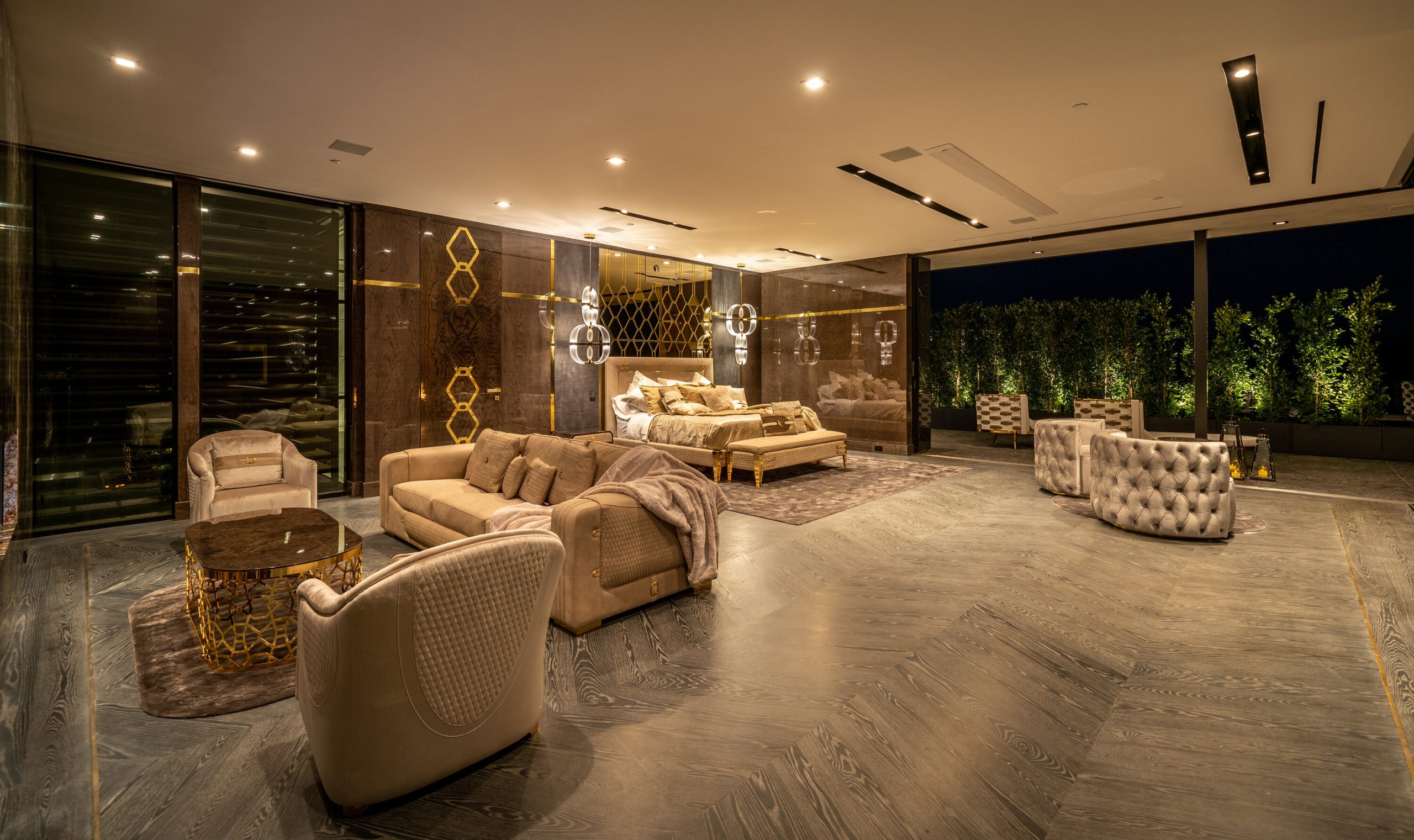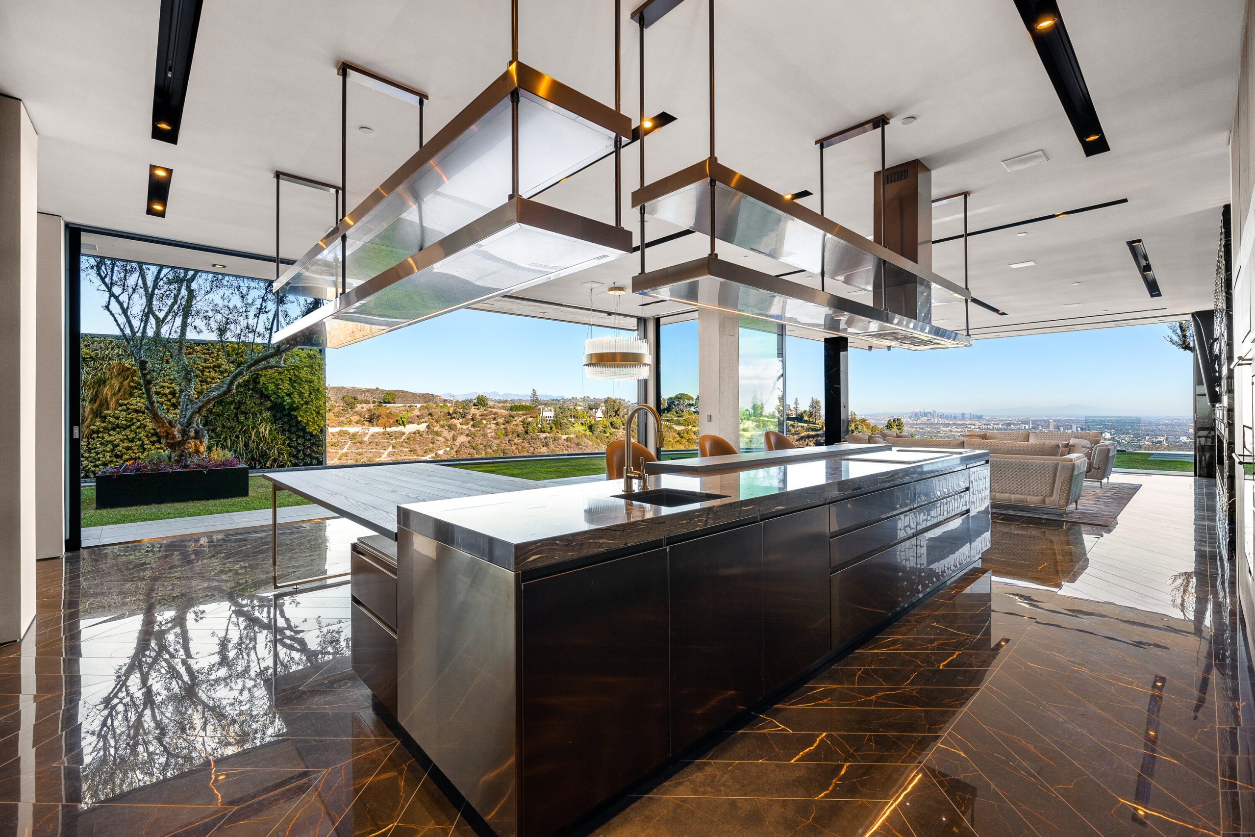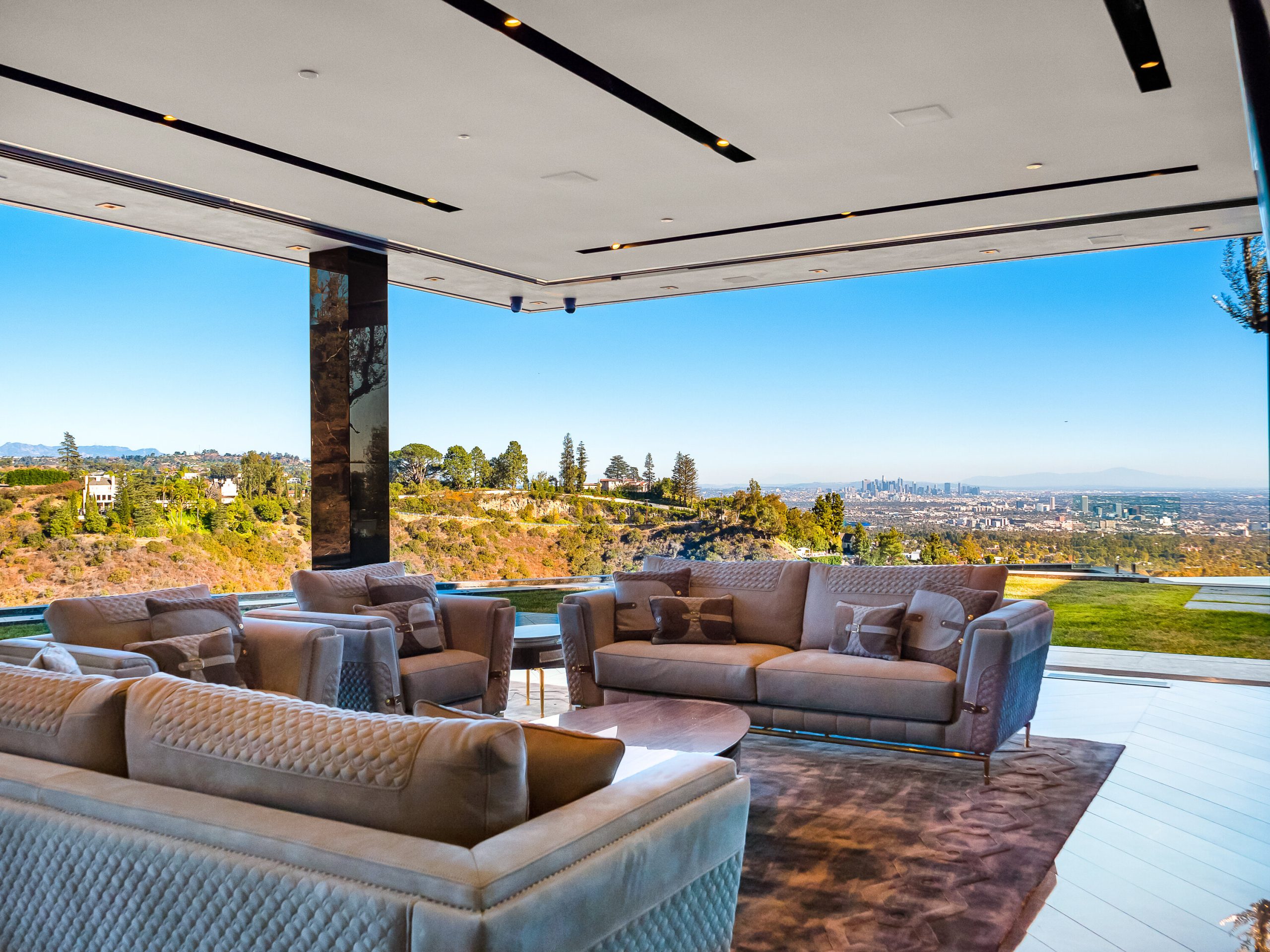 Seller accepts crypto! Experience the pinnacle of lavish splendor and quiet comfort at La Fin, or The End, aptly named as the ultimate, final example of modern decadence and refinement; the be-all and end-all experience in one of the world's most famous and exclusive enclaves. Sited on a two-acre parcel, this magnificent residence offers 12 spacious bedrooms, 17 bathrooms, remarkable amenities, and brilliant panoramic views of Los Angeles. Just beyond the gated motor court, proceed down to the oversized glass entryway to one of the most beautiful and opulent homes the globe over. A spiral staircase surrounds a stunning 44-foot chandelier made of 55,000 crystals, a showstopping centerpiece yet just one of the impressive custom lighting sculptures throughout the home. The main level features a custom stone bar that flows into the formal living area with a massive hand-carved stone latticework fireplace. All furniture was custom-made for La Fin by Italian luxury brand La Contessina. Motorized Fleetwood pocket doors open to the infinity-edge pool with a striking 23-foot LED screen that rises at the touch of a button and a 30-person lounge area with fire pit. The lower level provides a 6,000-square-foot entertainment area with lofty 18-foot ceilings, custom bar, commercial-grade catering facilities, 1,000-bottle wine cellar, cigar lounge, ice-cold vodka tasting room, and a jaw-dropping automated six-car vehicle elevator display. Additional amenities on the lower level include an outdoor lounge area, luxury fitness center with rock climbing wall, spa, steam room with backlit onyx, massage room, and sound-proof cinema. The second level features a grand primary suite with Italian hand-crafted floor-to-ceiling oak cladding, lounge area, coffee bar, spa-like bathroom with Calacatta Gold marble, massive 100-square-foot shower, solid marble vanity, dual showroom-style walk-in closets, and private wraparound balcony with sweeping views, spa, fire pit, and TV. The rooftop deck offers additional outdoor/entertainment space with built-in seating, fire table, video screen, elevated spa, and even more incredible vistas. Staff residences and a detached guest suite offer ample space. Fingerprint technology and security command center provide the utmost privacy and safety. The meticulously designed and curated La Fin is a once-in-a-lifetime Bel Air estate that can only be admired but never replicated.