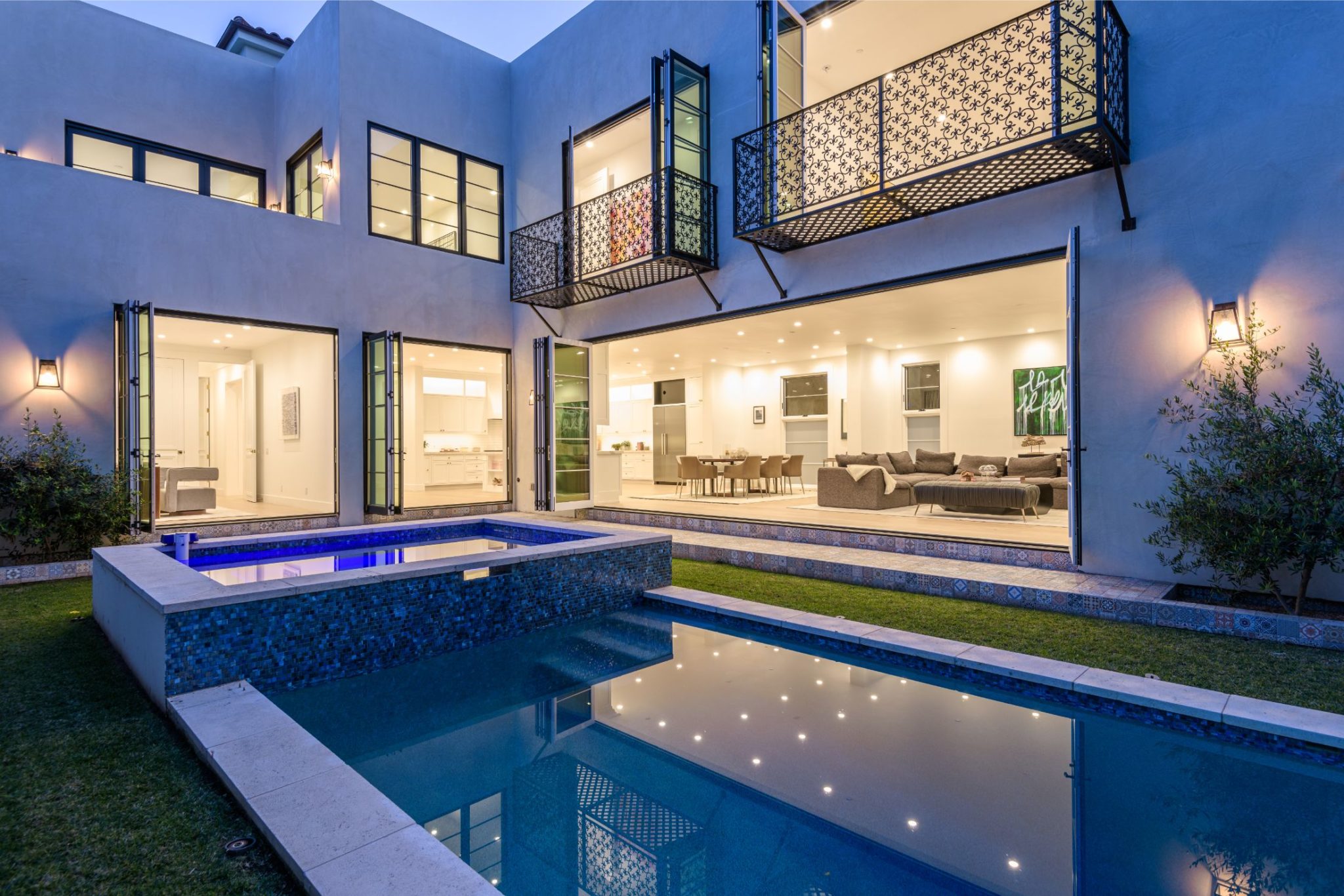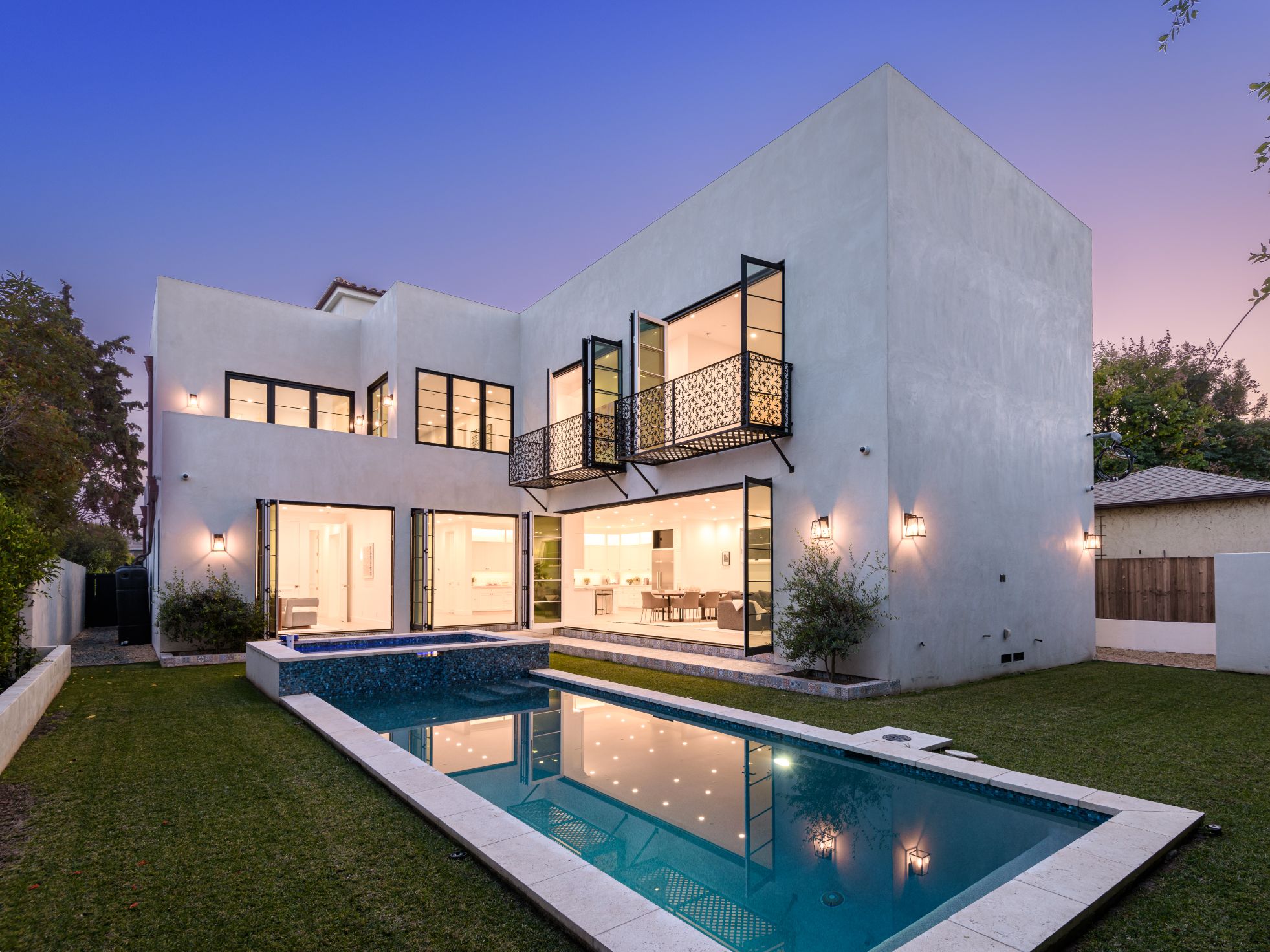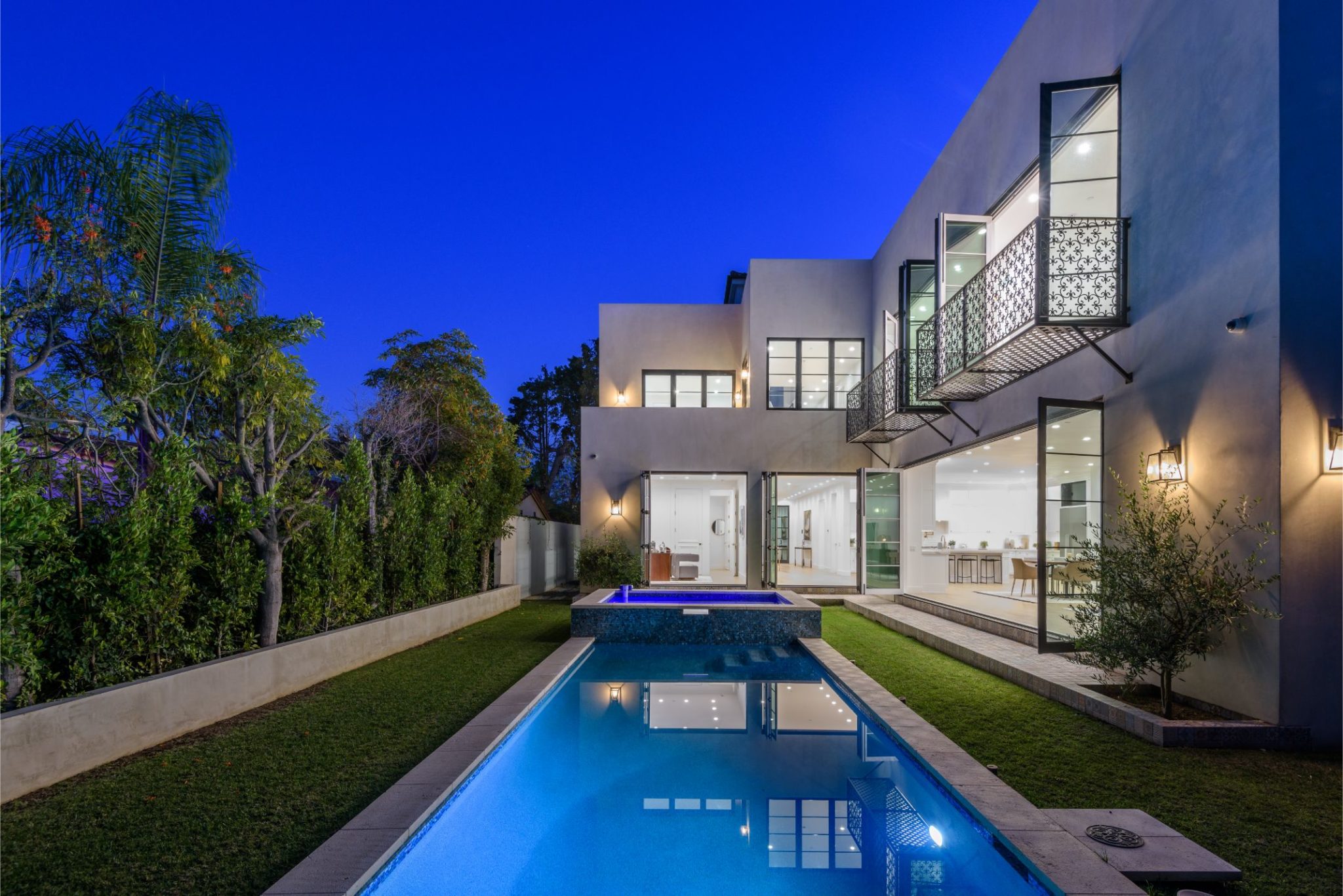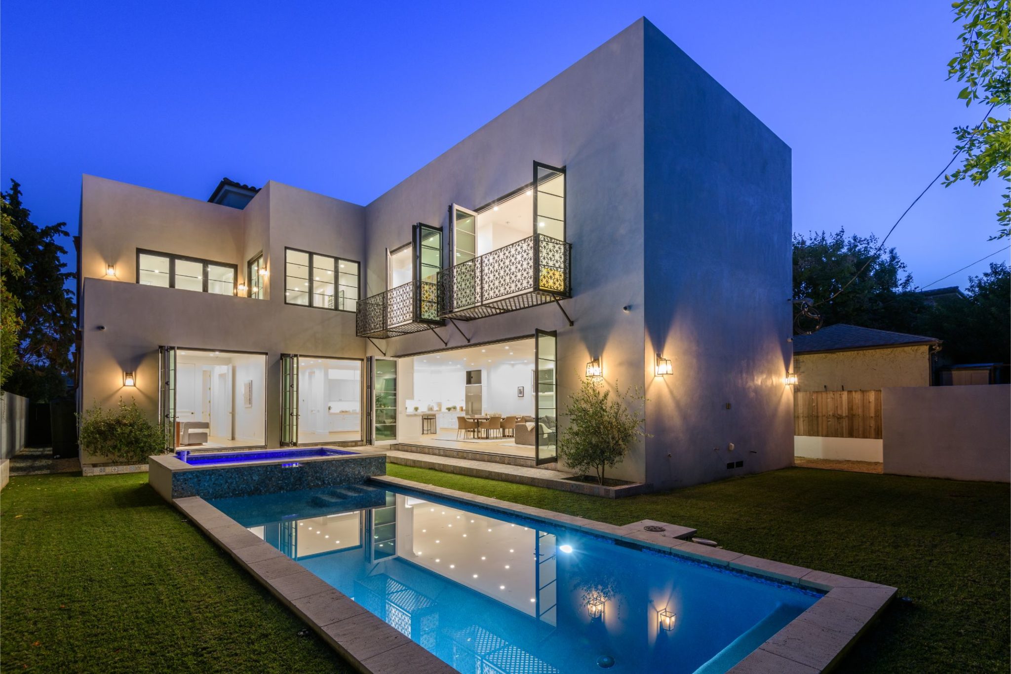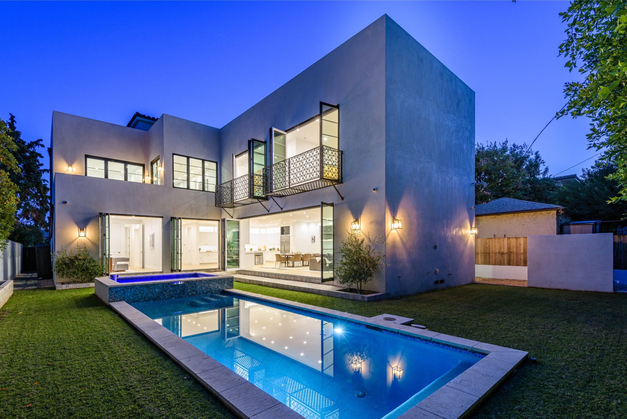 New construction with the perfect combination of old world Spanish charm and contemporary design. A gate providing privacy and security with a large motor court lies before this incredible 4770 sq.ft home with approximately 3500 sq. ft of outdoor terraces. Double glass steel doors lead you into the open floor plan with 10' ceilings and French oak floors throughout. An entertainers dream with an enormous great room that flows into a custom kitchen with Calcutta marble countertops and island, maple Shaker cabinets, Miele appliances and brushed brass fixtures. Multiple sets of Lincoln bi-fold doors open out to the grassy yard and saltwater pool and jacuzzi.Two additional bedrooms and separate laundry room complete the downstairs. Three en-suite bedroom upstairs features a master with sitting area, Carrera marble bathroom with large rain shower, separate steam shower and freestanding soaking tub. The private rooftop deck has multiple sitting areas.