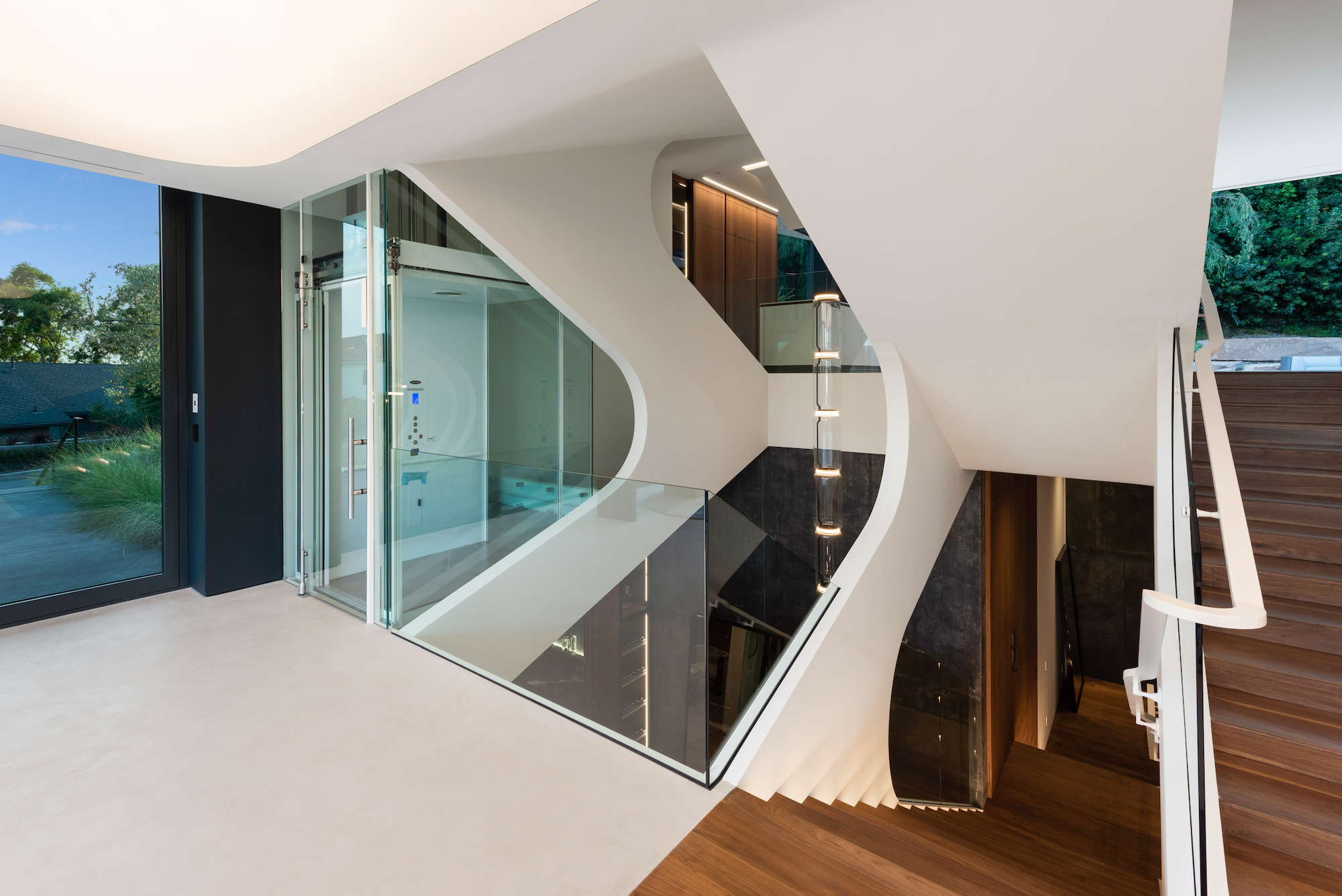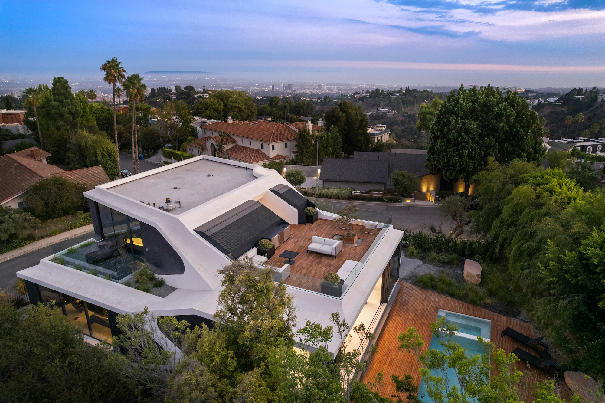 Recognized as a work of art and beauty, this property has already won TEN Architectural awards. Situated in the highly coveted hills of Bel Air sits this 2022 new construction, stunningly reimagined, automotive inspired 4-bedroom, 5-bathroom property that was CNC milled from digital design. Showcasing a dynamic 16-foot cantilever for the second floor, creating an impressive canopy and shaded prelude, this one-of-a-kind property reveals unique design and custom finishes that are second to none. The split-level architecture with central stairs alongside the frameless glass elevator cabin allows an abundance of bright, natural light that is all consuming. Floor to ceiling Belgian glass windows and a mechanized door system allow a seamless indoor/outdoor flow to the multiple decks, side, and back yard. The main level includes an expansive living room with fireplace, soaring ceilings, and family room. Ascend up the steps to the dining space and gourmet chef's kitchen that is equipped with DOCA luxury cabinetry and Dekton door-faces, countertops, and walnut recess detailing, all while opening up directly to the backyard with lush landscaping and a large pool/spa. Up the stairs or elevator, make your way to the spacious primary suite containing glass closets furnished with integral lighting, amber doors, a separate sitting room, and spa-like bathroom with marble slab walls and flooring with matching Agape sinks and faucets - all looking out to incredible views from the Getty to the Pacific. Included on this upper level is the rooftop deck that allows for prime views all the way to the Pacific Ocean, and is built with a raised pedestal floor system that eliminates standing rainwater. The Museum-quality basement grand room sports exposed raw black concrete walls that juxtaposes with the refined house textures and furnishings while housing the felt wall and cork floor home theatre that is designed with luxury minimalistic aesthetics and a custom built integral diffused ceiling light. There are three additional bedroom and bathrooms on the lower floor that are also equipped with glass closets and separate en-suite bathrooms with Graff luxury fixtures, wall-hung Catalano toilets, and imported Spanish tile work. Additional features include a 3-car attached garage, recessed space for future solar panel integration on the roof, minimal linear and pinhole LED lighting design for ambient and task lighting, recessed wall and ceiling housing for smart home keypads and devices, and seamless high quality plaster flooring and walls in select rooms and the exterior facade.