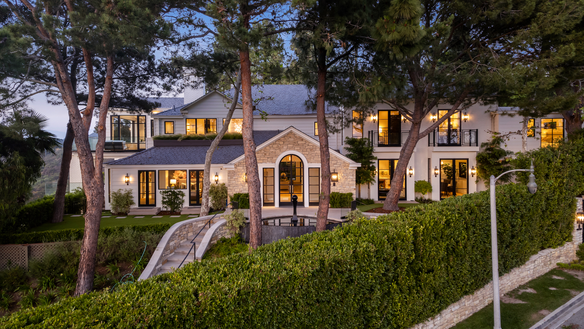 Situated in the prestigious hills of Bel Air sits this breathtaking property, offering an unparalleled combination of elegance and privacy with panoramic views. Cut into a soaring Ficas hedge alongside a 270' long stone wall is a tall grand gate that opens to a meticulously landscaped yard featuring a beautiful water feature and welcoming you to your front door. Upon entering the meticulously renovated residence, you are immediately struck by the abundance of natural light that floods the open living spaces. The interior boasts exquisite craftsmanship, high ceilings, and expansive floor-to-ceiling doors and windows that perfectly frame the breathtaking vistas. The spacious living room is an entertainer's dream, featuring a wood burning fireplace and sumptuous bar with seamless integration to the outdoor living areas. The gourmet Waterworks kitchen is a culinary enthusiast's delight, equipped with top-of-the-line appliances, sleek cabinetry, and a generous island for culinary creations and casual dining. The primary suite is a private oasis, offering a serene retreat from the outside world. It features two en-suite bathrooms, one with walk in shower and soaking tub alongside French doors opening to a private juliette balcony. The other, a steam shower with door opening to a private balcony more wide open vistas and stunning sunsets. Additionally, the suite offers a spacious private balcony where you can unwind and enjoy the tranquil, spectacular canyon views to the distant snowcapped San Gabriel mountains. The lush backyard hosts a generous sized pool, spa and built-in BBQ. Additionally, the home underwent a 4-year renovation and is equipped with smart home technology, ensuring comfort and convenience at your fingertips. Whether you are hosting an elegant soiree or simply seeking a peaceful sanctuary, 1260 Bel Air Rd provides the perfect setting.