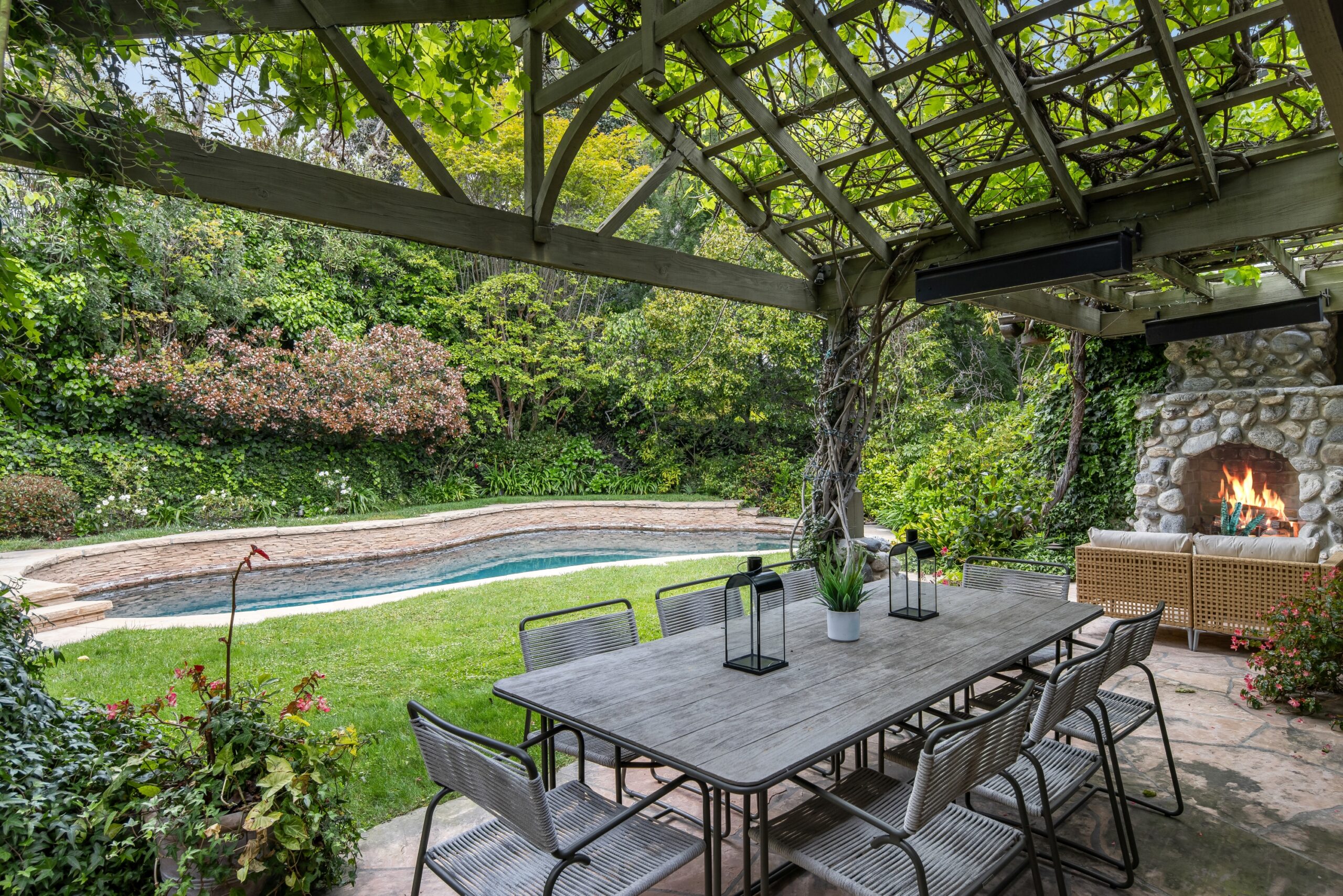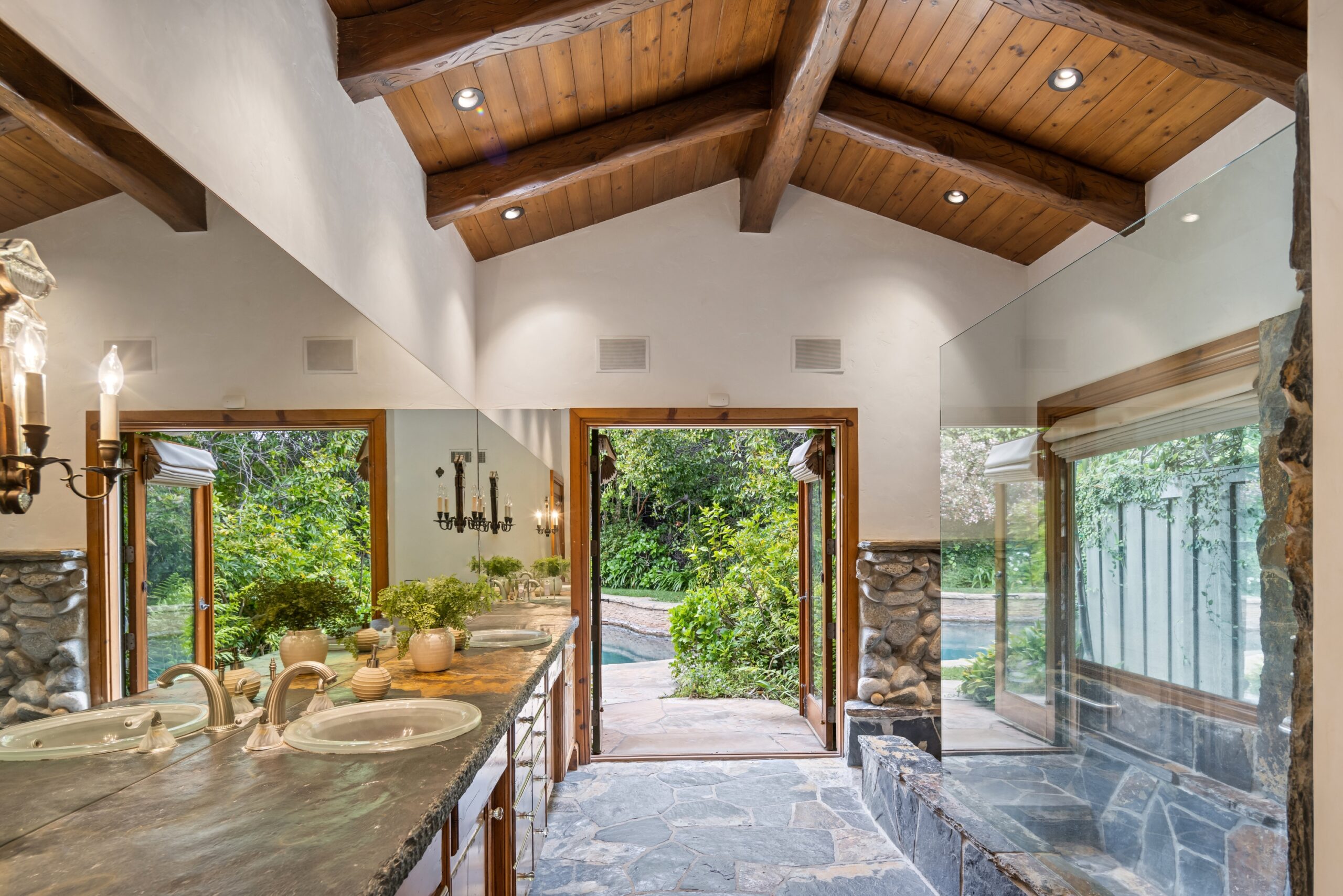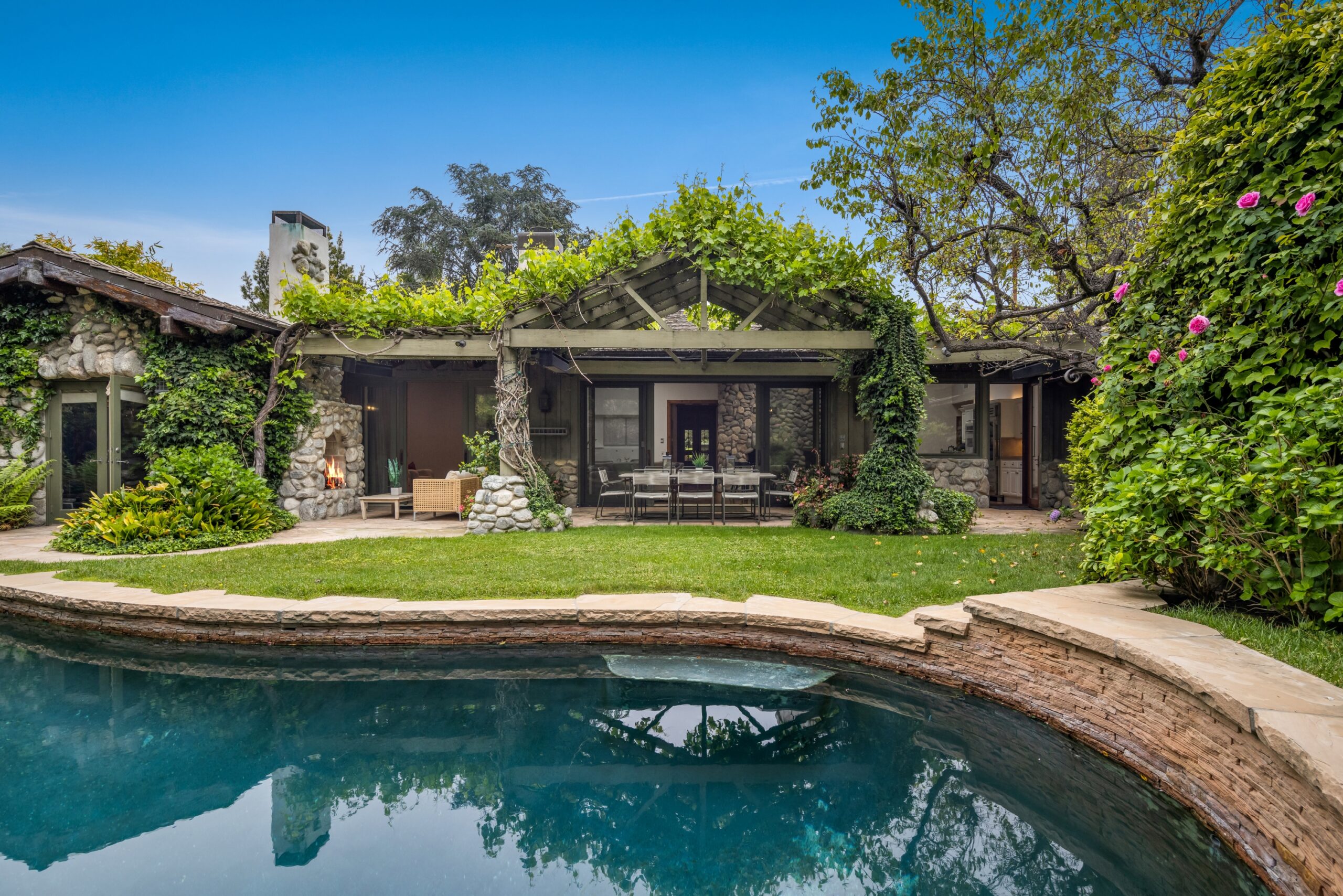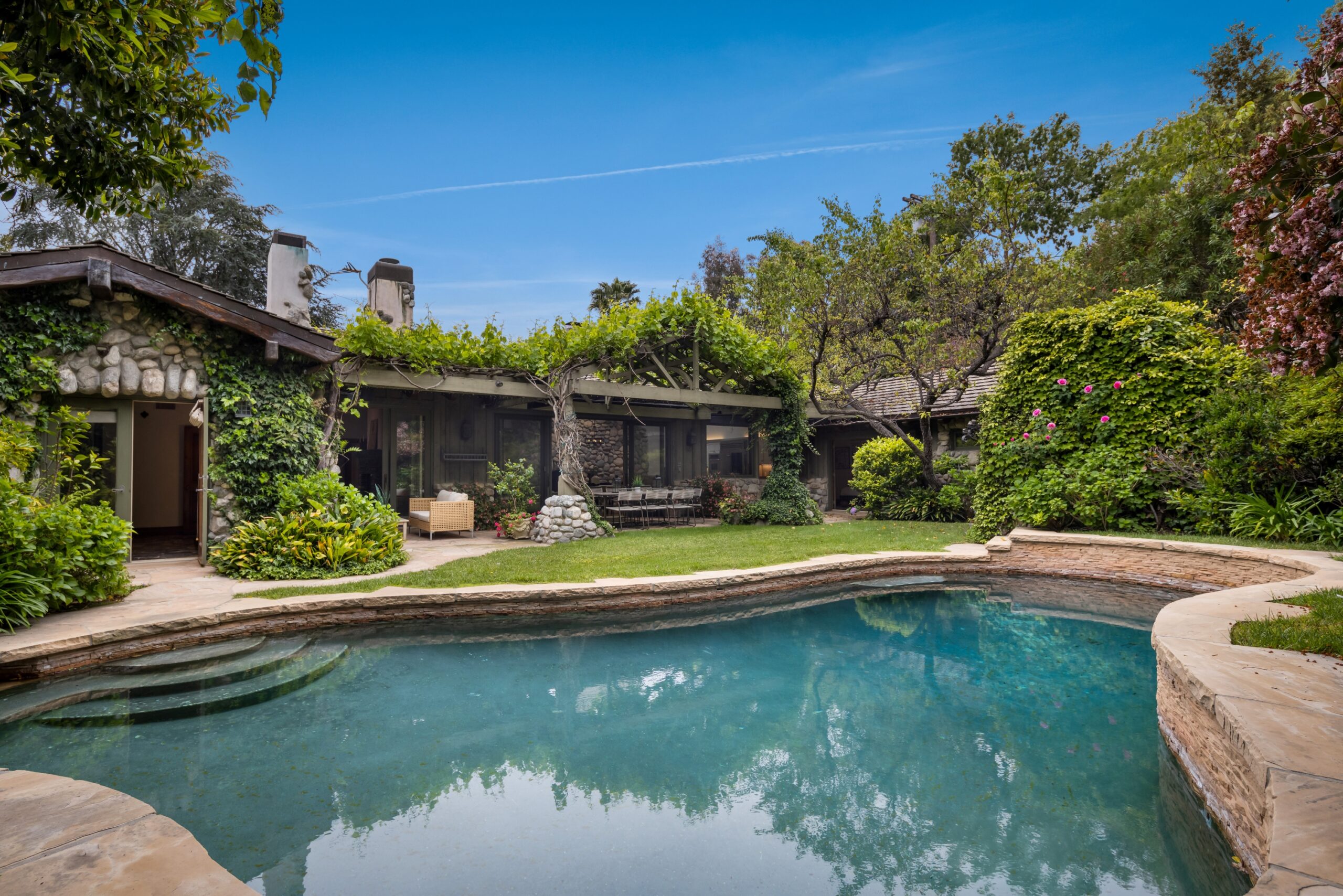 Sited in one of the most exclusive and coveted neighborhoods in the entirety of Los Angeles, 12733 Parkyns is an acclaimed estate that executes a harmonious blend of traditional and lodge style design and architecture. Crafted for those who want their home to feel just as such, this charming home gives you the feel of nature and tranquility while being mere minutes from world famous beaches, shopping, dining, and entertainment. Spanning 3,241 square feet on one level with 3 oversized bedrooms and 3.5 bathrooms, you will find grand vaulted and beamed ceilings throughout that pay homage to its special and unique design. Just outside of your fully outfitted kitchen are stunning lush gardens and landscaping that encase your pool fit for the most memorable of parties and get-togethers. A beautiful fireplace in the middle of the yard complements the spa area along with the rest of the yard, accompanied by another charming stone fireplace anchoring the outdoor dining area. Truly one of the most peaceful yet breathtaking homes in Los Angeles, 12733 Parkyns awaits its next owner to create their most memorable moments at home!