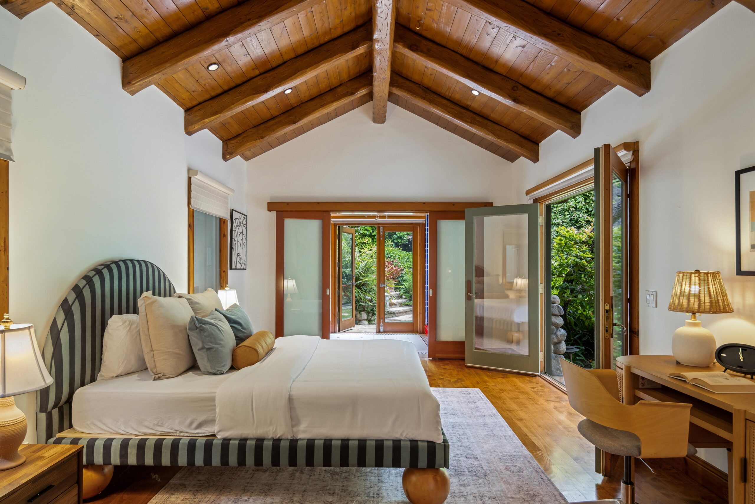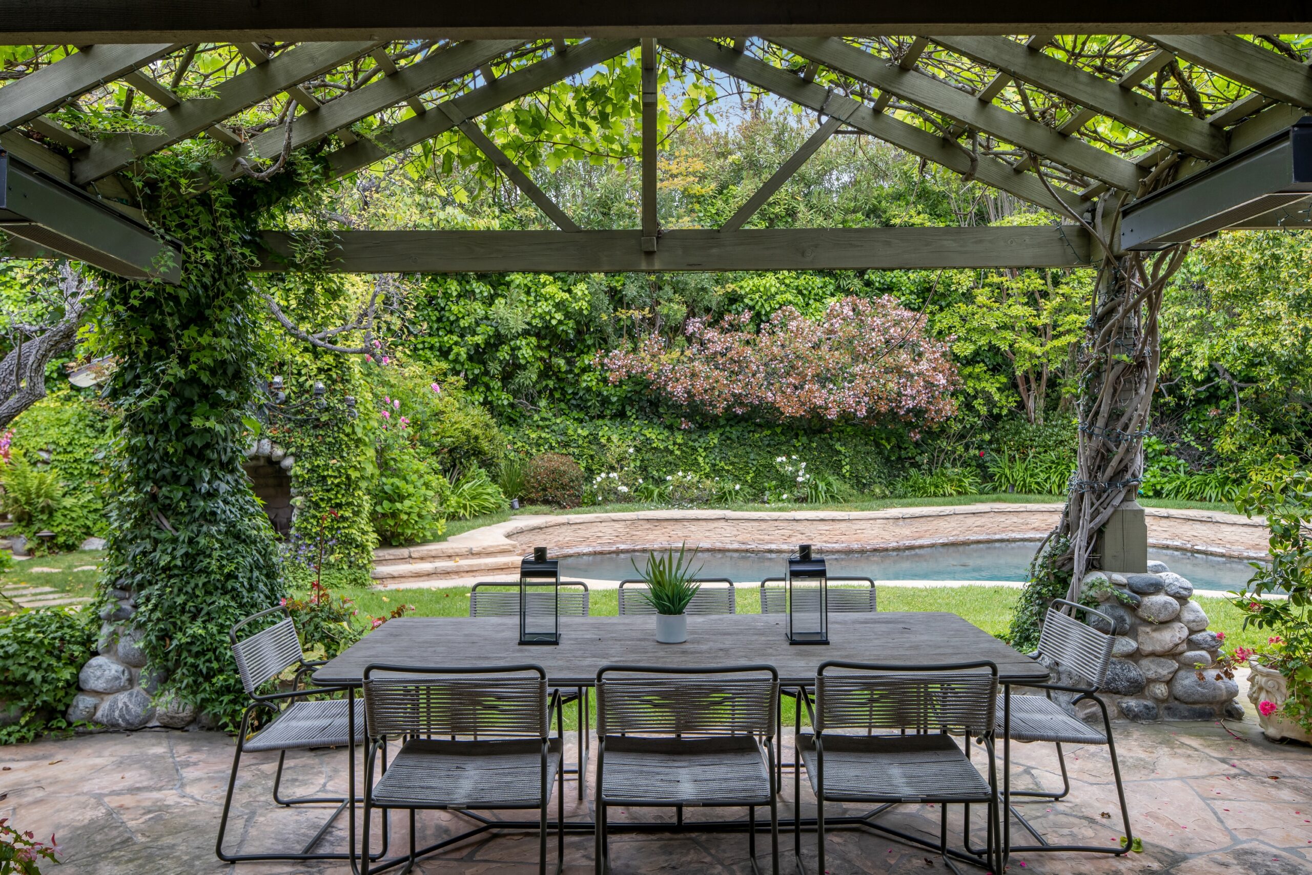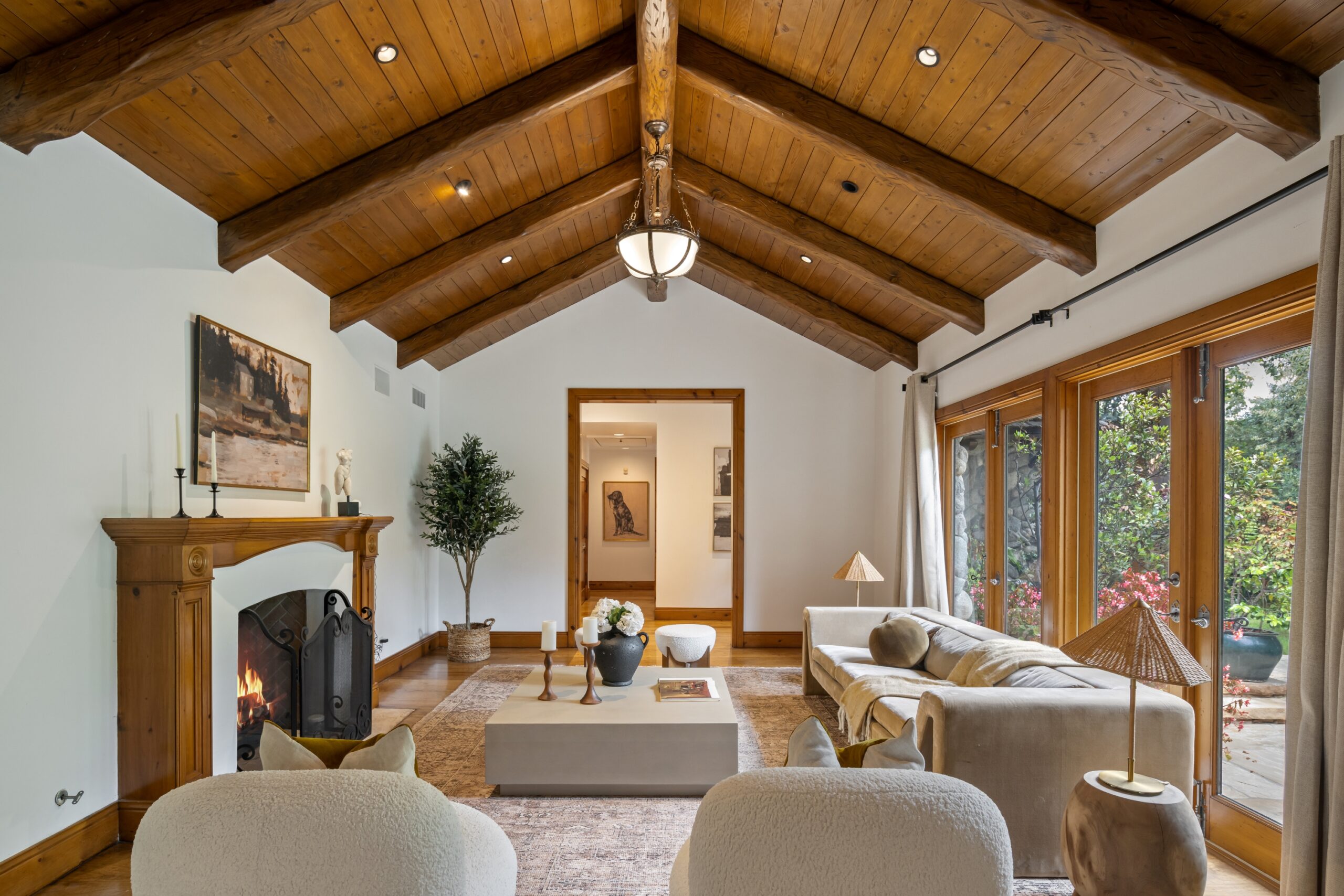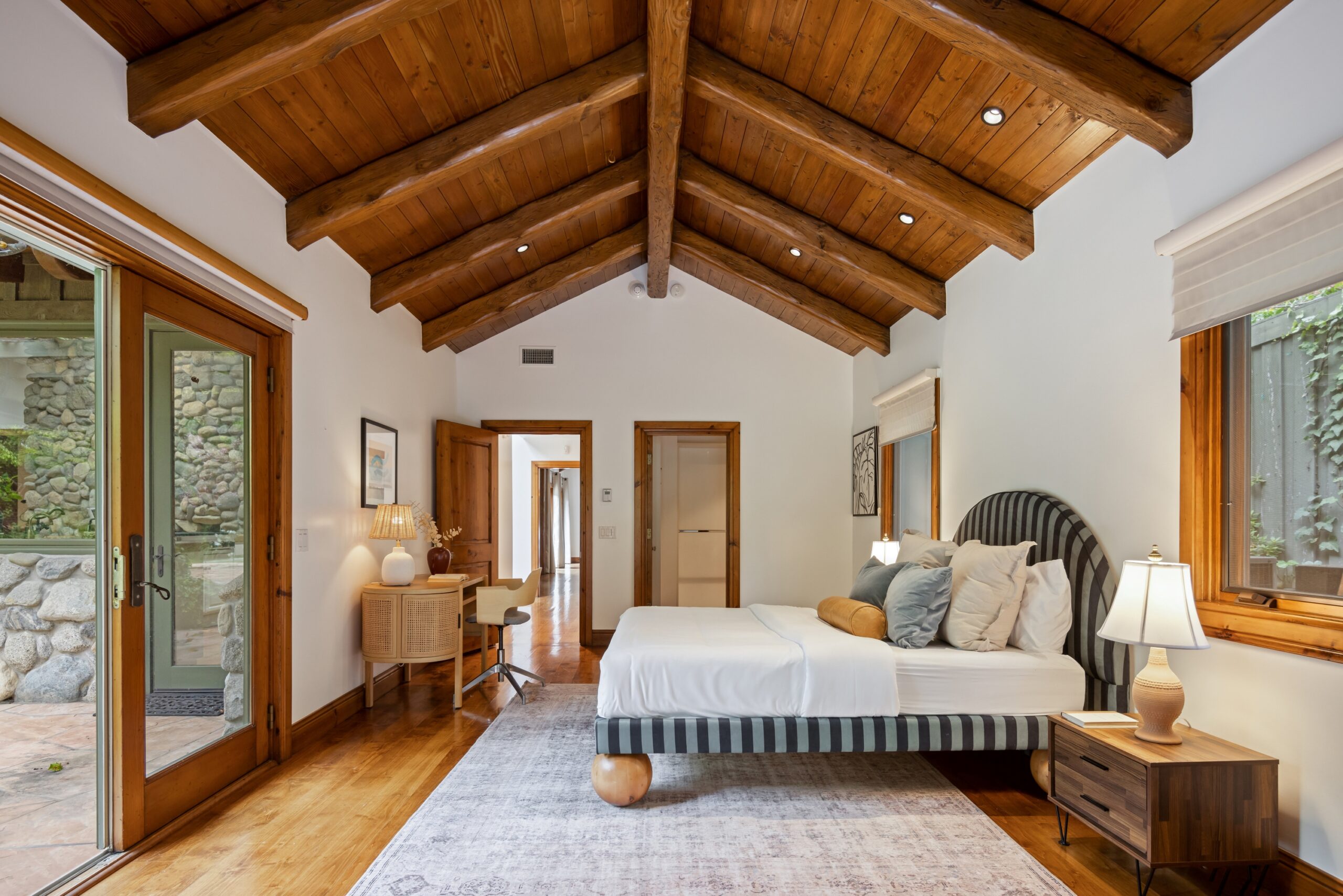 Sited in one of the most exclusive and coveted neighborhoods in the entirety of Los Angeles, 12733 Parkyns is an acclaimed estate that executes a harmonious blend of traditional and lodge style design and architecture. Crafted for those who want their home to feel just as such, this charming home gives you the feel of nature and tranquility while being mere minutes from world famous beaches, shopping, dining, and entertainment. Spanning 3,241 square feet on one level with 3 oversized bedrooms and 3.5 bathrooms, you will find grand vaulted and beamed ceilings throughout that pay homage to its special and unique design. Just outside of your fully outfitted kitchen are stunning lush gardens and landscaping that encase your pool fit for the most memorable of parties and get-togethers. A beautiful fireplace in the middle of the yard complements the spa area along with the rest of the yard, accompanied by another charming stone fireplace anchoring the outdoor dining area. Truly one of the most peaceful yet breathtaking homes in Los Angeles, 12733 Parkyns awaits its next owner to create their most memorable moments at home!