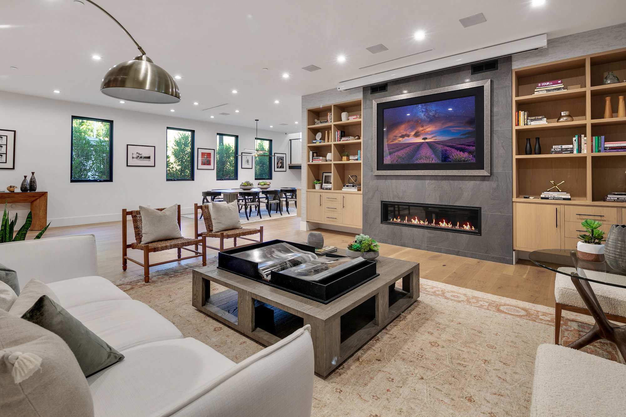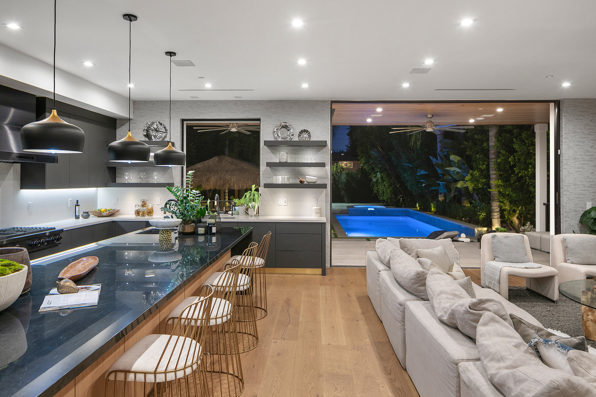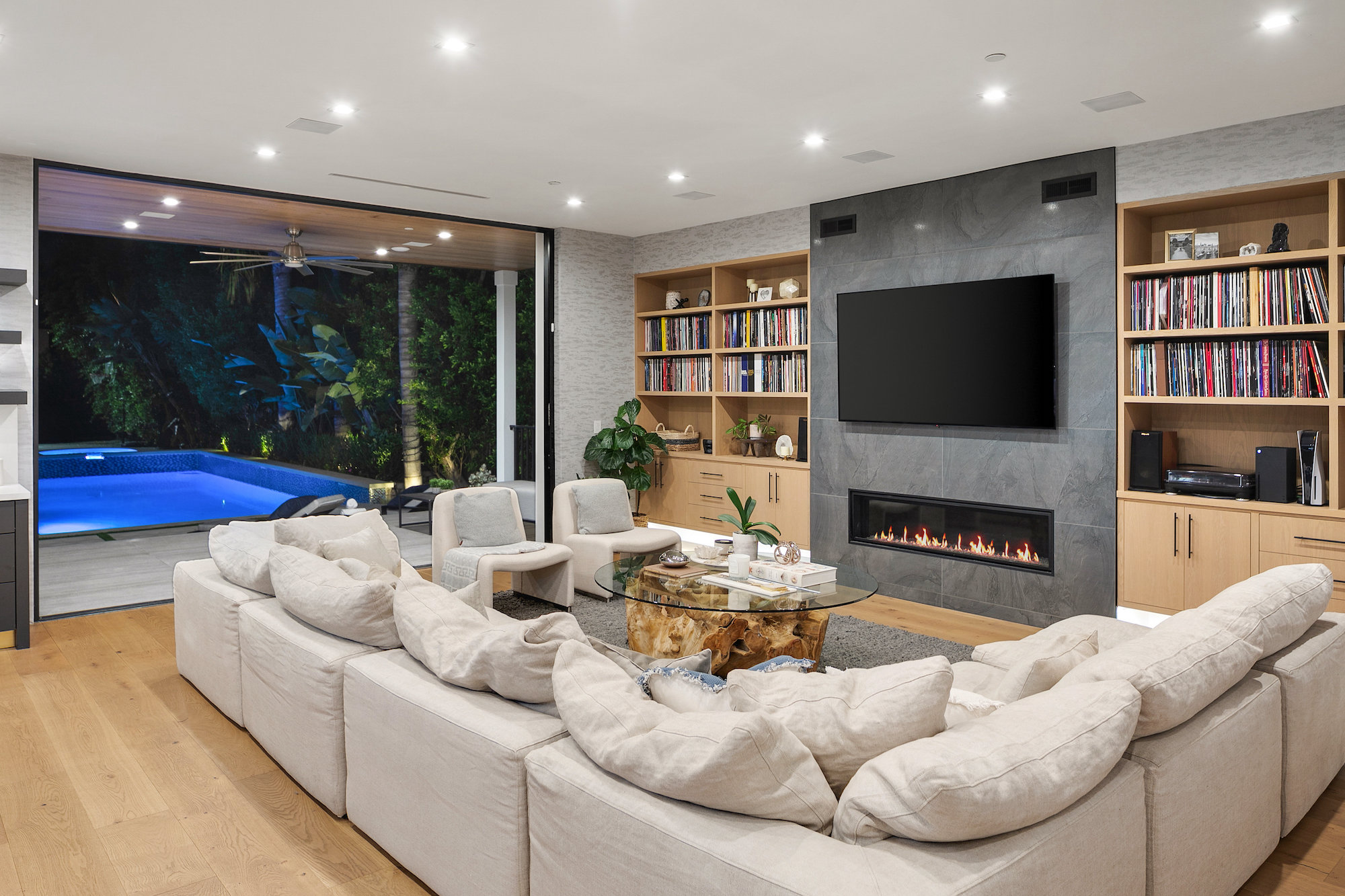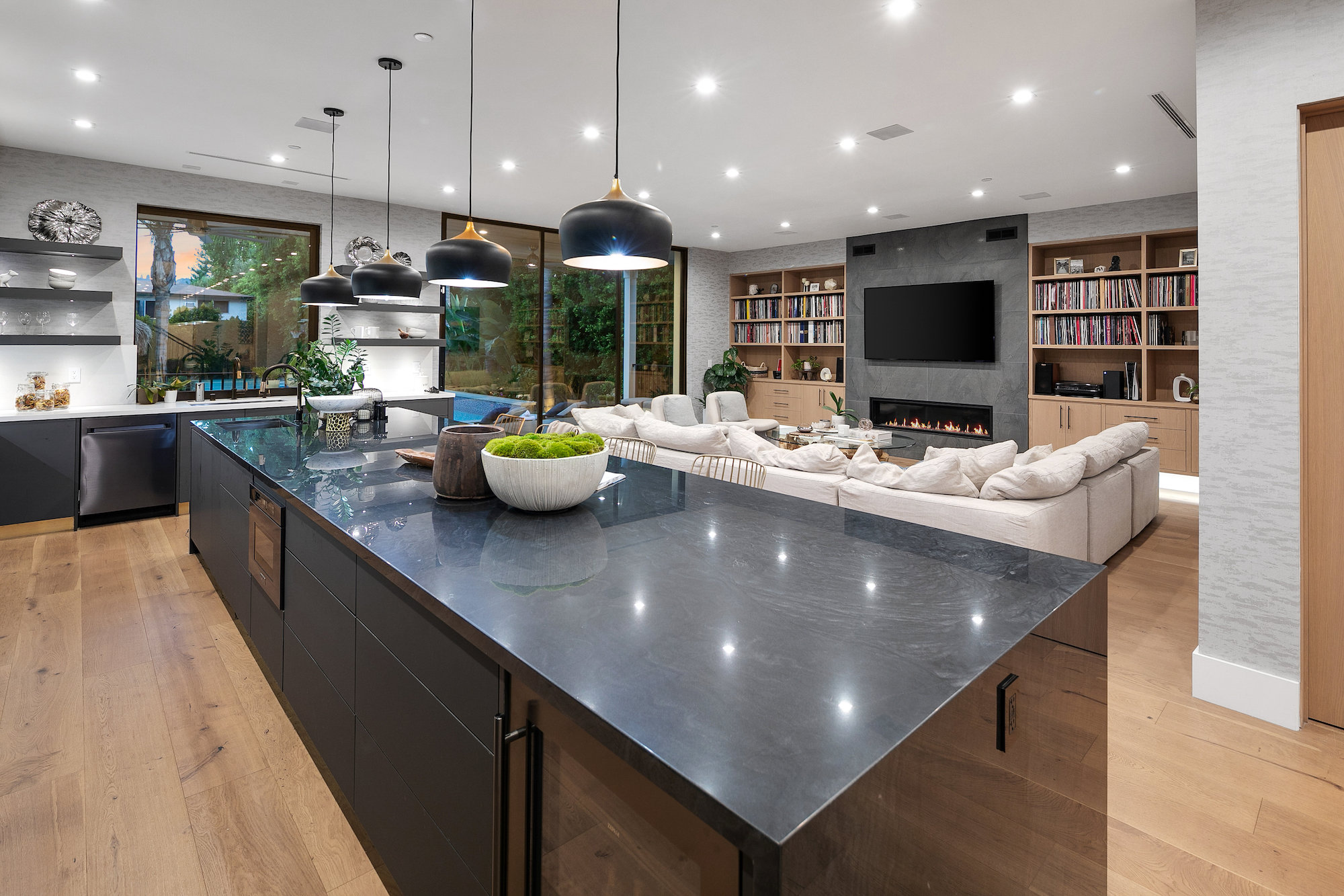 Style and sophistication are realized the moment the large pivot door opens revealing the stunning interior that spans over 4,740 square feet. Embraced with beautiful natural light & openness, your eyes are drawn directly down the elongated hallway and out to the backyard. You're welcomed into the grand formal living area with beautiful custom built-ins & a dining space with a wine display. The decadent chef's kitchen features an expansive island with Caesar stone waterfall countertops, modern cabinetry, brushed black appliances & a walk-in pantry. The kitchen is open to the family room, highlighting a modern fireplace & a porcelain accent wall. Through the floor-to-ceiling sliding pocket glass doors you make your way to a covered patio with heaters & a spacious backyard filled with tall hedging and mature landscape, a full covered bar with a BBQ, fire-pit, pool/spa & a sport court. The master suite features an accent wall with a floor-to-ceiling marble fireplace, custom built-ins, an attached deck with views of the backyard & a large walk-in closet. The luxurious master bathroom with custom tile-work, a soaking tub, double vanities, & an impressive walk-in shower resembles a spa. This home features surround sound, Lutron system, security system with cameras, is full solar panel & equipped with energy savings. Located in the heart of an upscale Studio City neighborhood, 12818 Landale St is close to the famous Beeman Park & Ventura Blvd, some of the best restaurants & prime entertainment in LA.
