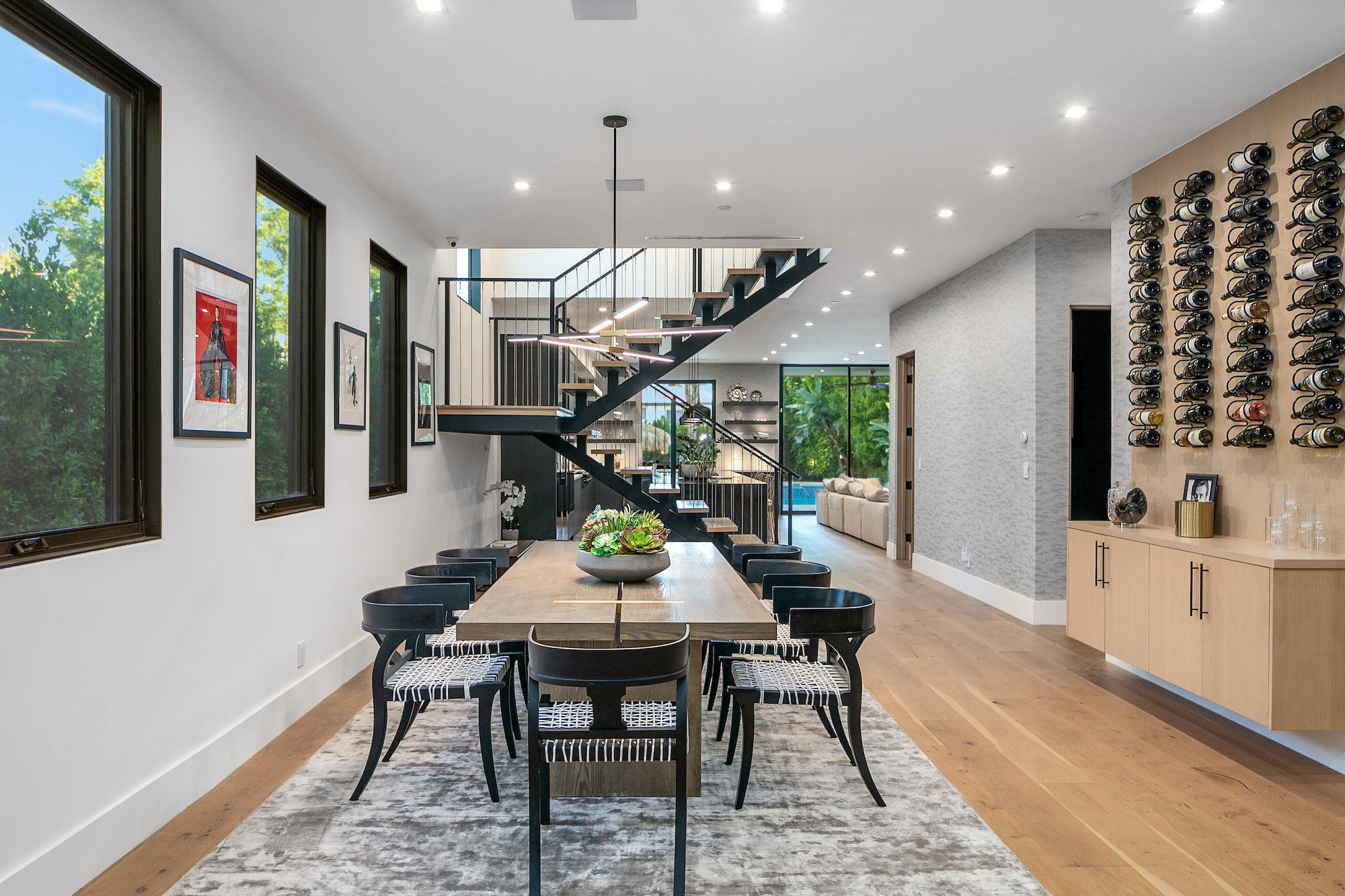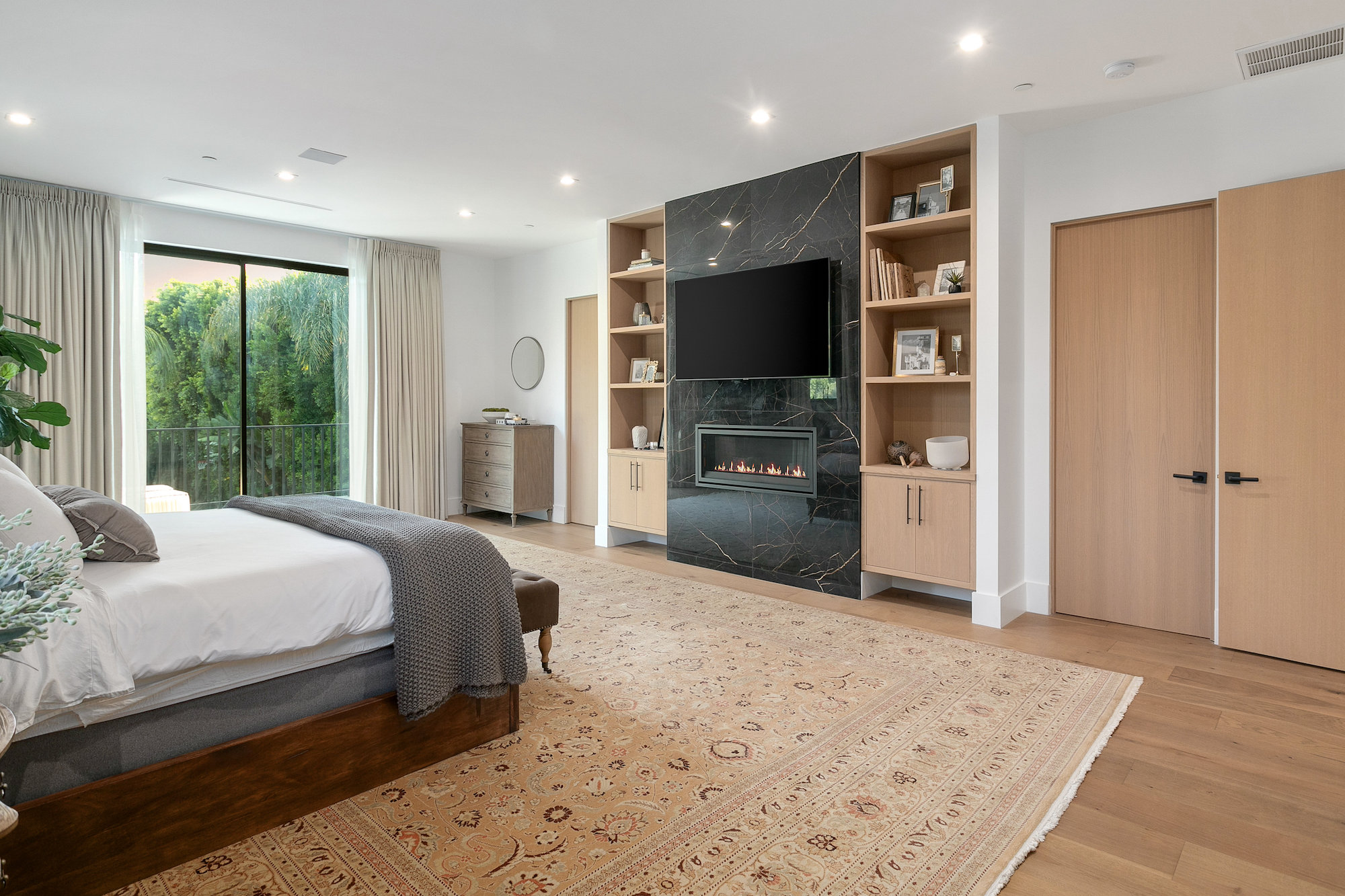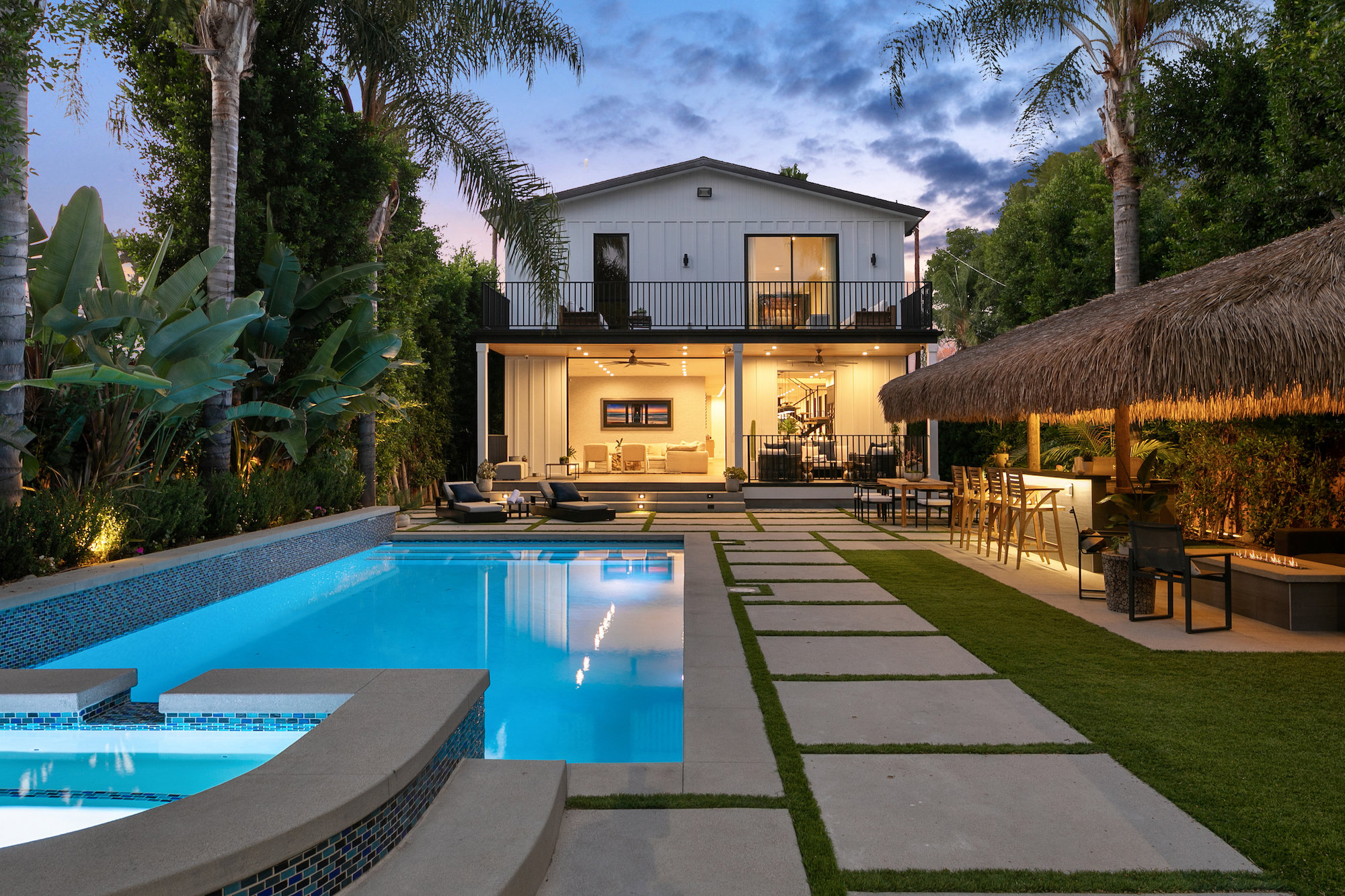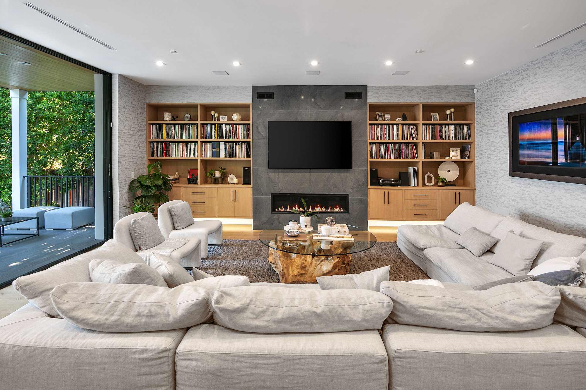 Style and sophistication are realized the moment the large pivot door opens revealing the stunning interior that spans over 4,740 square feet. Embraced with beautiful natural light & openness, your eyes are drawn directly down the elongated hallway and out to the backyard. You're welcomed into the grand formal living area with beautiful custom built-ins & a dining space with a wine display. The decadent chef's kitchen features an expansive island with Caesar stone waterfall countertops, modern cabinetry, brushed black appliances & a walk-in pantry. The kitchen is open to the family room, highlighting a modern fireplace & a porcelain accent wall. Through the floor-to-ceiling sliding pocket glass doors you make your way to a covered patio with heaters & a spacious backyard filled with tall hedging and mature landscape, a full covered bar with a BBQ, fire-pit, pool/spa & a sport court. The master suite features an accent wall with a floor-to-ceiling marble fireplace, custom built-ins, an attached deck with views of the backyard & a large walk-in closet. The luxurious master bathroom with custom tile-work, a soaking tub, double vanities, & an impressive walk-in shower resembles a spa. This home features surround sound, Lutron system, security system with cameras, is full solar panel & equipped with energy savings. Located in the heart of an upscale Studio City neighborhood, 12818 Landale St is close to the famous Beeman Park & Ventura Blvd, some of the best restaurants & prime entertainment in LA.