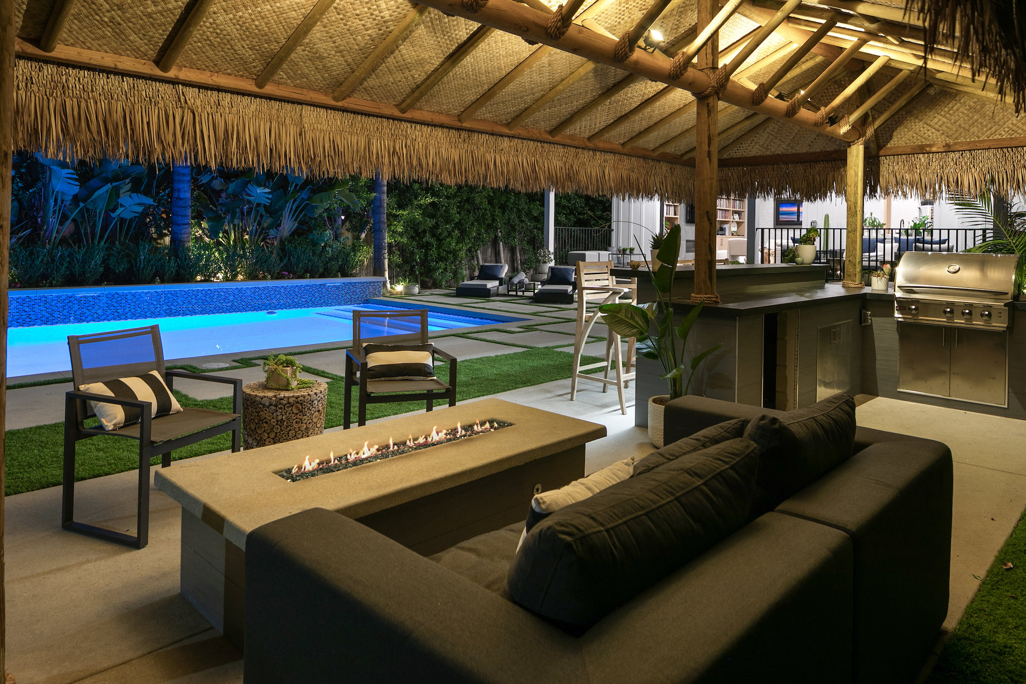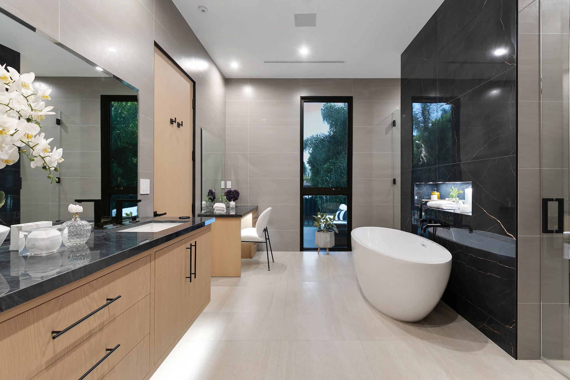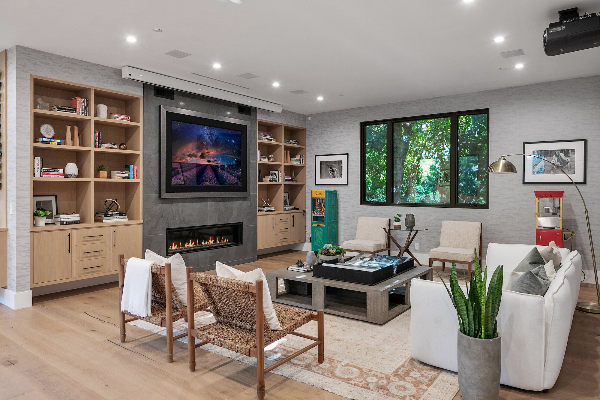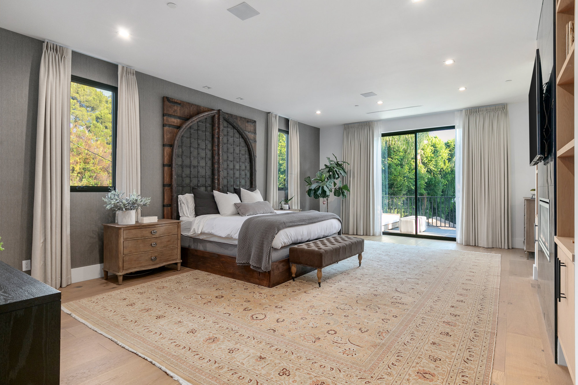 Style and sophistication are realized the moment the large pivot door opens revealing the stunning interior that spans over 4,740 square feet. Embraced with beautiful natural light & openness, your eyes are drawn directly down the elongated hallway and out to the backyard. You're welcomed into the grand formal living area with beautiful custom built-ins & a dining space with a wine display. The decadent chef's kitchen features an expansive island with Caesar stone waterfall countertops, modern cabinetry, brushed black appliances & a walk-in pantry. The kitchen is open to the family room, highlighting a modern fireplace & a porcelain accent wall. Through the floor-to-ceiling sliding pocket glass doors you make your way to a covered patio with heaters & a spacious backyard filled with tall hedging and mature landscape, a full covered bar with a BBQ, fire-pit, pool/spa & a sport court. The master suite features an accent wall with a floor-to-ceiling marble fireplace, custom built-ins, an attached deck with views of the backyard & a large walk-in closet. The luxurious master bathroom with custom tile-work, a soaking tub, double vanities, & an impressive walk-in shower resembles a spa. This home features surround sound, Lutron system, security system with cameras, is full solar panel & equipped with energy savings. Located in the heart of an upscale Studio City neighborhood, 12818 Landale St is close to the famous Beeman Park & Ventura Blvd, some of the best restaurants & prime entertainment in LA.