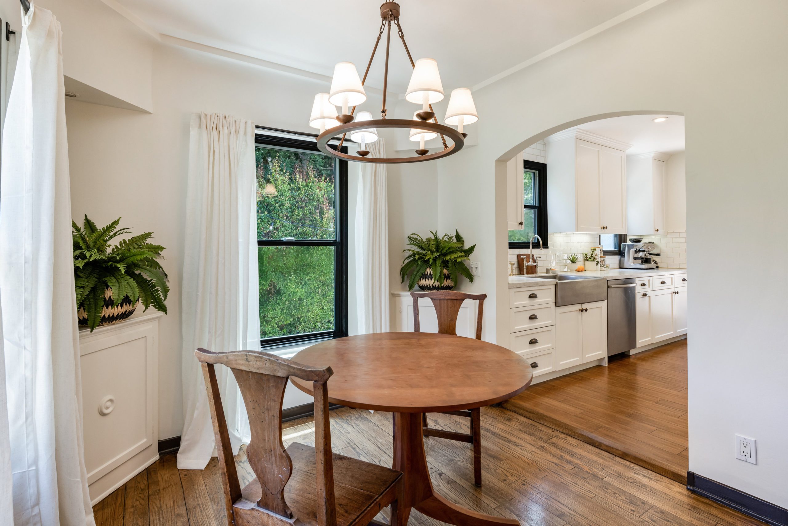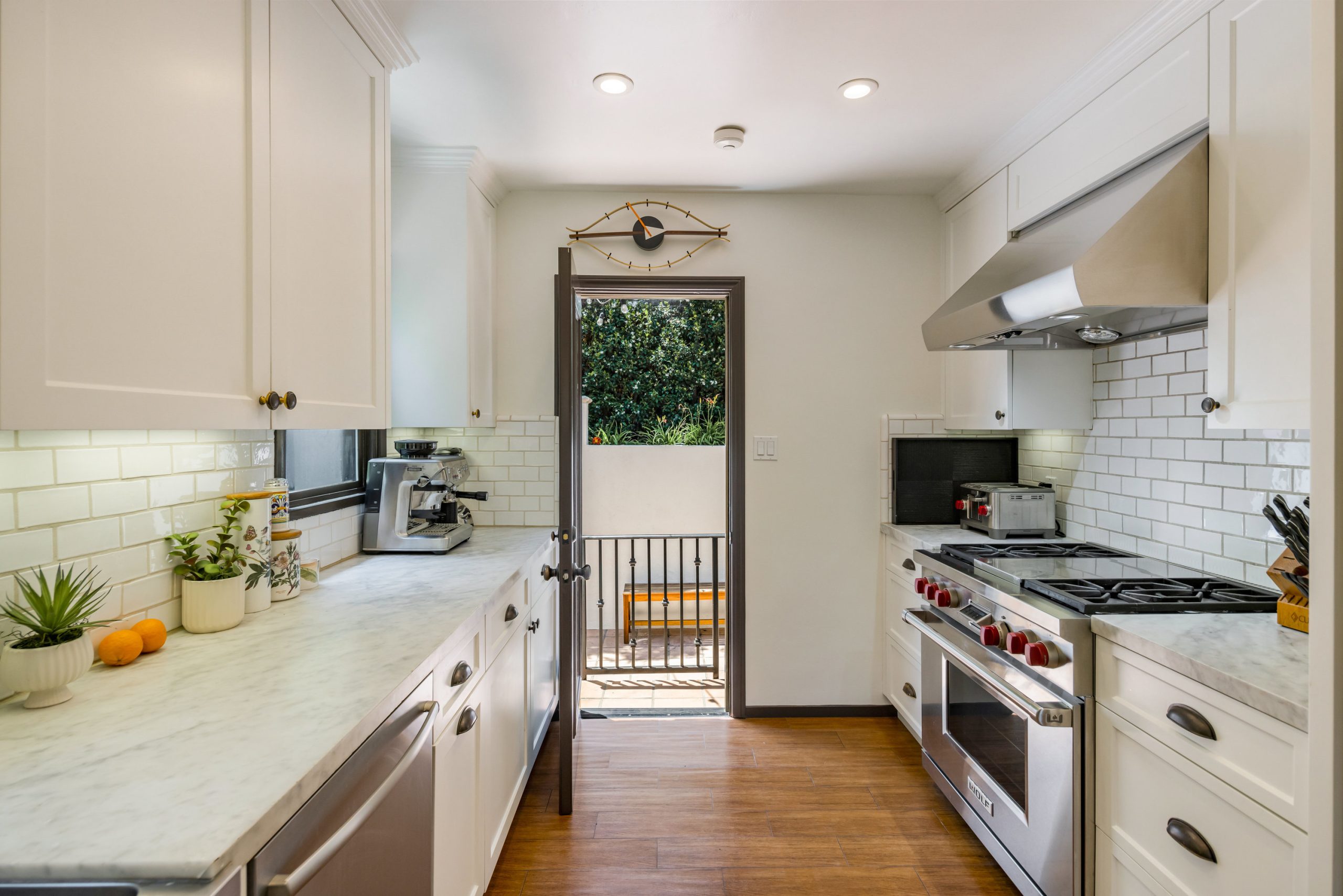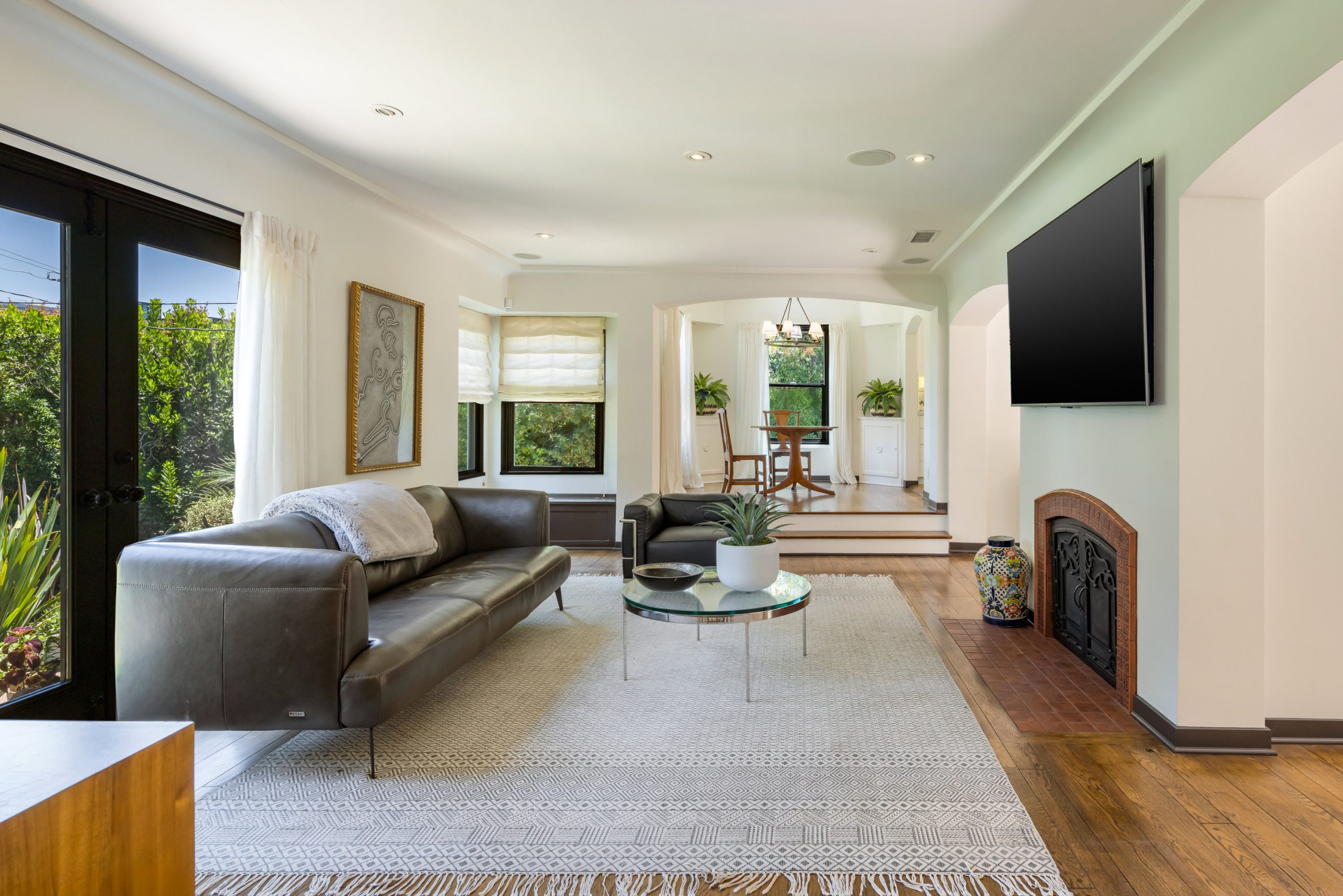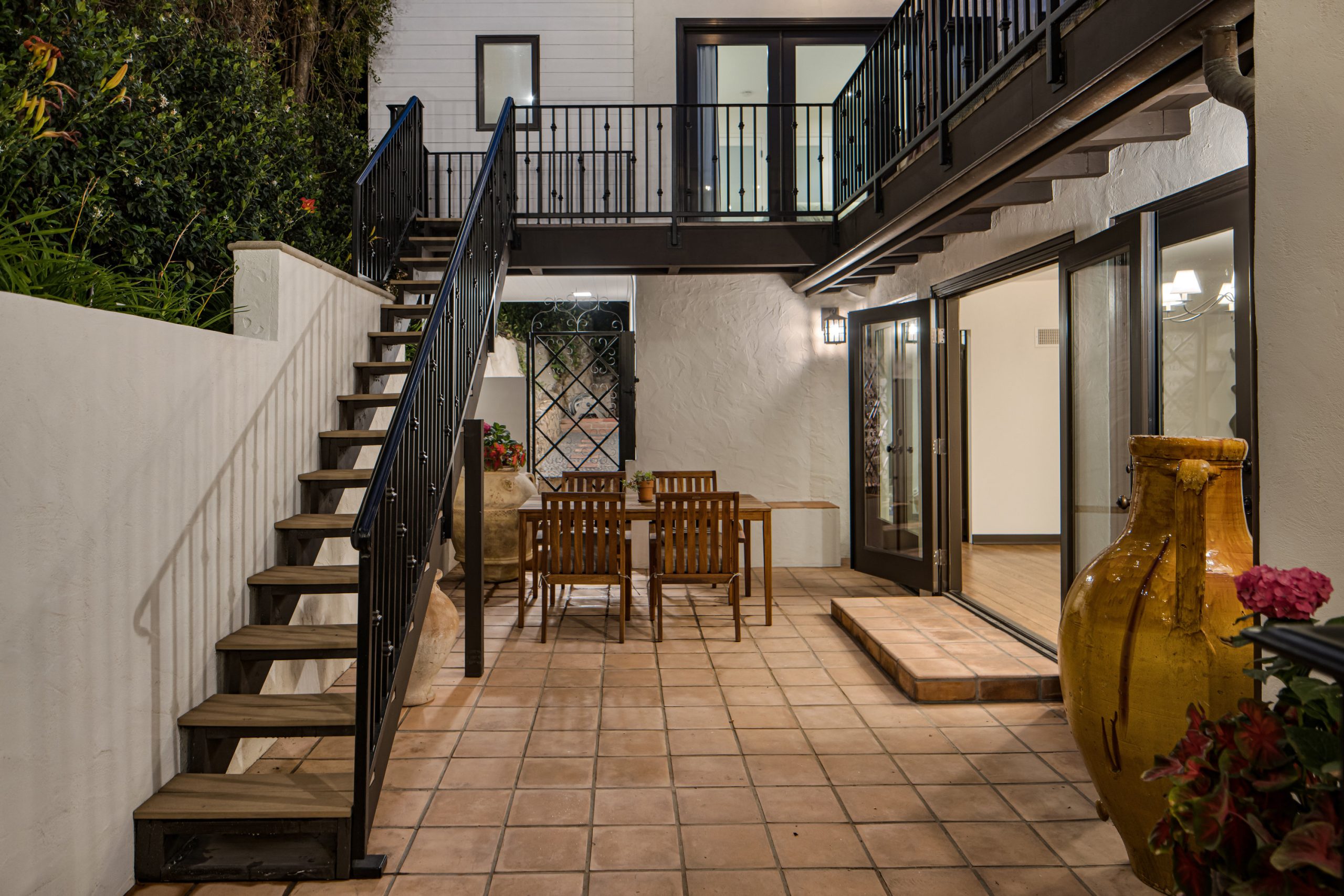 In a colorful garden setting just a few doors above Sunset, this vintage 2-story Spanish Revival home is ideally located in the heart of the Strip, close to many great dining establishments, upscale hotels, the Sunset Plaza shopping district, and West Hollywood's most happening nightlife. As you approach the gated home, you'll be charmed by the lush, vibrant landscaping. Enter through the original paneled front door and be welcomed by the arched walls, warm oak floors, and coved plaster ceilings laid out in a classic floor plan that incorporates large private patios on both the first and second levels; it's a California lifestyle classic. Many French doors bring great light into the interiors, and the original fireplace imbues the home with a warm, classic ambiance. The dining room, perfect for dinner parties, opens to a very private courtyard through a wall of glass doors. A previous renovation transformed the garage into a spacious primary suite, complete with a built-in wall of wardrobe cabinets and a beautiful white marble bathroom. Upstairs is a second white mosaic marble bathroom with tub and shower, and two more bedrooms; both are light-filled, one with two large closets and French doors that open to a patio that features a covered gazebo with TV entertainment system. Enjoy the glamor and excitement of the iconic Sunset Strip while living in a light-filled classic home in a private green garden; complete privacy just moments away from great experiences.