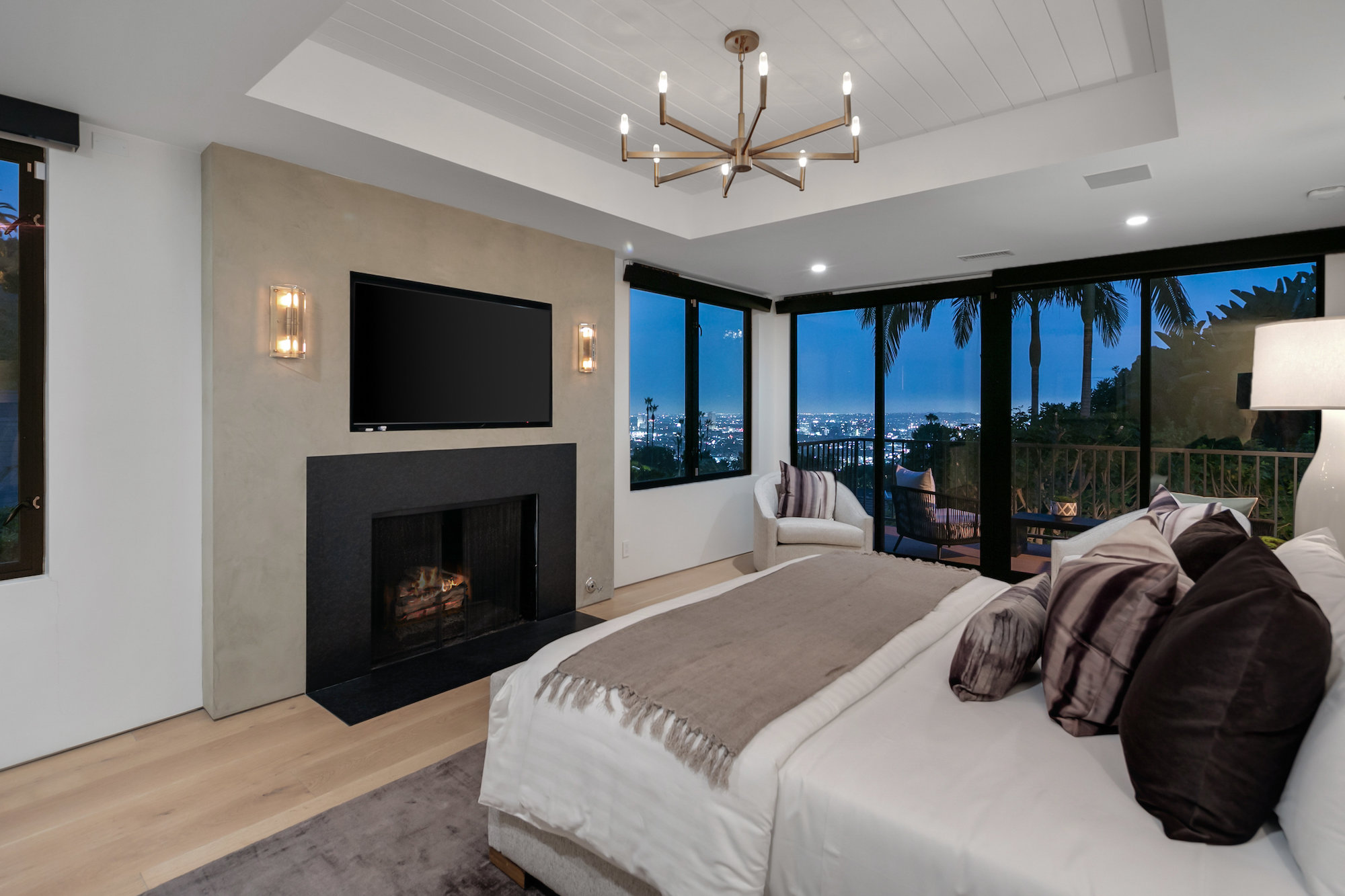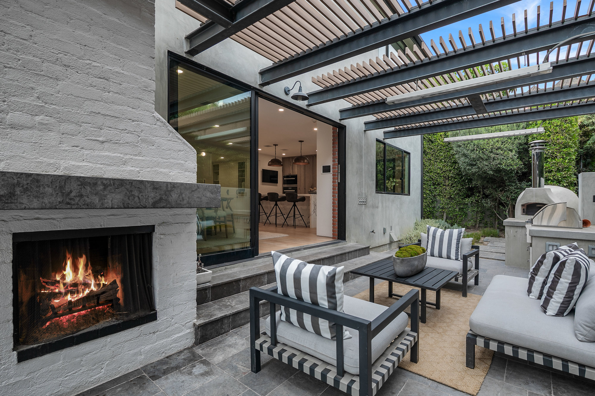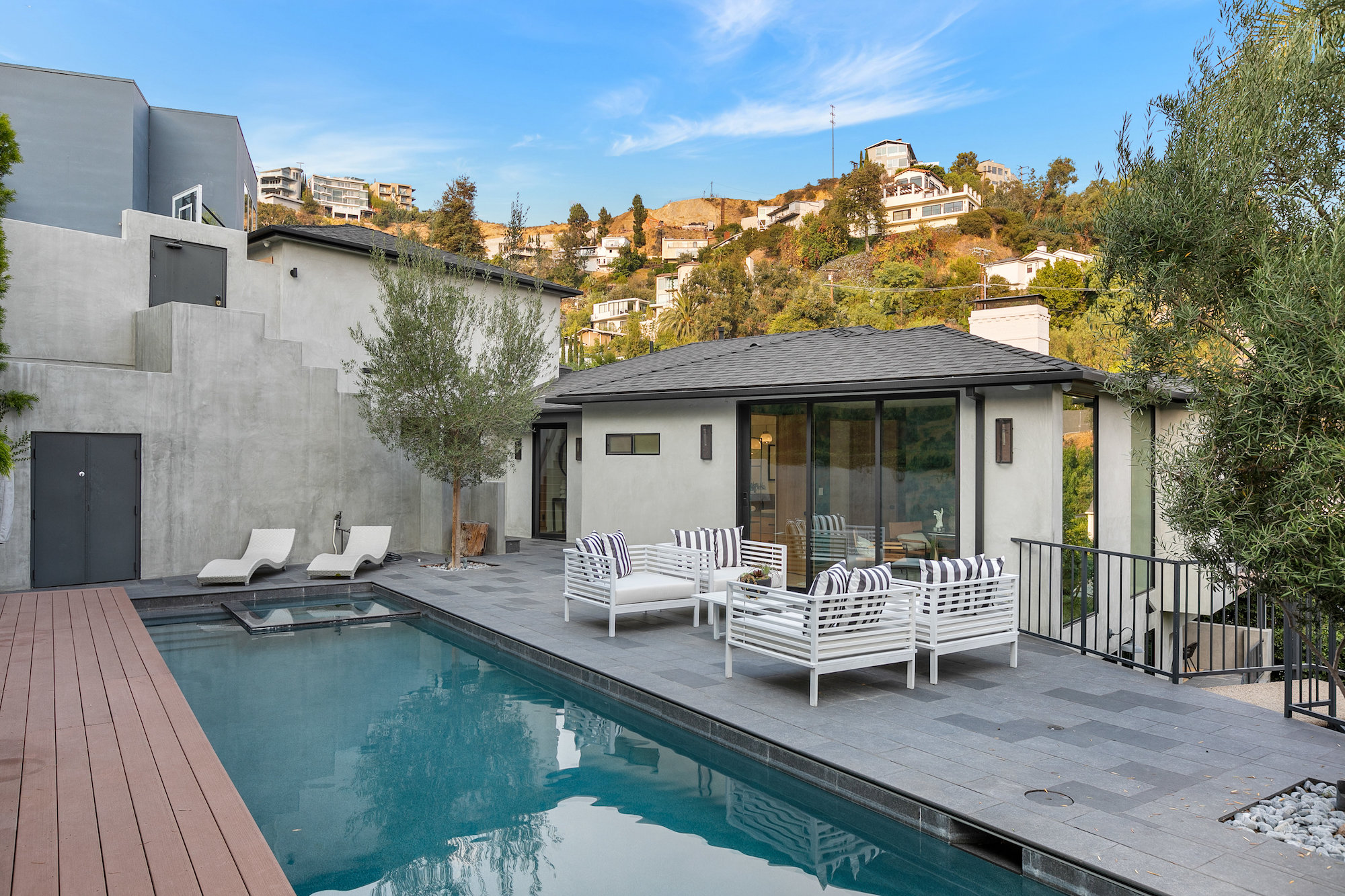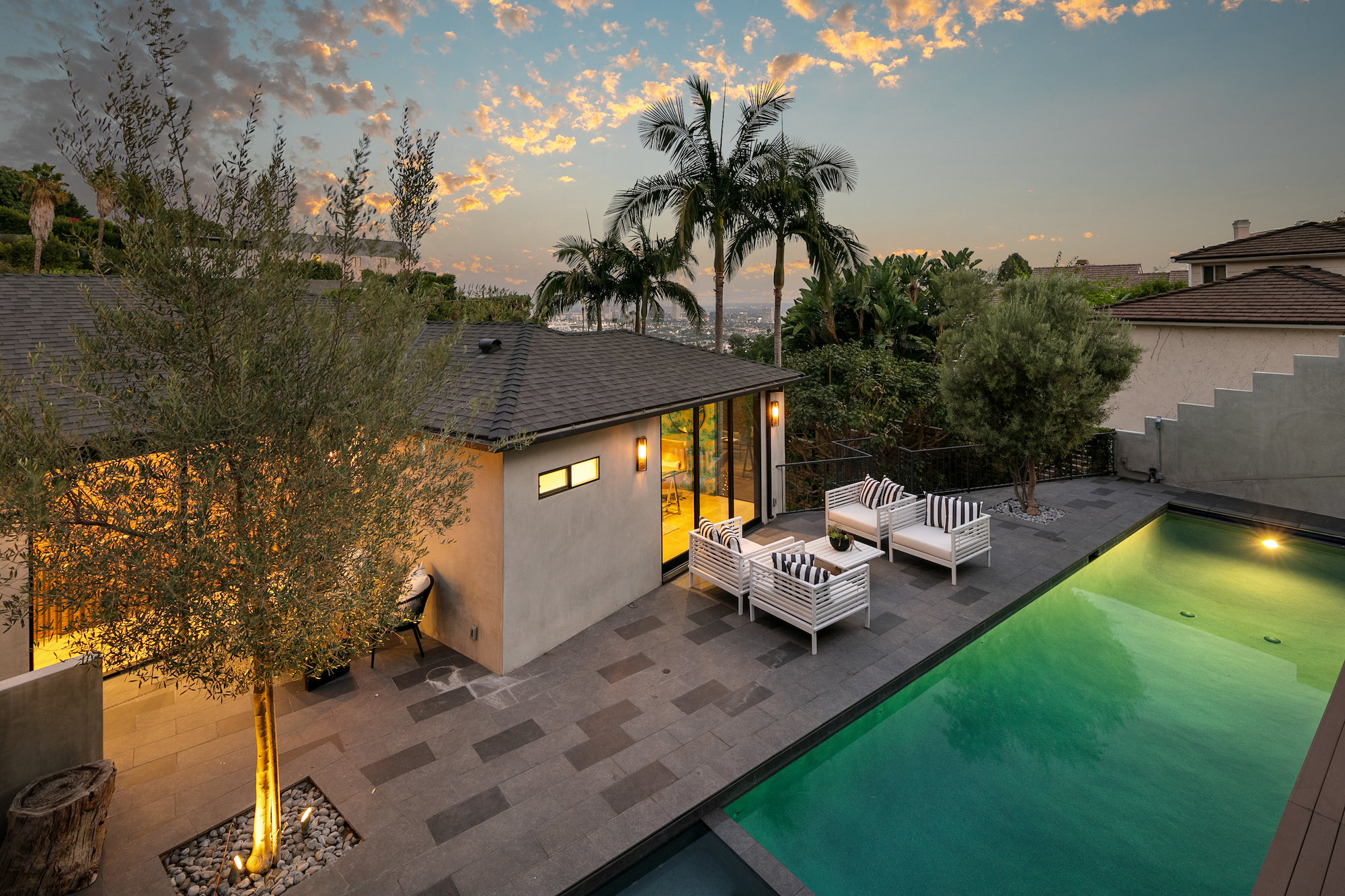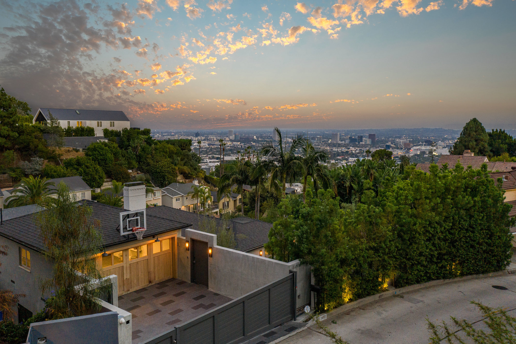 Set behind gates in the coveted location of lower Sunset Plaza, this contemporary home provides the utmost privacy. With 3,751 square feet of immaculate design and jet-liner city views, the home boasts a beautifully designed open floor plan with 4 bedrooms and 5 bathrooms, a guest house with an additional 1 bedroom and 1 bathroom and a flex theatre/office. Showcasing a Calacatta marble waterfall island, reclaimed wood cabinetry and top of the line gourmet appliances, the stunning chef's kitchen is open to the dining and living room. From the living room sliding Fleetwood doors open completely to the outdoor patio hosting a grill and an imported Italian pizza oven. The outdoor setting is an entertainers dream with a stunning pool, spa, flat grass area, and lush mature landscape. Designed to offer ultimate comfort and convenience, the home is fully equipped with a comprehensive smart system and A/V technology.