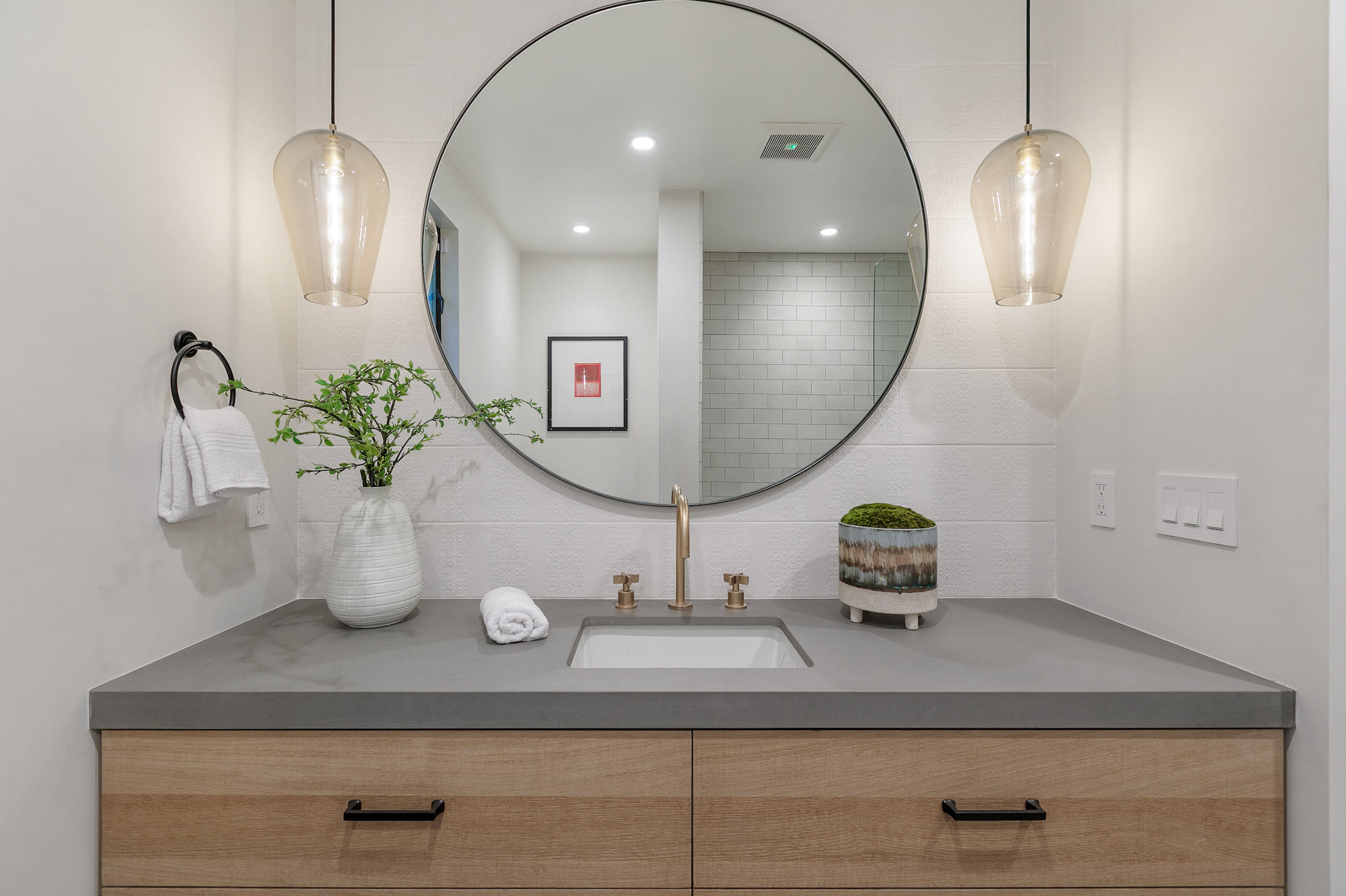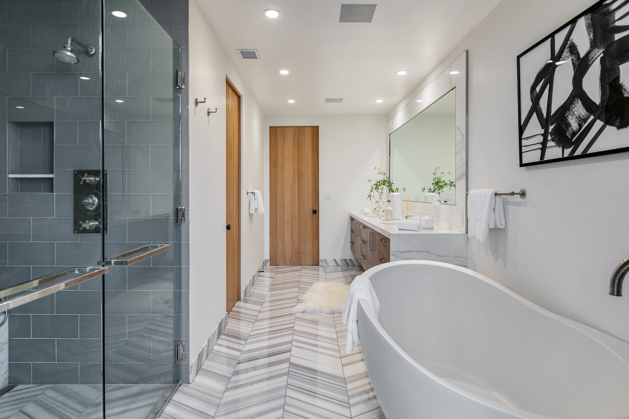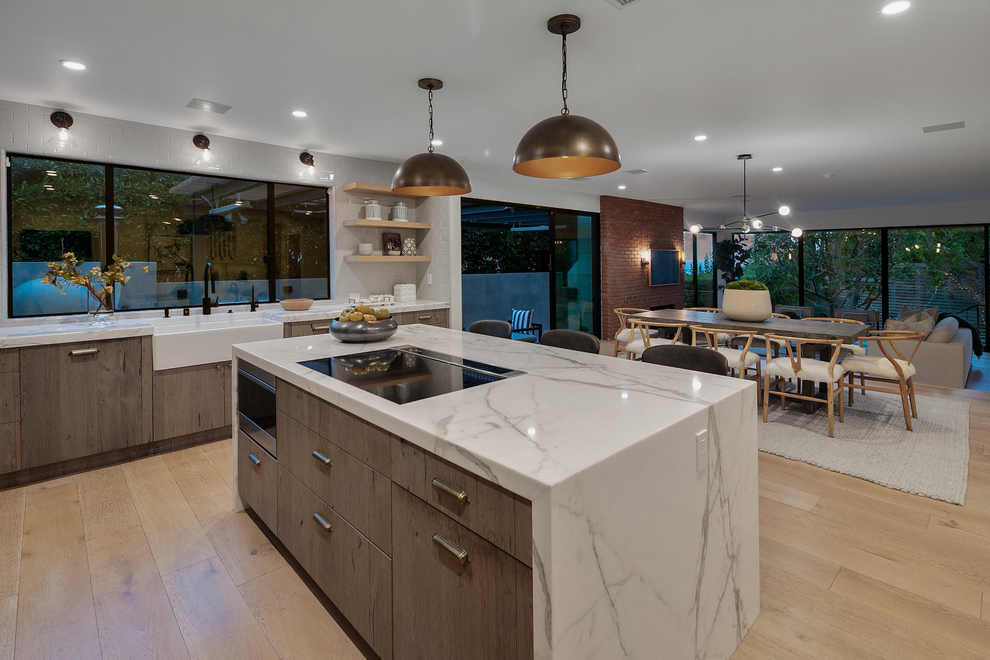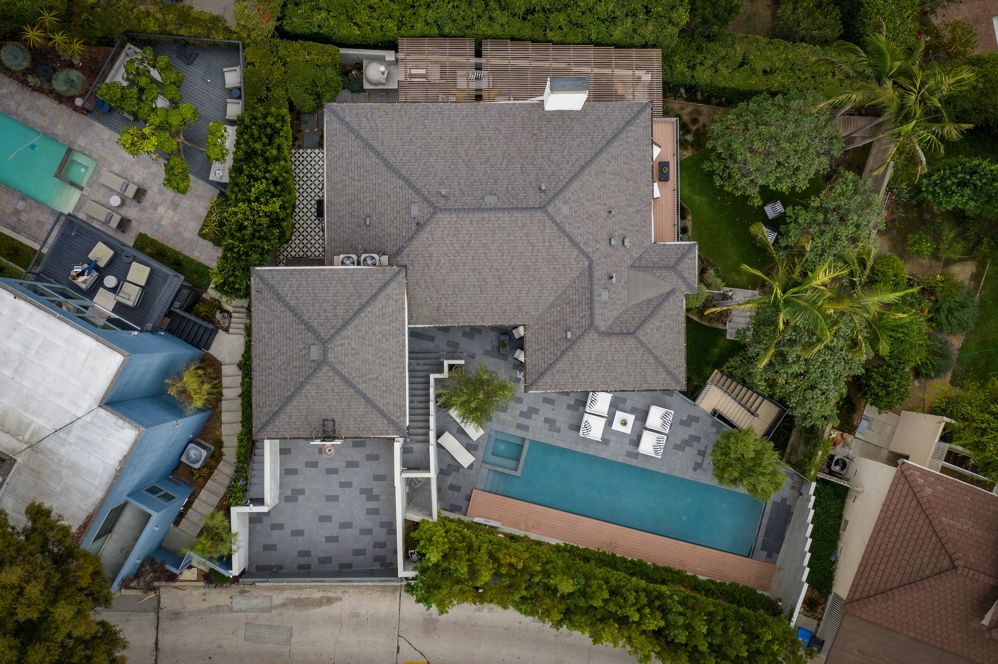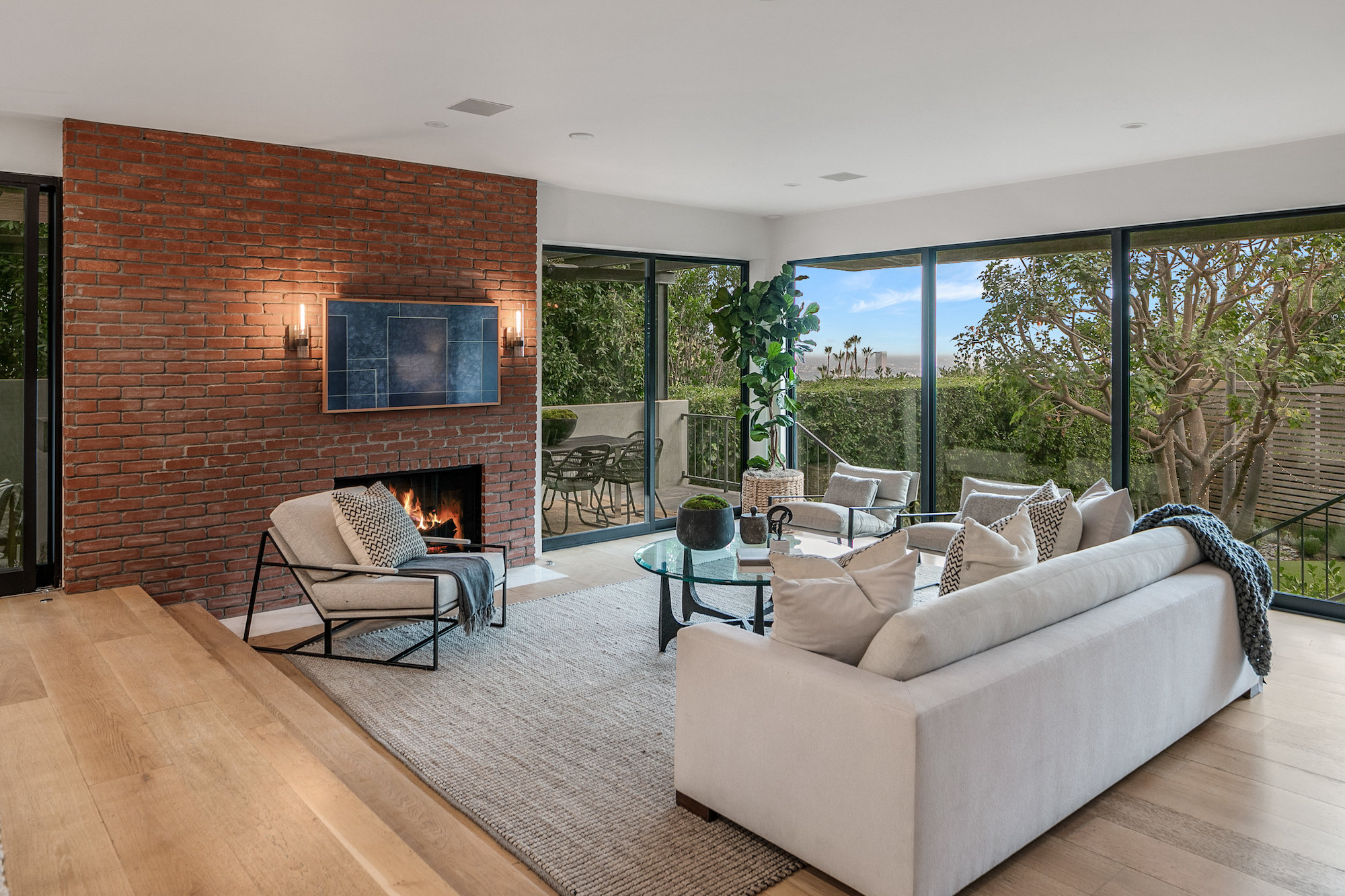 Set behind gates in the coveted location of lower Sunset Plaza, this contemporary home provides the utmost privacy. With 3,751 square feet of immaculate design and jet-liner city views, the home boasts a beautifully designed open floor plan with 4 bedrooms and 5 bathrooms, a guest house with an additional 1 bedroom and 1 bathroom and a flex theatre/office. Showcasing a Calacatta marble waterfall island, reclaimed wood cabinetry and top of the line gourmet appliances, the stunning chef's kitchen is open to the dining and living room. From the living room sliding Fleetwood doors open completely to the outdoor patio hosting a grill and an imported Italian pizza oven. The outdoor setting is an entertainers dream with a stunning pool, spa, flat grass area, and lush mature landscape. Designed to offer ultimate comfort and convenience, the home is fully equipped with a comprehensive smart system and A/V technology.