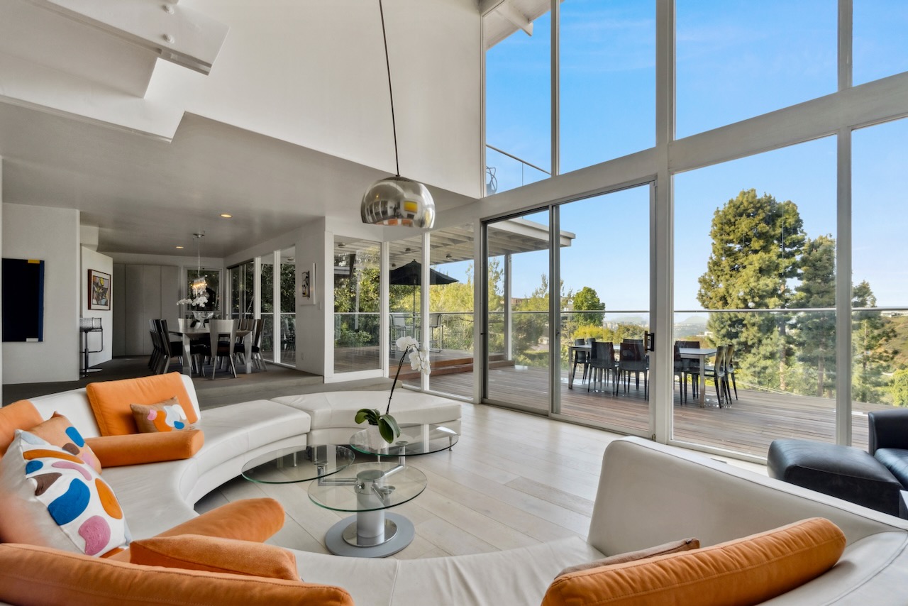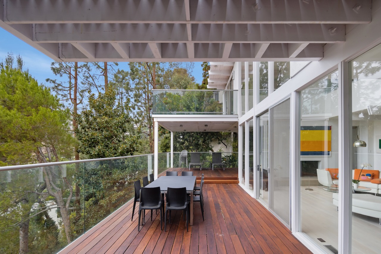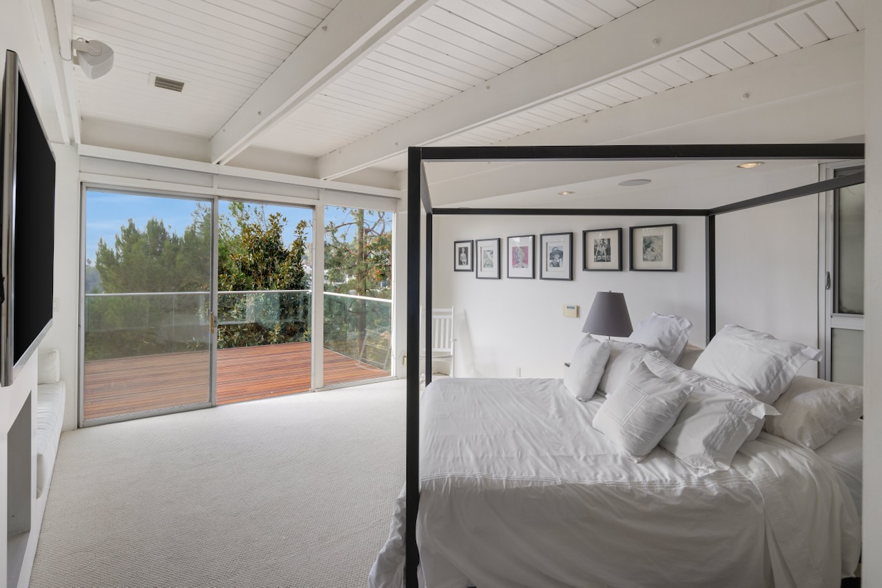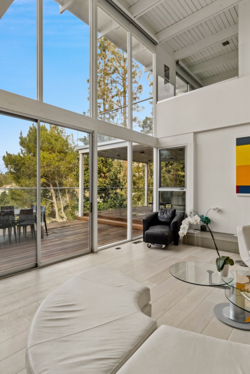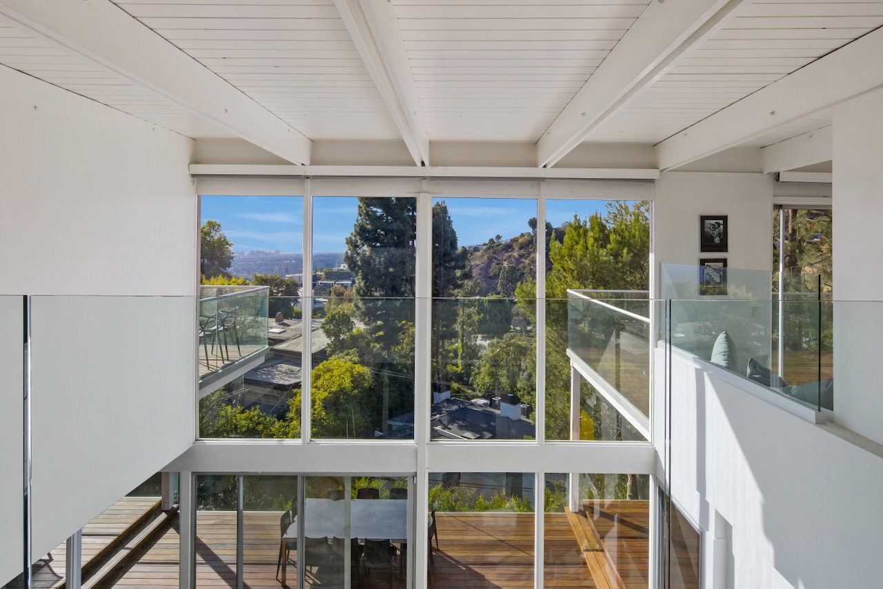 A sought-after Bird Streets location in lower Sunset Strip situated for city-to-Ocean views, easy access to all desirable things in W Hollywood & Beverly Hills and nearby numerous celebrity enclaves, including one who formerly lived here. The residence is on the only private street in the Bird Streets and ends in a cul de sac. Its Western facing views are washed with sunlight through soaring 2 story windows and at night feature city lights. The architectural statement is Post & Beam Mid Century and dramatically frames green nature up close and the dazzling views beyond. The Primary Suite is both romantic and spacious, opening to an extra-large viewing terrace and featuring very cool bathroom design amenities plus huge walk-in dressing closet. . There are two stories of Brazilian Ipe wooden decks totaling almost 1,400 square feet perfectly set up entertaining family and friends or for enjoying the view and the solitude of being elevated to tree level, up in the air. Elsewhere, there is a separate guest room en suite w/ bath and two additional bedrooms that can be flexibly used as an oce or yoga/gym. There are ample closets throughout the residence. The openly casual family room is well suited for being the home entertainment center and includes a large bar area with a separate sink. Artistic, architectural living in the heart of the Birds.