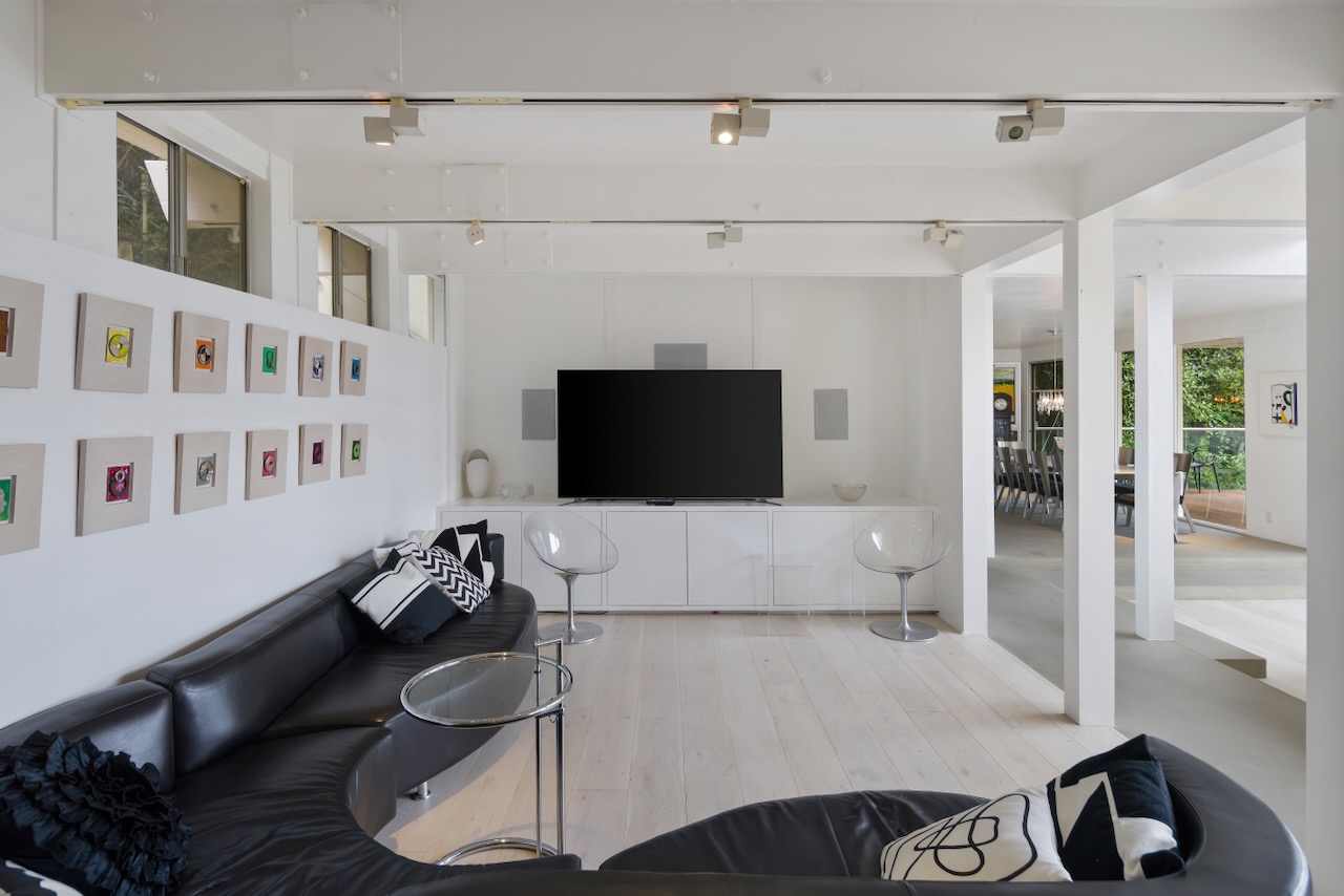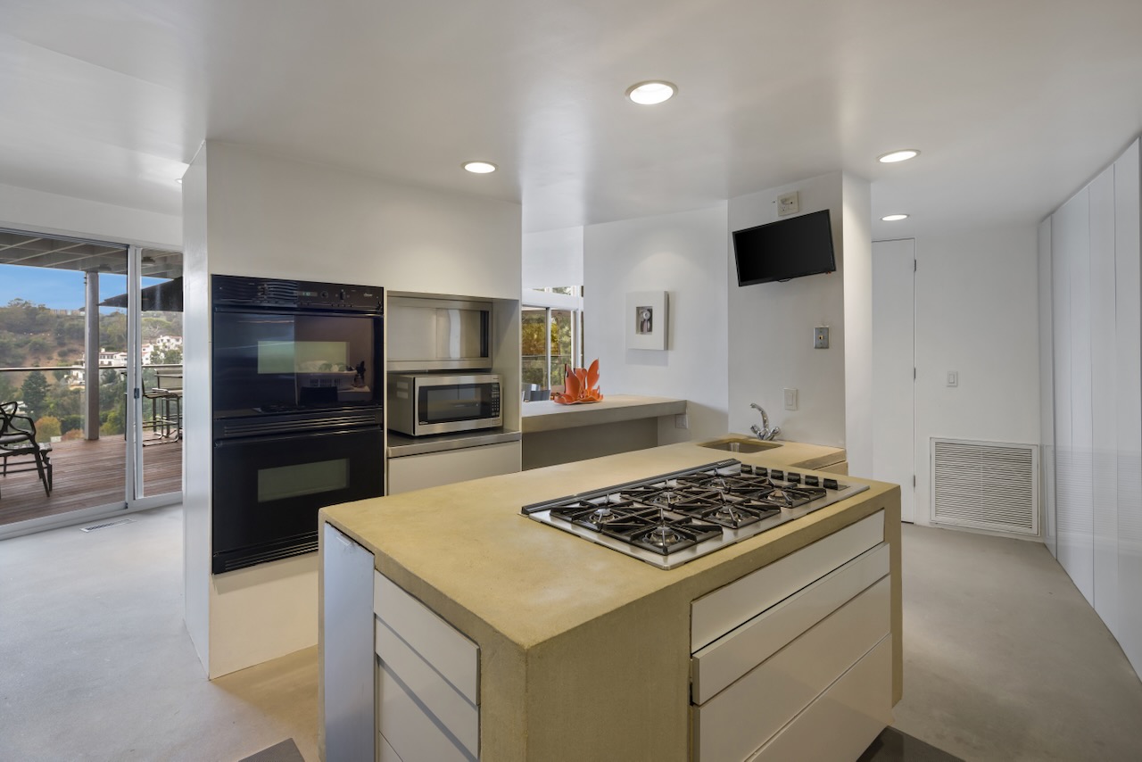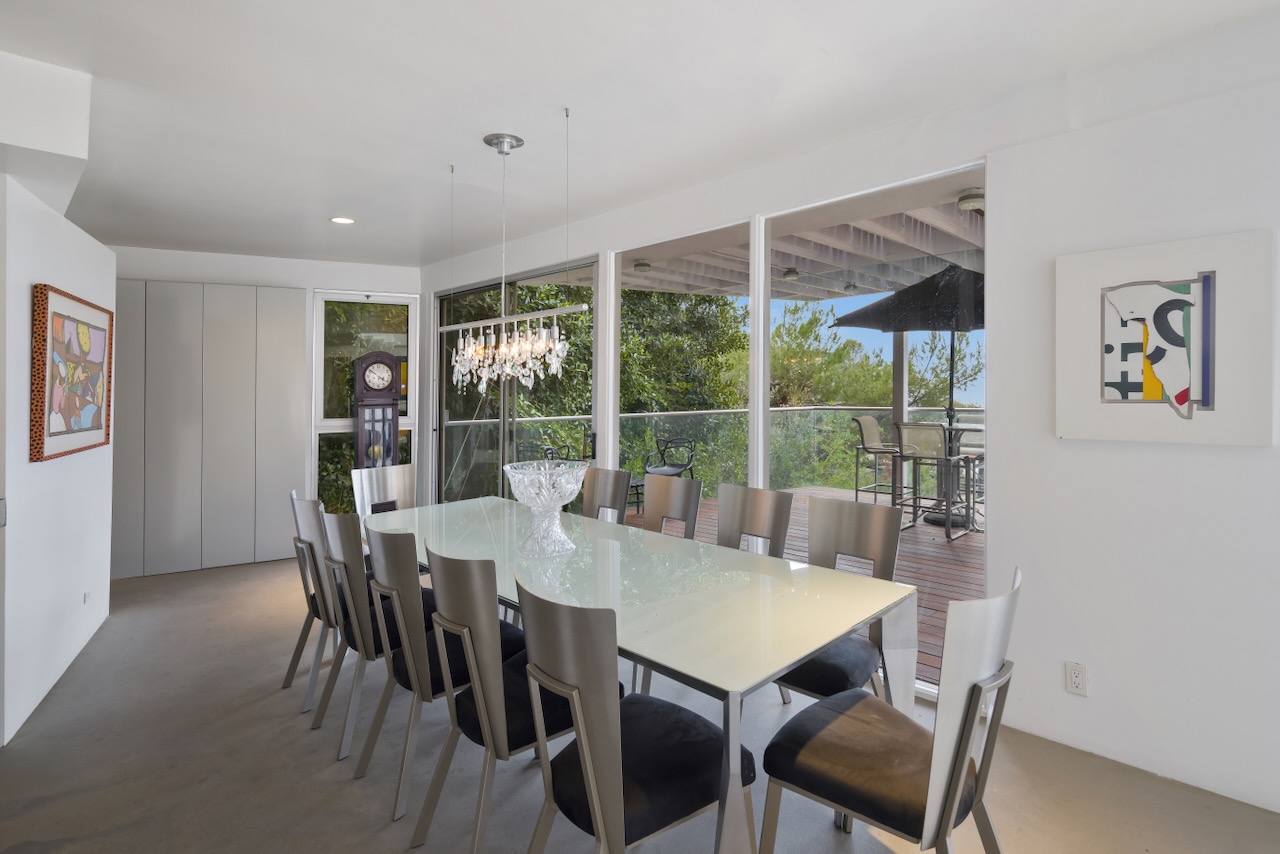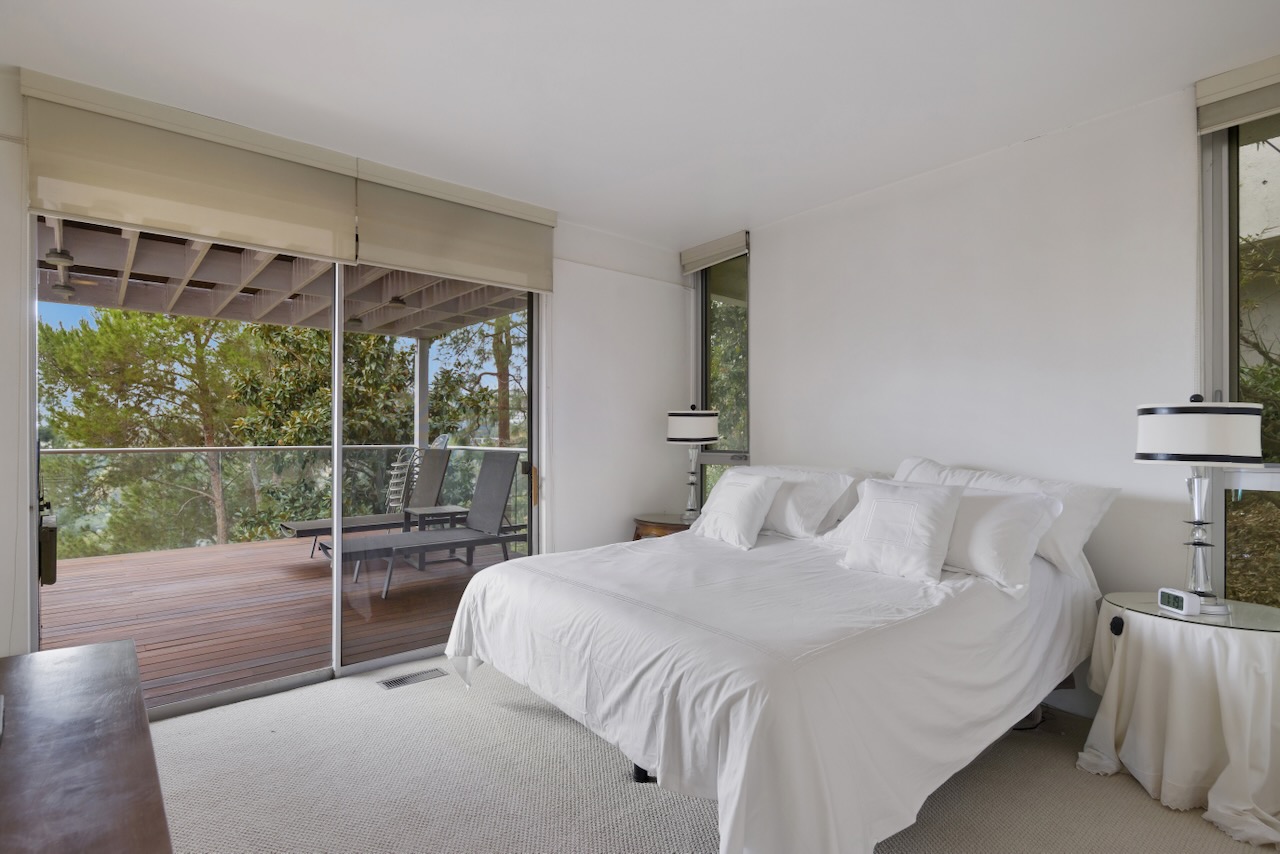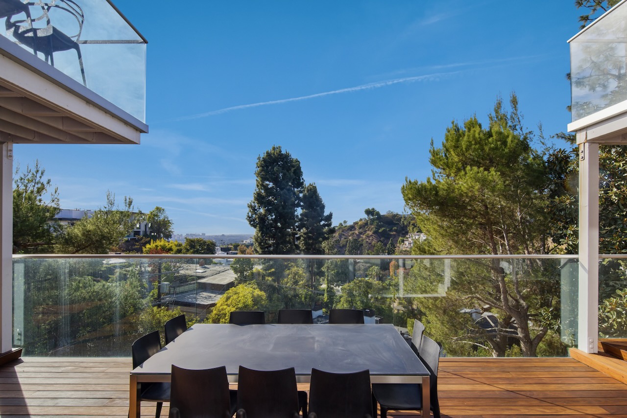 A sought-after Bird Streets location in lower Sunset Strip situated for city-to-Ocean views, easy access to all desirable things in W Hollywood & Beverly Hills and nearby numerous celebrity enclaves, including one who formerly lived here. The residence is on the only private street in the Bird Streets and ends in a cul de sac. Its Western facing views are washed with sunlight through soaring 2 story windows and at night feature city lights. The architectural statement is Post & Beam Mid Century and dramatically frames green nature up close and the dazzling views beyond. The Primary Suite is both romantic and spacious, opening to an extra-large viewing terrace and featuring very cool bathroom design amenities plus huge walk-in dressing closet. . There are two stories of Brazilian Ipe wooden decks totaling almost 1,400 square feet perfectly set up entertaining family and friends or for enjoying the view and the solitude of being elevated to tree level, up in the air. Elsewhere, there is a separate guest room en suite w/ bath and two additional bedrooms that can be flexibly used as an oce or yoga/gym. There are ample closets throughout the residence. The openly casual family room is well suited for being the home entertainment center and includes a large bar area with a separate sink. Artistic, architectural living in the heart of the Birds.