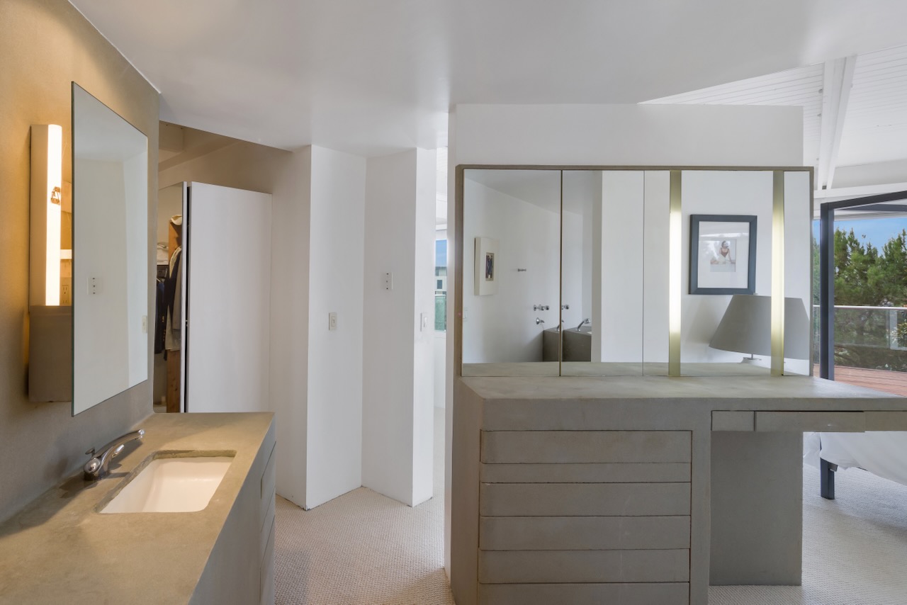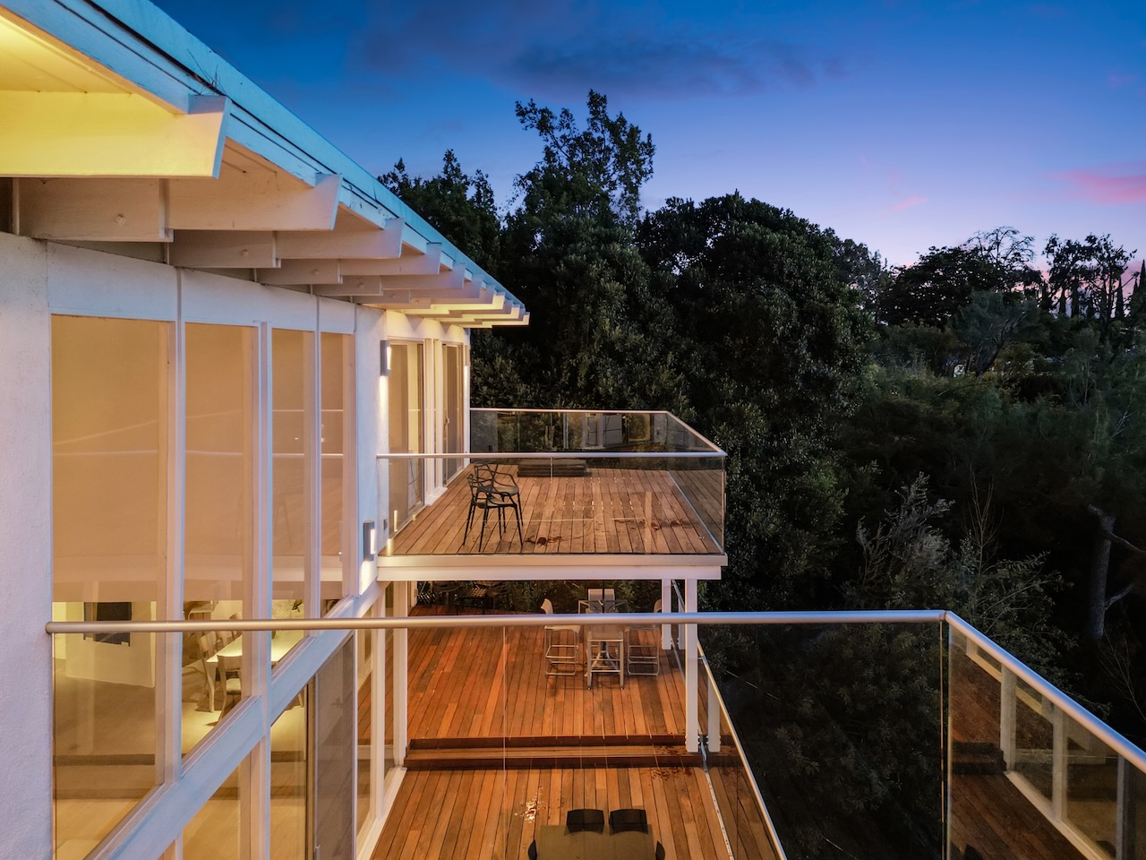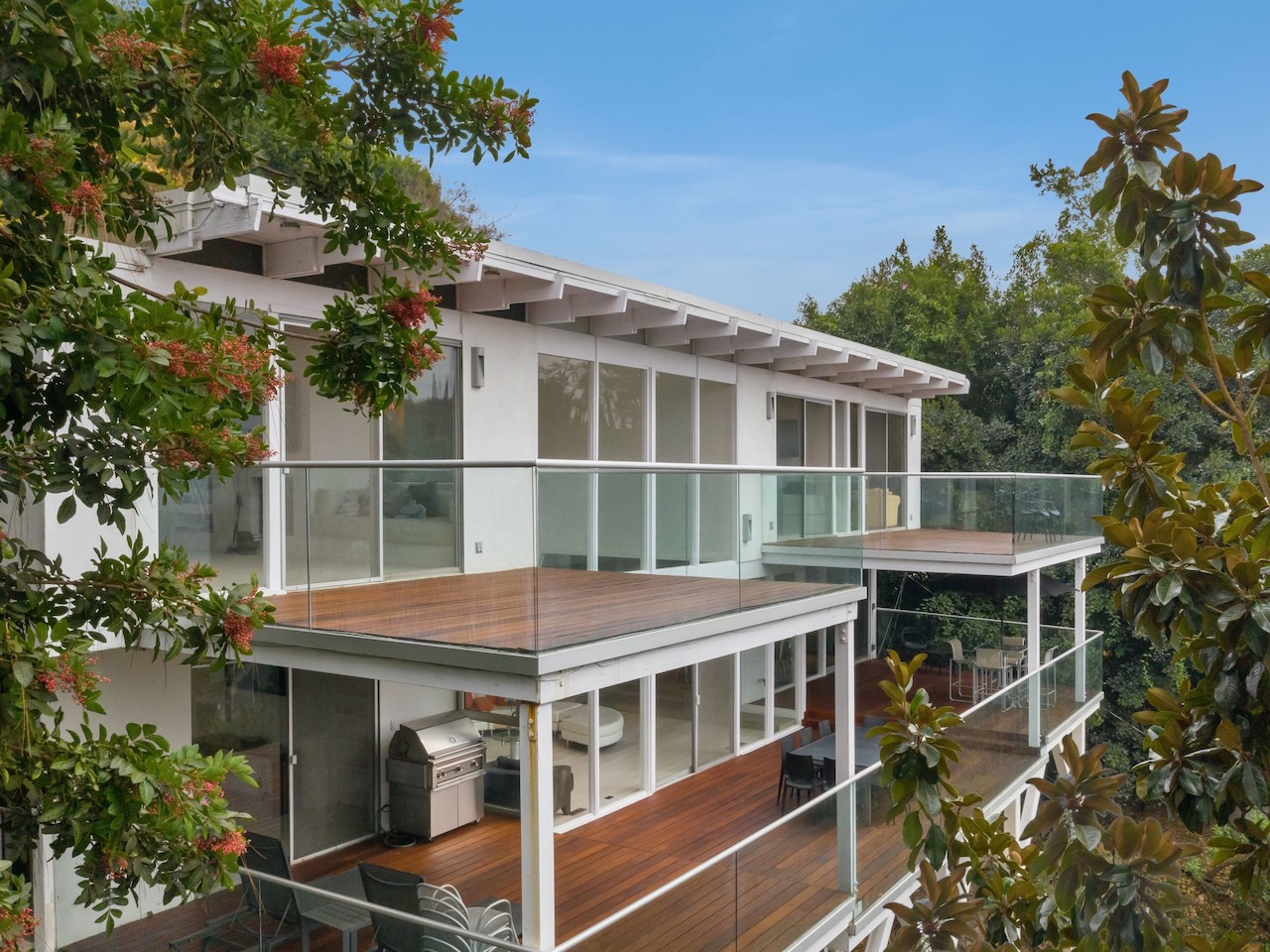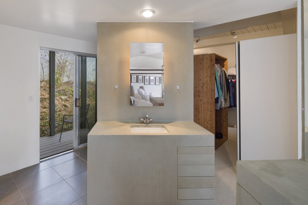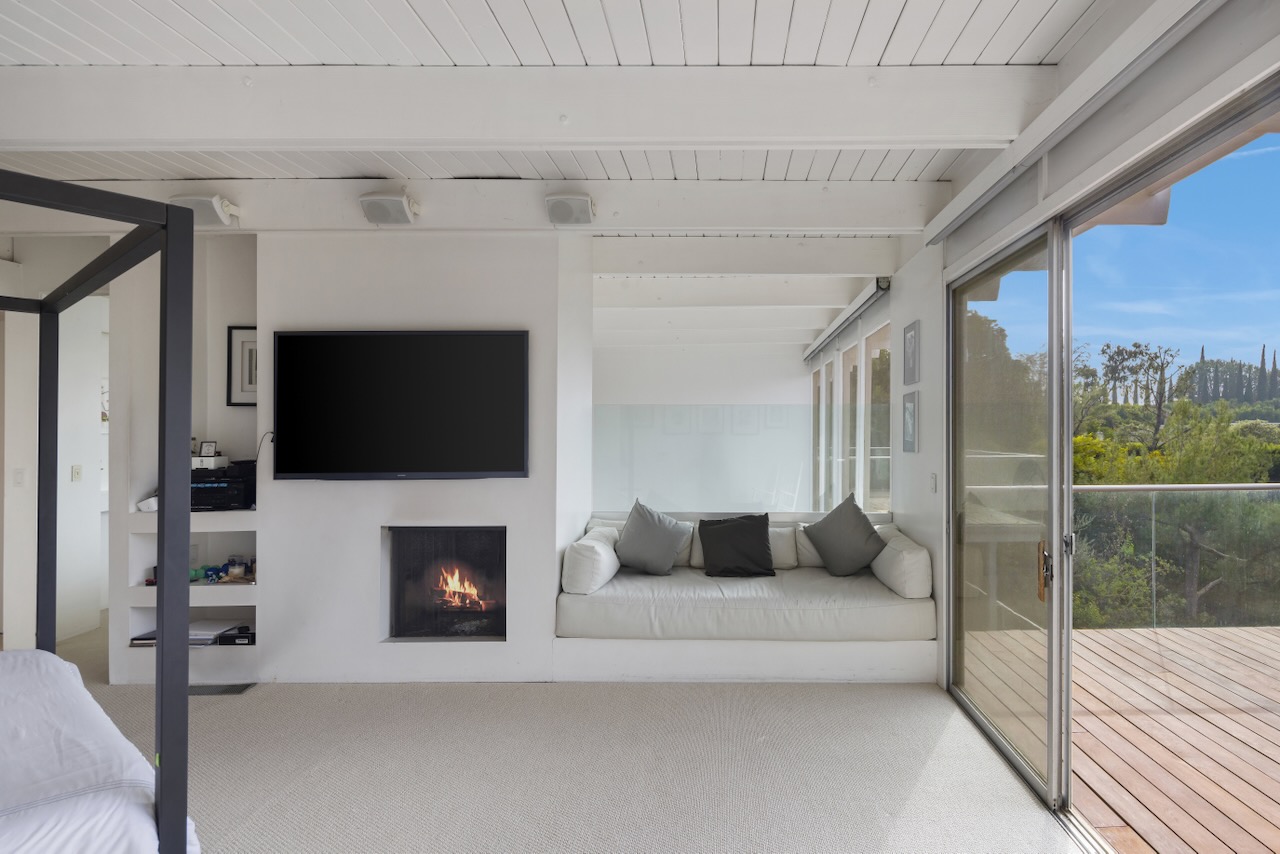 A sought-after Bird Streets location in lower Sunset Strip situated for city-to-Ocean views, easy access to all desirable things in W Hollywood & Beverly Hills and nearby numerous celebrity enclaves, including one who formerly lived here. The residence is on the only private street in the Bird Streets and ends in a cul de sac. Its Western facing views are washed with sunlight through soaring 2 story windows and at night feature city lights. The architectural statement is Post & Beam Mid Century and dramatically frames green nature up close and the dazzling views beyond. The Primary Suite is both romantic and spacious, opening to an extra-large viewing terrace and featuring very cool bathroom design amenities plus huge walk-in dressing closet. . There are two stories of Brazilian Ipe wooden decks totaling almost 1,400 square feet perfectly set up entertaining family and friends or for enjoying the view and the solitude of being elevated to tree level, up in the air. Elsewhere, there is a separate guest room en suite w/ bath and two additional bedrooms that can be flexibly used as an oce or yoga/gym. There are ample closets throughout the residence. The openly casual family room is well suited for being the home entertainment center and includes a large bar area with a separate sink. Artistic, architectural living in the heart of the Birds.
