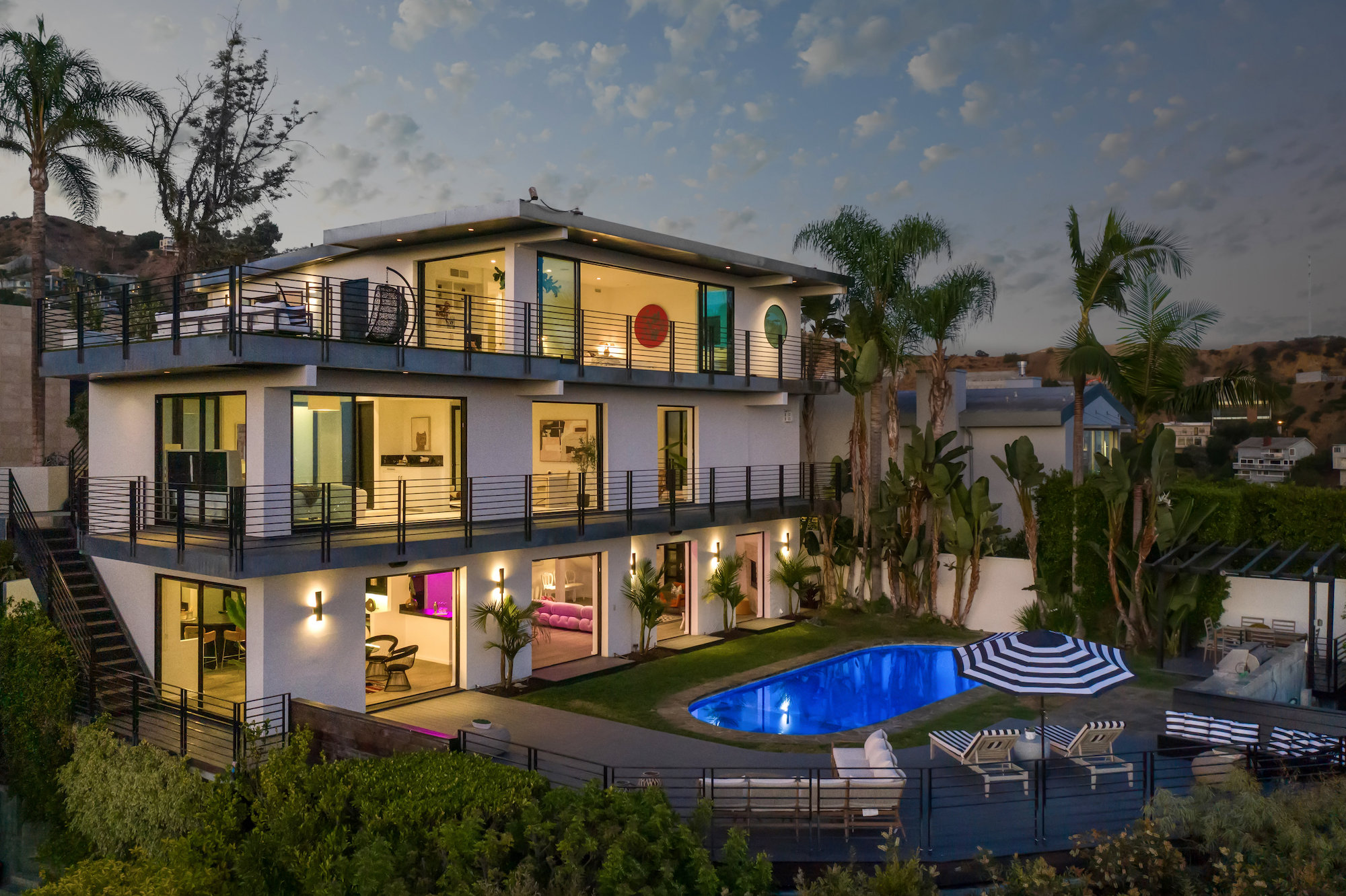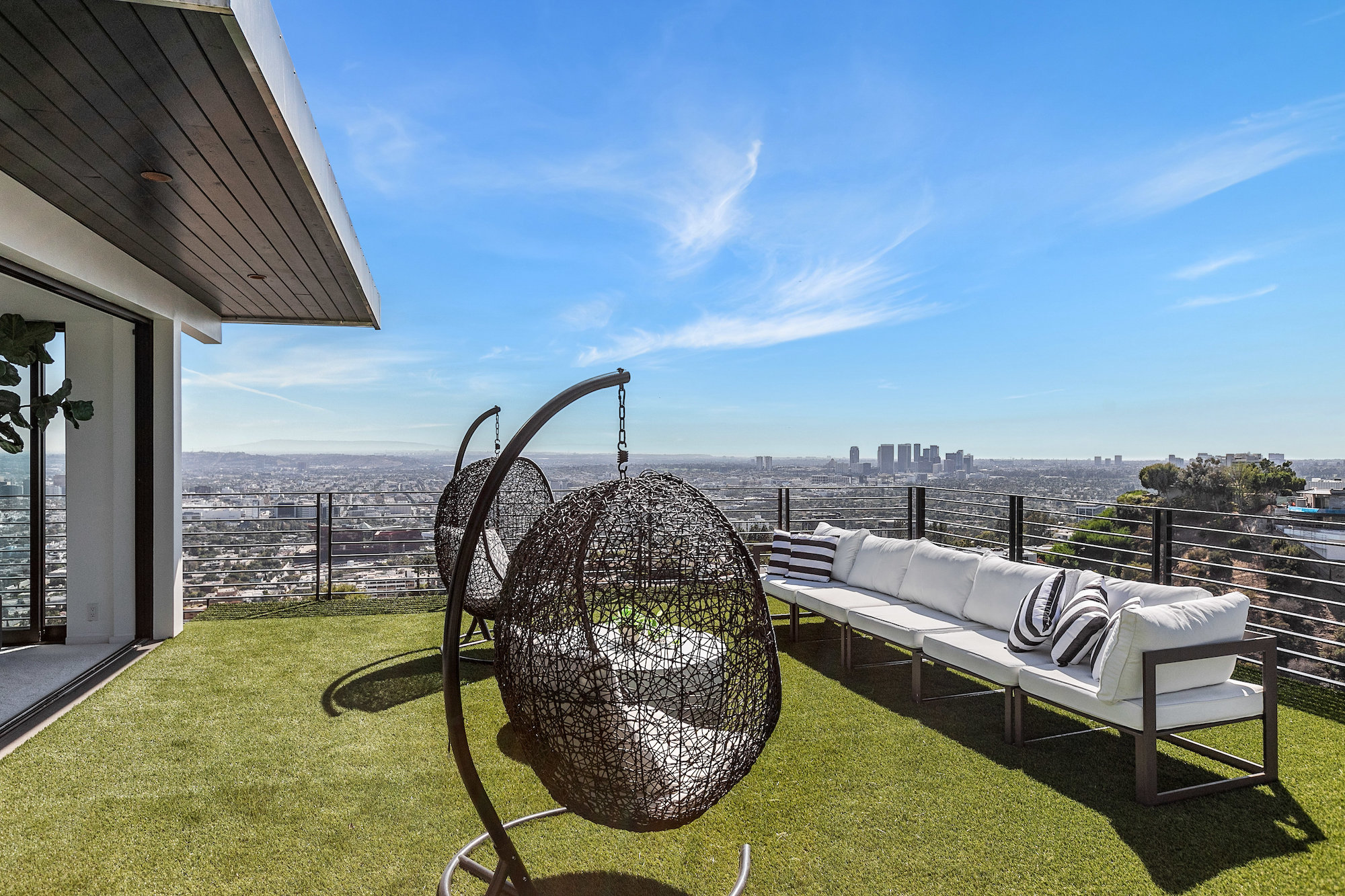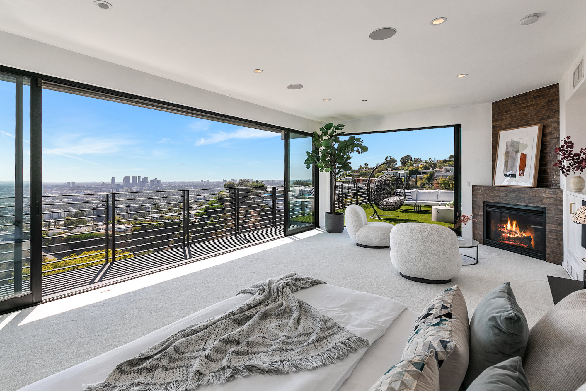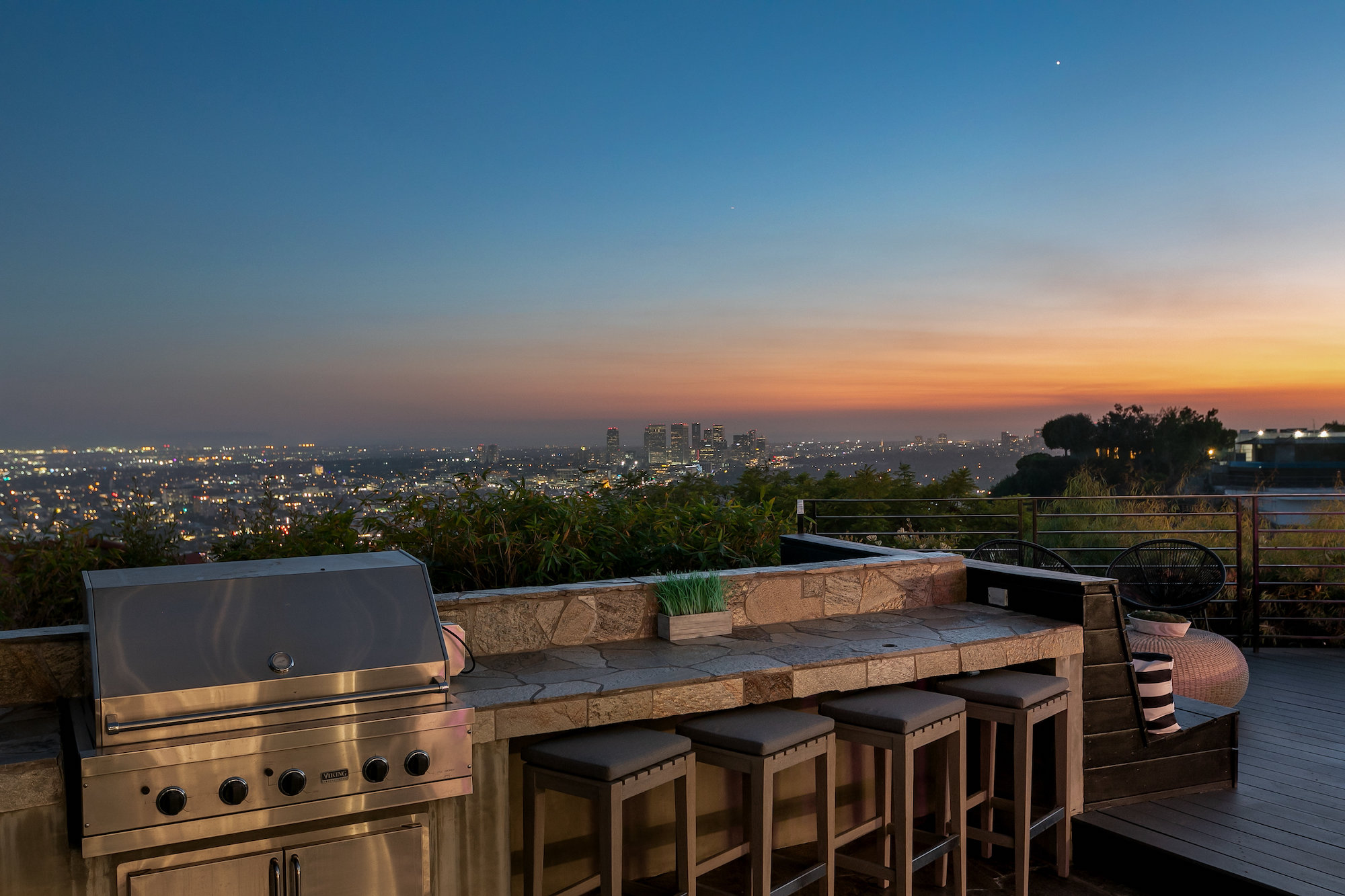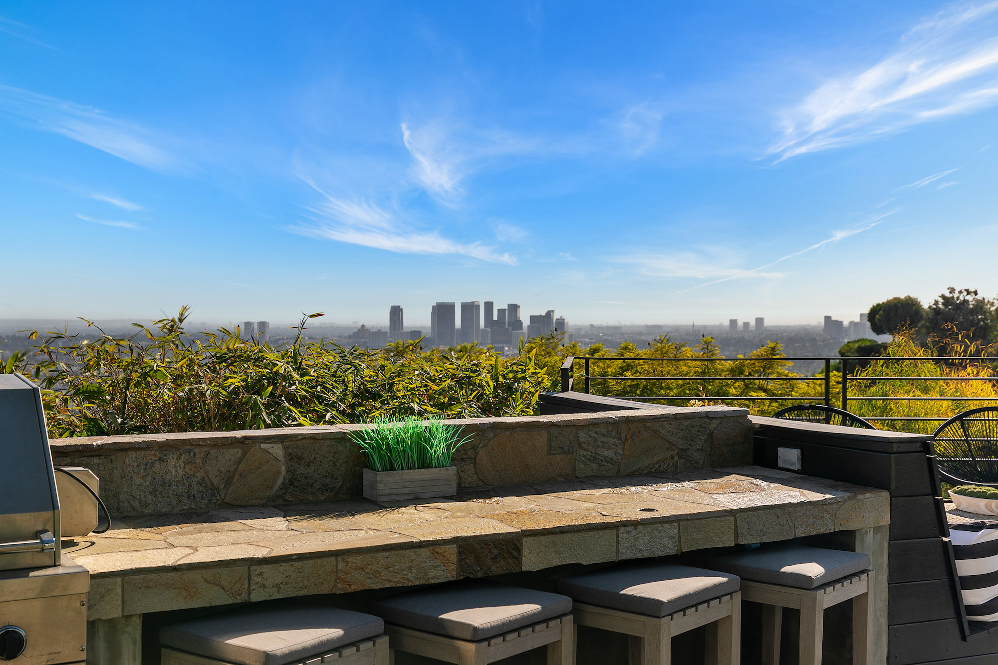 Newly remodeled entertainers paradise with explosive 360 degree views. Gated for privacy & security with 2-car garage direct access, magical walkway to front door or yard for guests and third service entrance with direct access to kitchen. Lushly landscaped backyard, pebble bottom salt water pool/spa, sunken fire pit, outdoor kitchen & gazebo. Chefs kitchen with Viking, Miele and SubZero appliances. Scintillating views from Downtown and Century City to the Ocean. Fleetwood sliding glass doors on every level and wrap-around decks with over 1,450 sq ft. of additional outdoor living space. 3 plush en-suite beds with multiple baths, floating tub, steam shower, jetted tub, bidet and impressive primary walk-in closet. 850 sq ft. rooftop-like deck off primary bed with breathtaking city and hillside views of famed Bird Streets. Screening room with projector, Blu Ray & Sonos. Elevator with access to every floor.
