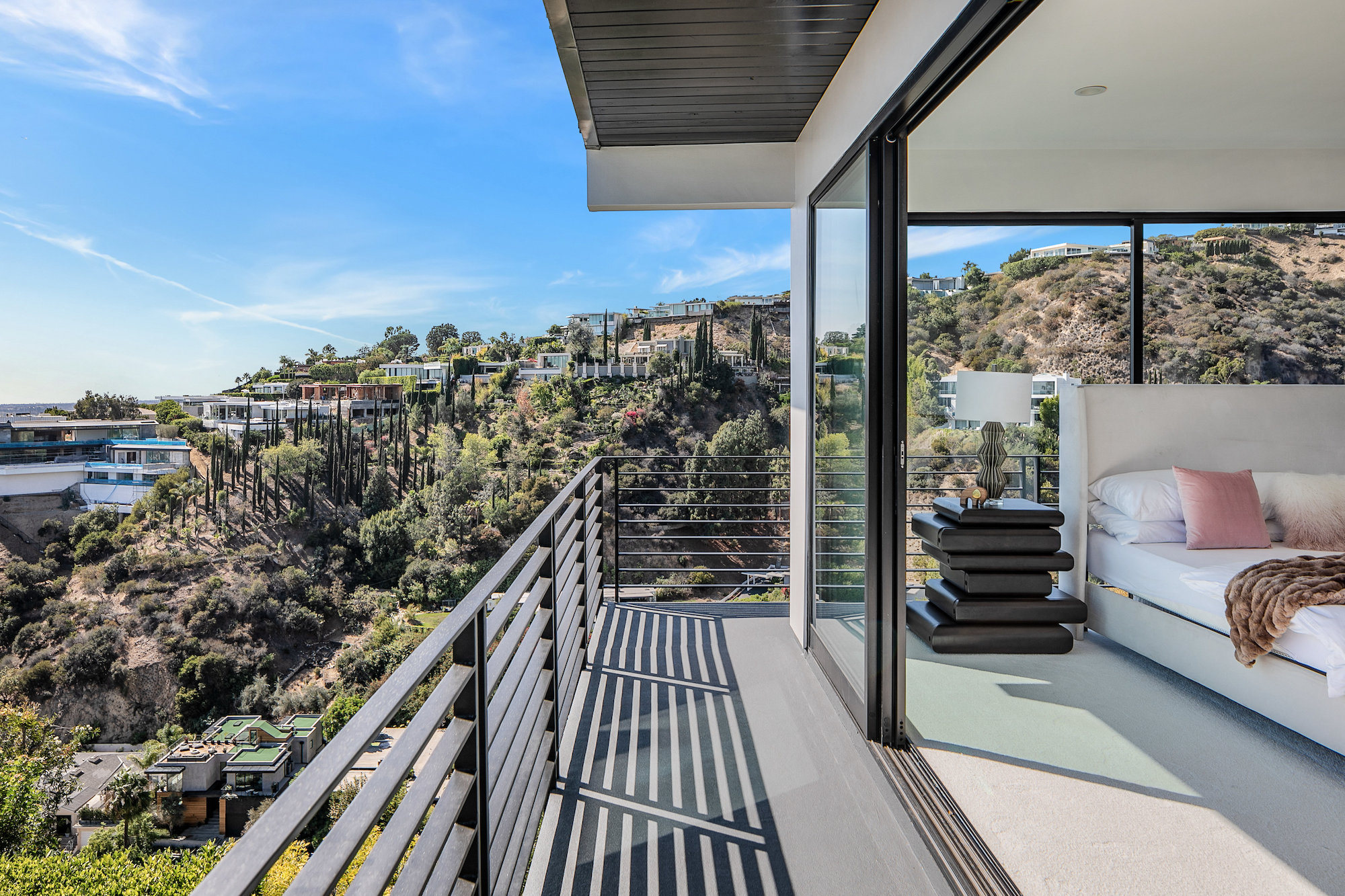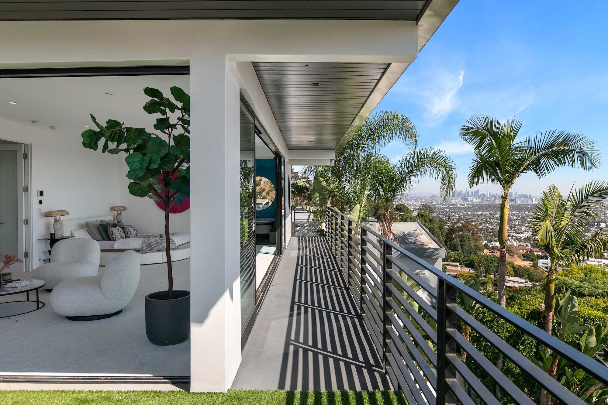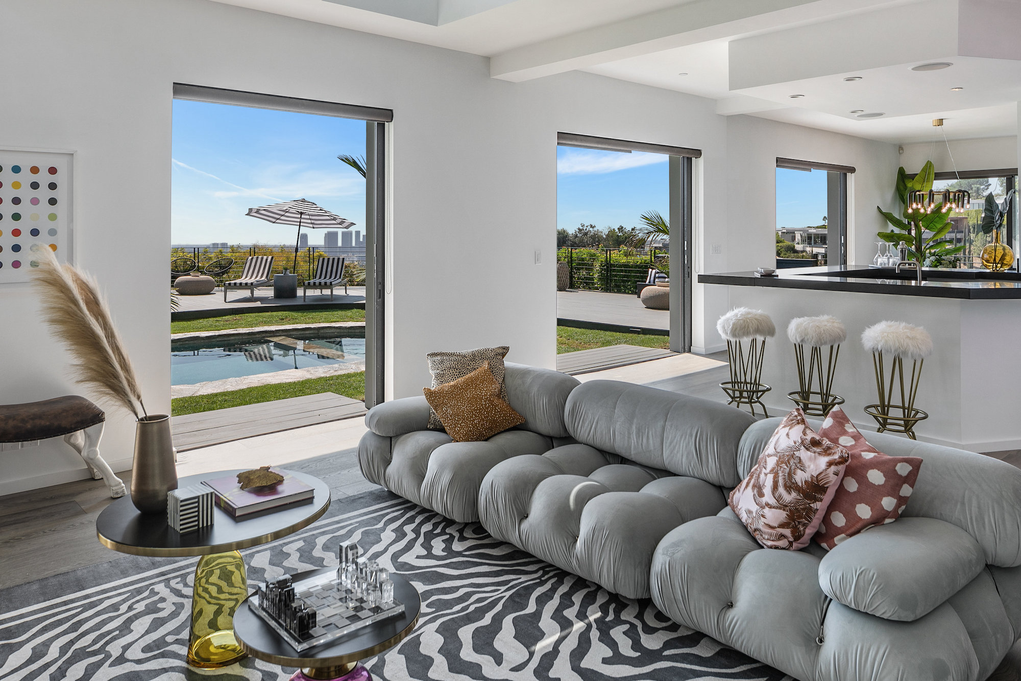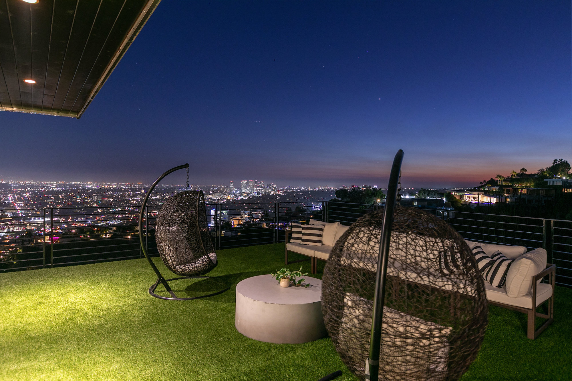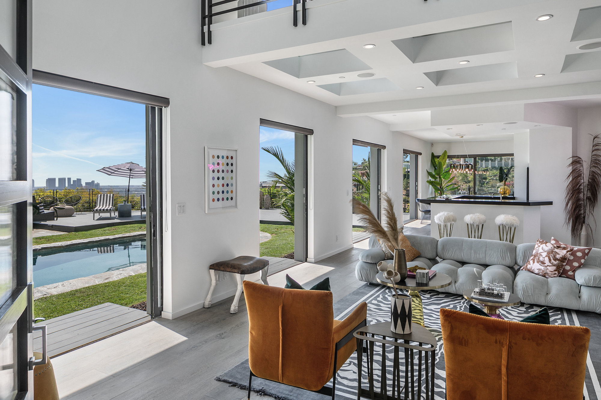 Newly remodeled entertainers paradise with explosive 360 degree views. Gated for privacy & security with 2-car garage direct access, magical walkway to front door or yard for guests and third service entrance with direct access to kitchen. Lushly landscaped backyard, pebble bottom salt water pool/spa, sunken fire pit, outdoor kitchen & gazebo. Chefs kitchen with Viking, Miele and SubZero appliances. Scintillating views from Downtown and Century City to the Ocean. Fleetwood sliding glass doors on every level and wrap-around decks with over 1,450 sq ft. of additional outdoor living space. 3 plush en-suite beds with multiple baths, floating tub, steam shower, jetted tub, bidet and impressive primary walk-in closet. 850 sq ft. rooftop-like deck off primary bed with breathtaking city and hillside views of famed Bird Streets. Screening room with projector, Blu Ray & Sonos. Elevator with access to every floor.