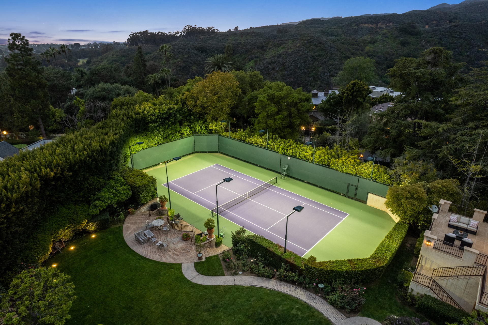 An estate of incomparable grandeur and legacy, this one-of-a-kind Villa is situated on a premier Pacific Palisades street, boasting ~2 acres of immaculate grounds with its own private tennis court. Designed by world-renowned architect Richard Landry, this estate showcases ultimate privacy, set behind large double gates and mature hedging on one of the largest lots in the Riviera. This estate consists of approximately 17,000 square feet of palatial living. Showcasing unparalleled design, this masterpiece is accented with the finest materials. This beautifully crafted Italian compound boasts 8 bedrooms, 15 bathrooms with an expansive floor plan showcasing grand scale, design and functionality. Drenched in natural light, the main home includes elaborate details and finishes with European imported stone, coffered and vaulted beamed ceilings, and rare biblical stone from Jerusalem. Highlights on the main level include a bright solarium, a luxury dining room with access to the grand chef's kitchen that exudes opulence with professional grade appliances, two islands with seating and a large pantry. Upstairs, the lavish primary suite includes a fireplace, sitting area, and private balcony that overlooks the grounds and has gorgeous ocean and canyon views. The spa-like bathroom includes dual layout, each having their own private space with showroom style walk-in closets. The home boasts multiple recreational areas including a screening room, large sitting/playroom upstairs, and a dedicated game room on the main level. Outdoor entertainment at its finest, the sizable backyard includes a newly restored lit private north/south tennis court with viewing area, putting green, built-in BBQ with dining and bask in the large pool/spa in the sun all day. The property also offers a 2-story, private 1-bedroom, 2-bathroom guest house that includes a full kitchen. This once-in-a-generation estate is one that you do not want to miss.