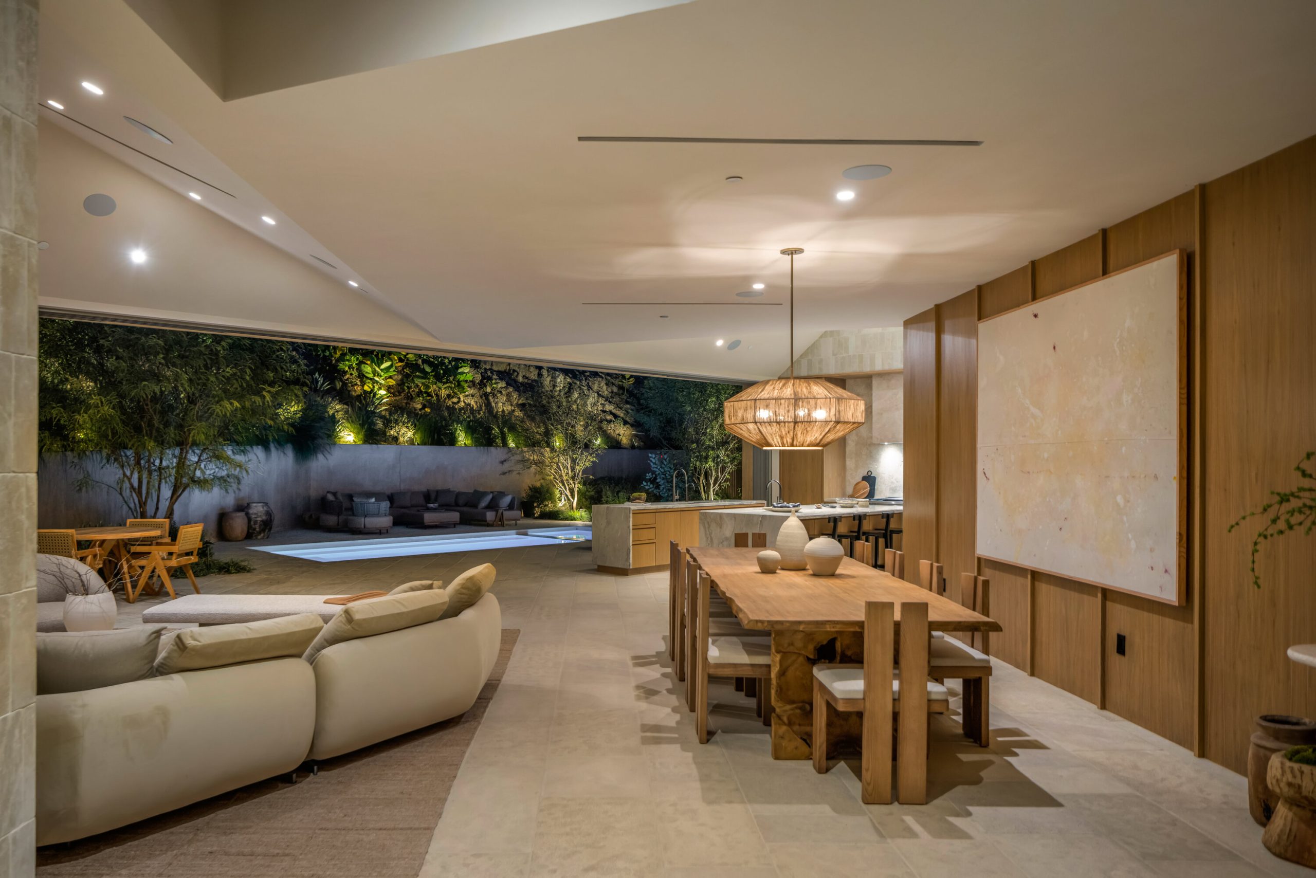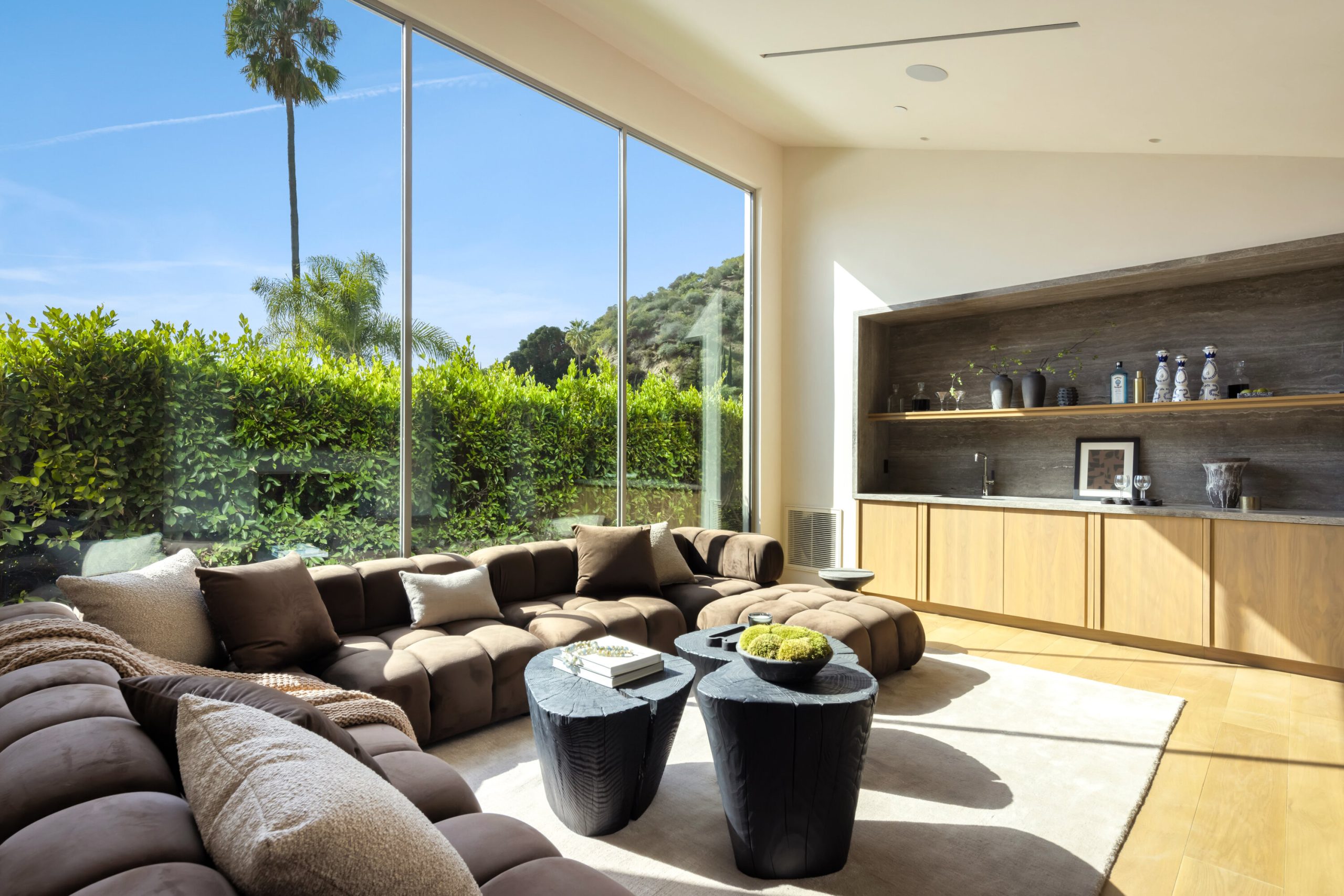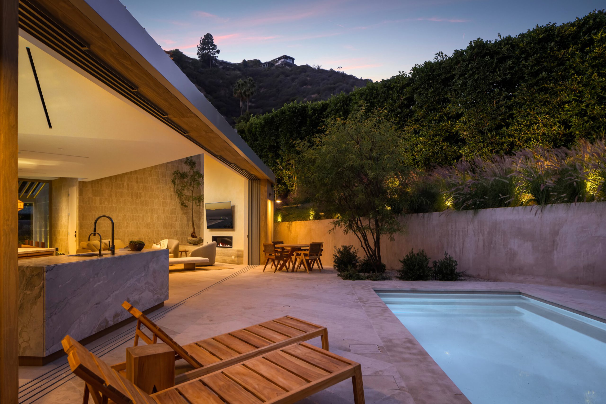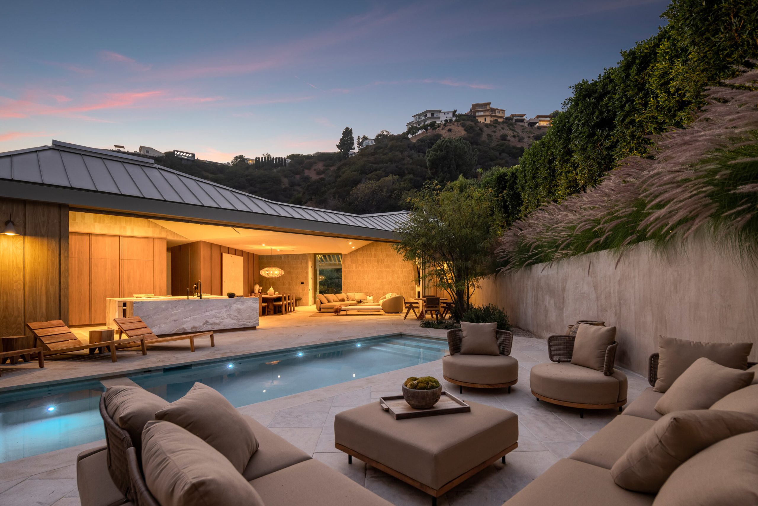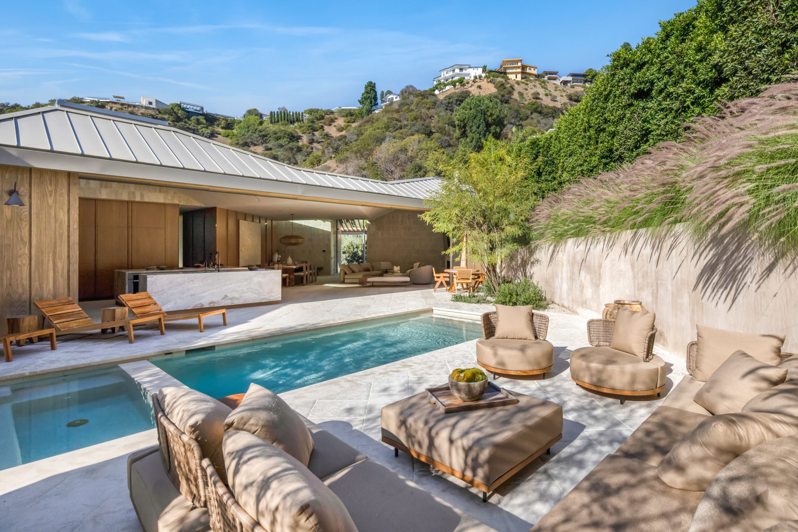 Sculpted Serenity: A timeless design ethos inspired by Amangiri where nature, light, and material exist in perfect harmony. An architectural statement above the Sunset Strip, spanning a single level across 4,600 square feet, where every surface feels sculpted rather than built. Effortless California living through world-class materials. Walls of Moroccan hand-tumbled limestone set a warm, organic tone, complemented by Egyptian limestone floors that flow seamlessly throughout. Custom walnut millwork adds depth and texture, grounding the minimalist aesthetic with natural warmth. The great room unfolds beneath high ceilings that capture shifting light, centered around a Titanium travertine lounge bar a sculptural focal point of the home. Designed for those who value art and beauty, interiors feature expansive art walls with subtle, specialized lighting. The silver-travertine fireplace and powder room bring quiet sophistication, their textures echoing the surrounding landscape. In the kitchen, a travertine hood and bespoke walnut cabinetry reflect refined simplicity and craft. The primary suite is conceived as a world-class spa retreat, with a Gold Dune stone bath, steam shower, and wellness and massage room designed for deep restoration. Each bedroom offers tranquil proportion and a seamless connection to nature. Clad in Accoya wood siding that blends with the hillside, the home feels organically rooted in its environment. A perfectly scaled pool sits in total privacy, framed by mature trees and granite outcroppings a serene retreat where architecture and landscape exist in perfect balance. 4,600 square feet includes garage