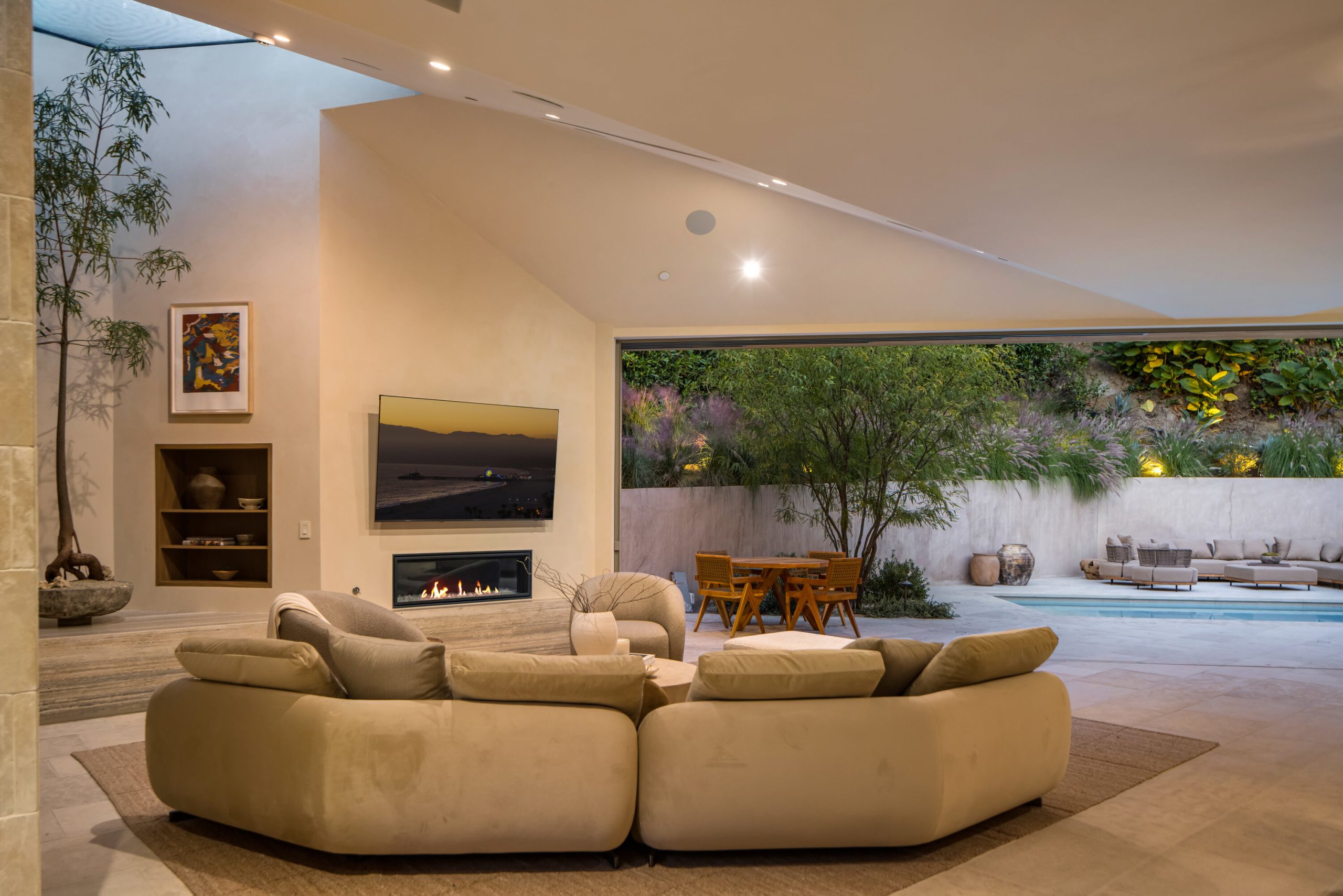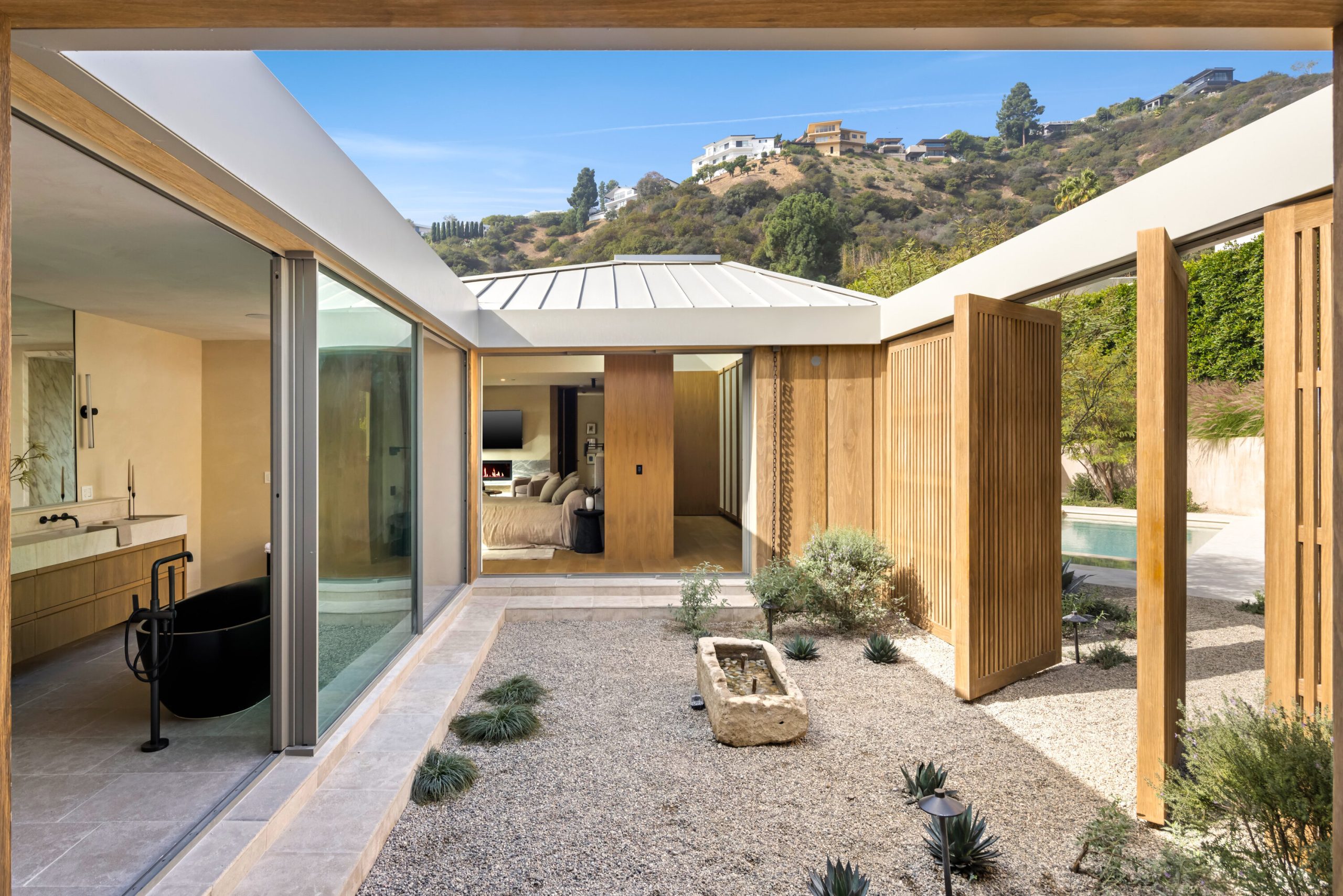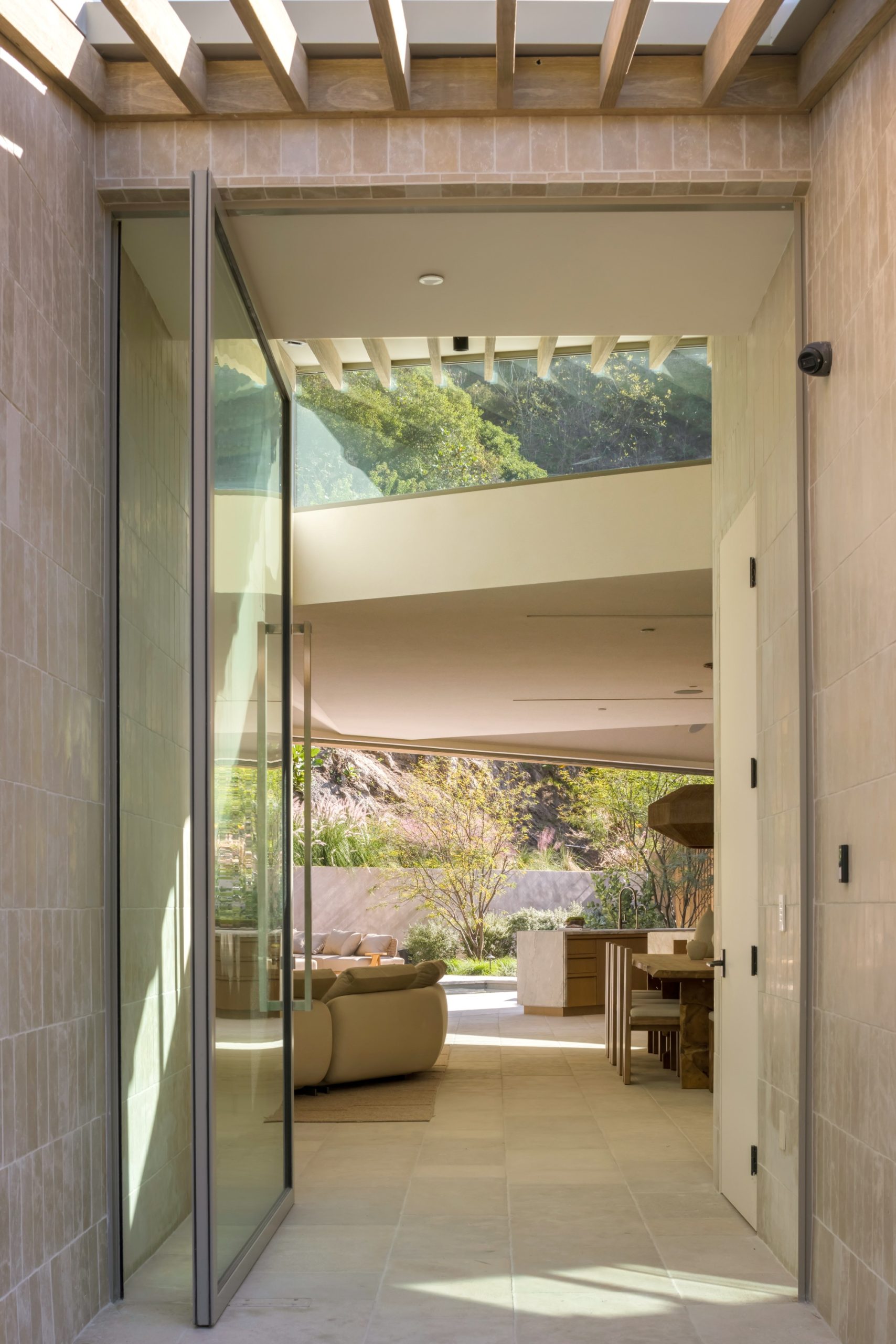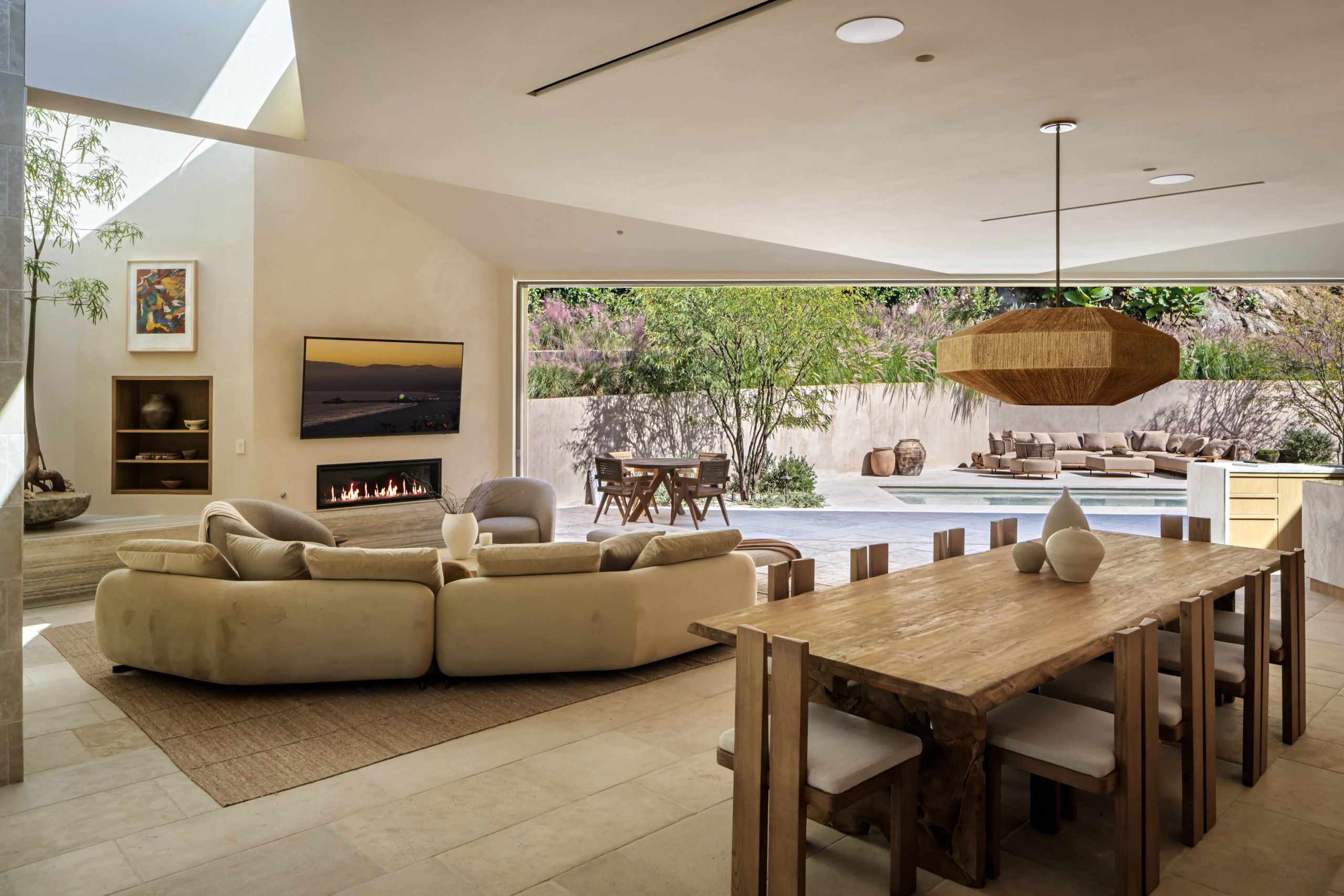 Sculpted Serenity: A timeless design ethos inspired by Amangiri where nature, light, and material exist in perfect harmony. An architectural statement above the Sunset Strip, spanning a single level across 4,600 square feet, where every surface feels sculpted rather than built. Effortless California living through world-class materials. Walls of Moroccan hand-tumbled limestone set a warm, organic tone, complemented by Egyptian limestone floors that flow seamlessly throughout. Custom walnut millwork adds depth and texture, grounding the minimalist aesthetic with natural warmth. The great room unfolds beneath high ceilings that capture shifting light, centered around a Titanium travertine lounge bar a sculptural focal point of the home. Designed for those who value art and beauty, interiors feature expansive art walls with subtle, specialized lighting. The silver-travertine fireplace and powder room bring quiet sophistication, their textures echoing the surrounding landscape. In the kitchen, a travertine hood and bespoke walnut cabinetry reflect refined simplicity and craft. The primary suite is conceived as a world-class spa retreat, with a Gold Dune stone bath, steam shower, and wellness and massage room designed for deep restoration. Each bedroom offers tranquil proportion and a seamless connection to nature. Clad in Accoya wood siding that blends with the hillside, the home feels organically rooted in its environment. A perfectly scaled pool sits in total privacy, framed by mature trees and granite outcroppings a serene retreat where architecture and landscape exist in perfect balance. 4,600 square feet includes garage