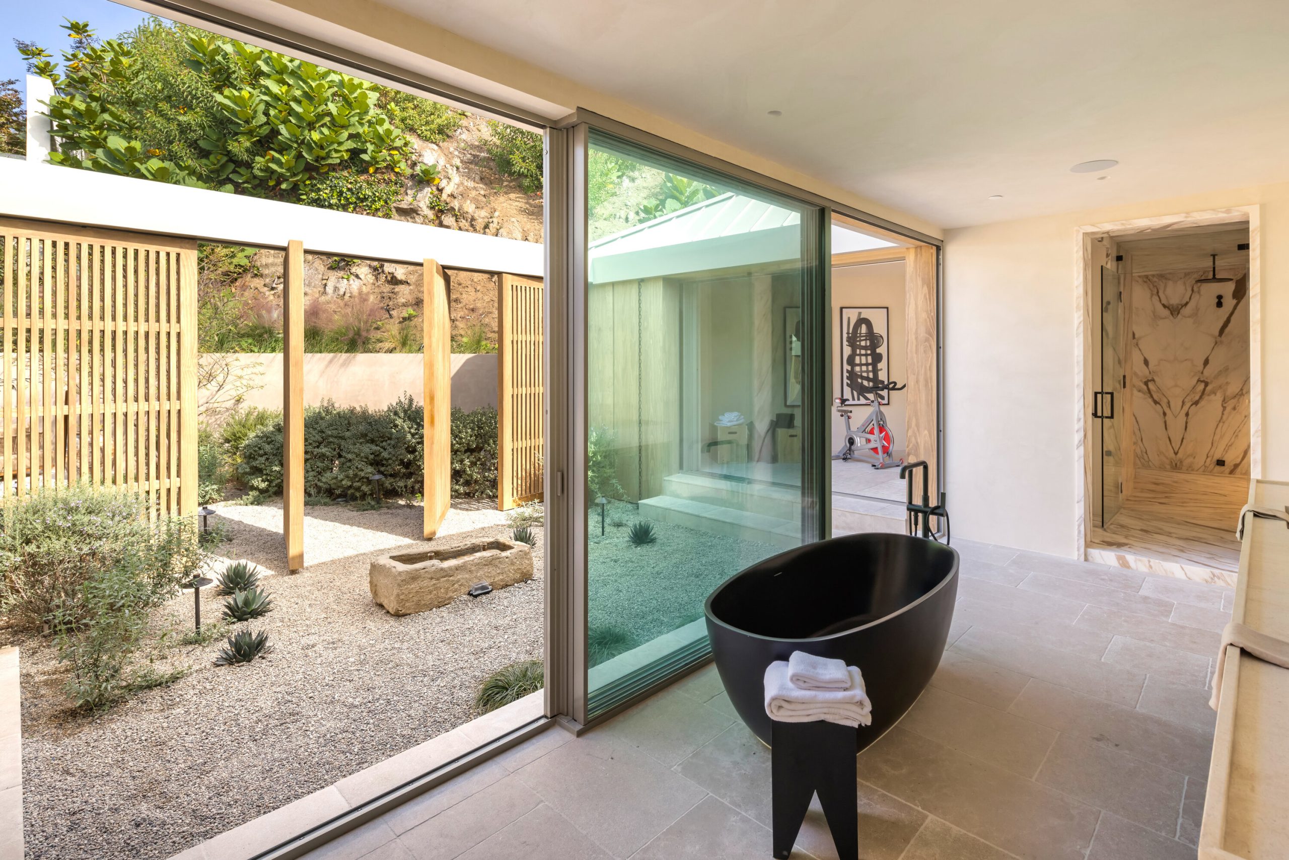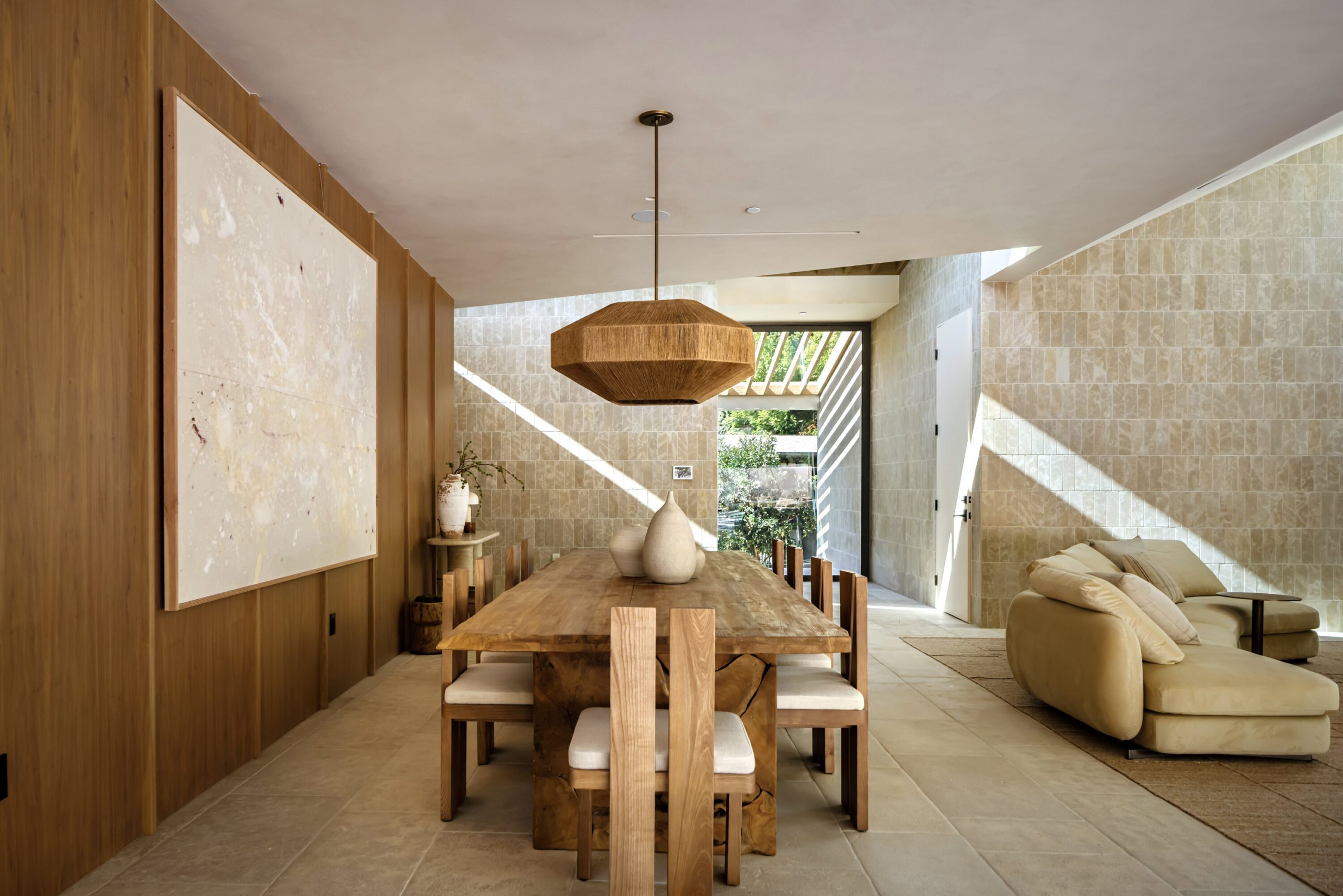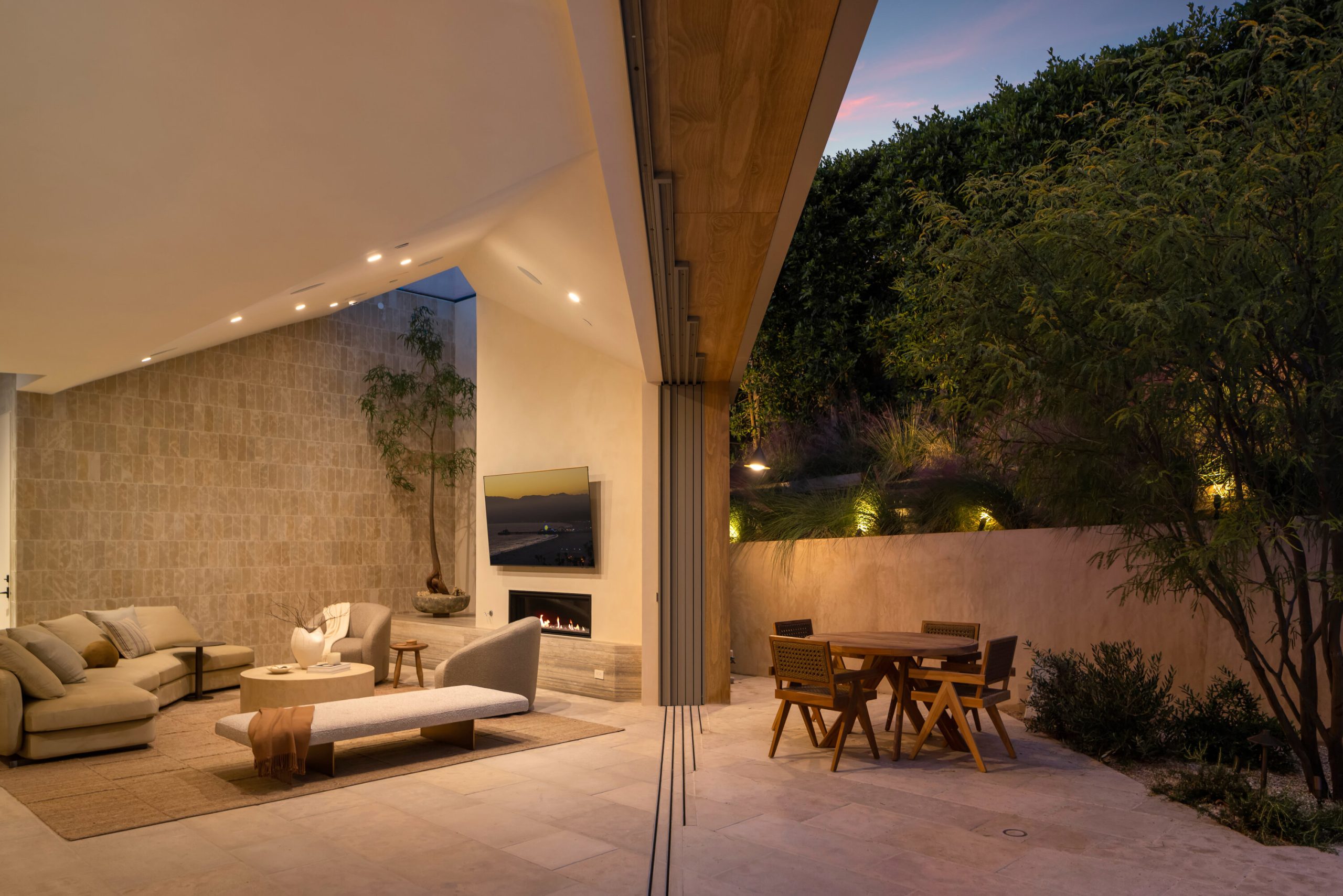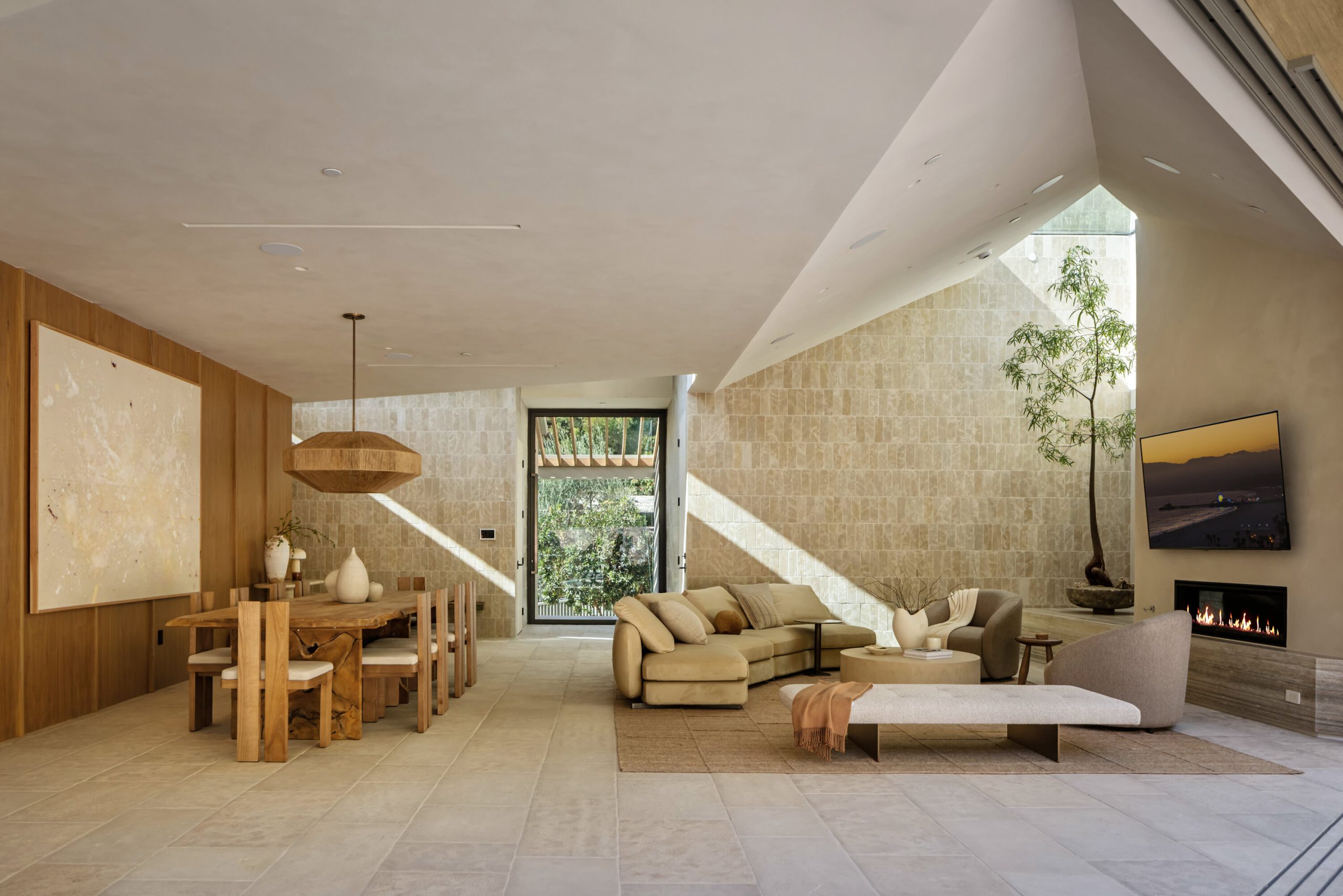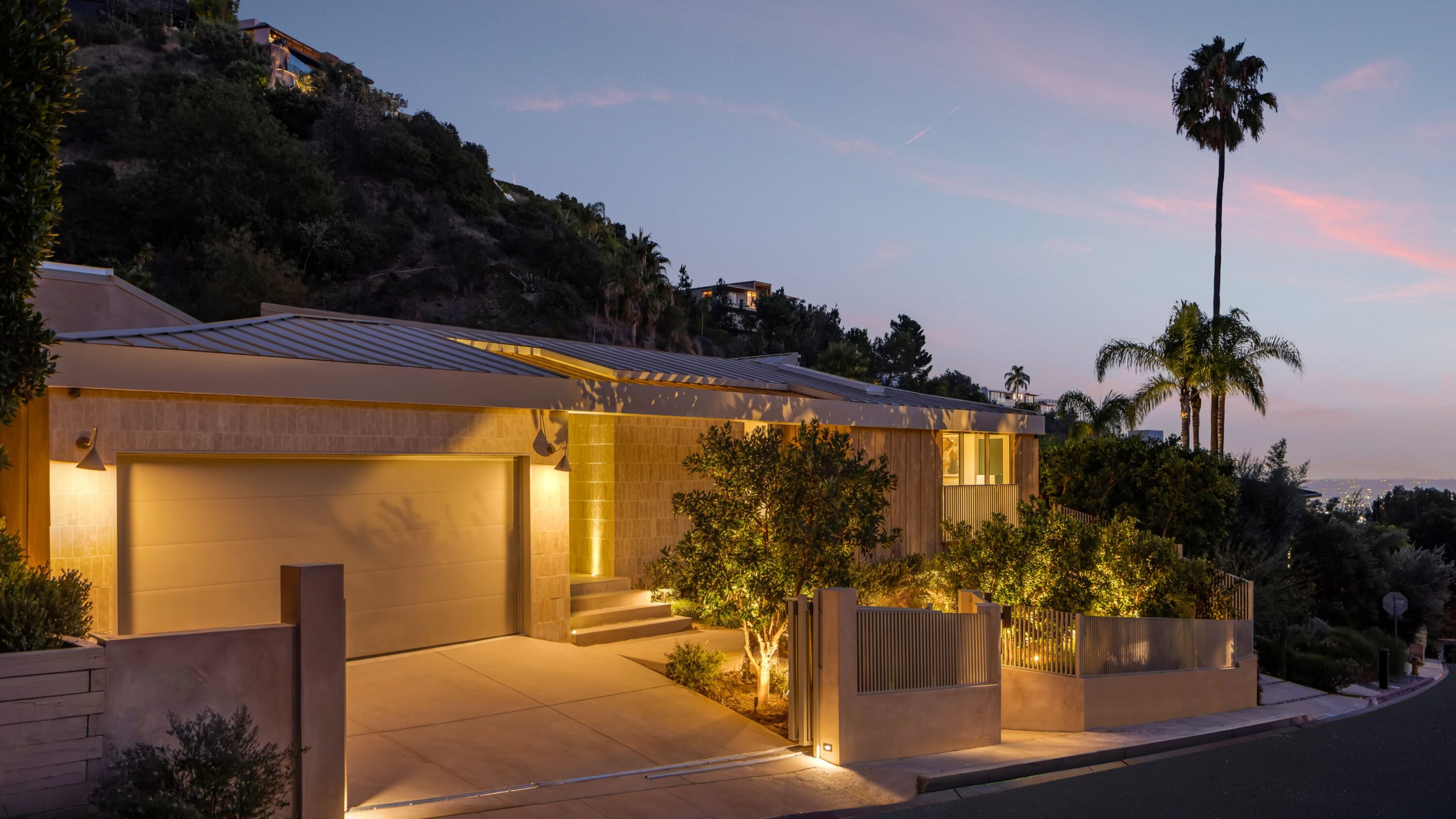 Sculpted Serenity: A timeless design ethos inspired by Amangiri where nature, light, and material exist in perfect harmony. An architectural statement above the Sunset Strip, spanning a single level across 4,600 square feet, where every surface feels sculpted rather than built. Effortless California living through world-class materials. Walls of Moroccan hand-tumbled limestone set a warm, organic tone, complemented by Egyptian limestone floors that flow seamlessly throughout. Custom walnut millwork adds depth and texture, grounding the minimalist aesthetic with natural warmth. The great room unfolds beneath high ceilings that capture shifting light, centered around a Titanium travertine lounge bar a sculptural focal point of the home. Designed for those who value art and beauty, interiors feature expansive art walls with subtle, specialized lighting. The silver-travertine fireplace and powder room bring quiet sophistication, their textures echoing the surrounding landscape. In the kitchen, a travertine hood and bespoke walnut cabinetry reflect refined simplicity and craft. The primary suite is conceived as a world-class spa retreat, with a Gold Dune stone bath, steam shower, and wellness and massage room designed for deep restoration. Each bedroom offers tranquil proportion and a seamless connection to nature. Clad in Accoya wood siding that blends with the hillside, the home feels organically rooted in its environment. A perfectly scaled pool sits in total privacy, framed by mature trees and granite outcroppings a serene retreat where architecture and landscape exist in perfect balance. 4,600 square feet includes garage