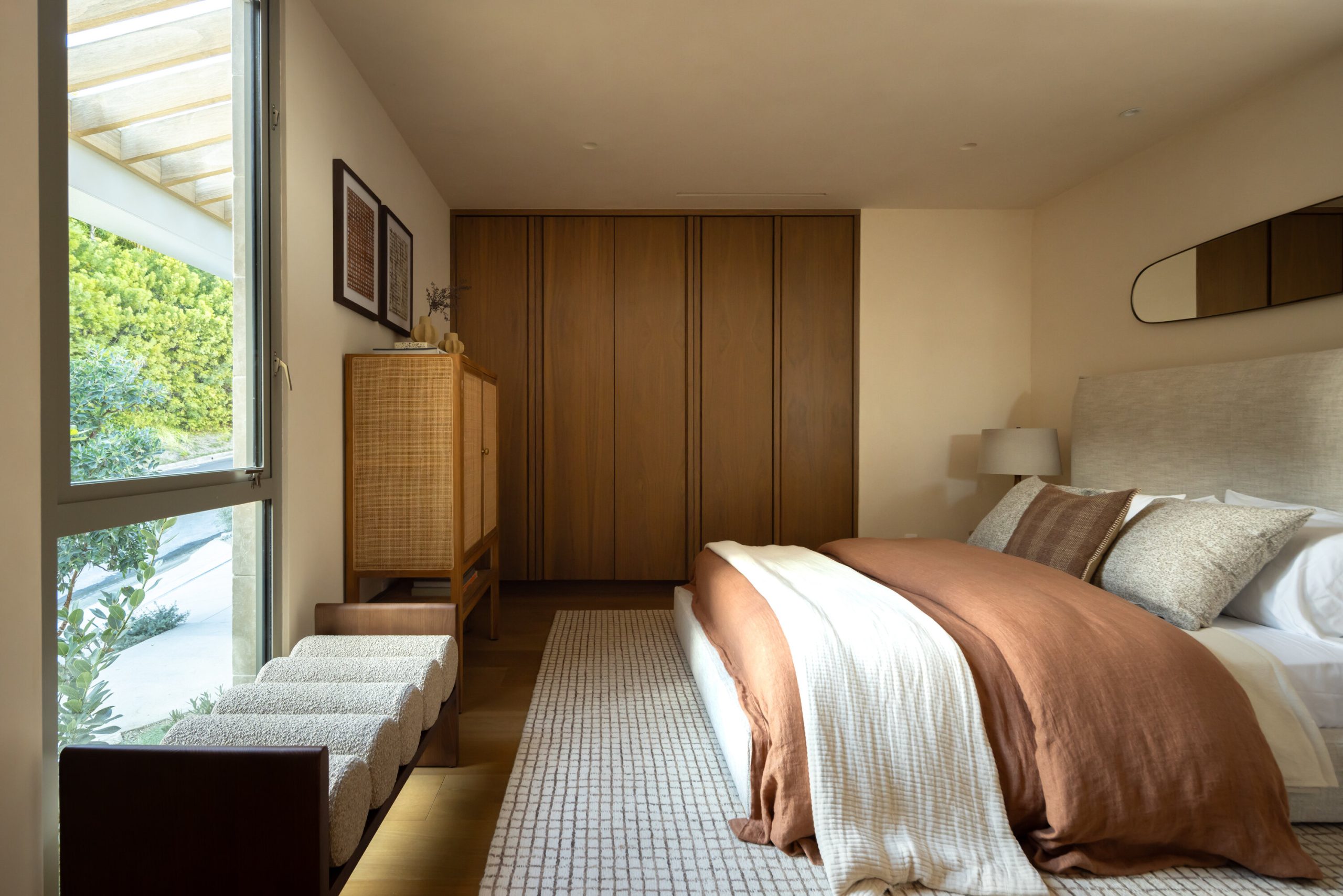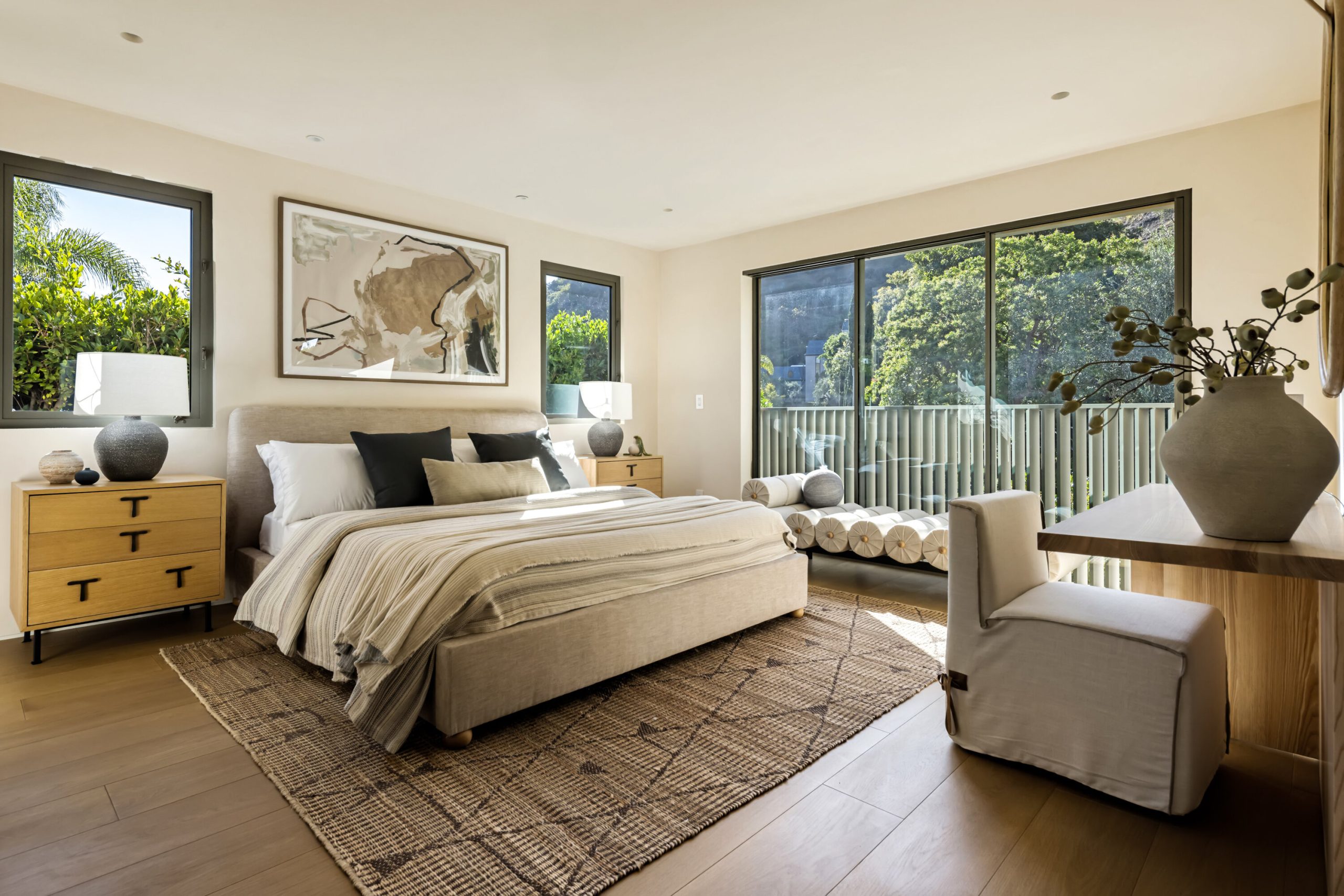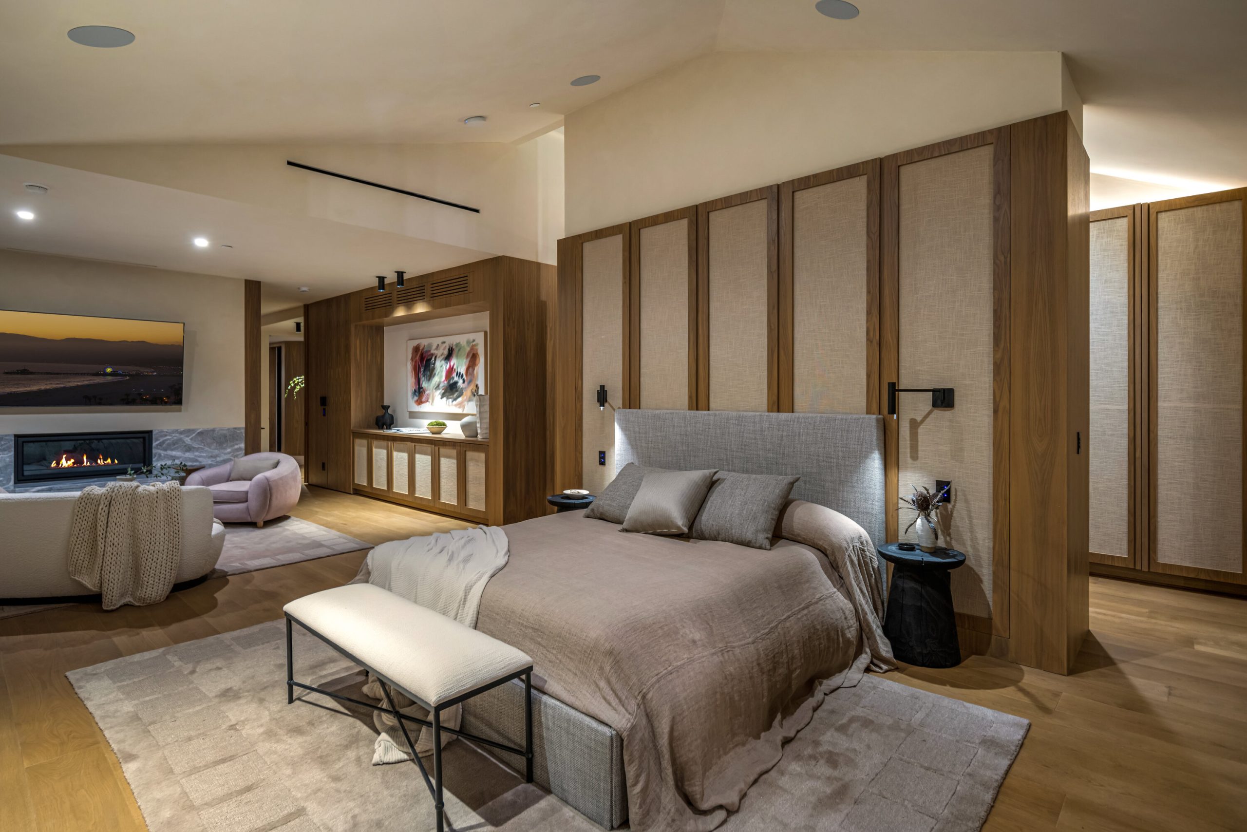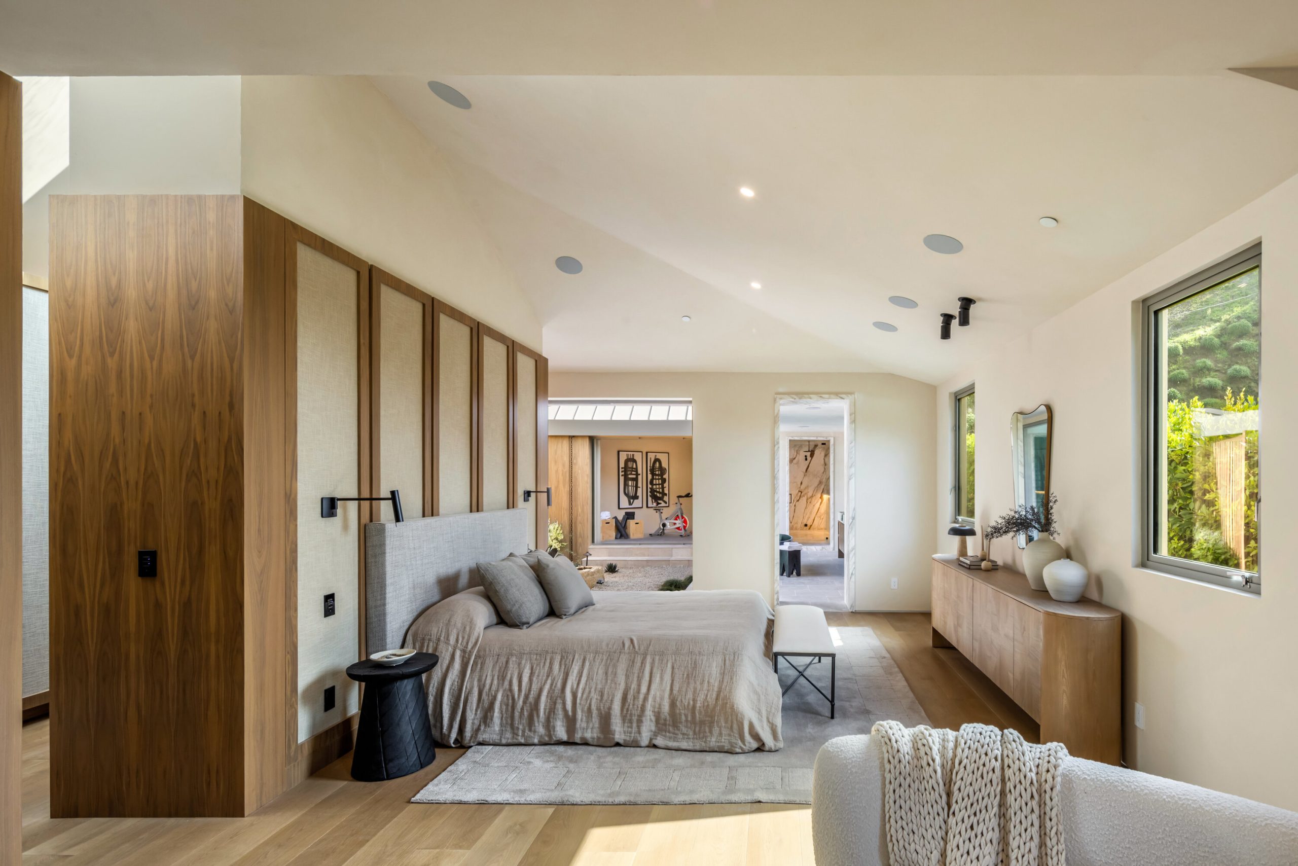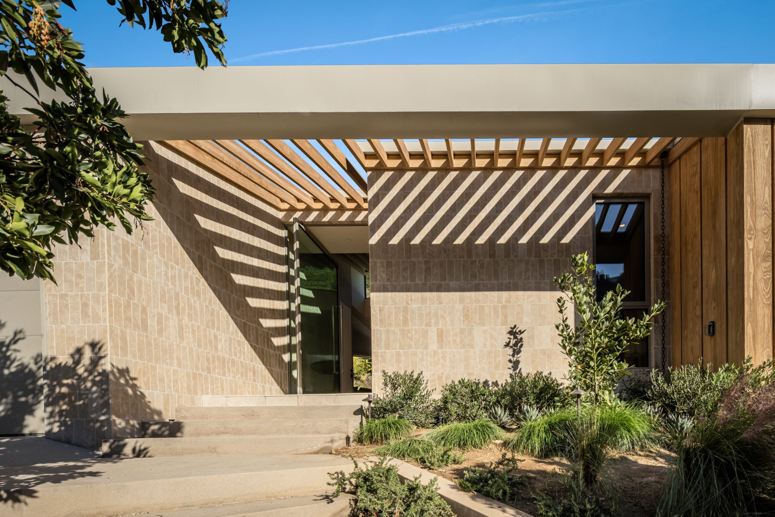 Sculpted Serenity: A timeless design ethos inspired by Amangiri where nature, light, and material exist in perfect harmony. An architectural statement above the Sunset Strip, spanning a single level across 4,600 square feet, where every surface feels sculpted rather than built. Effortless California living through world-class materials. Walls of Moroccan hand-tumbled limestone set a warm, organic tone, complemented by Egyptian limestone floors that flow seamlessly throughout. Custom walnut millwork adds depth and texture, grounding the minimalist aesthetic with natural warmth. The great room unfolds beneath high ceilings that capture shifting light, centered around a Titanium travertine lounge bar a sculptural focal point of the home. Designed for those who value art and beauty, interiors feature expansive art walls with subtle, specialized lighting. The silver-travertine fireplace and powder room bring quiet sophistication, their textures echoing the surrounding landscape. In the kitchen, a travertine hood and bespoke walnut cabinetry reflect refined simplicity and craft. The primary suite is conceived as a world-class spa retreat, with a Gold Dune stone bath, steam shower, and wellness and massage room designed for deep restoration. Each bedroom offers tranquil proportion and a seamless connection to nature. Clad in Accoya wood siding that blends with the hillside, the home feels organically rooted in its environment. A perfectly scaled pool sits in total privacy, framed by mature trees and granite outcroppings a serene retreat where architecture and landscape exist in perfect balance. 4,600 square feet includes garage