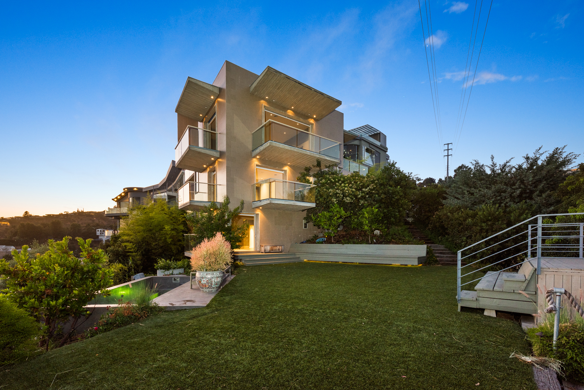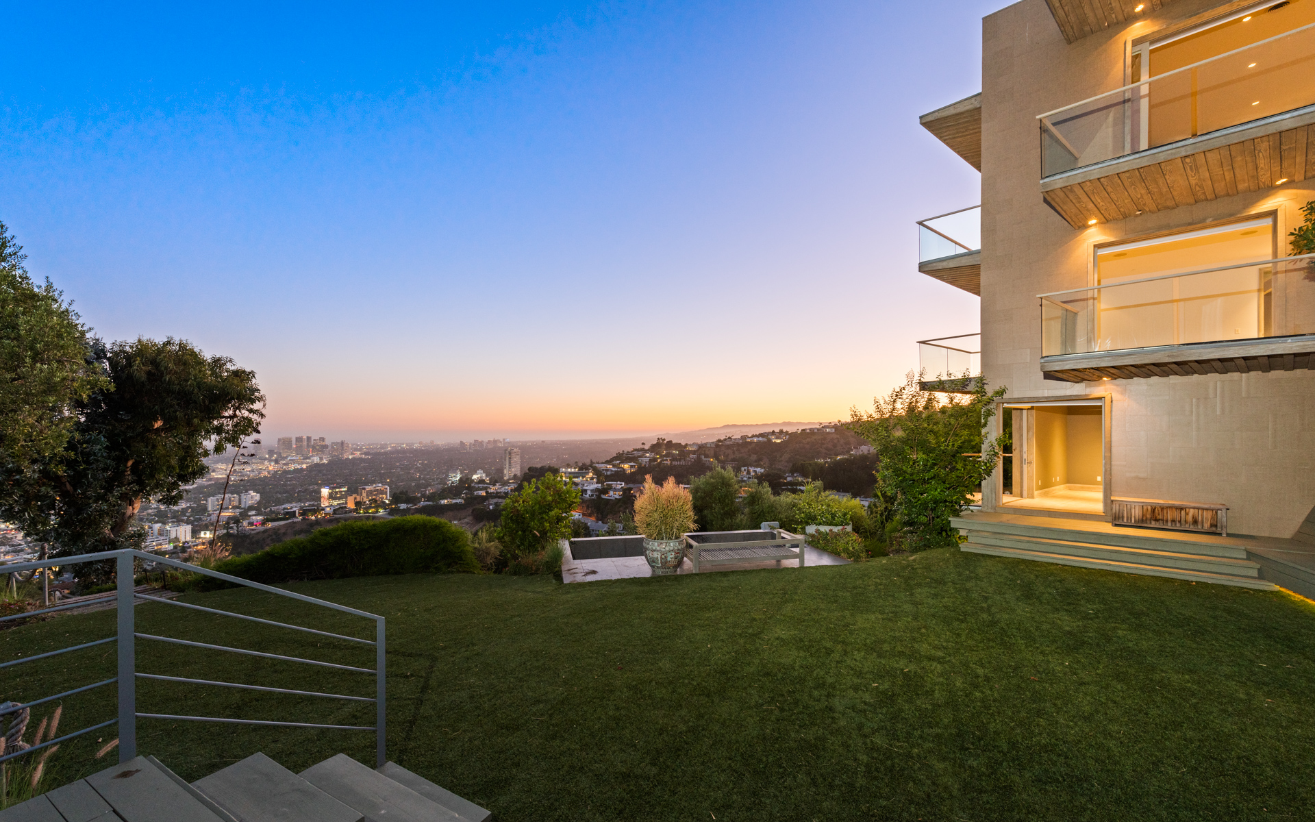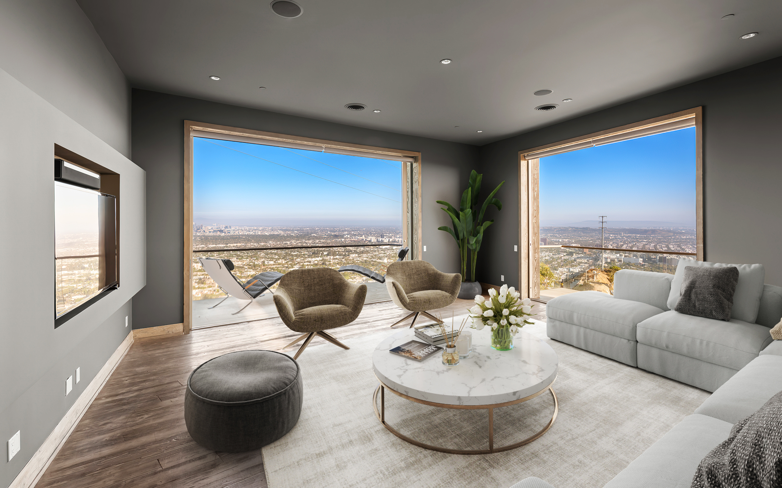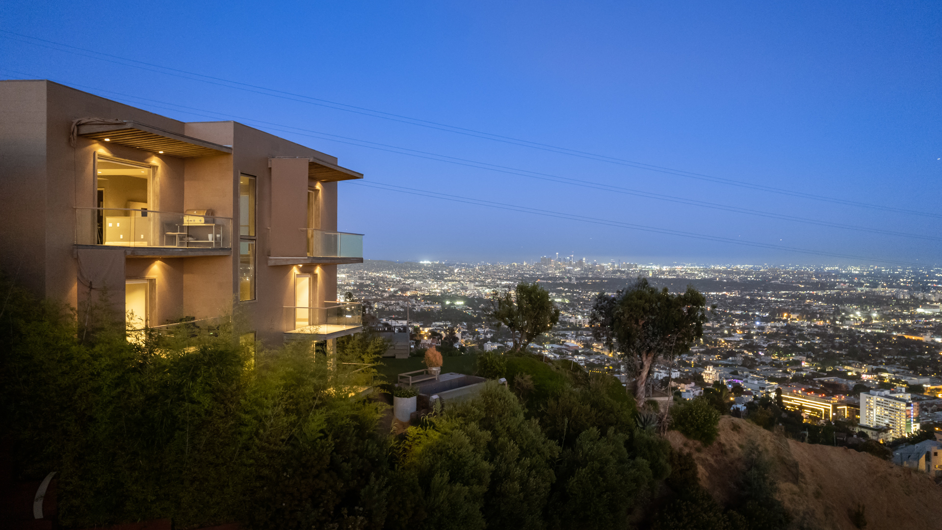 Situated high above the iconic Sunset Strip, this gated architectural masterpiece commands breathtaking jetliner views of the city skyline and the Pacific Ocean beyond. Meticulously designed to harmonize modern sophistication with the surrounding natural beauty, this three-bedroom with an office, five-bathroom residence spans over 3,400 square feet of refined living space. Flooded with natural light, the open-concept interior features disappearing pocket doors that blur the line between indoor and outdoor living, inviting in the shimmering city lights. Nine expansive limestone-clad balconies with covered roofs totaling approximately 700 square feet extend the living space into the open air, ideal for both relaxed lounging and sophisticated entertaining. At the heart of the home, the gourmet kitchen is a showcase of culinary artistry, appointed with top-tier appliances, custom cabinetry, and a generous central island that doubles as a gathering hub. The Primary Suite is a serene retreat, offering sweeping views from its private balcony, a spacious walk-in closet, and a spa-inspired bath with dual vanities and a soaking tub. Thoughtfully designed to embrace the outdoors, the property features a large hot tub, lush landscaping, multiple sitting areas, and a peaceful walking path leading to a scenic overlook. Additional highlights include a gated motor court with parking for up to six vehicles, a media area, detached casita/office, and eco-conscious xeriscape landscaping. Located in the prestigious Viewmont Heights enclave, this rare offering is moments from world-class shopping, dining, and entertainment.