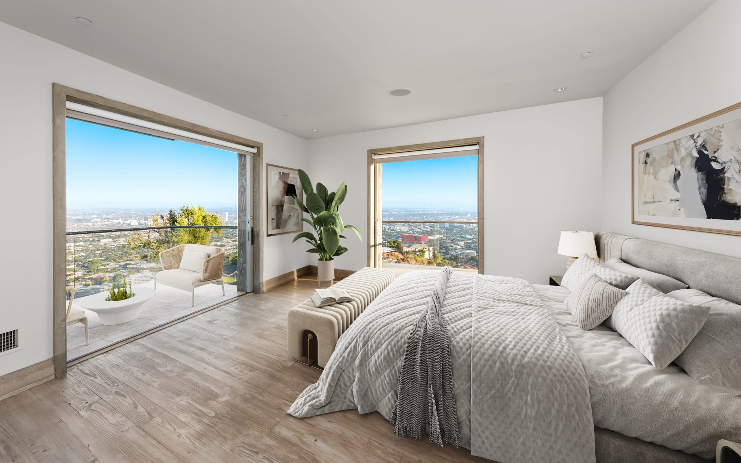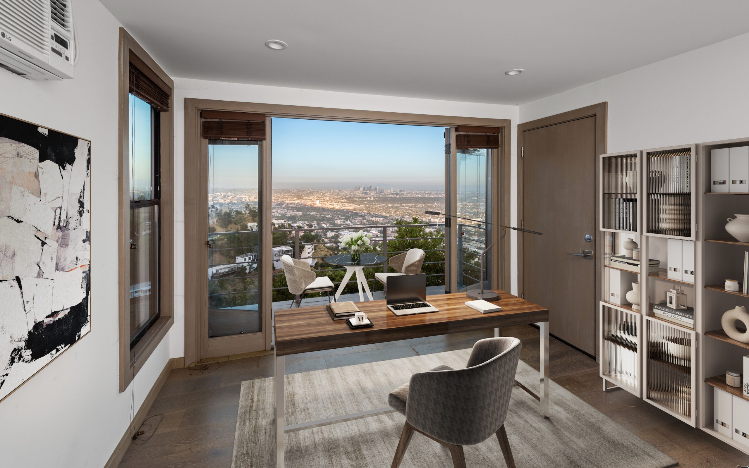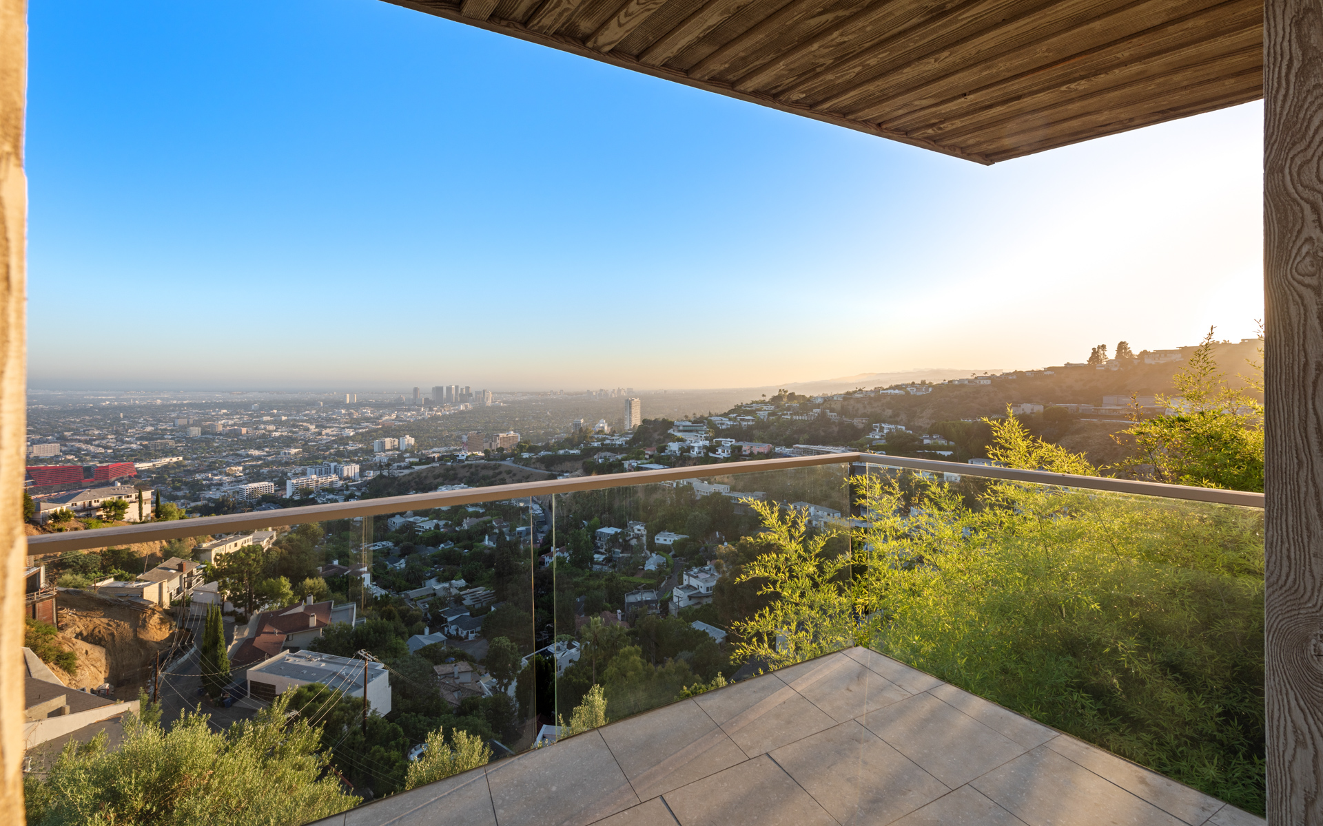 Situated high above the iconic Sunset Strip, this gated architectural masterpiece commands breathtaking jetliner views of the city skyline and the Pacific Ocean beyond. Meticulously designed to harmonize modern sophistication with the surrounding natural beauty, this three-bedroom with an office, five-bathroom residence spans over 3,400 square feet of refined living space. Flooded with natural light, the open-concept interior features disappearing pocket doors that blur the line between indoor and outdoor living, inviting in the shimmering city lights. Nine expansive limestone-clad balconies with covered roofs totaling approximately 700 square feet extend the living space into the open air, ideal for both relaxed lounging and sophisticated entertaining. At the heart of the home, the gourmet kitchen is a showcase of culinary artistry, appointed with top-tier appliances, custom cabinetry, and a generous central island that doubles as a gathering hub. The Primary Suite is a serene retreat, offering sweeping views from its private balcony, a spacious walk-in closet, and a spa-inspired bath with dual vanities and a soaking tub. Thoughtfully designed to embrace the outdoors, the property features a large hot tub, lush landscaping, multiple sitting areas, and a peaceful walking path leading to a scenic overlook. Additional highlights include a gated motor court with parking for up to six vehicles, a media area, detached casita/office, and eco-conscious xeriscape landscaping. Located in the prestigious Viewmont Heights enclave, this rare offering is moments from world-class shopping, dining, and entertainment.