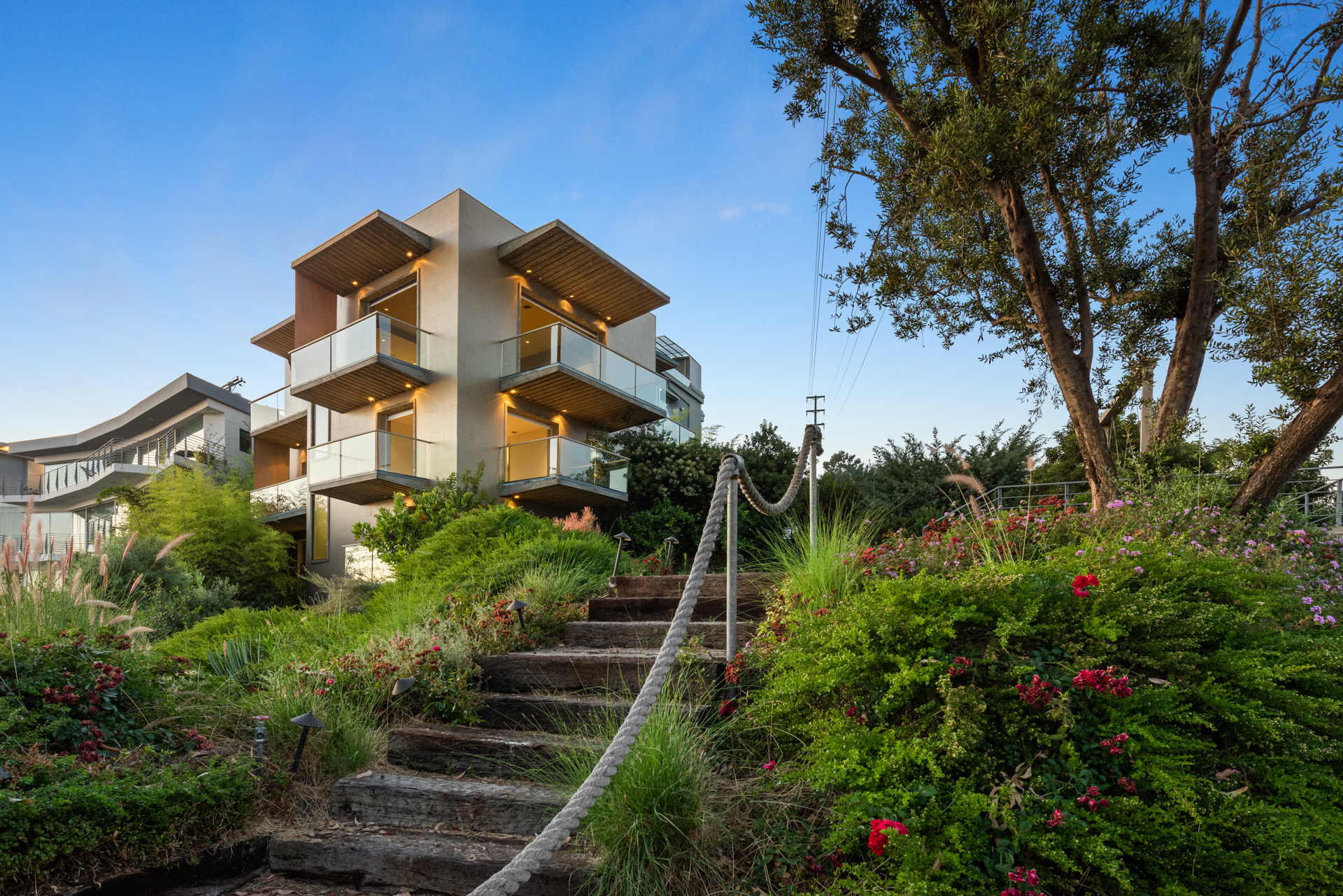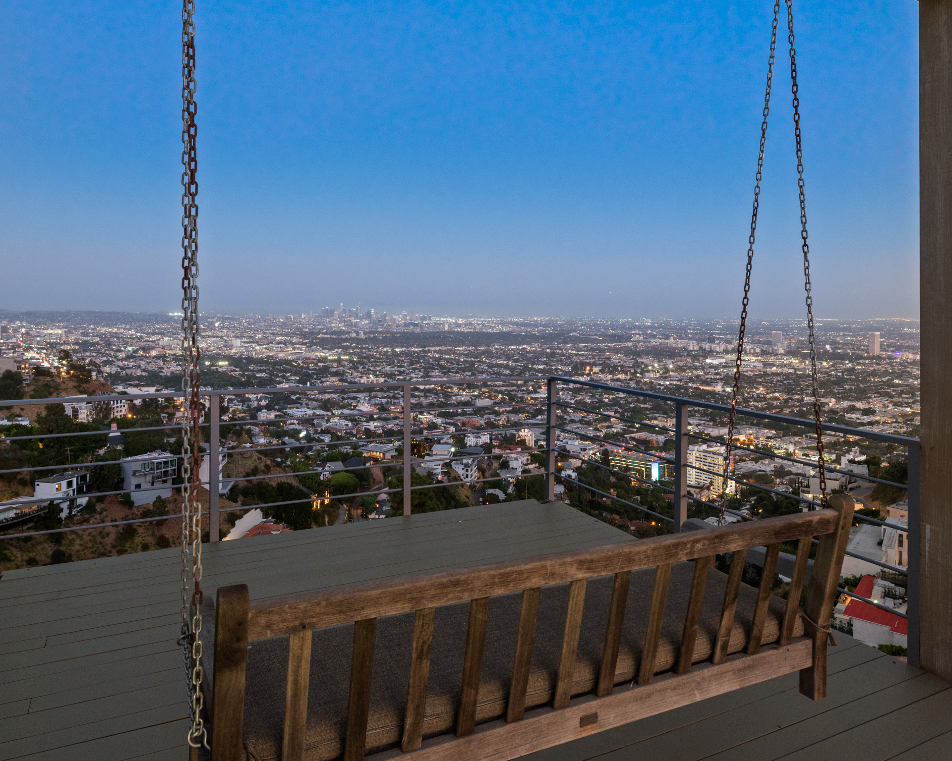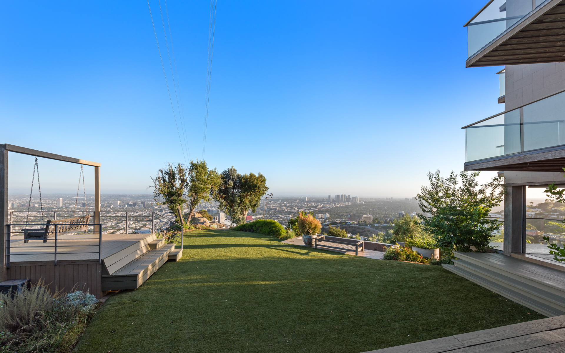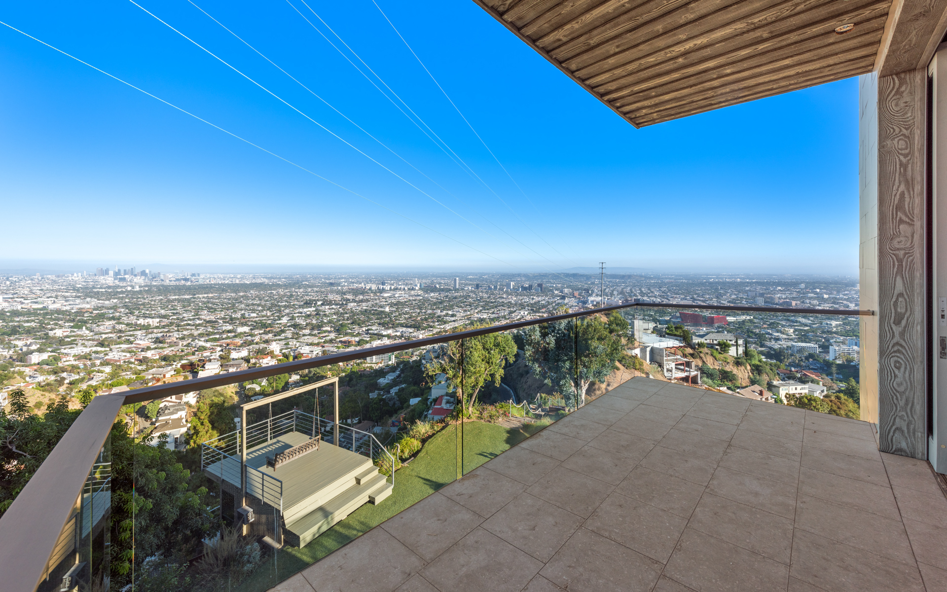 Situated high above the iconic Sunset Strip, this gated architectural masterpiece commands breathtaking jetliner views of the city skyline and the Pacific Ocean beyond. Meticulously designed to harmonize modern sophistication with the surrounding natural beauty, this three-bedroom with an office, five-bathroom residence spans over 3,400 square feet of refined living space. Flooded with natural light, the open-concept interior features disappearing pocket doors that blur the line between indoor and outdoor living, inviting in the shimmering city lights. Nine expansive limestone-clad balconies with covered roofs totaling approximately 700 square feet extend the living space into the open air, ideal for both relaxed lounging and sophisticated entertaining. At the heart of the home, the gourmet kitchen is a showcase of culinary artistry, appointed with top-tier appliances, custom cabinetry, and a generous central island that doubles as a gathering hub. The Primary Suite is a serene retreat, offering sweeping views from its private balcony, a spacious walk-in closet, and a spa-inspired bath with dual vanities and a soaking tub. Thoughtfully designed to embrace the outdoors, the property features a large hot tub, lush landscaping, multiple sitting areas, and a peaceful walking path leading to a scenic overlook. Additional highlights include a gated motor court with parking for up to six vehicles, a media area, detached casita/office, and eco-conscious xeriscape landscaping. Located in the prestigious Viewmont Heights enclave, this rare offering is moments from world-class shopping, dining, and entertainment.