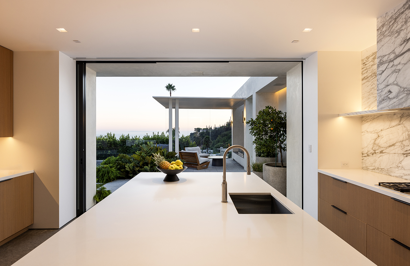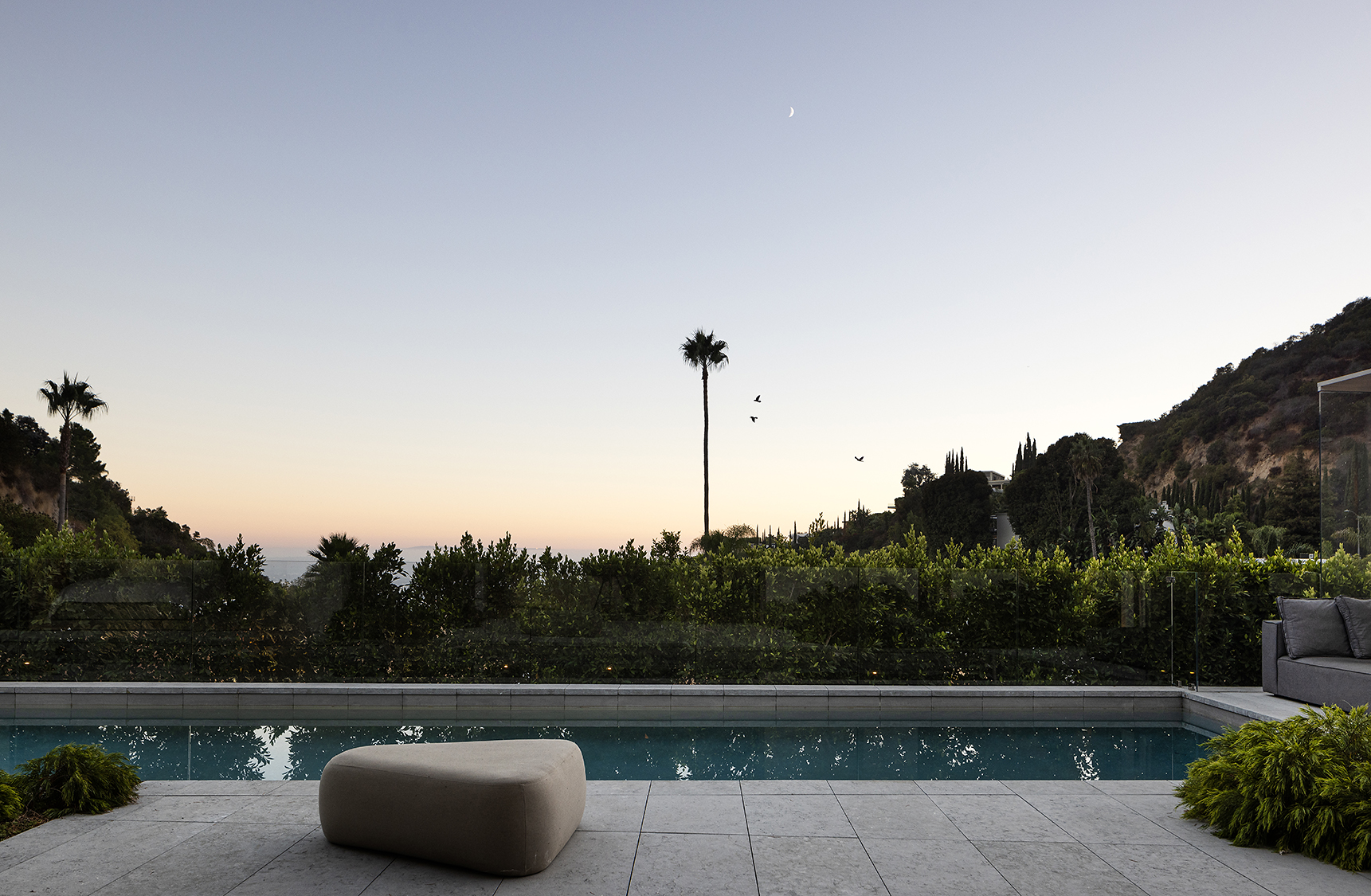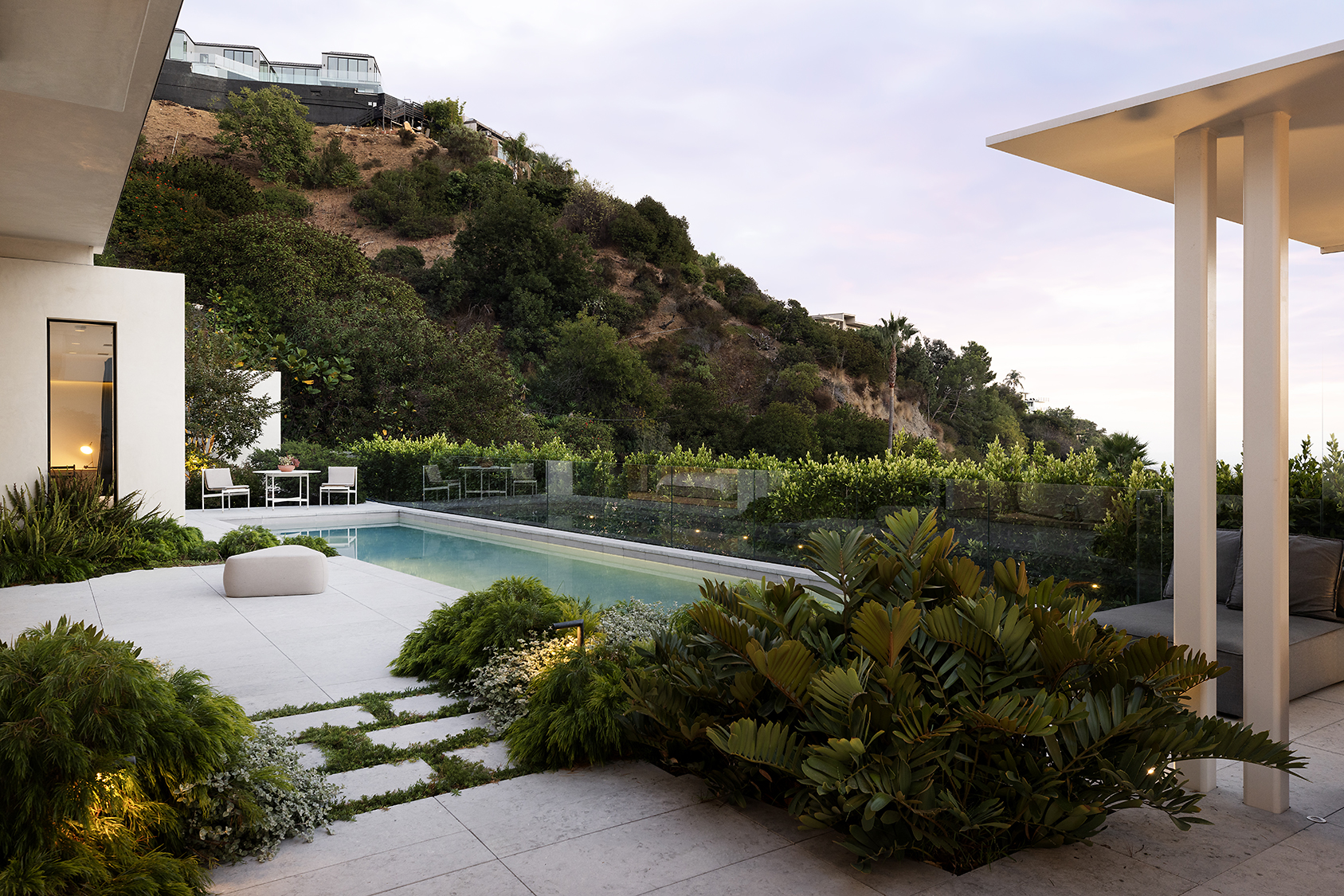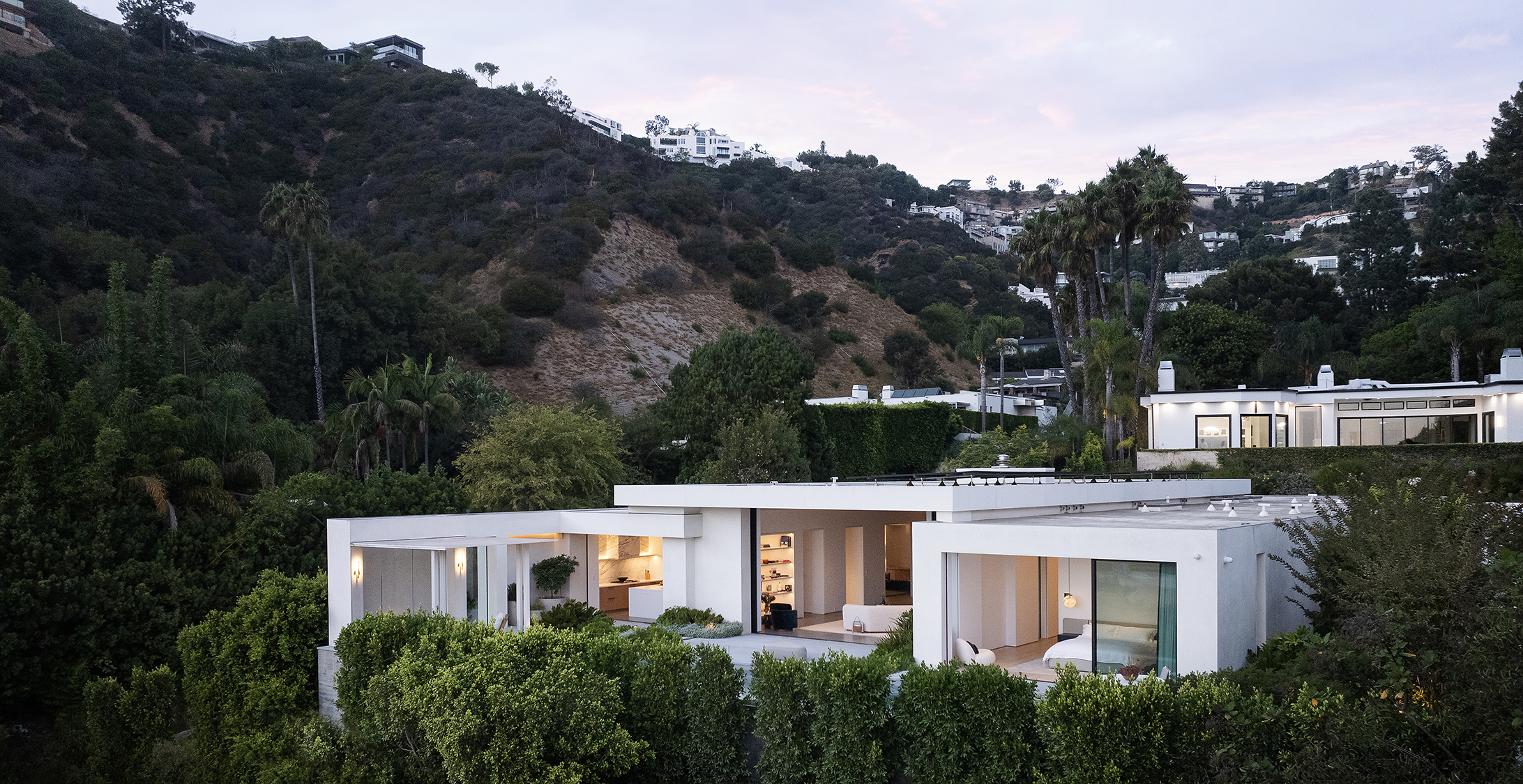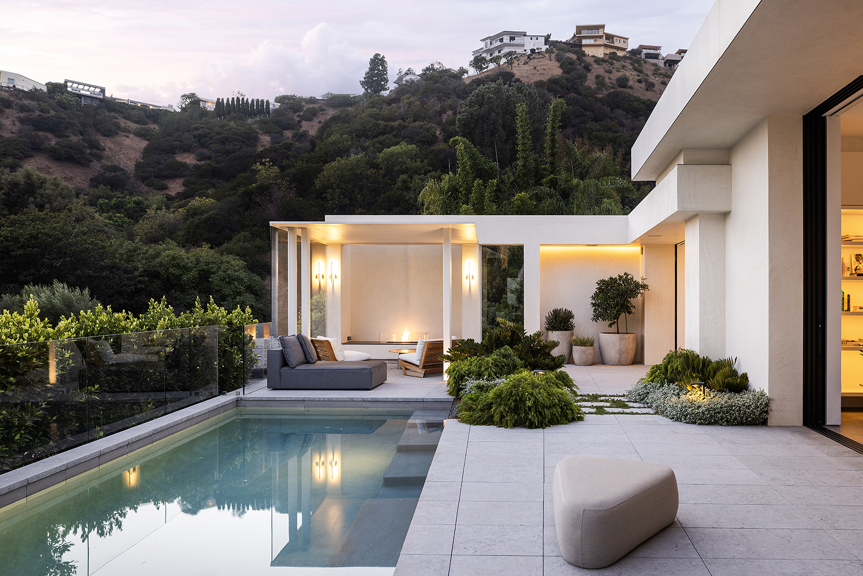 Perched above the Sunset Strip, this ultra private, newly completed, immaculately designed prime Sunset Plaza Contemporary is the epitome of luxury living. Spanning over 5,650sf of single level living, enter into your zen oasis through a secured double entry surrounded with lush greenery and landscaping completed by a world famous landscape architect. The 5 bed/6 bath estate boasts a sun-filled open floor plan, custom finishes and breathtaking city views. The perfect home for entertaining, this indoor/outdoor one-of-a-kind property showcases an expansive formal living room with walls of glass that vanish out to the sparkling infinity edge pool overlooking the city. A dramatic double sided, dual Aegean Limestone encased fireplace divides the formal living room and dining room. The open family room lends itself to comfort and relaxation doubling as a movie theater and breakfast room. Enter into your state-of-the art chef's kitchen with high end appliances, large center island, striking marble backsplash and ample cabinetry with floor to ceiling doors opening to the backyard with stunning and intimate glass cabana with fireplace perfect for lounging or dining al fresco. The opulent owner's suite overlooks the cityscape and canyon views with a large soaking tub, dual vanities, oversized shower and custom built walk-in closet. The four generous size en-suite guest rooms have private and direct outdoor access. Large 3 car garage. Moments away from the famed Sunset Strip, best dining and shops Los Angeles has to offer.