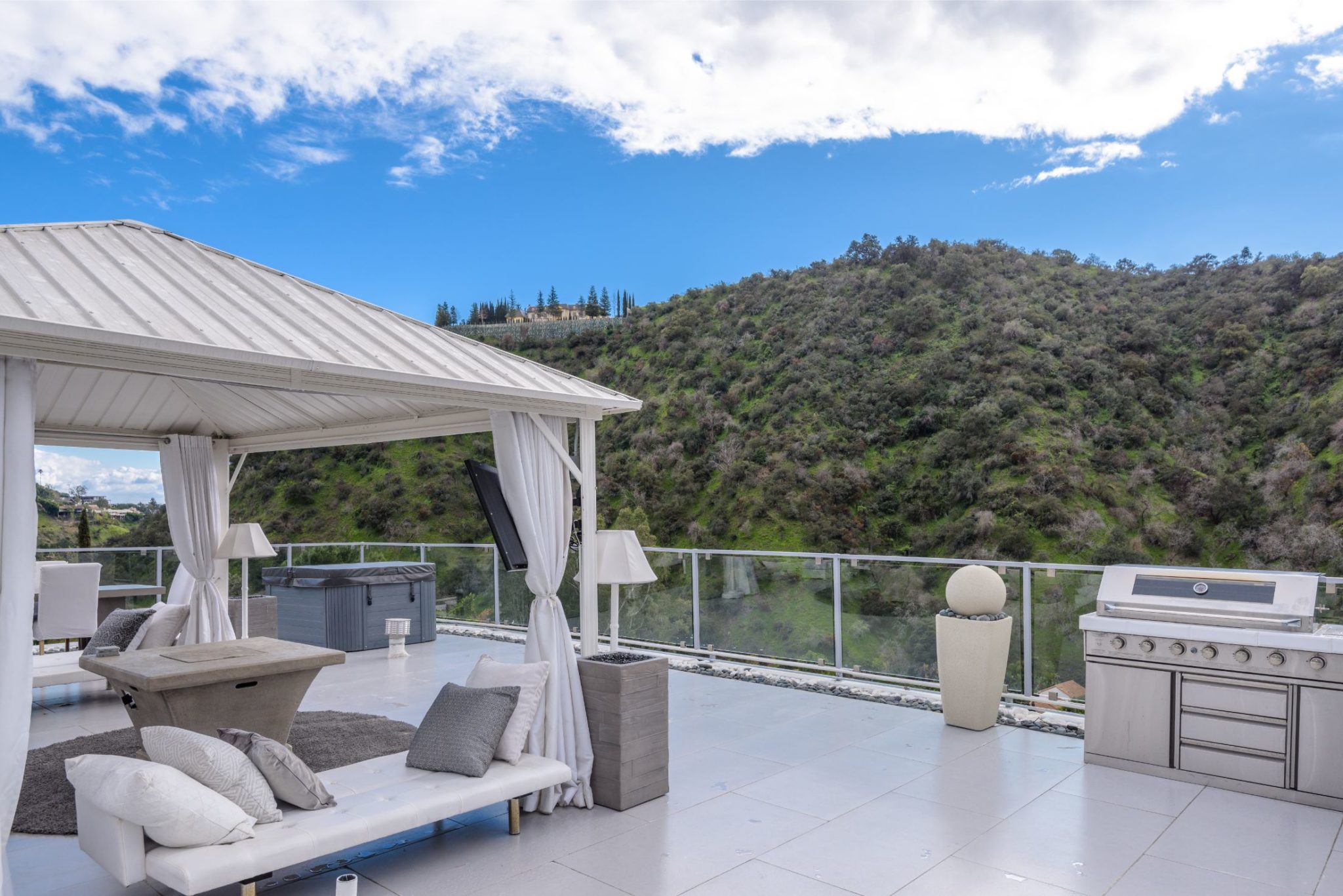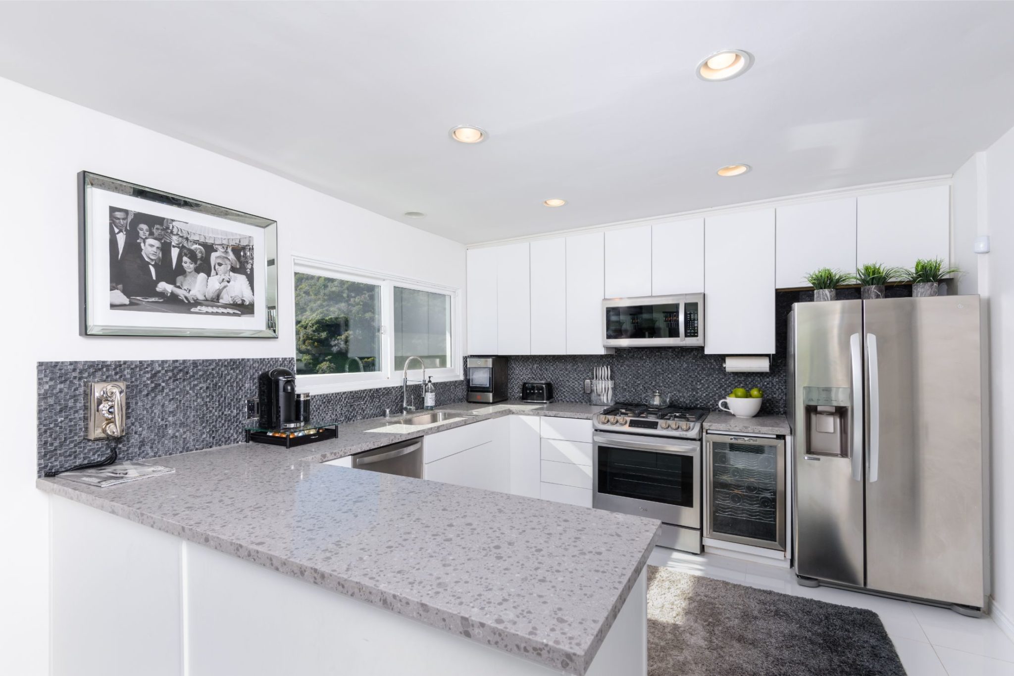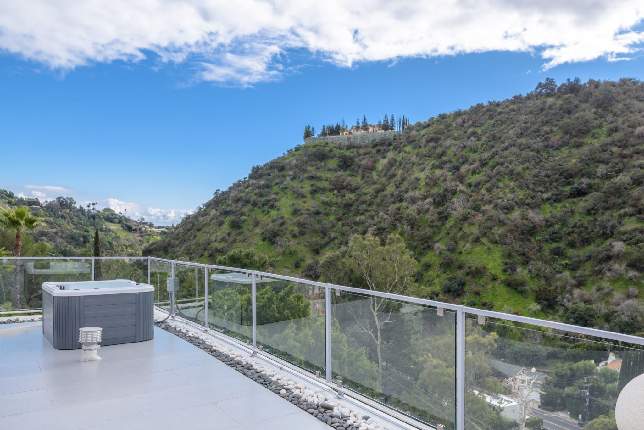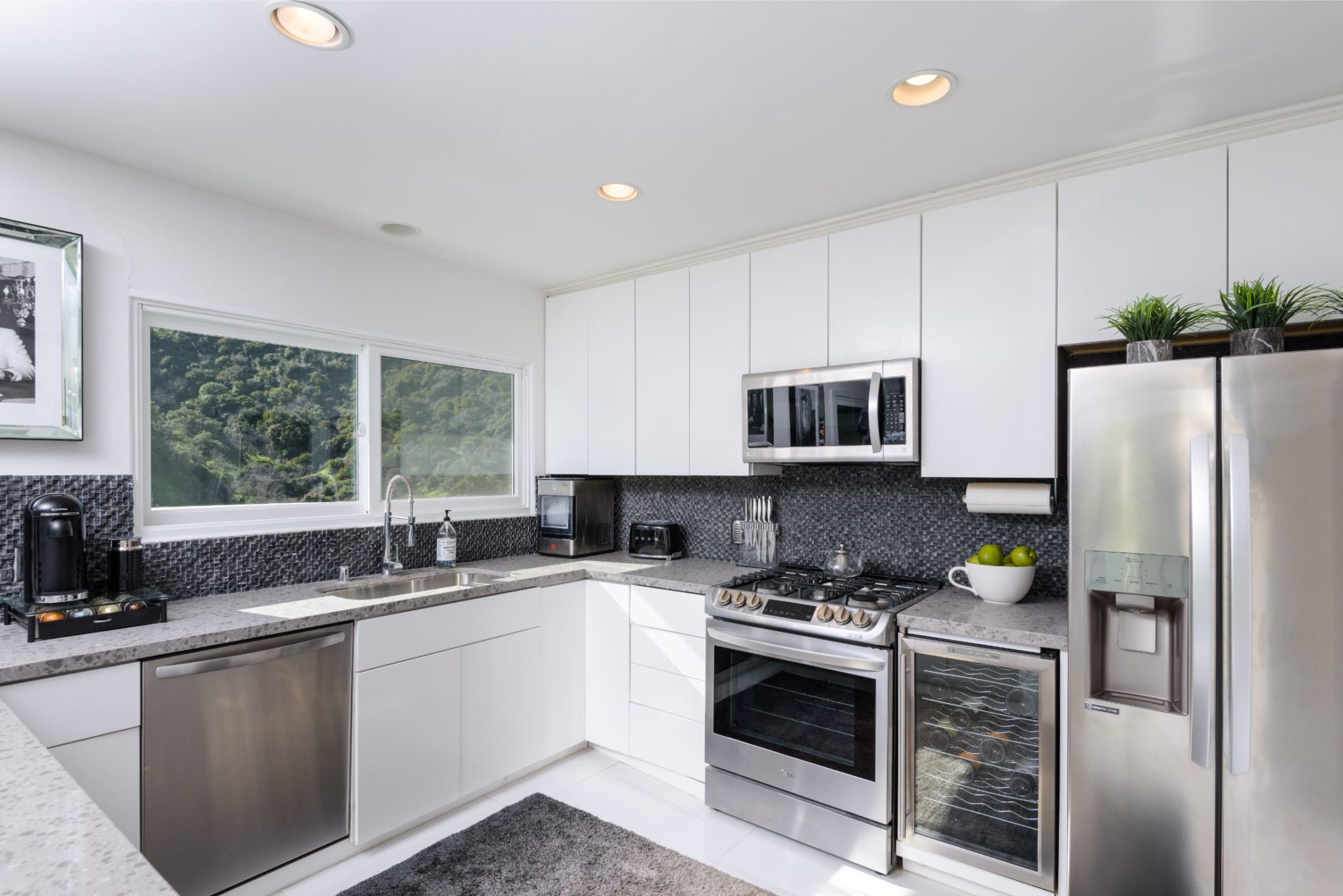 TURN KEY and fully remodeled contemporary Beverly Hills home in the exclusive 90210 zip code! This 3 bed 3 bath home is perched on a beautiful tree lined street centrally located just off Benedict Canyon; minutes from downtown Beverly Hills. Dark hardwood floors throughout complement the light and bright open floor plan which includes the kitchen, dining and living areas, large den and bonus office space. The kitchen features updated quartz counters, wine cooler, and stainless steel appliances. Views and an abundance of light from each and every room. The newly finished roof top terrace with 360 degree views of tranquil canyons is equipped with an outdoor kitchen, BBQ and fire-pit. A rare find in this upscale neighborhood.