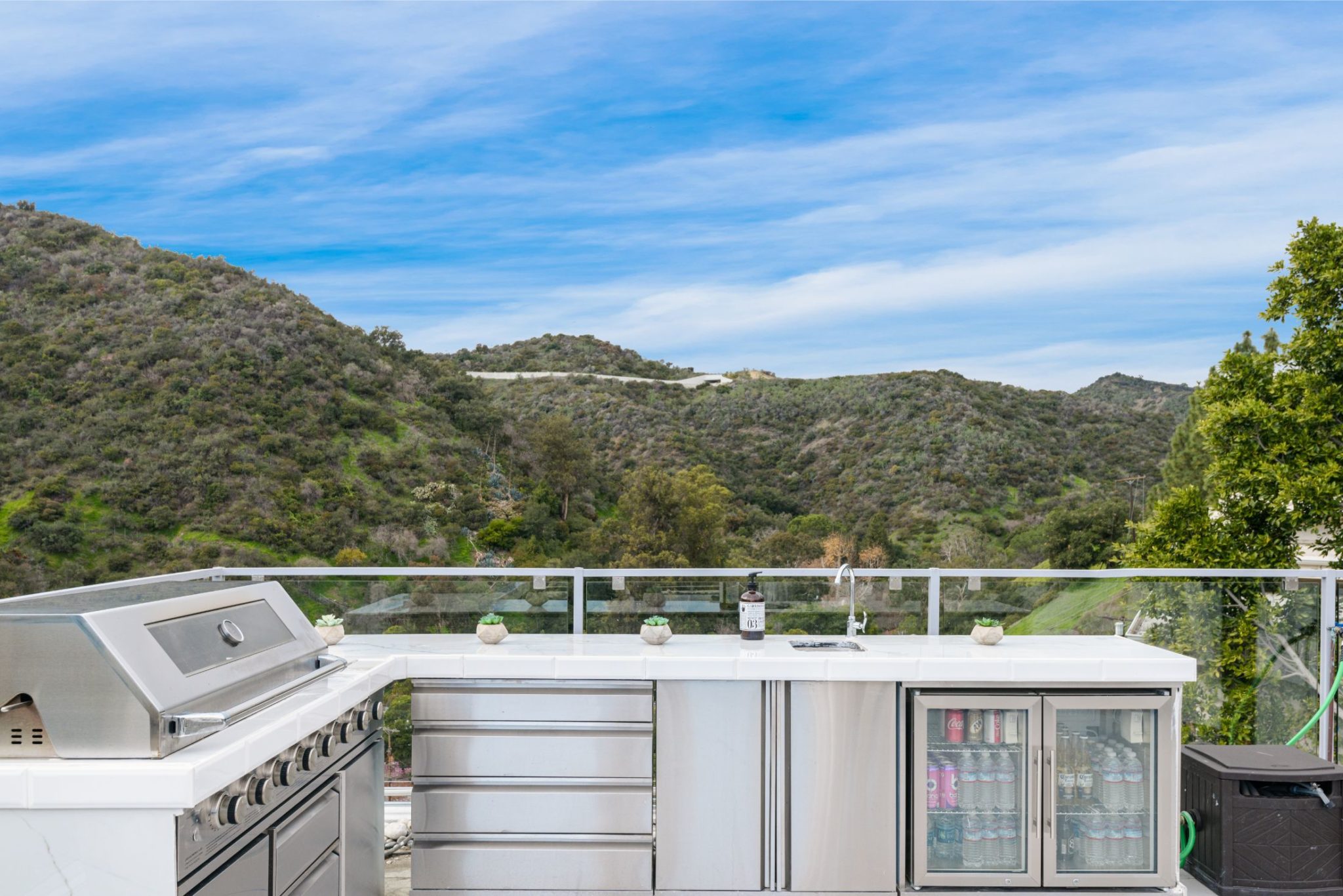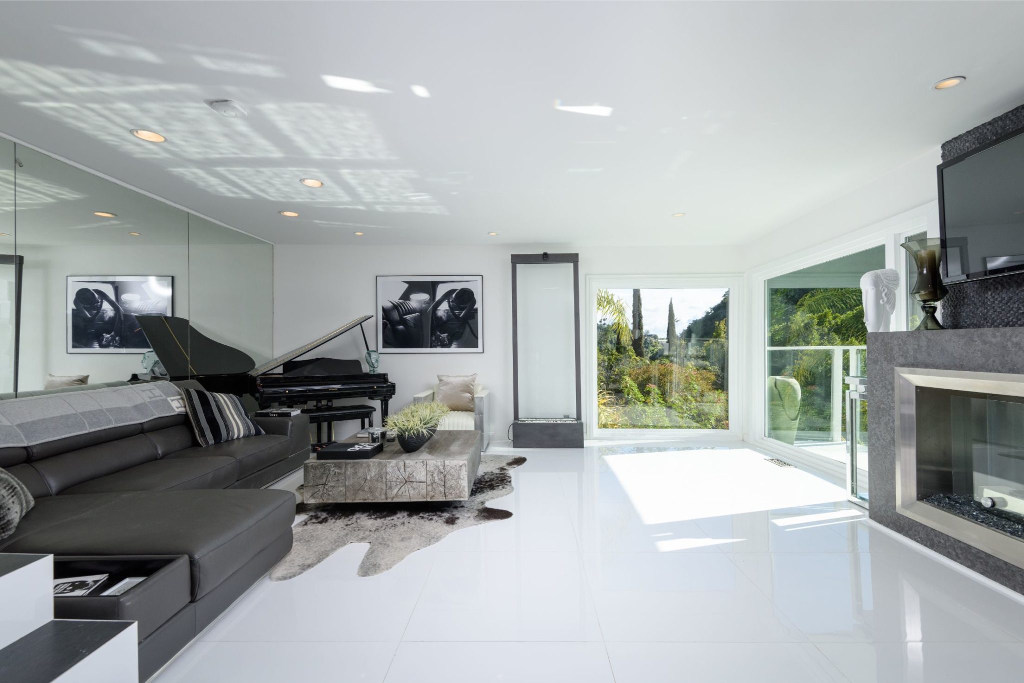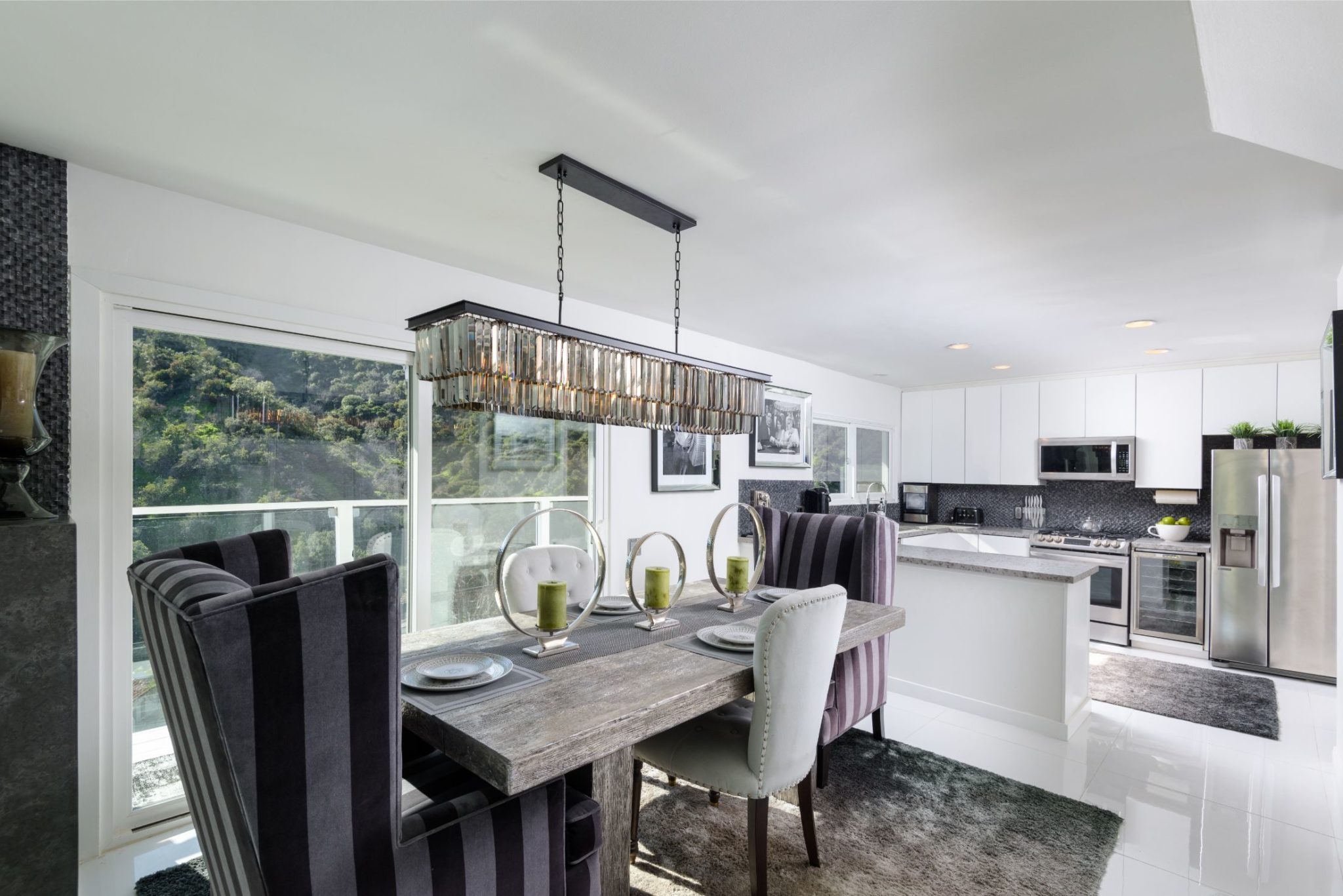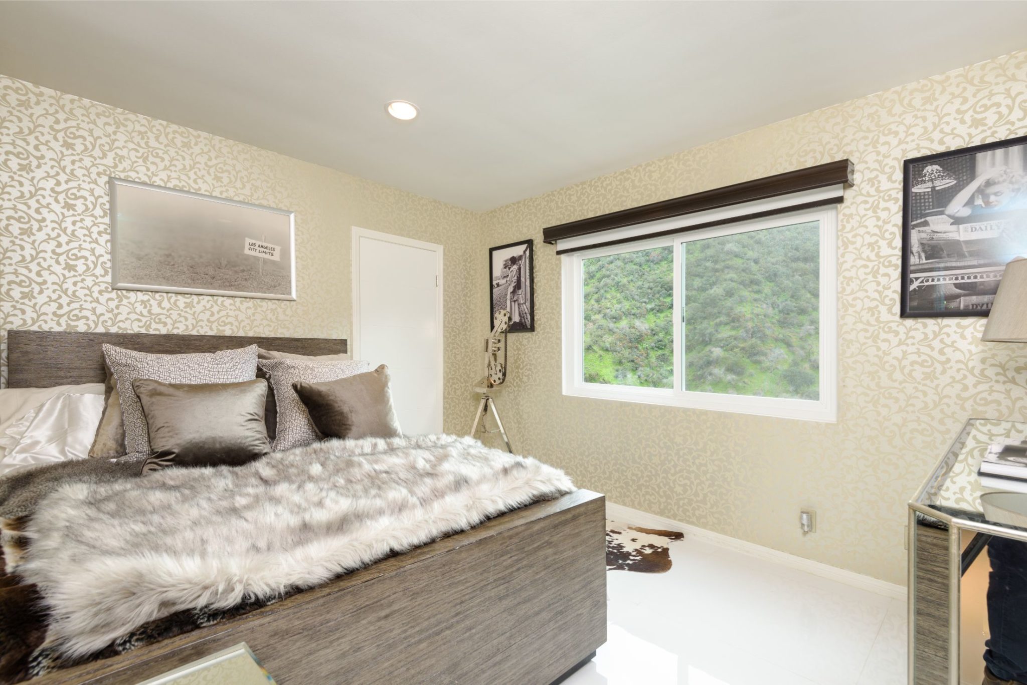 TURN KEY and fully remodeled contemporary Beverly Hills home in the exclusive 90210 zip code! This 3 bed 3 bath home is perched on a beautiful tree lined street centrally located just off Benedict Canyon; minutes from downtown Beverly Hills. Dark hardwood floors throughout complement the light and bright open floor plan which includes the kitchen, dining and living areas, large den and bonus office space. The kitchen features updated quartz counters, wine cooler, and stainless steel appliances. Views and an abundance of light from each and every room. The newly finished roof top terrace with 360 degree views of tranquil canyons is equipped with an outdoor kitchen, BBQ and fire-pit. A rare find in this upscale neighborhood.