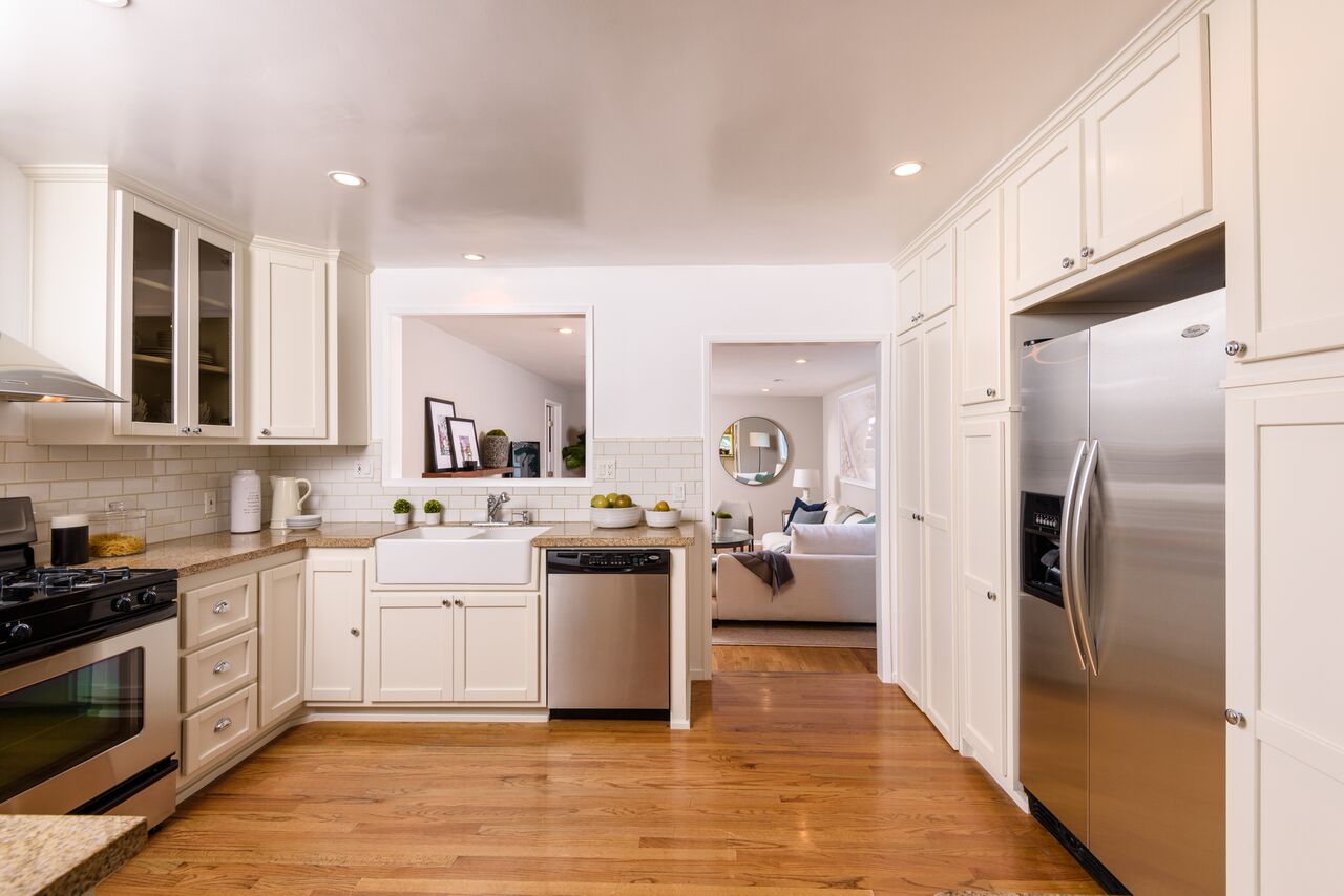 Gorgeous rejuvenated California bungalow featuring 3 bedrooms and 2 bathrooms. This white picket fenced, the gated home boasts timeless charm, extensive windows creating abundant natural light, gleaming hardwood floors, recessed lighting and top of the line designer finishes. Open and expansive floor plan includes light-filled dining and living room with Bachelder-style tiled fireplace ideal for entertaining, which leads to gourmet kitchen with custom-built cabinets, granite counter tops, farmhouse sink, stainless steel appliances and breakfast bar. Large family room leads to private landscaped backyard with mature citrus trees and new redwood deck. Spacious master bedroom with dual closets overlooks the backyard and connects to large master bath with subway tiles and period cabinetry. Home also features two generous sized and bright guest rooms, converted garage with tons of storage, 3+ car driveway. Just minutes to restaurants, markets, and beautiful Runyon Canyon.