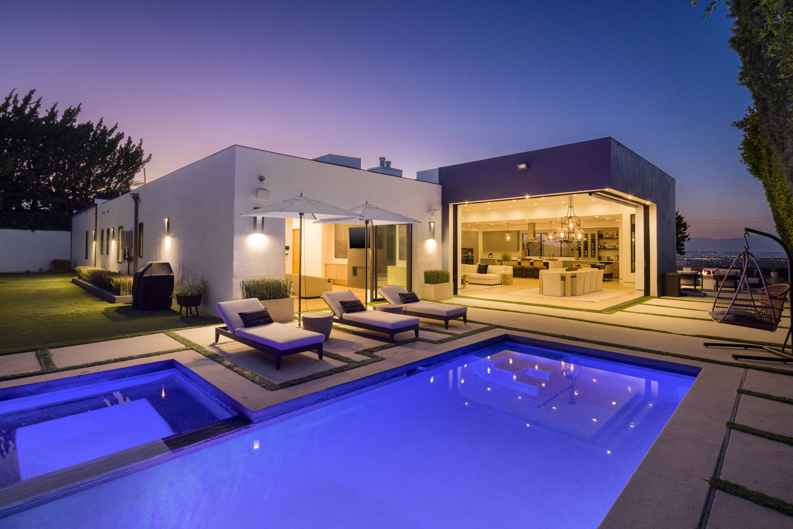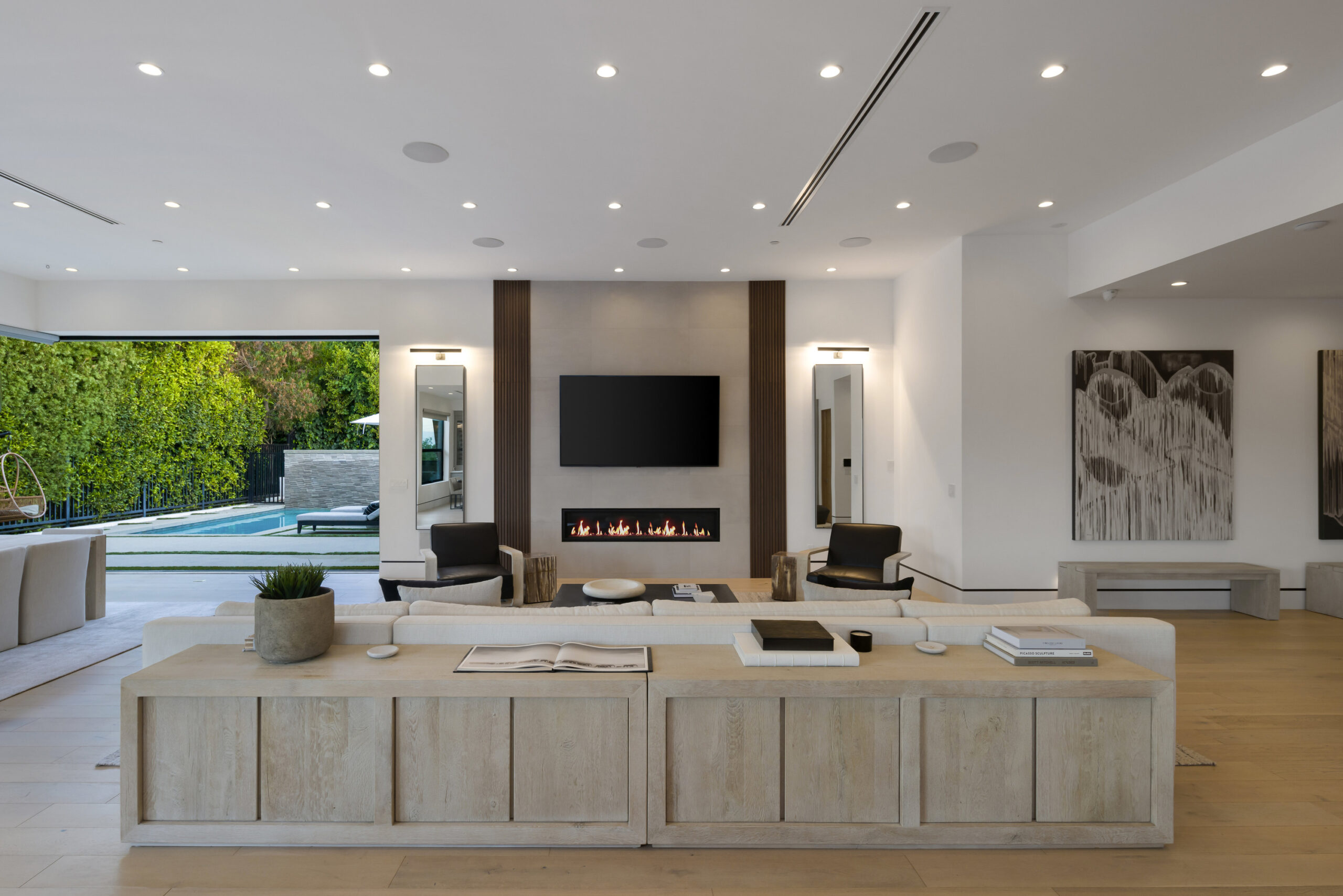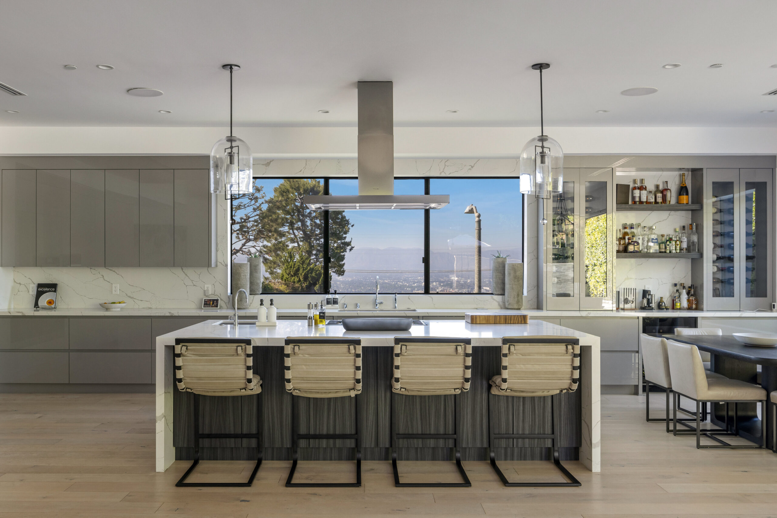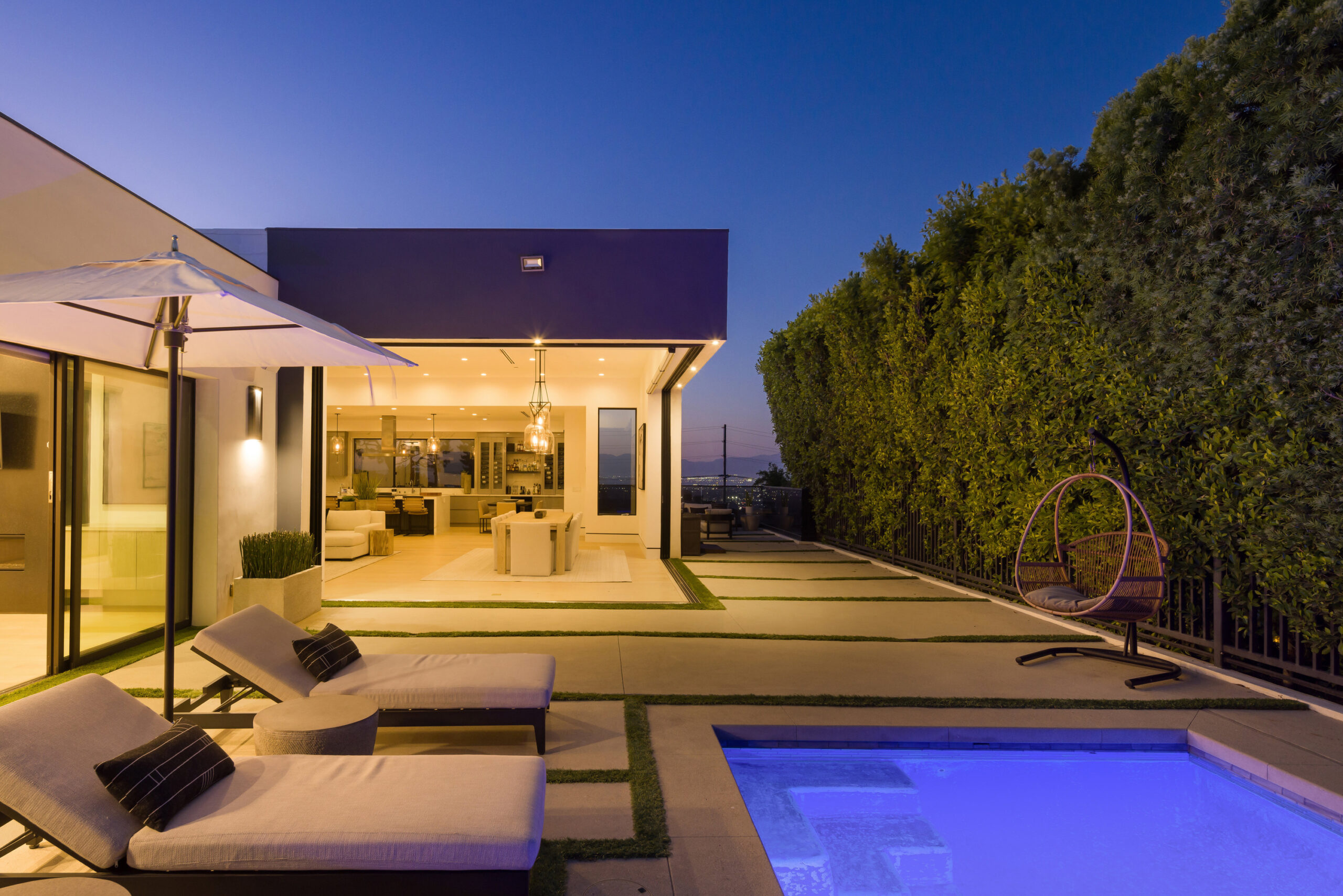 Welcome to this exquisite single-level modern residence in the prestigious Bel Air Skycrest Community, with included security patrol guards. Upon entering, you are greeted by an expansive foyer with soaring ceilings and abundant natural light, creating a gallery-like ambiance perfect for displaying your art collection. The heart of this home is its open-layout featuring a gourmet kitchen, with a built-in range, an oversized island, and a spacious walk-in pantry. The adjoining family room and dining area seamlessly blend together, making it an ideal space for family gatherings and dinner parties. Fleetwood sliding doors disappear into the wall, merging indoor elegance with outdoor splendor. Step outside to a private oasis where a dreamy pool, spa, and waterfall water feature await. An outdoor firepit offers a cozy spot to enjoy the breathtaking City lights that illuminate the twilight hours. The single-level floor plan ensures a sense of spaciousness, felt in every corner of this residence. The Primary suite is a serene retreat with a walk-in closet, dual vanity bathroom, and direct access to the outdoor spa. Three generous guest suites provide ample space and comfort for family and visitors alike. Homes of this caliber and quality are a rare find in this coveted community. Experience luxury living at its finest!
