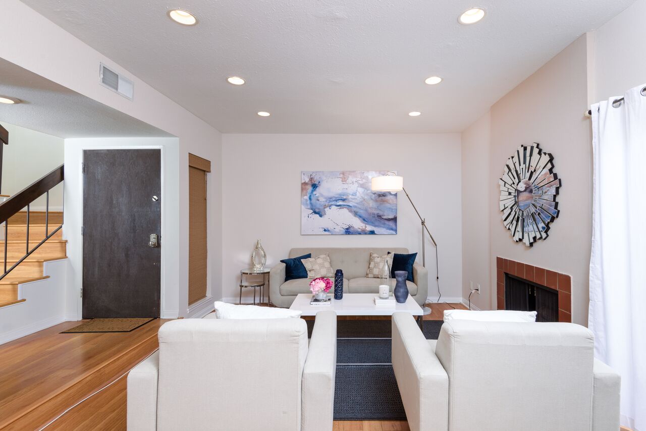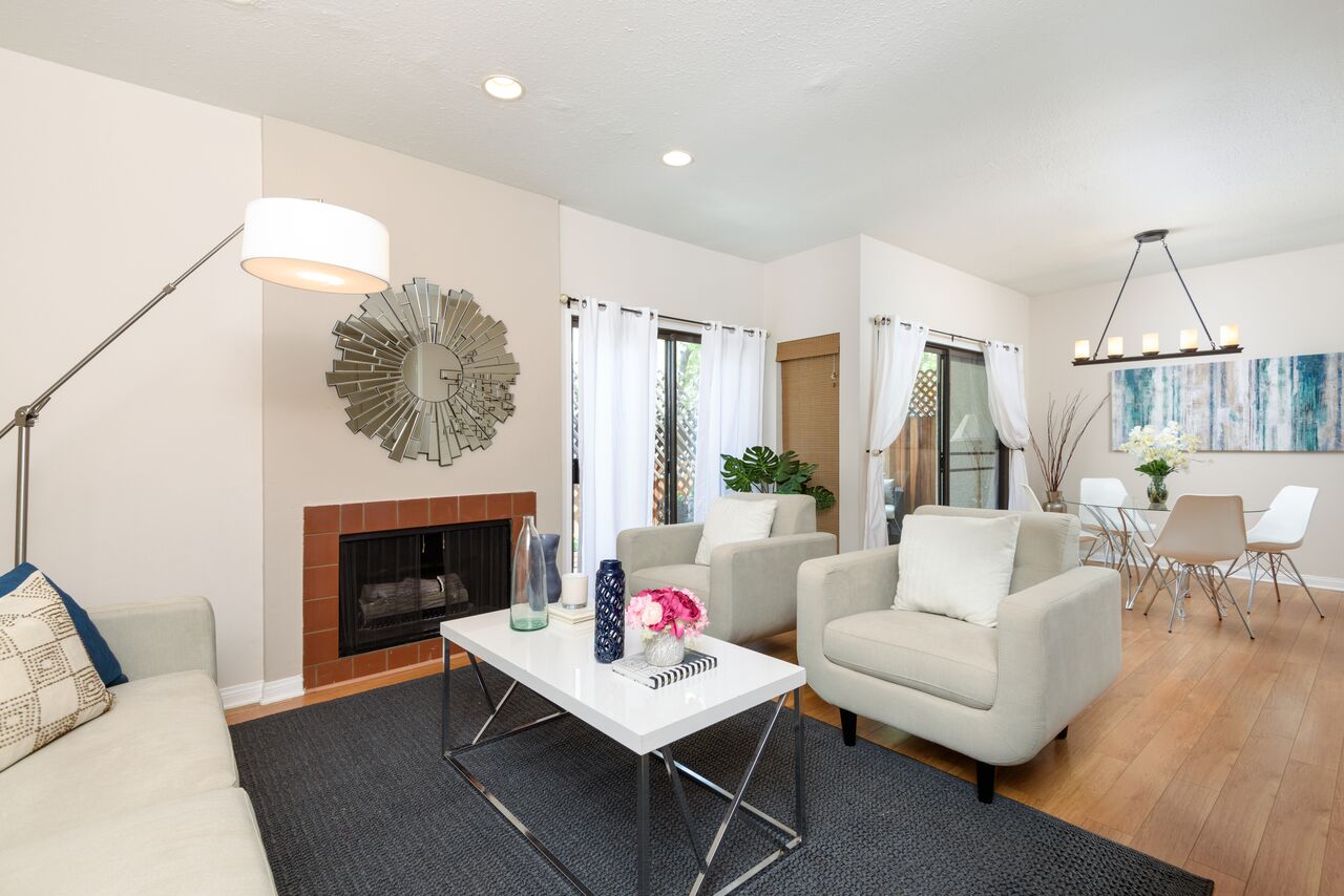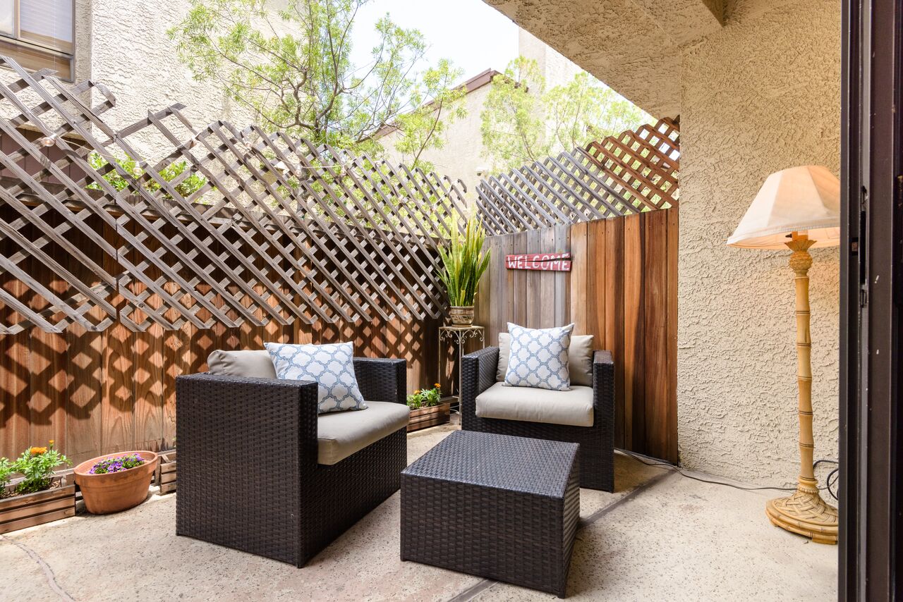 Turnkey and charming 2 bed / 2.5 bath townhouse located on a beautiful and quiet tree lined street in one of the hottest areas in Westwood. The first floor features a newly updated kitchen, open and spacious living/dining room floor plan, hardwood floors, fireplace, side by side laundry, powder room and sliding glass doors which lead you to private and secluded patio; perfect for entertaining, BBQ's and flower beds. Head upstairs to the master suite with vaulted ceilings, walk-in closet, en suite bathroom and serene private balcony. The sizable second bedroom also features an en suite bath and walk-in closet. The HOA is $475mo and includes earthquake insurance and hot/cold water. Also included are 2 secure parking spaces and additional storage. This is a great opportunity to own in a top-rated school district, walkable to parks, restaurants and shopping.