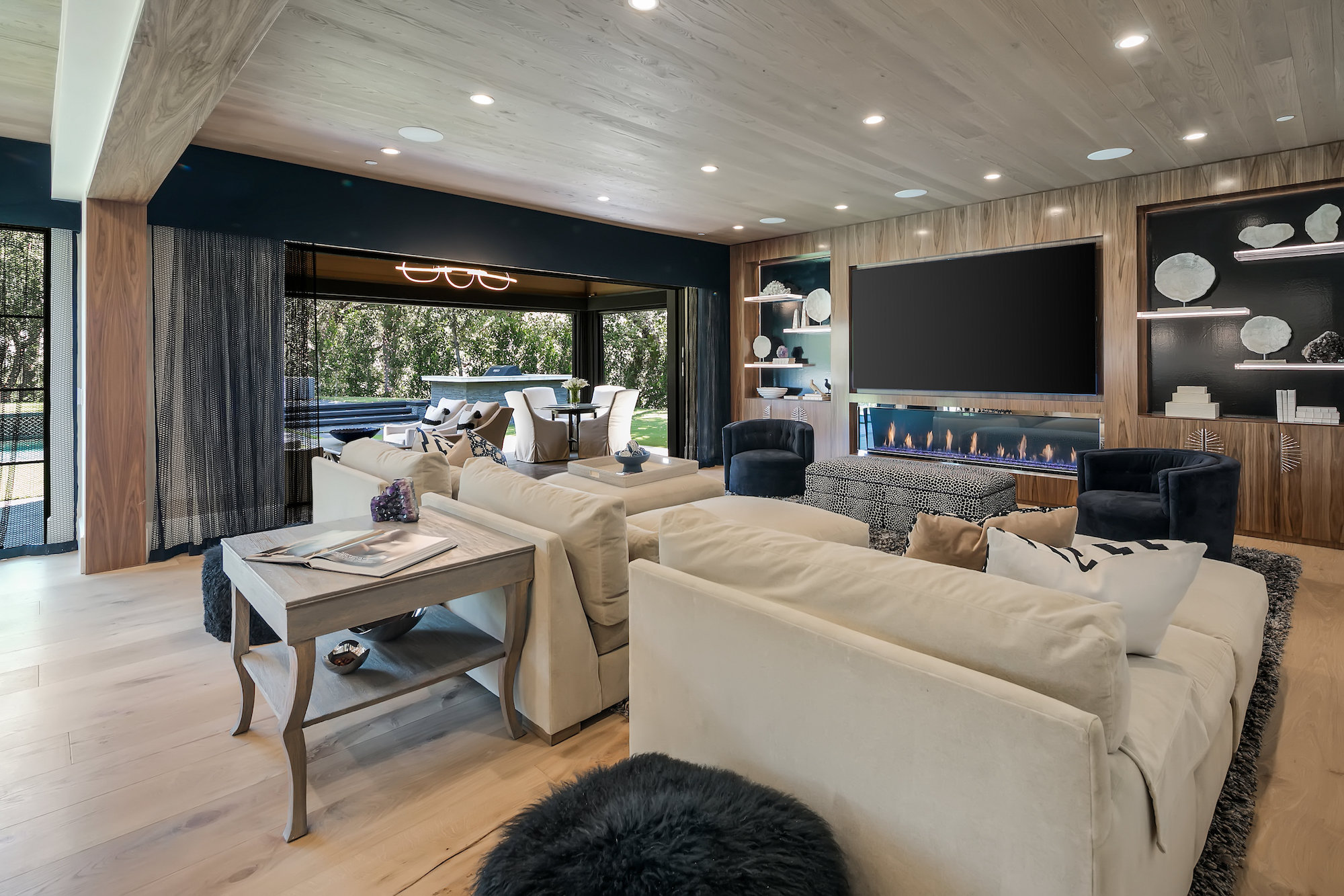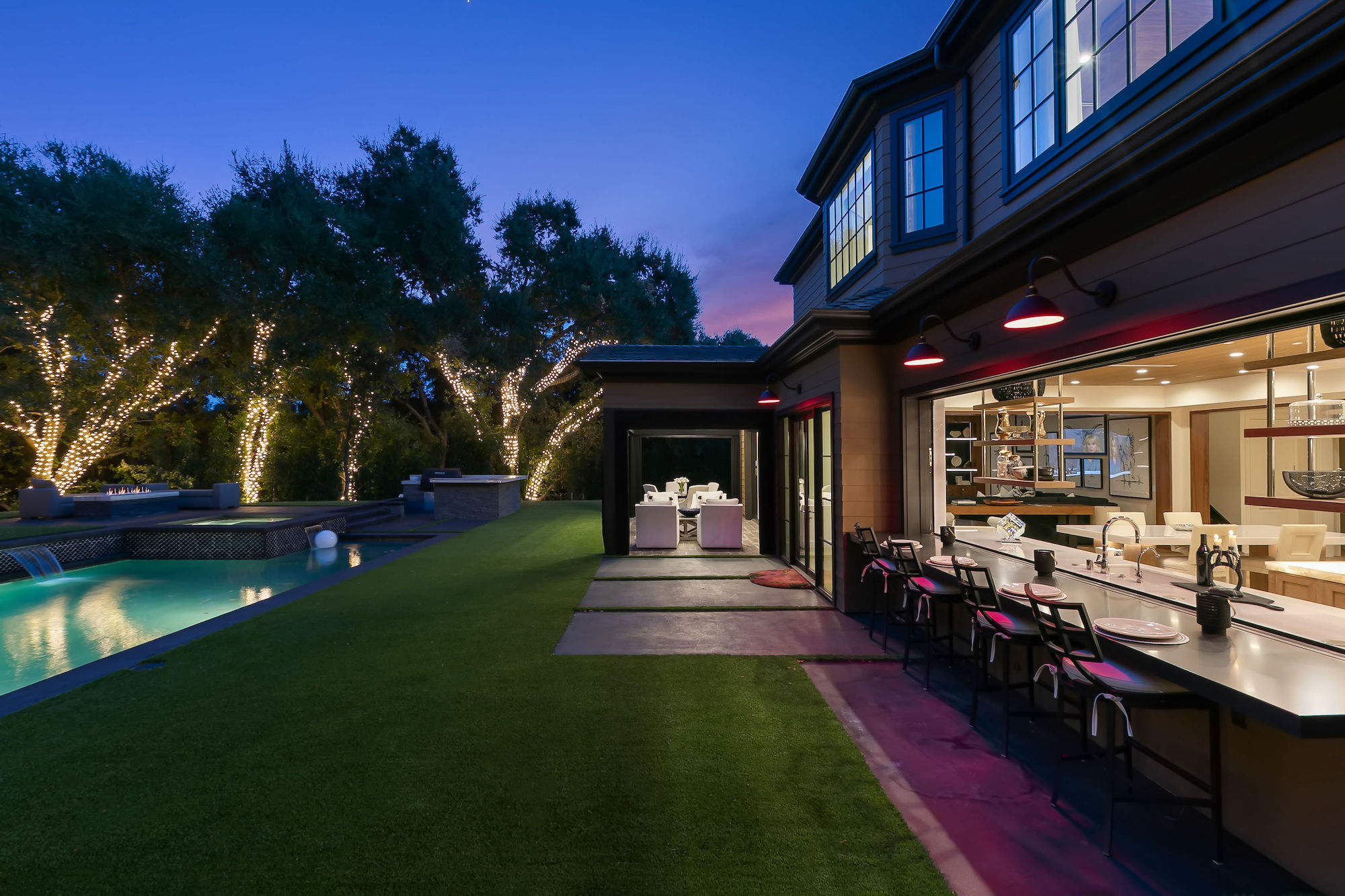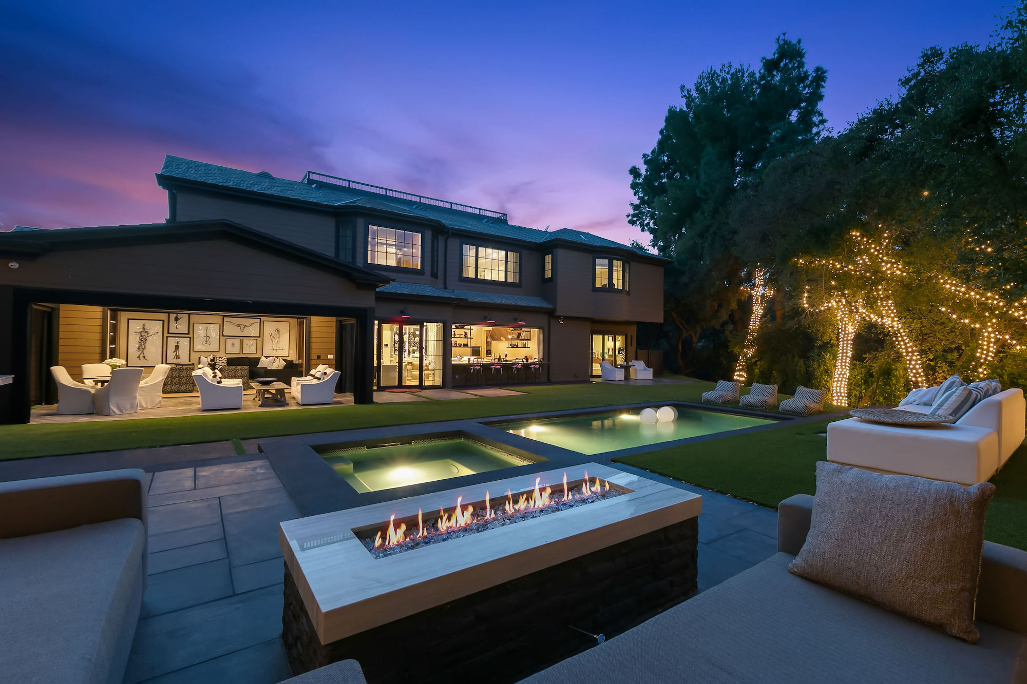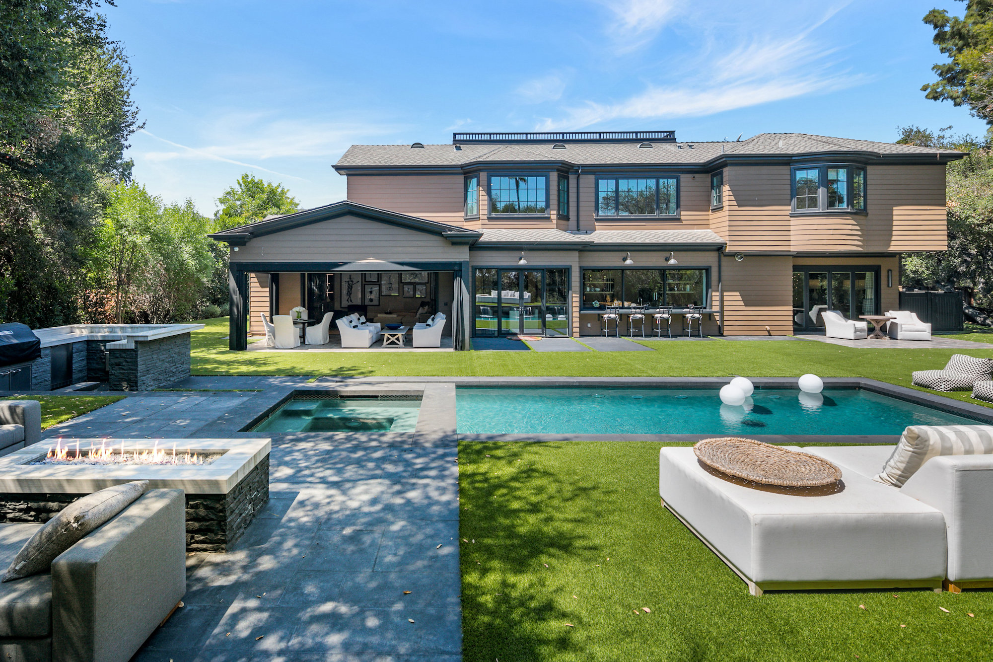 Set behind gates this bespoke home provides ample privacy and exclusivity. Boasting ~9,000 square feet of unparalleled luxury and exquisite finishes, this home has been completely redone with every first-class amenity imaginable. Custom built with immaculate design, the open concept home features 6 bedrooms, 8 bathrooms, a dining room, multiple living rooms, lounge, bar, movie theatre, and butler's pantry. The luminous kitchen is equipped with top-of-the-line appliances, beautiful cabinetry, a large island topped with spectacular Geo White Quarts stone that has under lighting, and a motorized window that opens to the backyard. From the kitchen, there is a seamless flow into the great room with a custom floor-to-ceiling entertainment wall and motorized glass doors that vanish allowing flawless indoor/outdoor living. On the second floor, double doors open revealing the Master Suite complete with a sitting room, 2 fireplaces, 2 spacious walk-in closets, and 2 separate bathrooms with heated floors and a steam shower. Furthermore, the loggia has heated floors. The exceptional outdoor space hosts a tranquil pool with a water feature along the back wall edge, a spa with an additional waterfall feature, an outdoor kitchen, and a dining area. The home is secured and operated by an Elan Smart System personalized to your lifestyle providing an inimitable, convenient living experience.