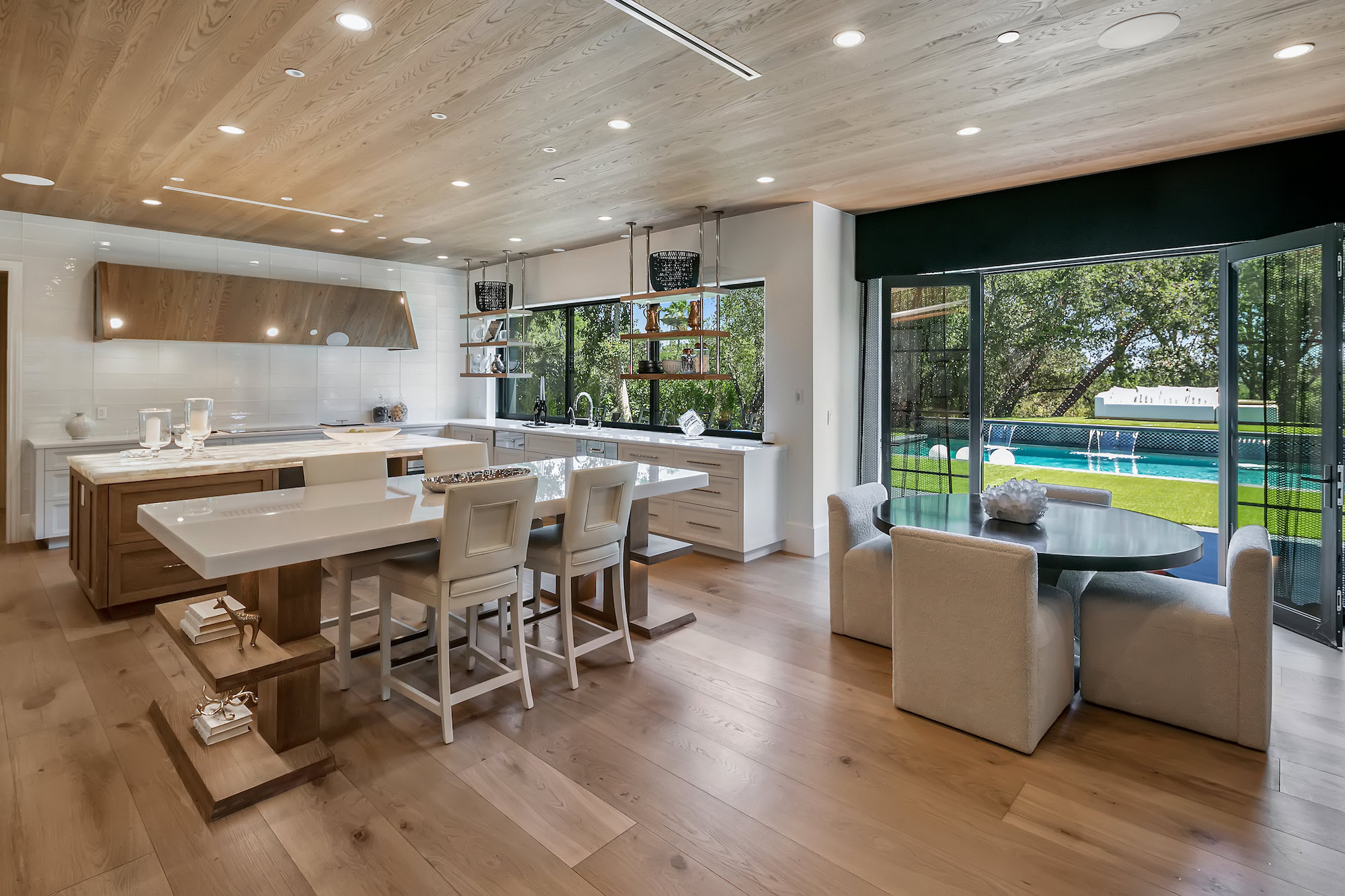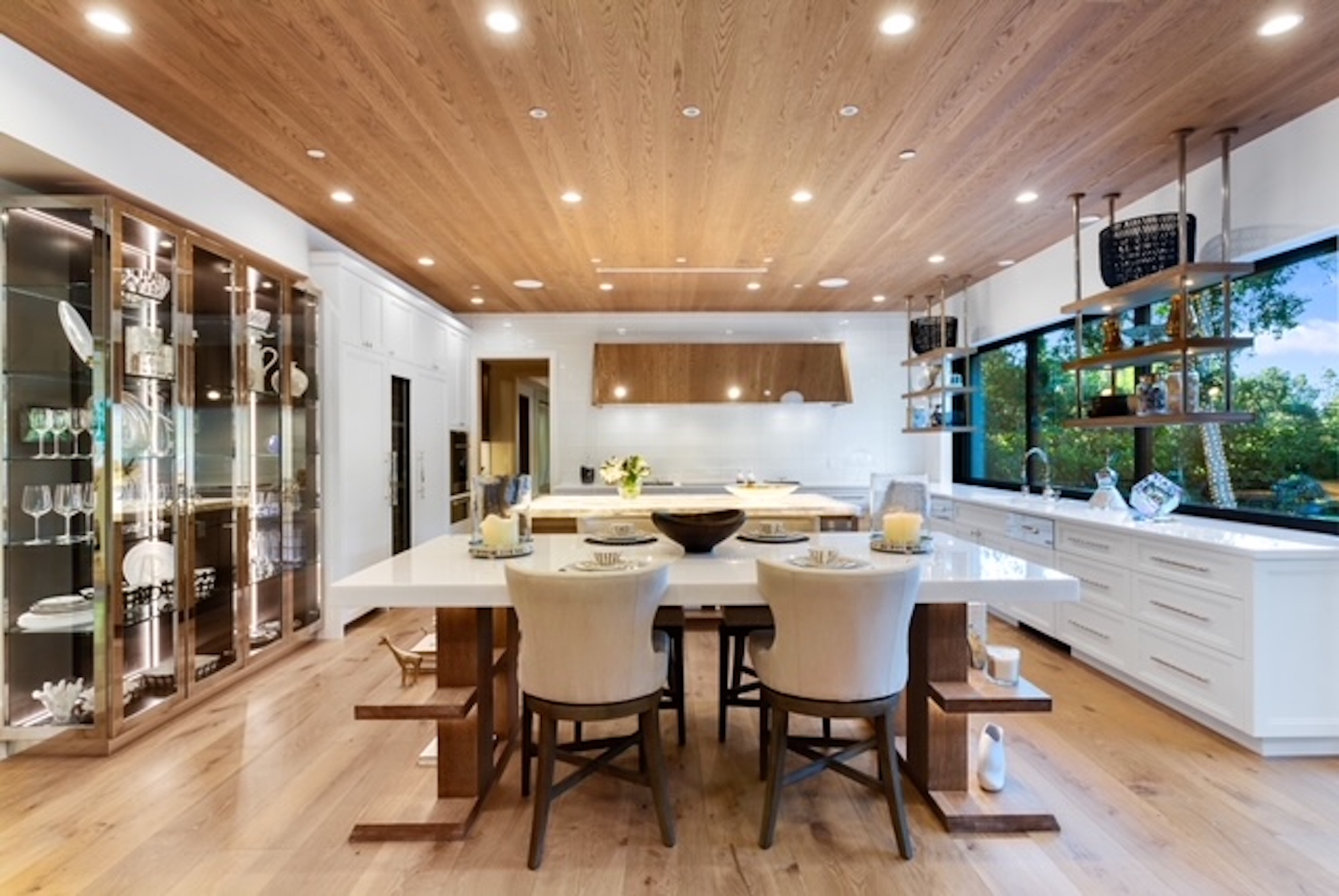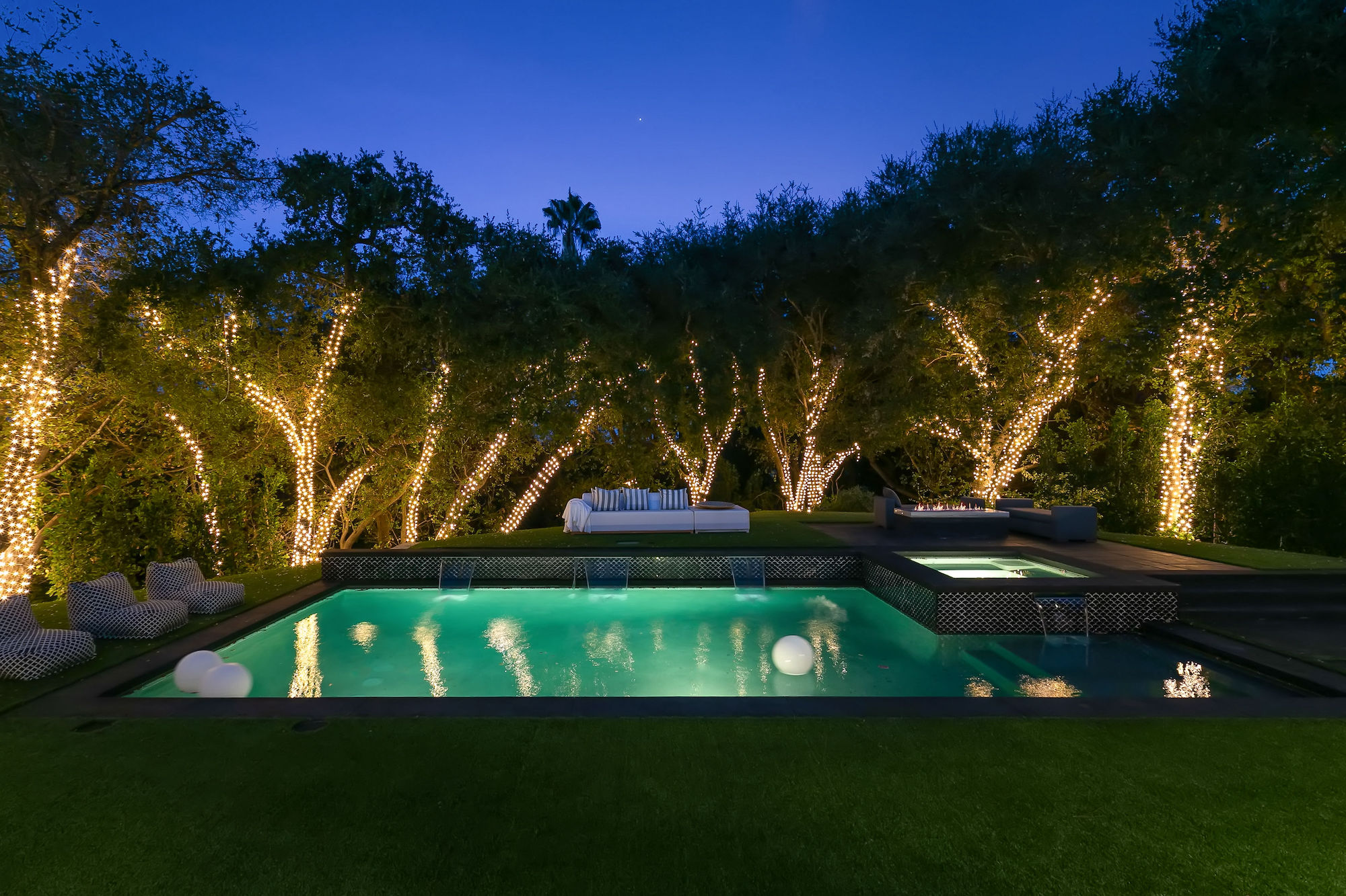 Set behind gates this bespoke home provides ample privacy and exclusivity. Boasting ~9,000 square feet of unparalleled luxury and exquisite finishes, this home has been completely redone with every first-class amenity imaginable. Custom built with immaculate design, the open concept home features 6 bedrooms, 8 bathrooms, a dining room, multiple living rooms, lounge, bar, movie theatre, and butler's pantry. The luminous kitchen is equipped with top-of-the-line appliances, beautiful cabinetry, a large island topped with spectacular Geo White Quarts stone that has under lighting, and a motorized window that opens to the backyard. From the kitchen, there is a seamless flow into the great room with a custom floor-to-ceiling entertainment wall and motorized glass doors that vanish allowing flawless indoor/outdoor living. On the second floor, double doors open revealing the Master Suite complete with a sitting room, 2 fireplaces, 2 spacious walk-in closets, and 2 separate bathrooms with heated floors and a steam shower. Furthermore, the loggia has heated floors. The exceptional outdoor space hosts a tranquil pool with a water feature along the back wall edge, a spa with an additional waterfall feature, an outdoor kitchen, and a dining area. The home is secured and operated by an Elan Smart System personalized to your lifestyle providing an inimitable, convenient living experience.