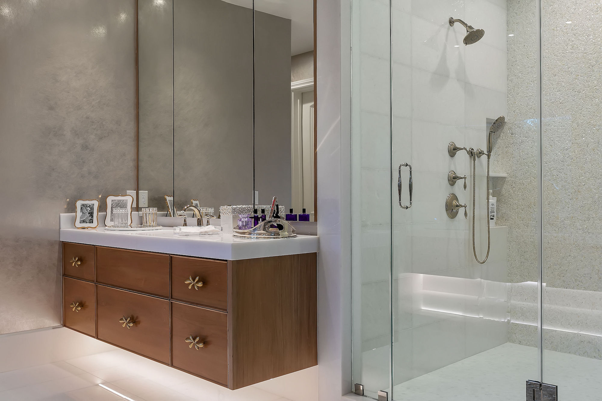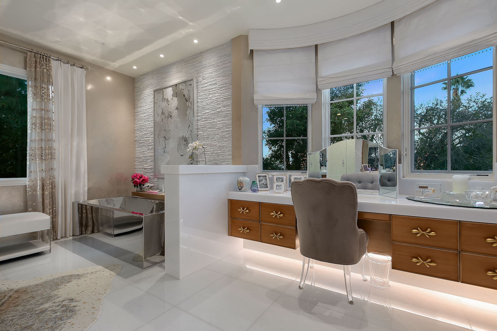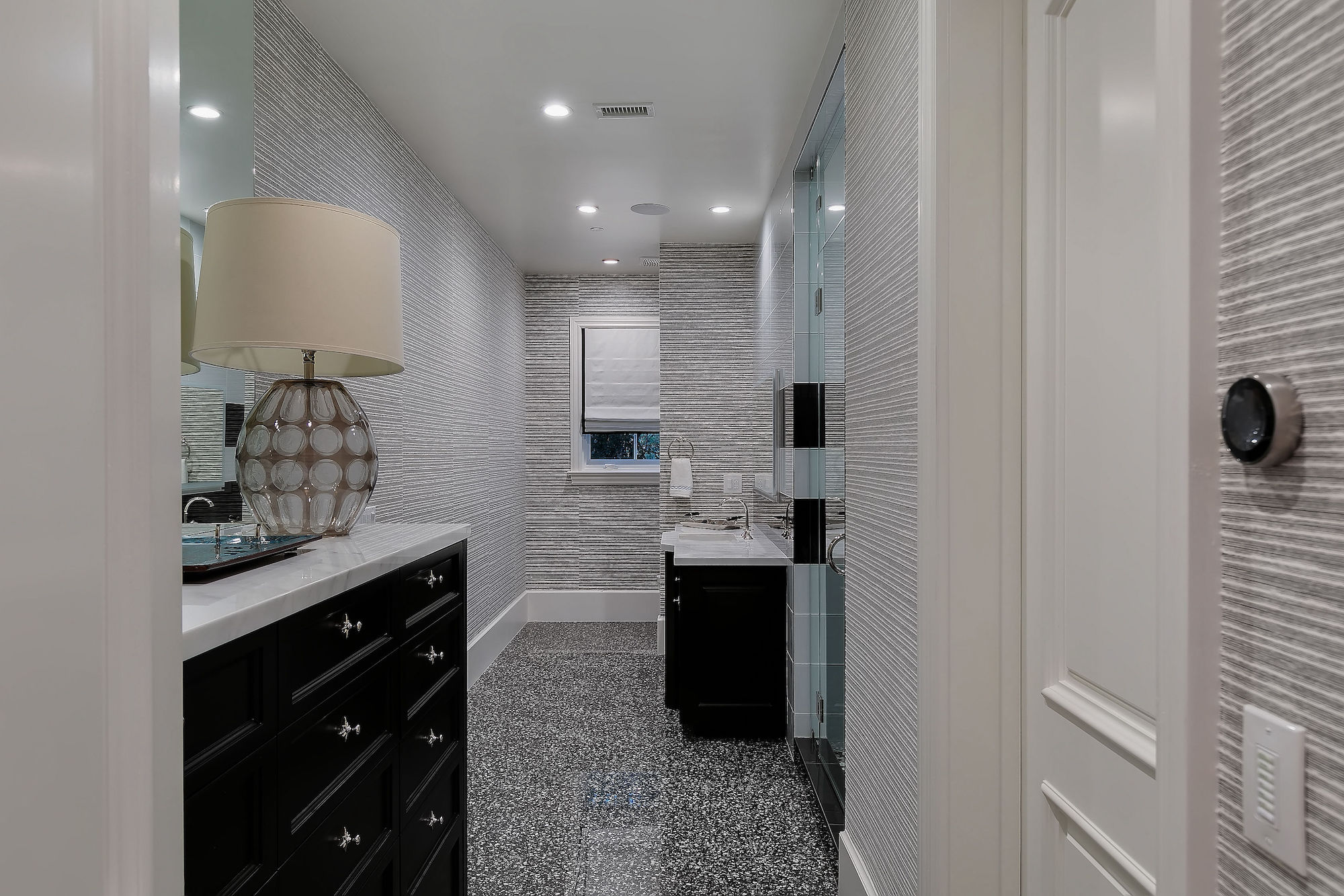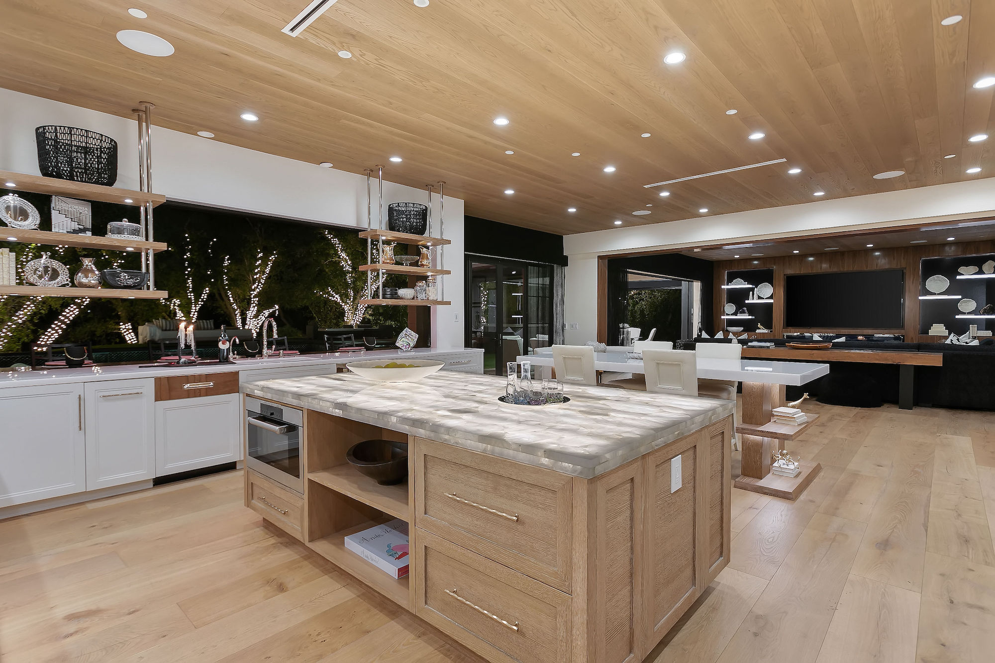 Set behind gates this bespoke home provides ample privacy and exclusivity. Boasting ~9,000 square feet of unparalleled luxury and exquisite finishes, this home has been completely redone with every first-class amenity imaginable. Custom built with immaculate design, the open concept home features 6 bedrooms, 8 bathrooms, a dining room, multiple living rooms, lounge, bar, movie theatre, and butler's pantry. The luminous kitchen is equipped with top-of-the-line appliances, beautiful cabinetry, a large island topped with spectacular Geo White Quarts stone that has under lighting, and a motorized window that opens to the backyard. From the kitchen, there is a seamless flow into the great room with a custom floor-to-ceiling entertainment wall and motorized glass doors that vanish allowing flawless indoor/outdoor living. On the second floor, double doors open revealing the Master Suite complete with a sitting room, 2 fireplaces, 2 spacious walk-in closets, and 2 separate bathrooms with heated floors and a steam shower. Furthermore, the loggia has heated floors. The exceptional outdoor space hosts a tranquil pool with a water feature along the back wall edge, a spa with an additional waterfall feature, an outdoor kitchen, and a dining area. The home is secured and operated by an Elan Smart System personalized to your lifestyle providing an inimitable, convenient living experience.