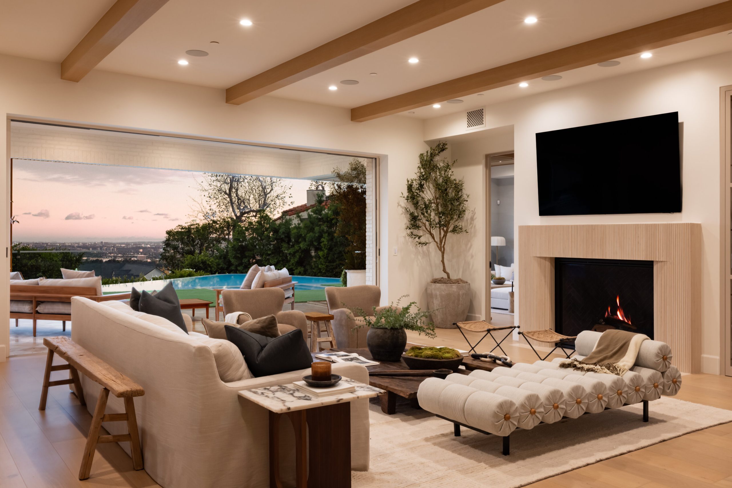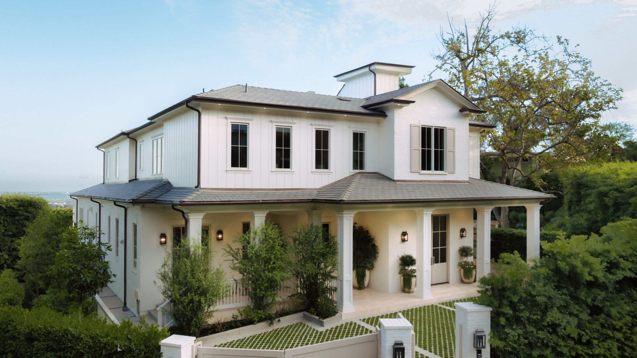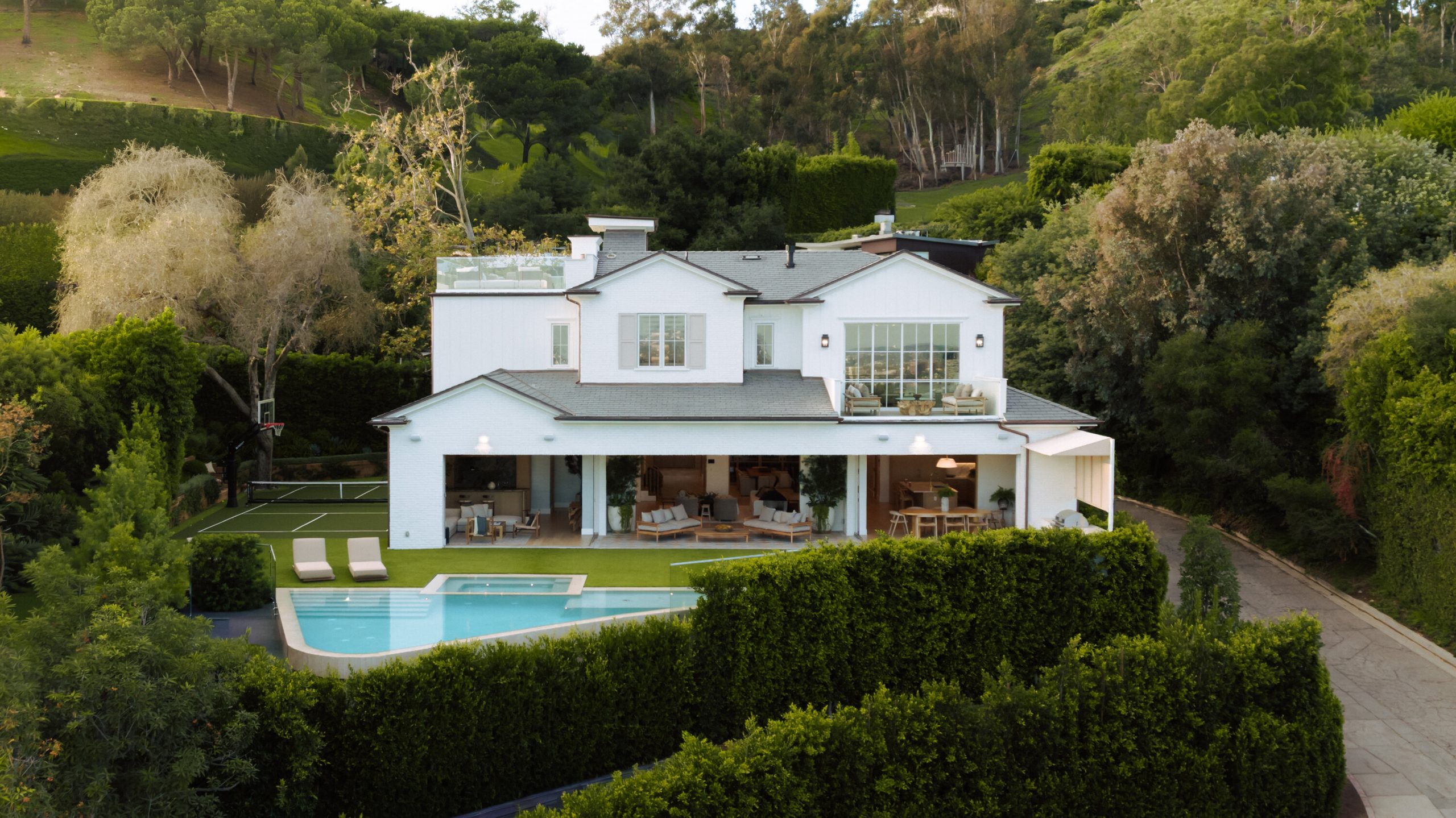 Perfectly situated on one of the most coveted streets in the Palisades Riviera, just moments from the vibrant Palisades Village and the Brentwood Country Mart, this newly completed architectural estate epitomizes modern coastal luxury. Designed and built by AMG Capital and Ortam Construction with interiors by the acclaimed Morrow & Co, this 10,300+ square-foot residence is a stunning statement of scale, proportion, and craftsmanship, commanding sweeping ocean, city, and mountain views from its elevated vantage point. Upon entry, soaring ceilings and dramatic walls of glass dissolve the boundary between indoors and out, drawing the eye to curated landscapes that envelop a resort-style pool, expansive entertaining lawn, private pickleball court, and an expansive rooftop deck with outdoor kitchen capturing panoramic 360-degree vistas. The home's architectural rhythm is immediatelight-filled, voluminous spaces unfolding effortlessly toward the outdoors, refined yet warm, and purposefully designed for both intimate living and grand-scale entertaining.Inside, elegant formal living and dining spaces are complemented by a state-of-the-art chef's kitchen, a sculptural bar and lounge ideal for hosting, two private offices, a dedicated wellness center with sauna and gym, and an impressive movie theater anchoring the home's amenity-rich environment.The expansive primary suite serves as a tranquil retreat, offering a private view terrace overlooking the ocean and city, dual boutique-style dressing rooms, and a spa-inspired bath with soaking tub and oversized shower envisioned for restorative luxury. Throughout, bespoke furnishings curated by Vesta Home in collaboration with Olive Ateliers echo the home's architectural language and may be purchased to create a truly turnkey offering.A rare 10-car garage completes this remarkable estate, providing secure, climate-controlled accommodation for a significant collection. Given the escalating land and construction costs combined with the years required to achieve this level of design, permitting, and execution this property represents extraordinary value.. It is a fully realized masterpiece, available for immediate enjoyment.