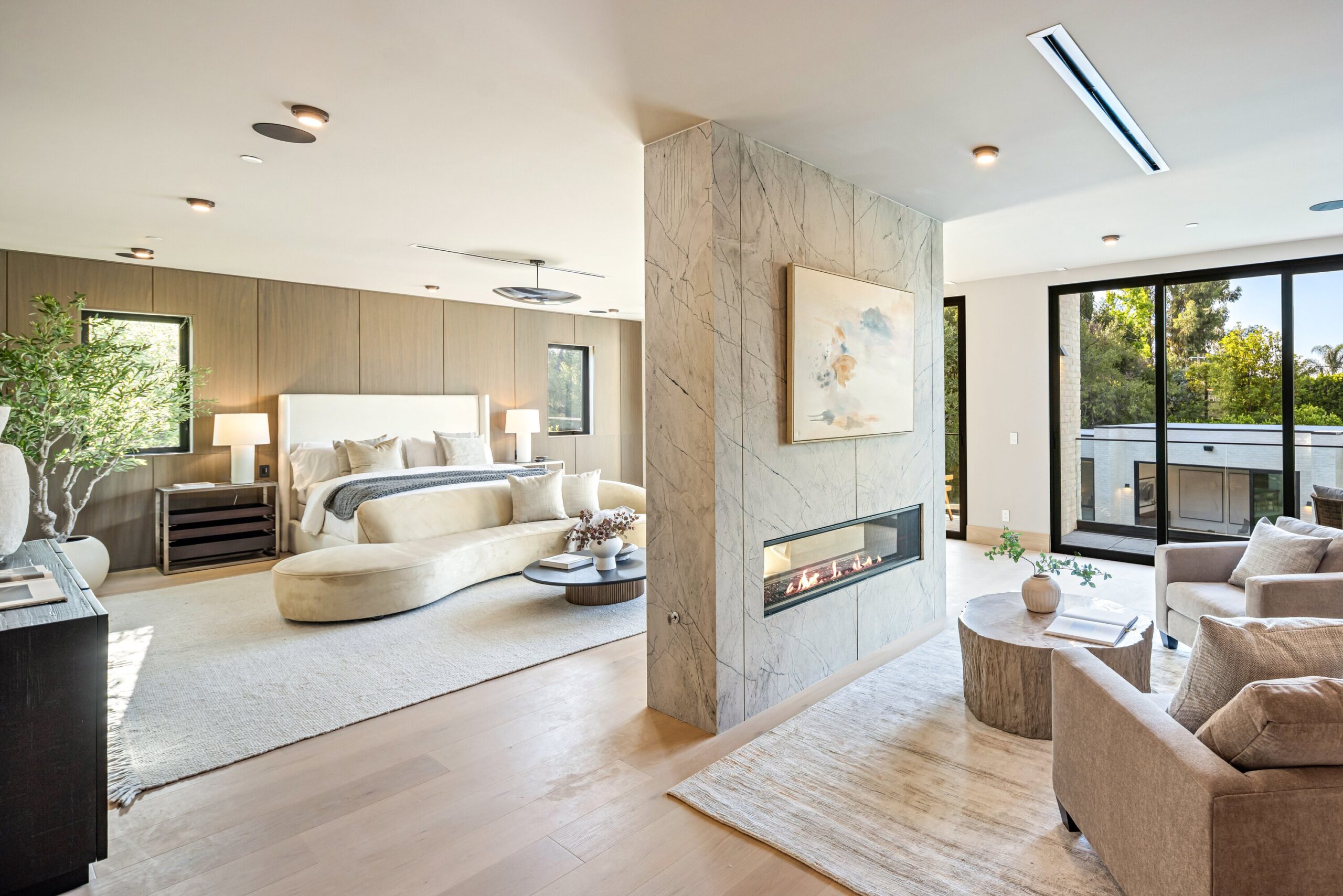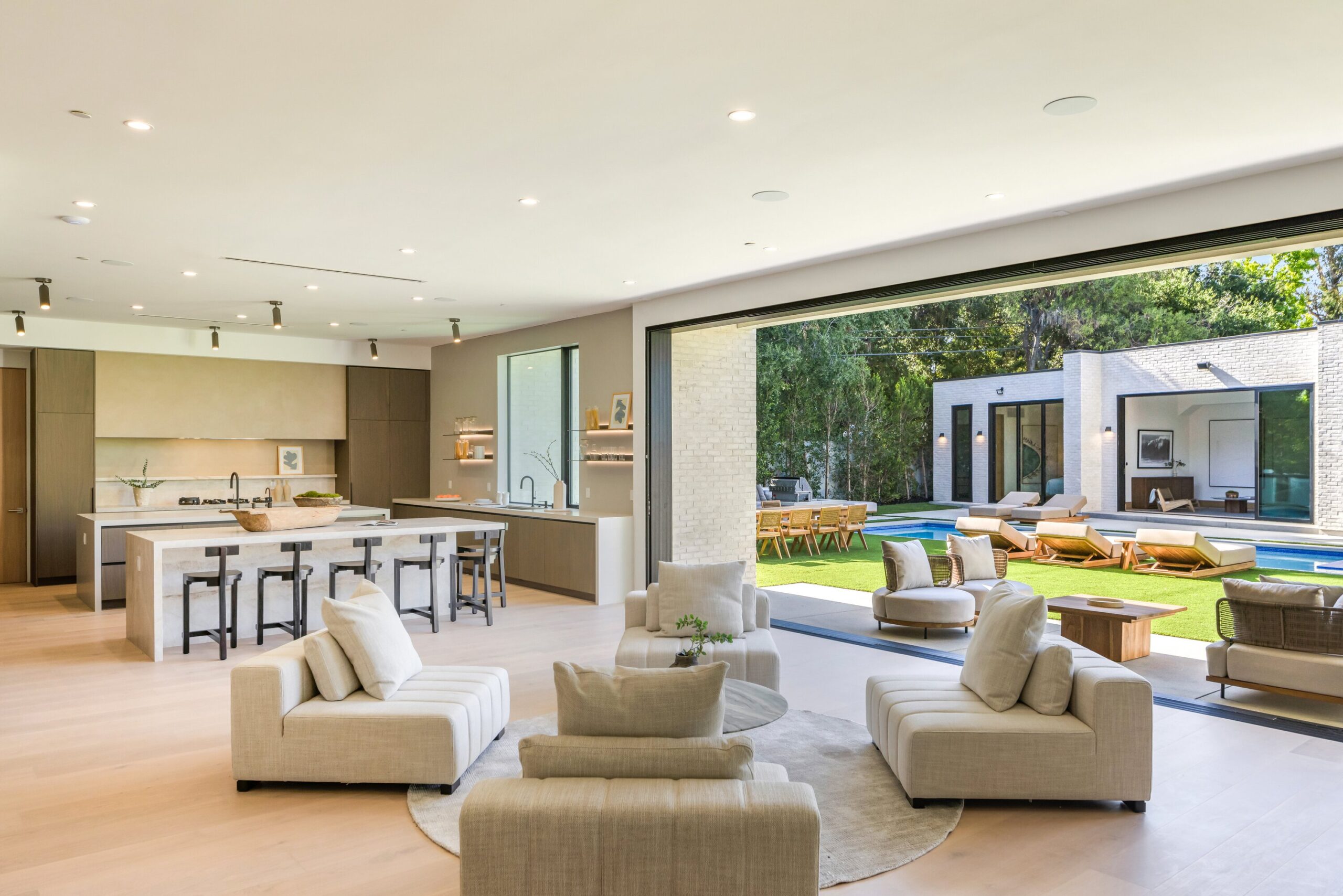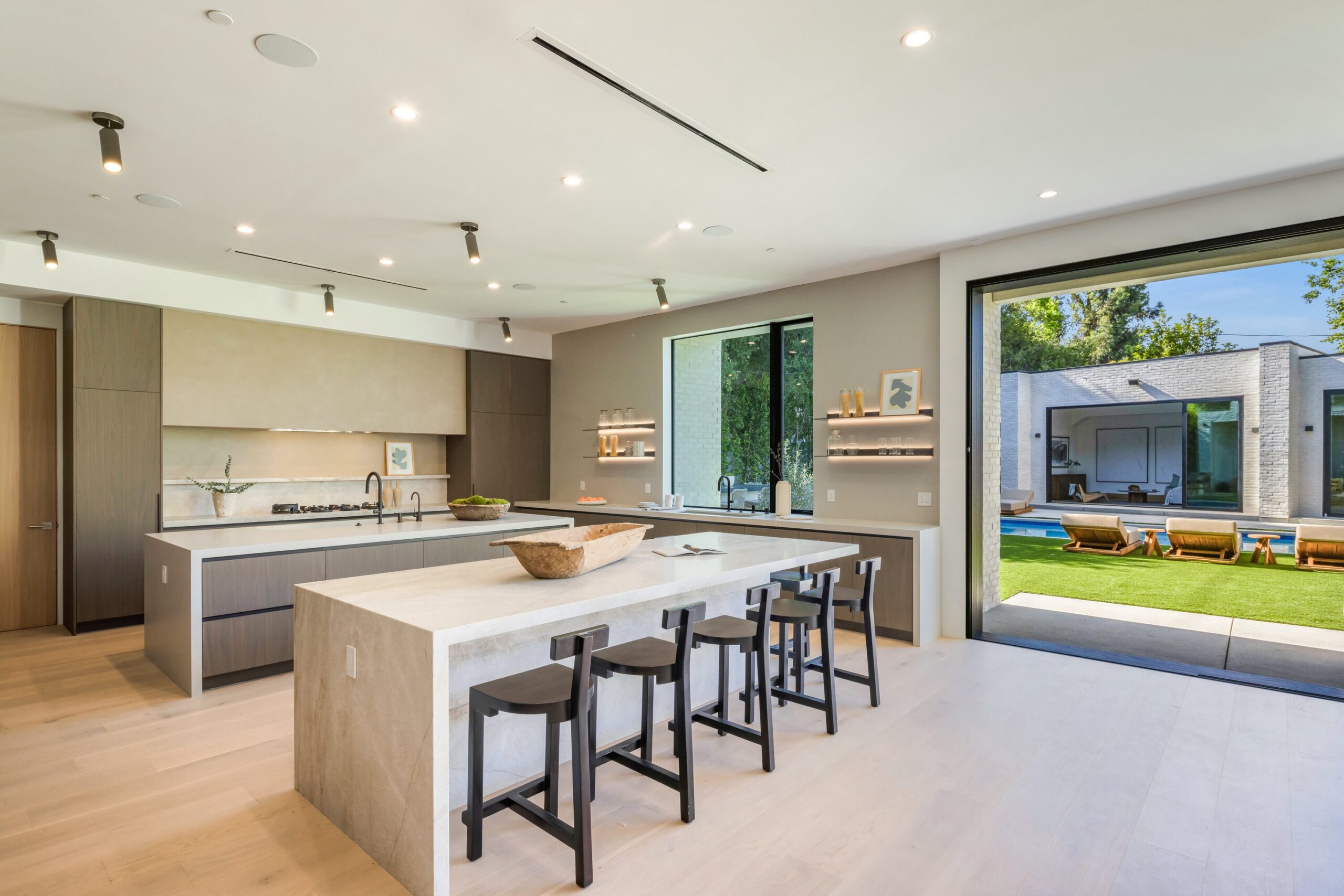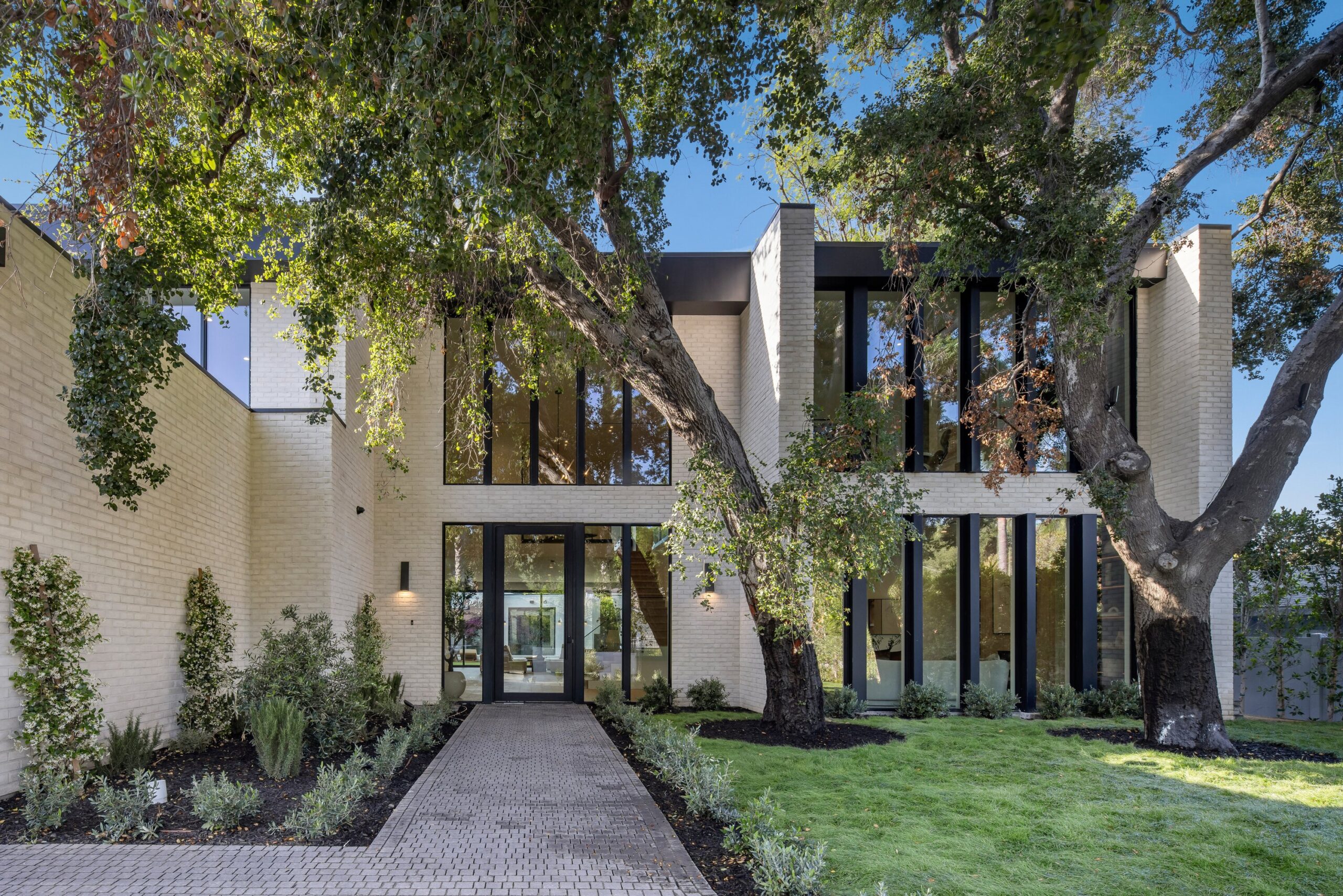Located on one of the most coveted streets south of Ventura Blvd in the prestigious Rancho Estates of Encino, this stunning modern-mid-century estate blends exceptional design with high-end craftsmanship. Its stone facade and vertical lines create a striking visual, while expansive picture windows flood the interiors with natural light. A refined selection of materials, including brushed stone, cold-rolled steel, white oak, and gunmetal finishes, creates a seamless, stylish atmosphere. The home features a chef’s kitchen, full bar, family and living rooms, office/study, cinema room, and gym, all designed for both comfort and entertainment. The luxurious primary suite includes a private balcony, a spa-inspired bath with an oversized shower, and designer walk-in closets. The outdoor space offers a pool, spa, cabana with an outdoor kitchen, fire pit, and lounging deck. An ADU provides additional flexibility, while the lush grounds, featuring olive trees and Italian cypress, offer plenty of room for play and relaxation. Ideally situated just moments from Brentwood, Bel Air, and the Westside, this home provides the ultimate in luxury living.