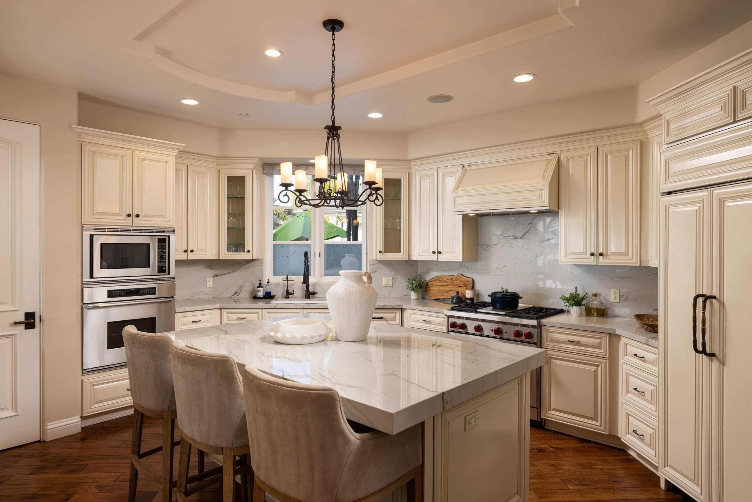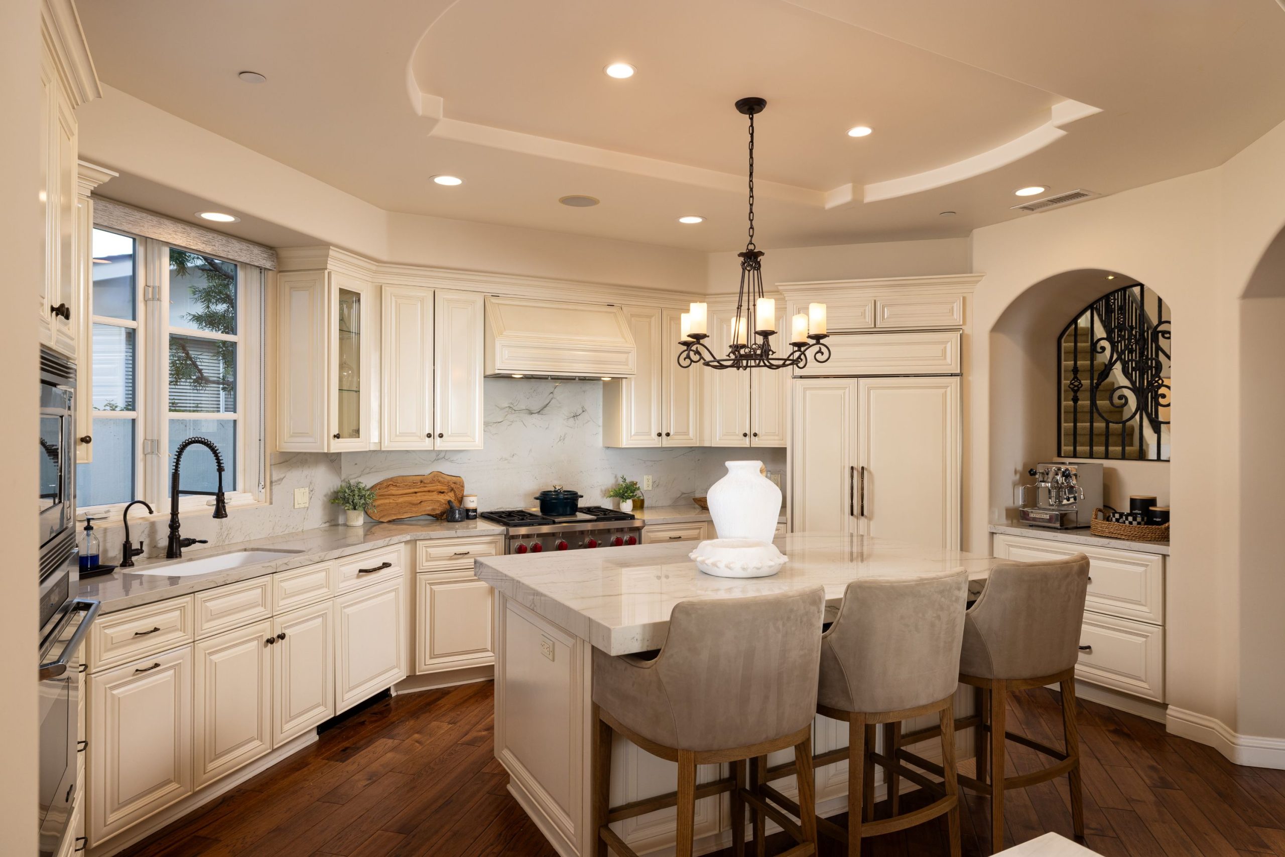 Santa Barbara meets San Clemente in this Spanish Revival estate, set along the canyon s edge on desirable Calle de Los Alamos in the Lasuen enclave. Offering refined living with sweeping ocean, Catalina Island, and sunset views this property has emotion. A private driveway leads to a grand entry surrounded by sculptural olive trees and bougainvillea. Nearly every major room enjoys ocean views, with whitewater vistas from the upstairs primary suite and a dedicated ocean-view office/loft that may serve as an optional fourth bedroom. The primary suite features vaulted and coved ceilings, a private balcony, and a spacious bath with soaking tub, walk-in shower, and walk-in closet. Additional bedroom suite is located upstairs with en-suite bath and upstairs laundry. The main level showcases hickory pecan hardwood floors and an ocean-view chef s kitchen with quartz countertops and backsplash, Wolf range, Viking refrigerator drawers, and a walk-in pantry with custom built-ins. A private downstairs attached casita with en-suite bath and built-in Murphy bed offers flexibility as a guest suite, gym, or studio. Additional features include a gas/wood-burning fireplace, Sonos surround sound, aluminum-clad wood windows, solid-core 8-foot alder doors, high ceilings, all new LED lighting, new carpet, and newer dual-zone air conditioning. Outdoor spaces include two ocean-view patios (one covered), a front patio, and a centered courtyard with tranquil fountain. An oversized three-car tandem garage with 40-amp outlet completes the home. Located in Southwest San Clemente s Lasuen Lost Winds, with nearby beach access, Leslie Park, sandy beaches, coastal trail, cafés, dining, and world-class surfing. A rare opportunity offering substantial first-level ocean views in an exceptional coastal setting.