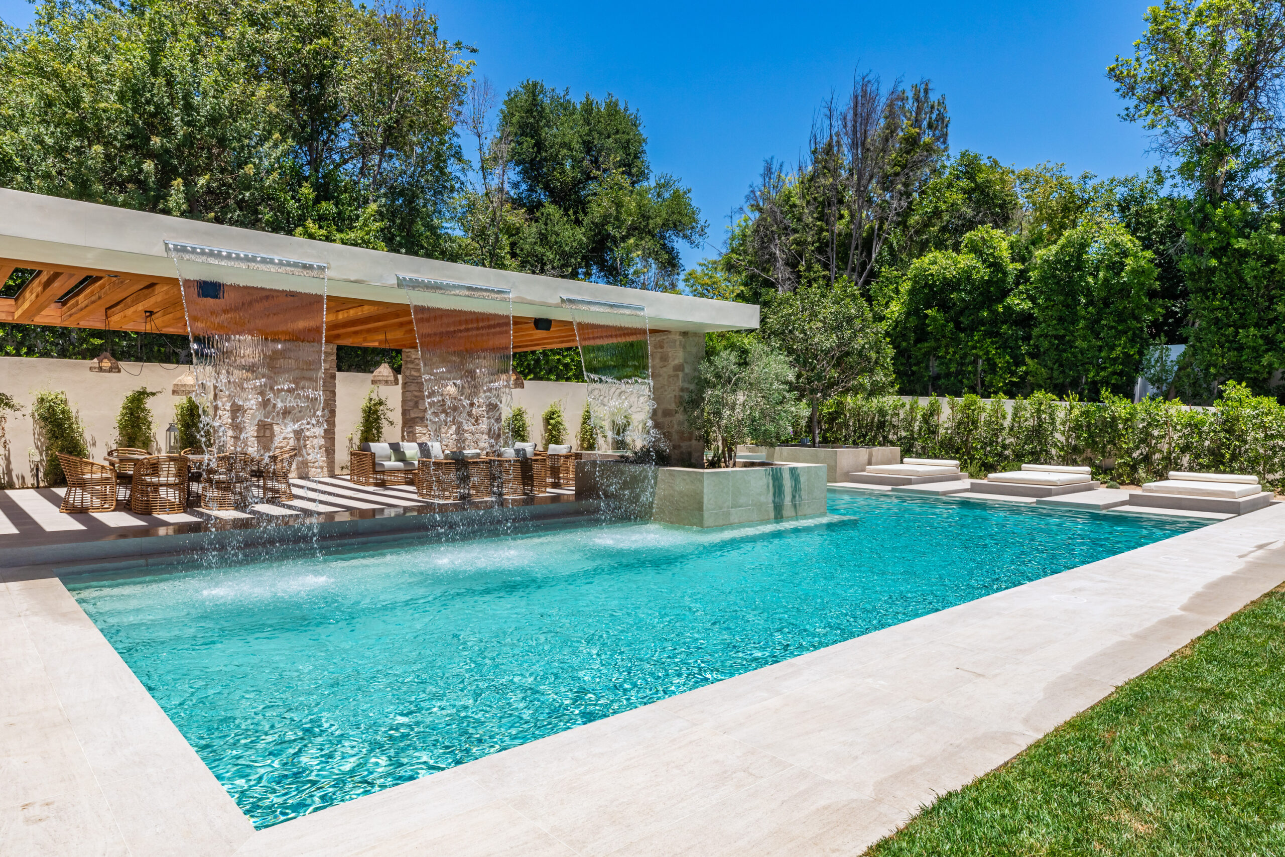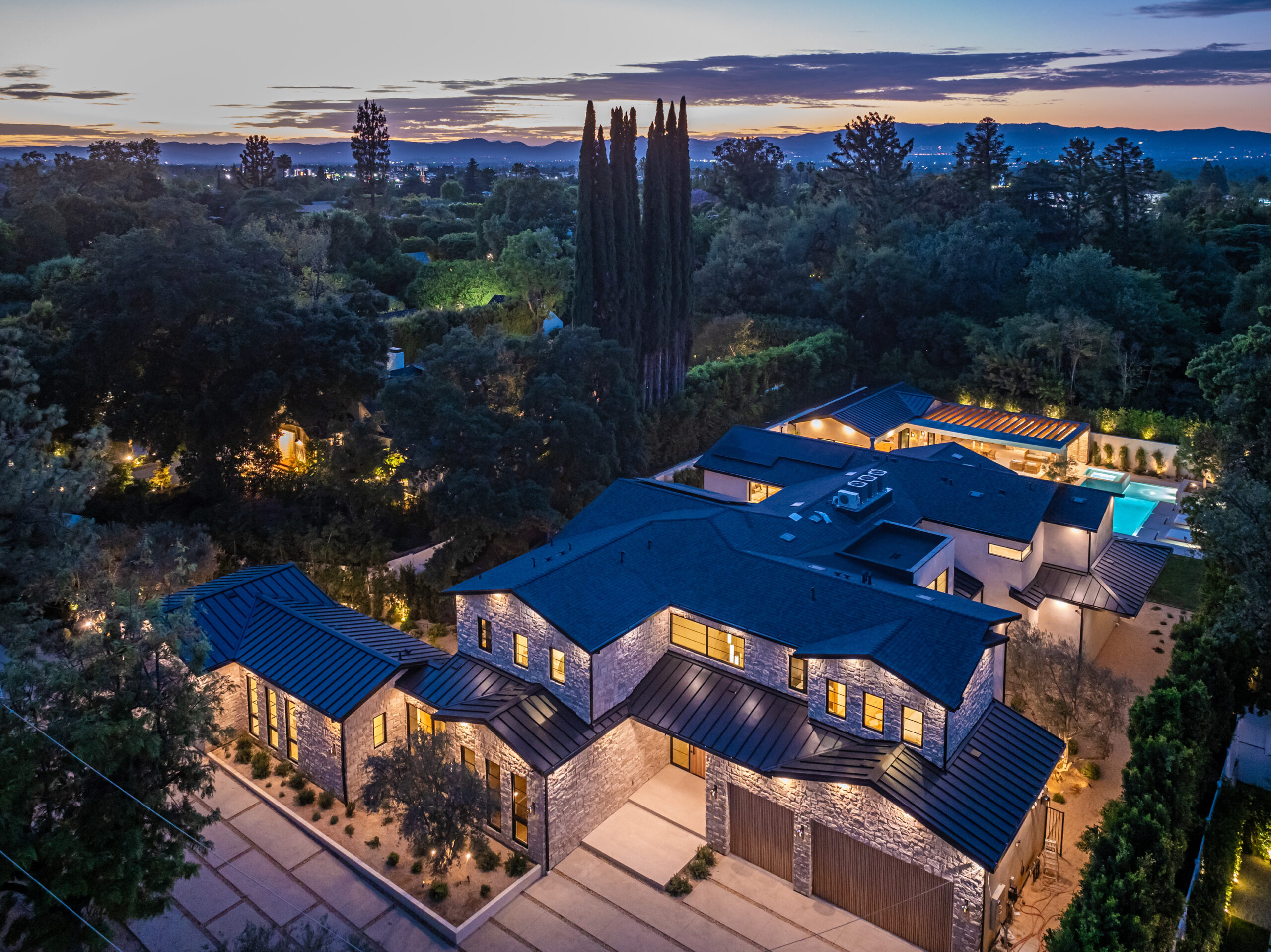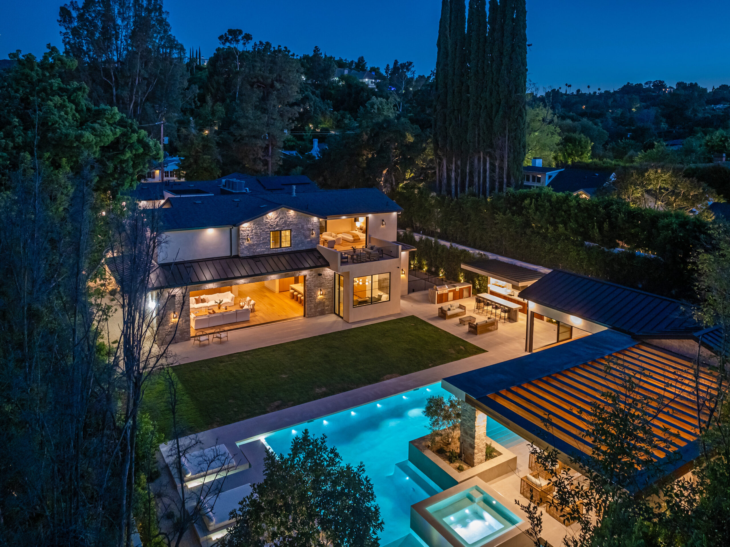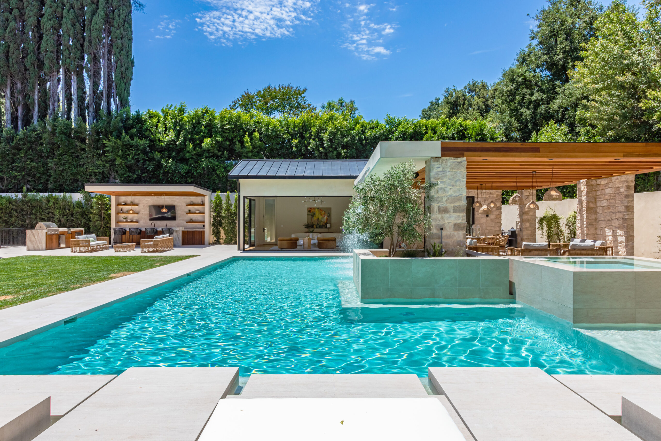 Step into a world of unparalleled design and sophistication in this exclusive private oasis, nestled on over of an acre. This gated Encino estate greets you with a grand motor court, setting the stage for a life of refined elegance and ultimate privacy. Every detail of this compound exudes luxury. The interior is a masterpiece of curated organic finishes, featuring plaster walls and natural stones that seamlessly blend with the soaring high ceilings and fluid indoor-outdoor transitions. The sprawling family room is where comfort meets elegance. This grand space boasts custom built-ins and a stunning fireplace that serves as the room's focal point. Expansive sliding doors reveal breathtaking views of the resort-inspired backyard, creating a seamless connection between indoor elegance and outdoor paradise. The awe-inspiring double island kitchen, along with a secondary chef s kitchen equipped with top-of-the-line appliances, will leave you breathless. The formal dining room is ideal for lavish dinners, where an outdoor fireplace framed by a majestic oak tree provides a stunning backdrop. The primary suite is a sanctuary of luxury, offering not just one, but two private balconies, dual SPA inspired baths, and two massive walk-in closets that promise to satisfy even the most discerning tastes. The executive office adjoins the auto gallery/game room, ensuring that work and play coexist in perfect harmony. Descend to the lower level, where indulgence knows no bounds. Here, a state-of-the-art fitness center with a steam shower, dry sauna, dedicated lap pool and spa awaits. Enjoy blockbuster nights in the luxurious theater, savor your finest vintages in the walk-in wine cellar, and relax in the lounge area complete with a full bar. Each of the en-suite bedrooms offers a private retreat, while additional features such as an elevator, two bars, a media room, two family rooms, two laundry rooms, home automation, and designer light fixtures elevate this estate to the pinnacle of modern living. Step outside to a resort-inspired paradise. An outdoor kitchen, multiple seating areas, and a uniquely designed pool with cascading waterfalls and floating pool beds create an idyllic setting for unforgettable gatherings. A well-appointed guest house provides a luxurious haven for your visitors. This estate is not just a home; it is a testament to where function, elegance, and flawless execution meet, creating a sanctuary that is both majestic and inviting.