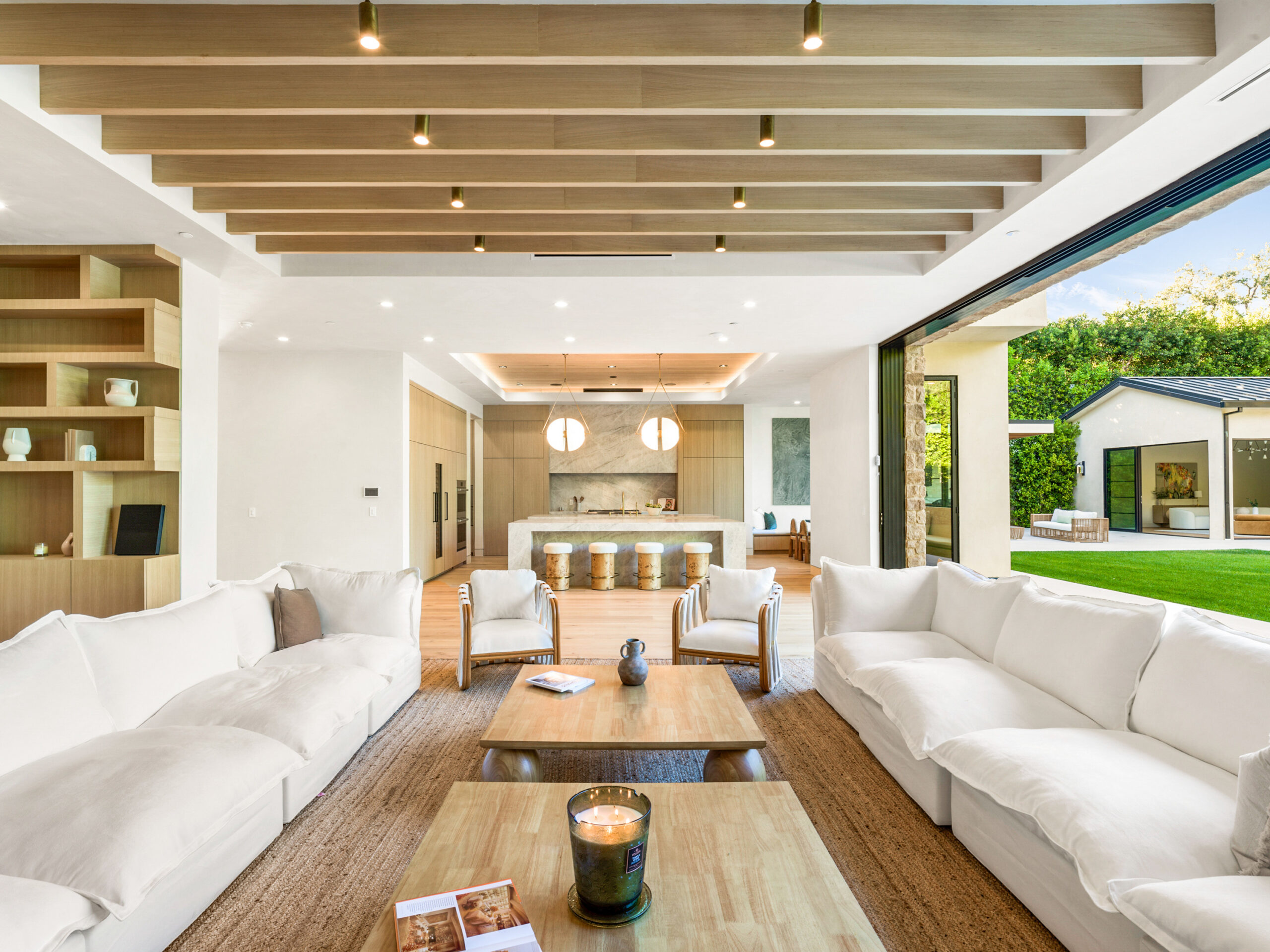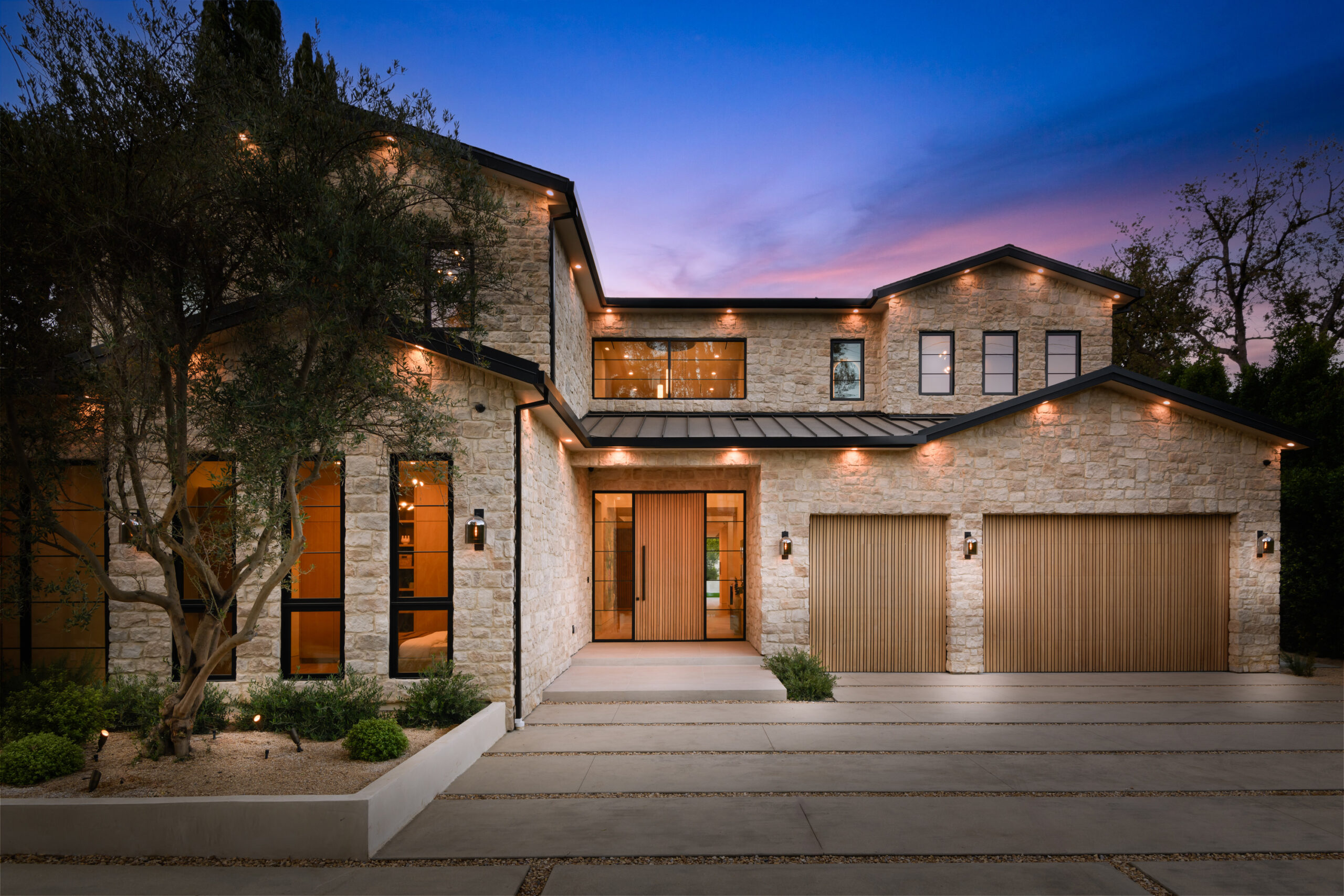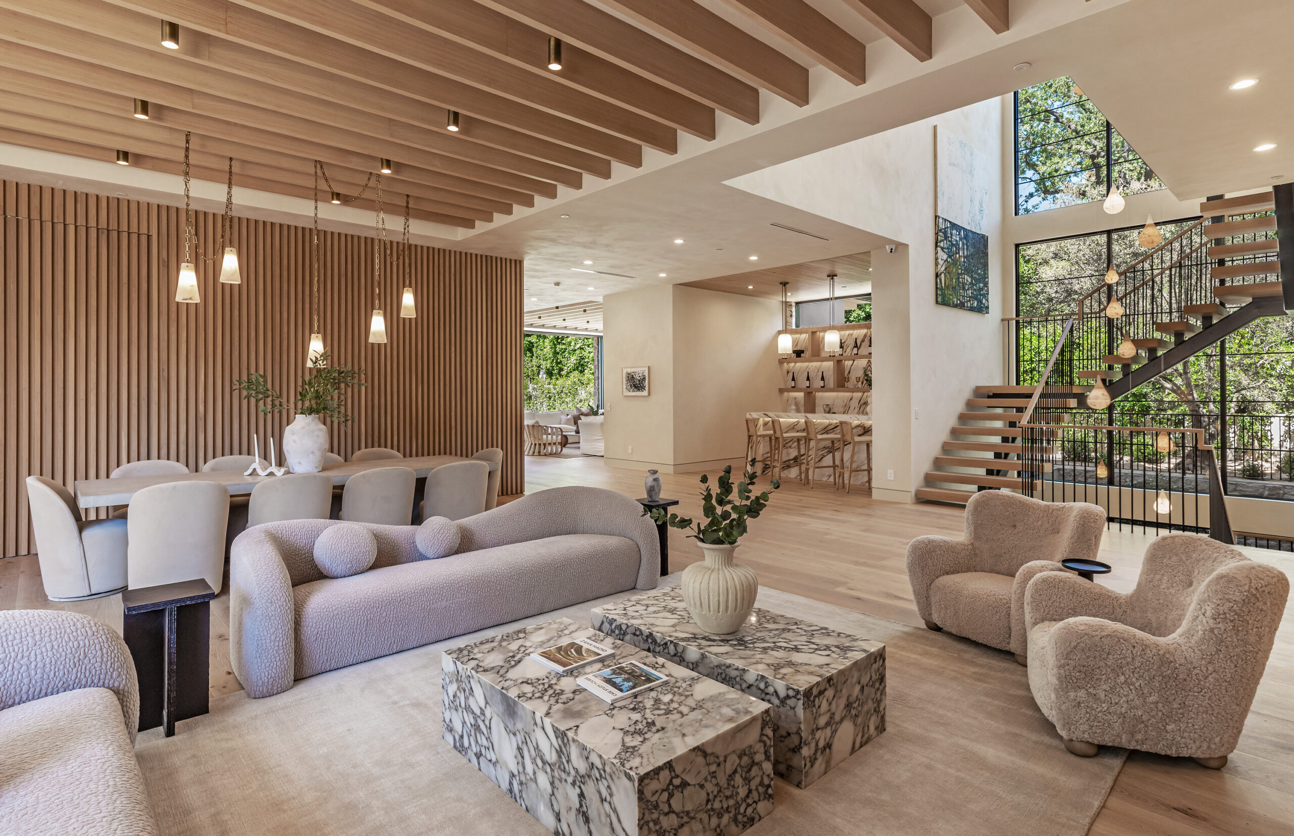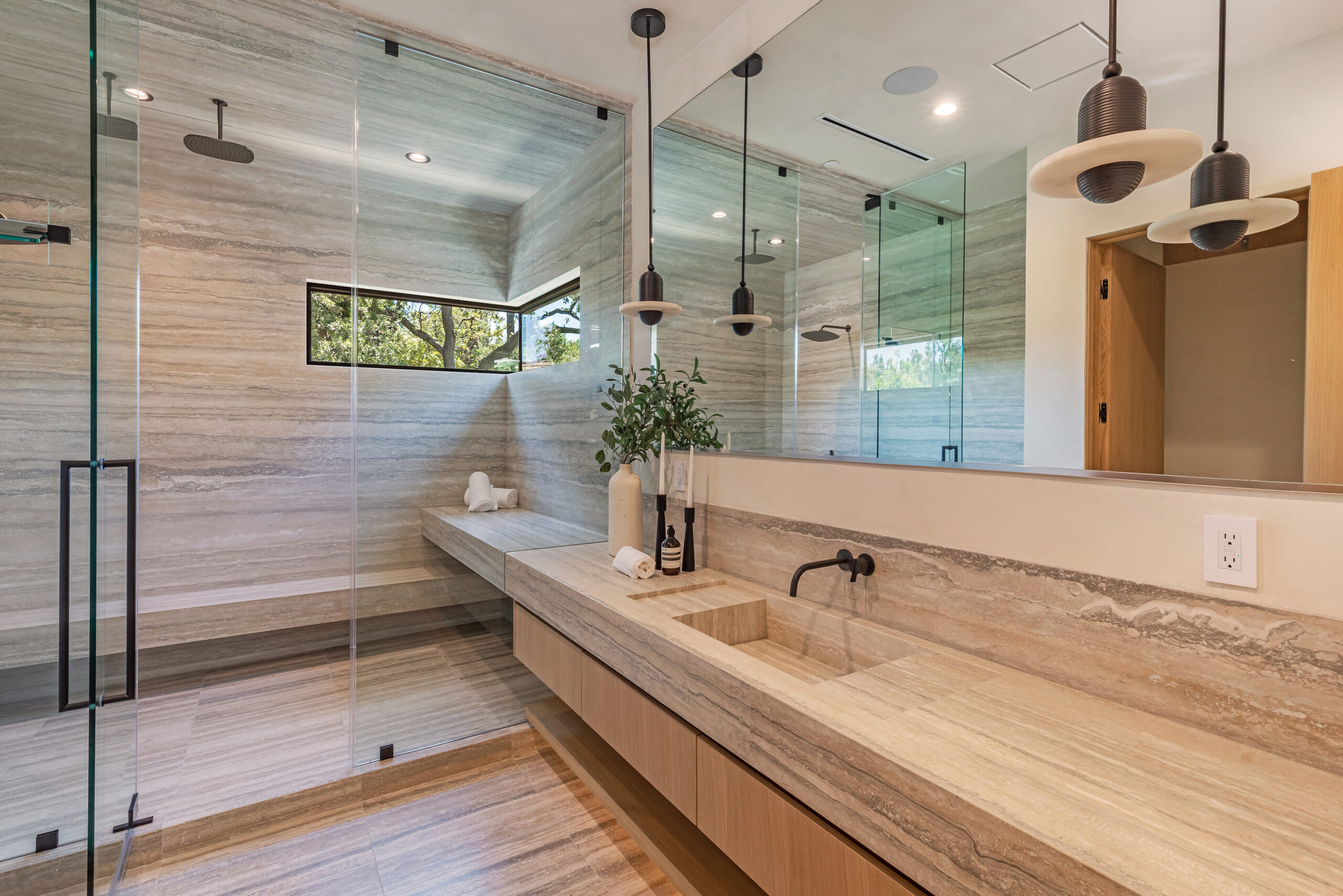 Step into a world of unparalleled design and sophistication in this exclusive private oasis, nestled on over of an acre. This gated Encino estate greets you with a grand motor court, setting the stage for a life of refined elegance and ultimate privacy. Every detail of this compound exudes luxury. The interior is a masterpiece of curated organic finishes, featuring plaster walls and natural stones that seamlessly blend with the soaring high ceilings and fluid indoor-outdoor transitions. The sprawling family room is where comfort meets elegance. This grand space boasts custom built-ins and a stunning fireplace that serves as the room's focal point. Expansive sliding doors reveal breathtaking views of the resort-inspired backyard, creating a seamless connection between indoor elegance and outdoor paradise. The awe-inspiring double island kitchen, along with a secondary chef s kitchen equipped with top-of-the-line appliances, will leave you breathless. The formal dining room is ideal for lavish dinners, where an outdoor fireplace framed by a majestic oak tree provides a stunning backdrop. The primary suite is a sanctuary of luxury, offering not just one, but two private balconies, dual SPA inspired baths, and two massive walk-in closets that promise to satisfy even the most discerning tastes. The executive office adjoins the auto gallery/game room, ensuring that work and play coexist in perfect harmony. Descend to the lower level, where indulgence knows no bounds. Here, a state-of-the-art fitness center with a steam shower, dry sauna, dedicated lap pool and spa awaits. Enjoy blockbuster nights in the luxurious theater, savor your finest vintages in the walk-in wine cellar, and relax in the lounge area complete with a full bar. Each of the en-suite bedrooms offers a private retreat, while additional features such as an elevator, two bars, a media room, two family rooms, two laundry rooms, home automation, and designer light fixtures elevate this estate to the pinnacle of modern living. Step outside to a resort-inspired paradise. An outdoor kitchen, multiple seating areas, and a uniquely designed pool with cascading waterfalls and floating pool beds create an idyllic setting for unforgettable gatherings. A well-appointed guest house provides a luxurious haven for your visitors. This estate is not just a home; it is a testament to where function, elegance, and flawless execution meet, creating a sanctuary that is both majestic and inviting.
