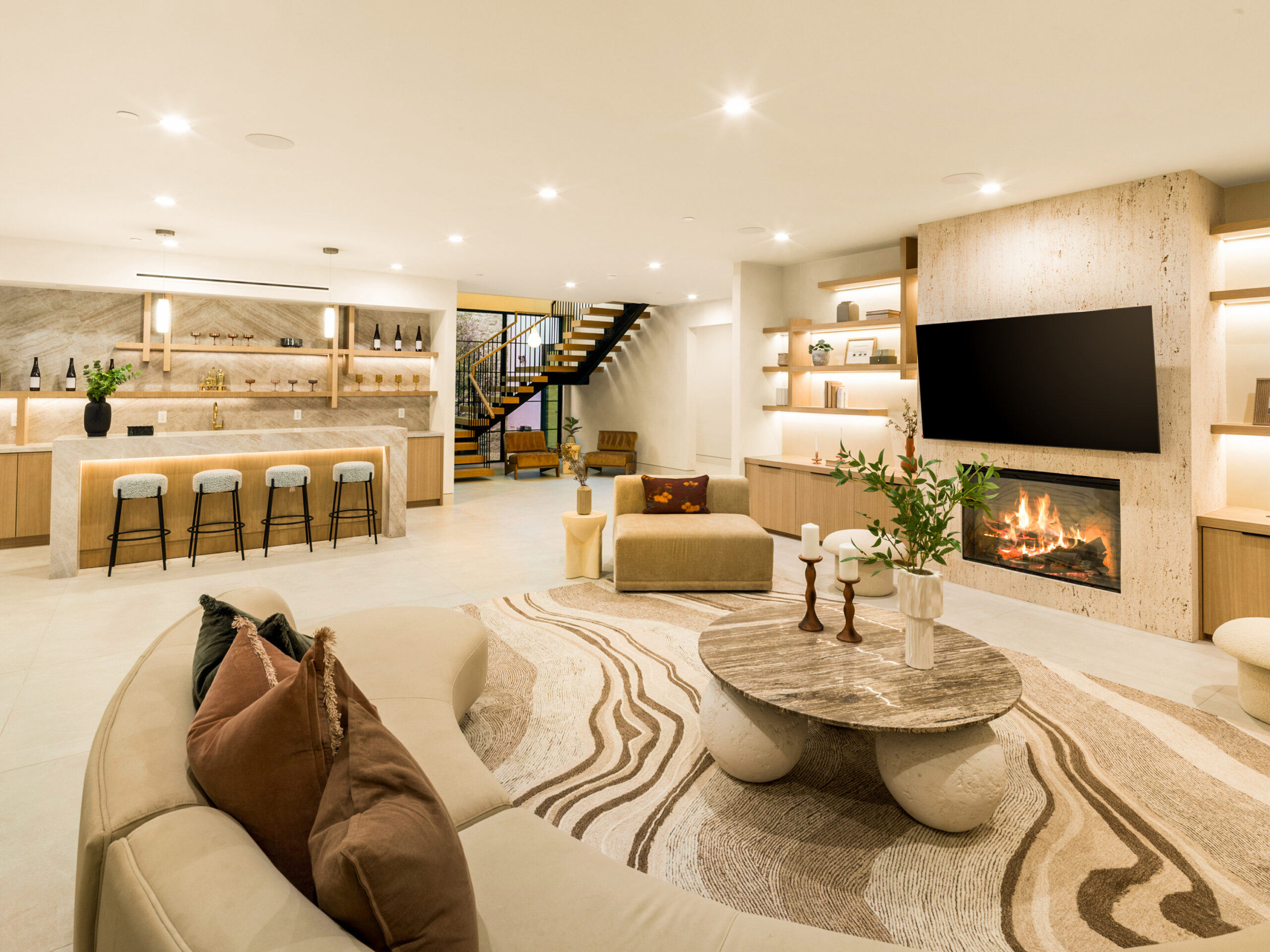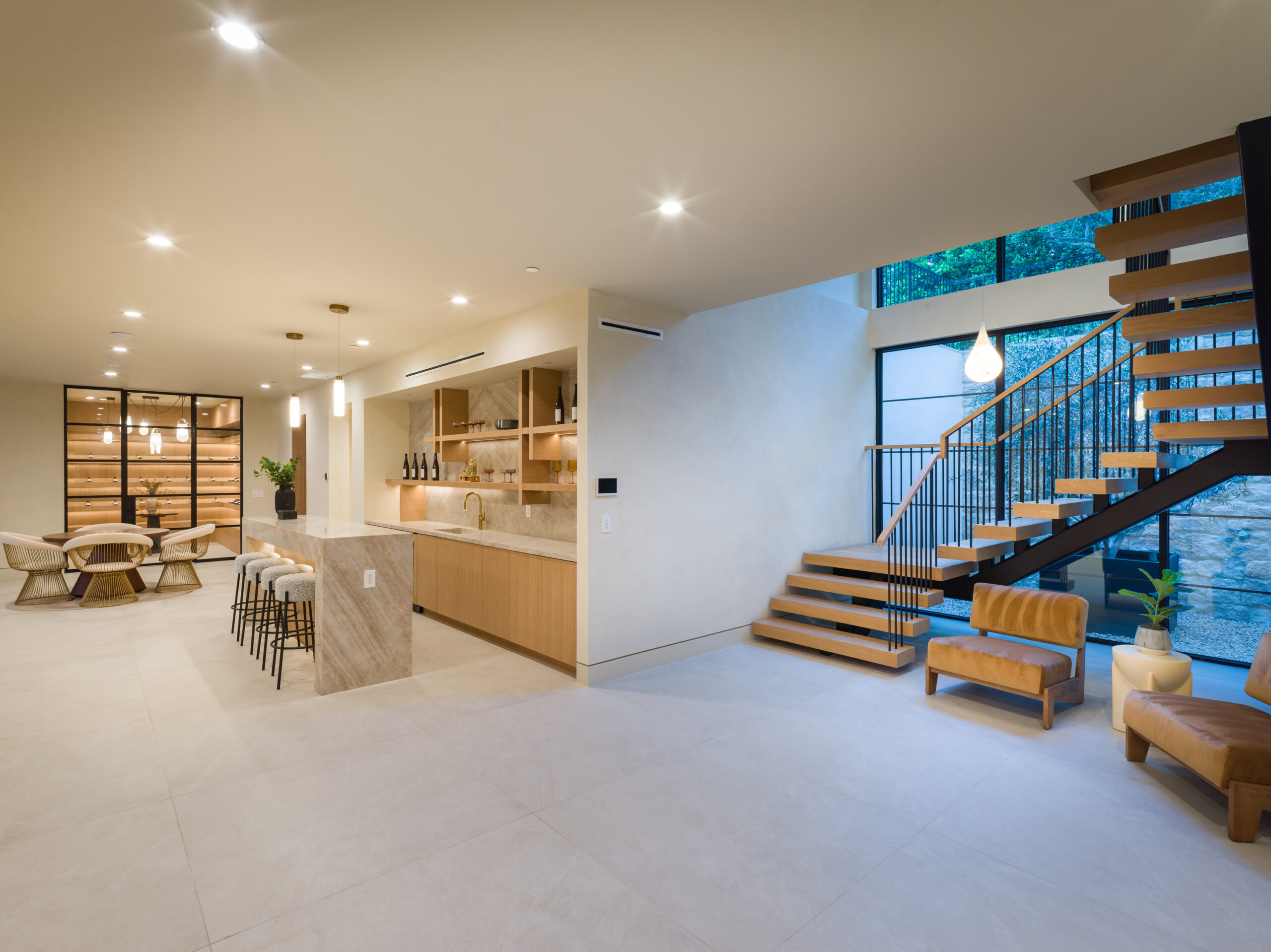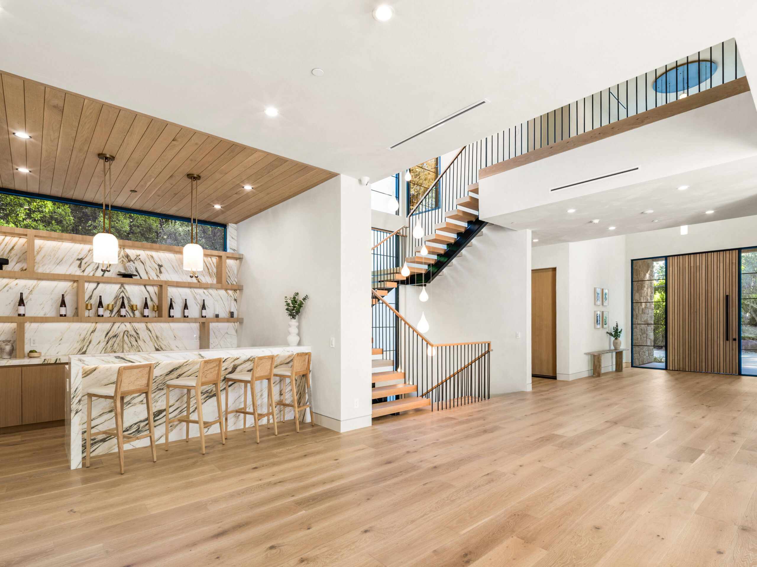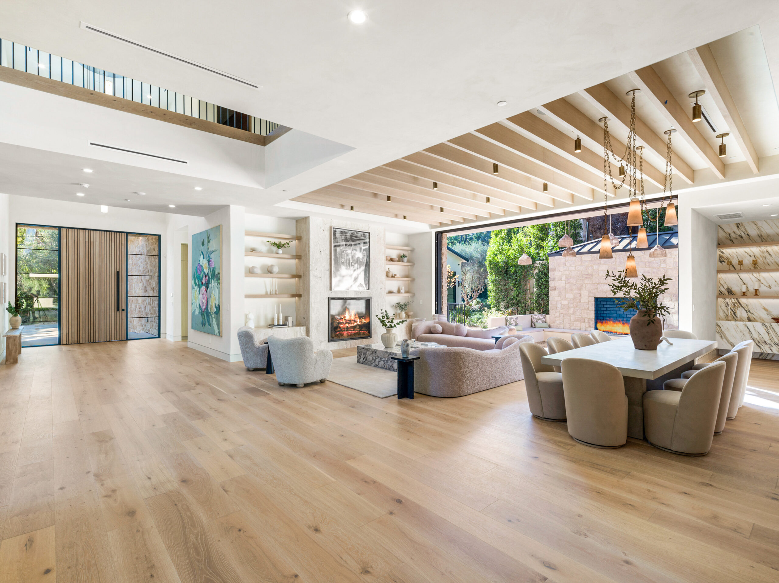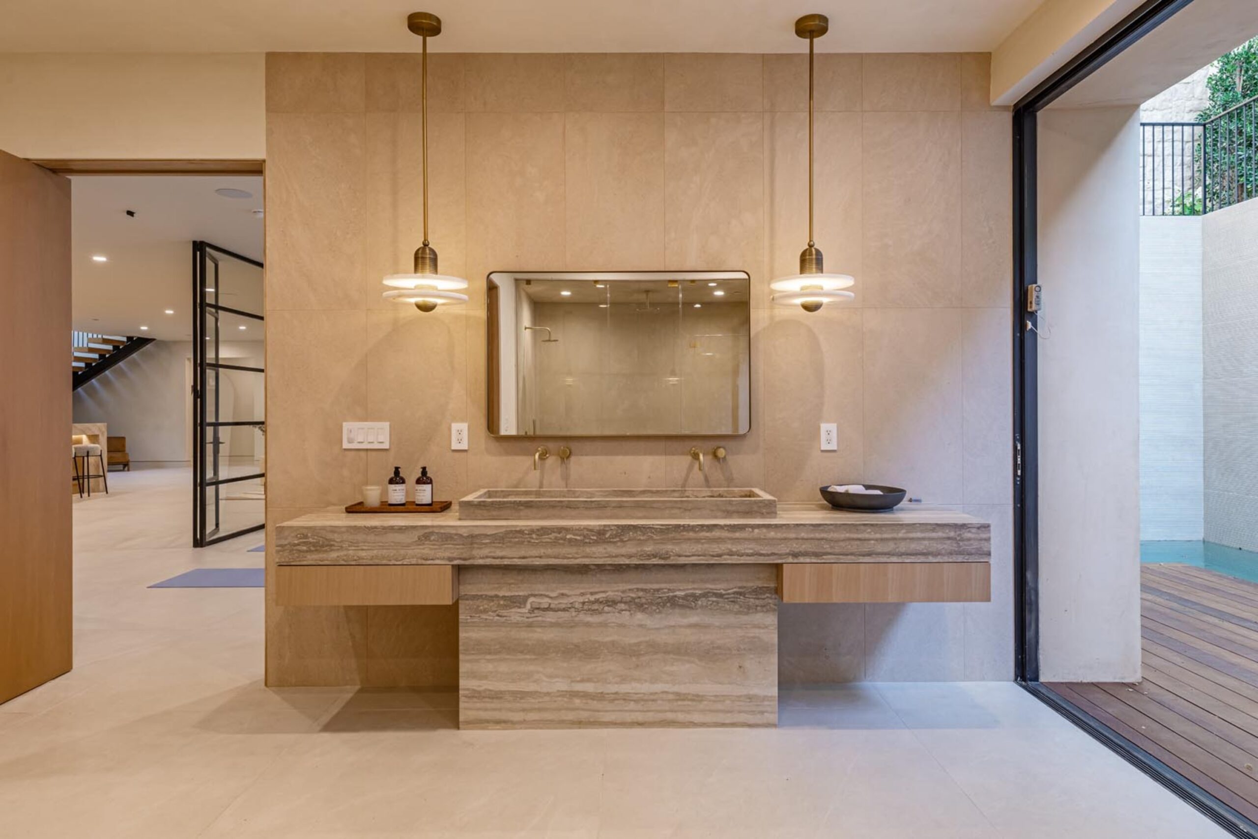 Step into a world of unparalleled design and sophistication in this exclusive private oasis, nestled on over of an acre. This gated Encino estate greets you with a grand motor court, setting the stage for a life of refined elegance and ultimate privacy. Every detail of this compound exudes luxury. The interior is a masterpiece of curated organic finishes, featuring plaster walls and natural stones that seamlessly blend with the soaring high ceilings and fluid indoor-outdoor transitions. The sprawling family room is where comfort meets elegance. This grand space boasts custom built-ins and a stunning fireplace that serves as the room's focal point. Expansive sliding doors reveal breathtaking views of the resort-inspired backyard, creating a seamless connection between indoor elegance and outdoor paradise. The awe-inspiring double island kitchen, along with a secondary chef s kitchen equipped with top-of-the-line appliances, will leave you breathless. The formal dining room is ideal for lavish dinners, where an outdoor fireplace framed by a majestic oak tree provides a stunning backdrop. The primary suite is a sanctuary of luxury, offering not just one, but two private balconies, dual SPA inspired baths, and two massive walk-in closets that promise to satisfy even the most discerning tastes. The executive office adjoins the auto gallery/game room, ensuring that work and play coexist in perfect harmony. Descend to the lower level, where indulgence knows no bounds. Here, a state-of-the-art fitness center with a steam shower, dry sauna, dedicated lap pool and spa awaits. Enjoy blockbuster nights in the luxurious theater, savor your finest vintages in the walk-in wine cellar, and relax in the lounge area complete with a full bar. Each of the en-suite bedrooms offers a private retreat, while additional features such as an elevator, two bars, a media room, two family rooms, two laundry rooms, home automation, and designer light fixtures elevate this estate to the pinnacle of modern living. Step outside to a resort-inspired paradise. An outdoor kitchen, multiple seating areas, and a uniquely designed pool with cascading waterfalls and floating pool beds create an idyllic setting for unforgettable gatherings. A well-appointed guest house provides a luxurious haven for your visitors. This estate is not just a home; it is a testament to where function, elegance, and flawless execution meet, creating a sanctuary that is both majestic and inviting.