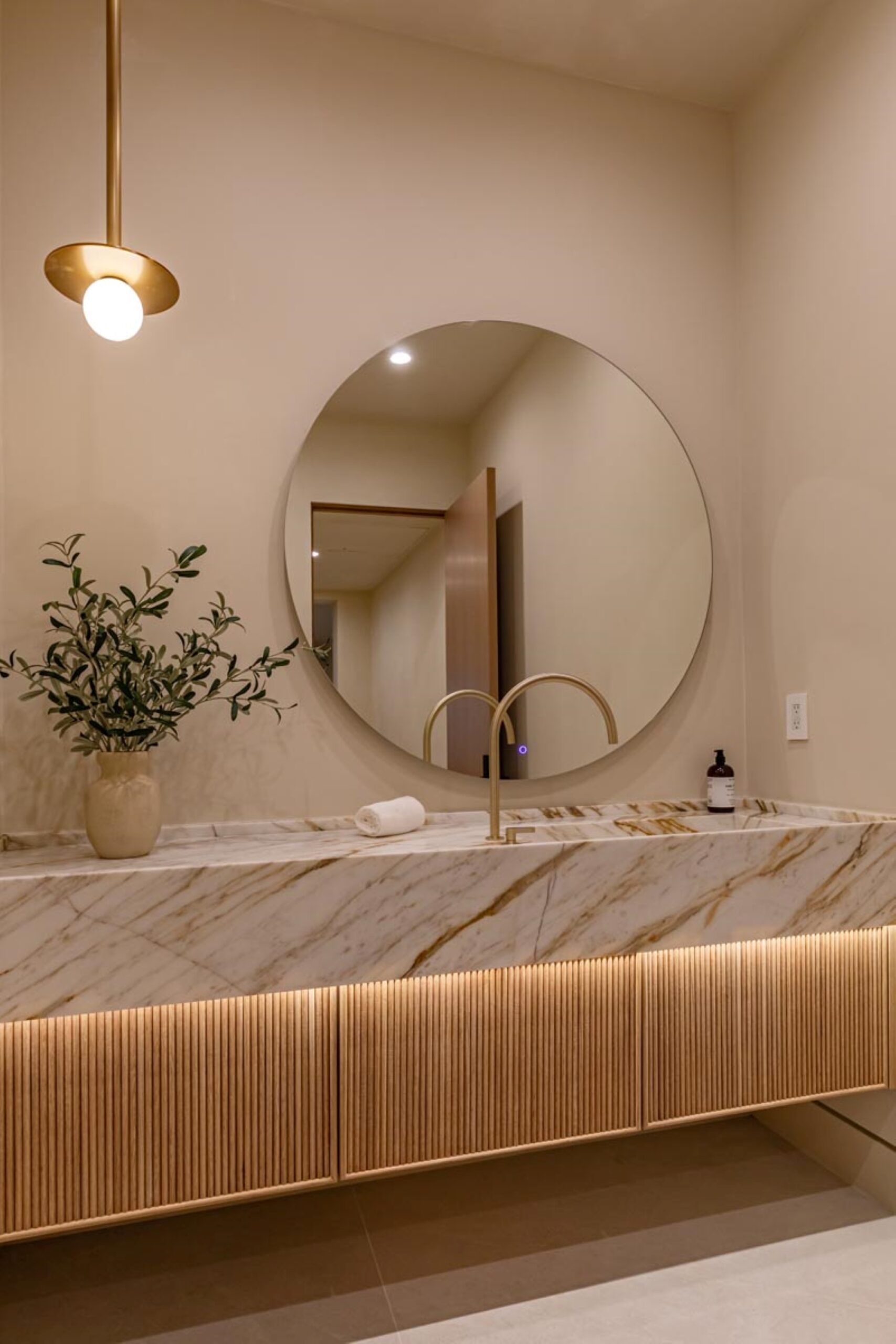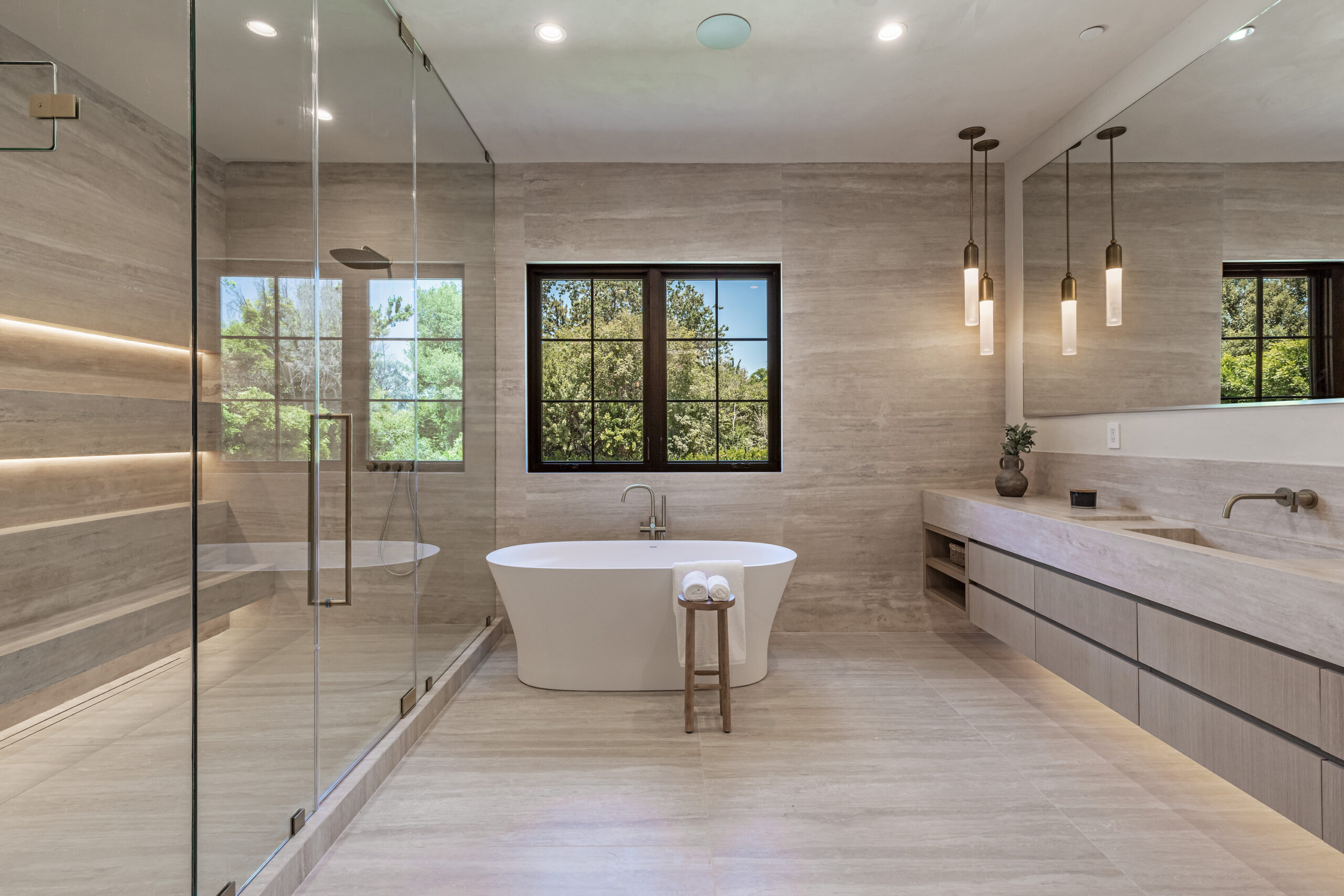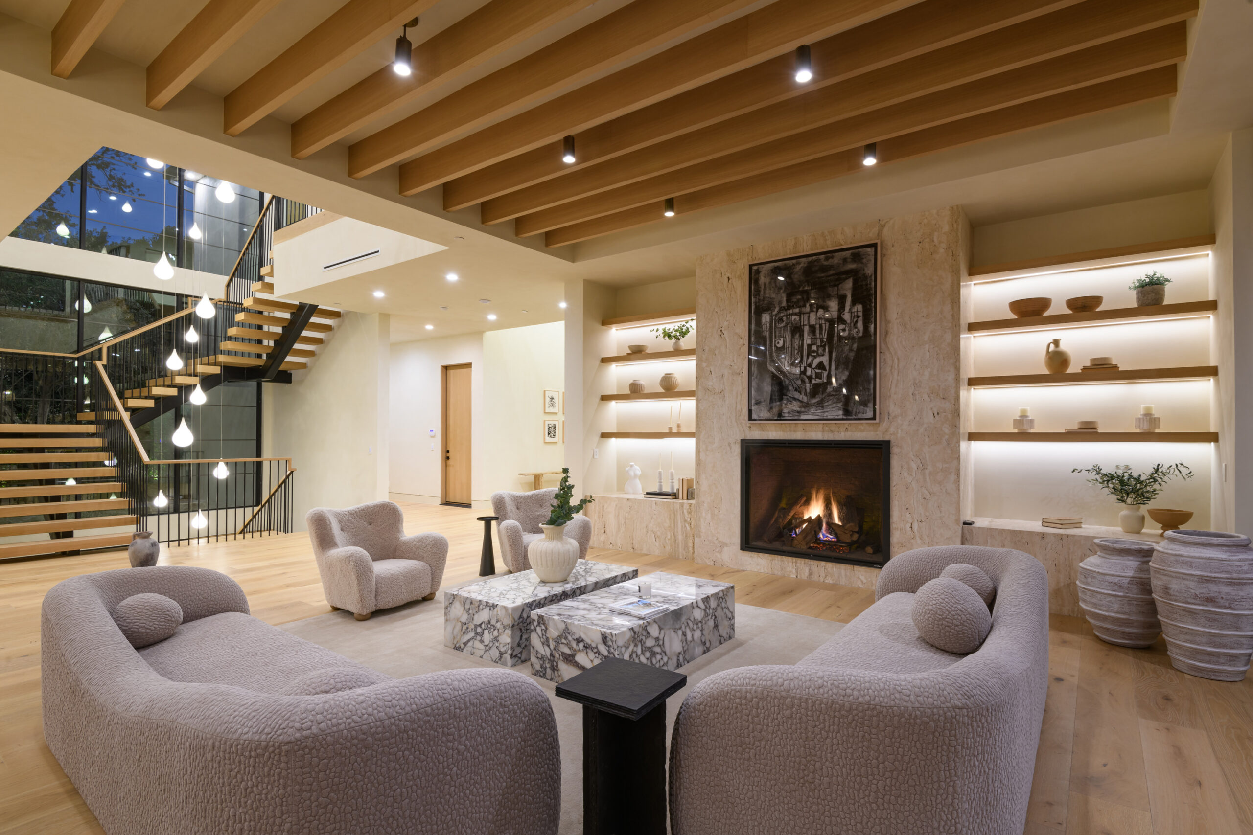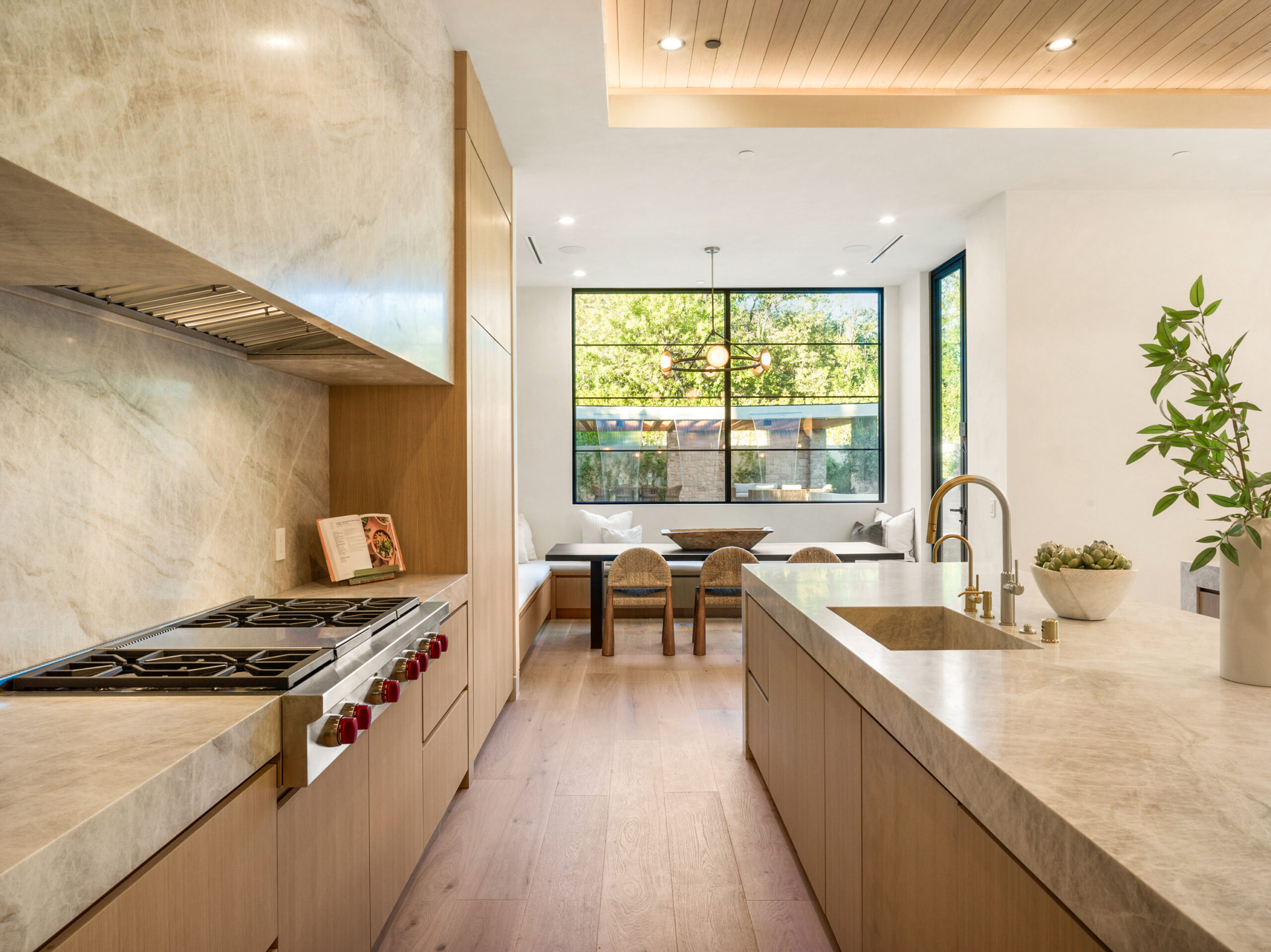 Step into a world of unparalleled design and sophistication in this exclusive private oasis, nestled on over of an acre. This gated Encino estate greets you with a grand motor court, setting the stage for a life of refined elegance and ultimate privacy. Every detail of this compound exudes luxury. The interior is a masterpiece of curated organic finishes, featuring plaster walls and natural stones that seamlessly blend with the soaring high ceilings and fluid indoor-outdoor transitions. The sprawling family room is where comfort meets elegance. This grand space boasts custom built-ins and a stunning fireplace that serves as the room's focal point. Expansive sliding doors reveal breathtaking views of the resort-inspired backyard, creating a seamless connection between indoor elegance and outdoor paradise. The awe-inspiring double island kitchen, along with a secondary chef s kitchen equipped with top-of-the-line appliances, will leave you breathless. The formal dining room is ideal for lavish dinners, where an outdoor fireplace framed by a majestic oak tree provides a stunning backdrop. The primary suite is a sanctuary of luxury, offering not just one, but two private balconies, dual SPA inspired baths, and two massive walk-in closets that promise to satisfy even the most discerning tastes. The executive office adjoins the auto gallery/game room, ensuring that work and play coexist in perfect harmony. Descend to the lower level, where indulgence knows no bounds. Here, a state-of-the-art fitness center with a steam shower, dry sauna, dedicated lap pool and spa awaits. Enjoy blockbuster nights in the luxurious theater, savor your finest vintages in the walk-in wine cellar, and relax in the lounge area complete with a full bar. Each of the en-suite bedrooms offers a private retreat, while additional features such as an elevator, two bars, a media room, two family rooms, two laundry rooms, home automation, and designer light fixtures elevate this estate to the pinnacle of modern living. Step outside to a resort-inspired paradise. An outdoor kitchen, multiple seating areas, and a uniquely designed pool with cascading waterfalls and floating pool beds create an idyllic setting for unforgettable gatherings. A well-appointed guest house provides a luxurious haven for your visitors. This estate is not just a home; it is a testament to where function, elegance, and flawless execution meet, creating a sanctuary that is both majestic and inviting.